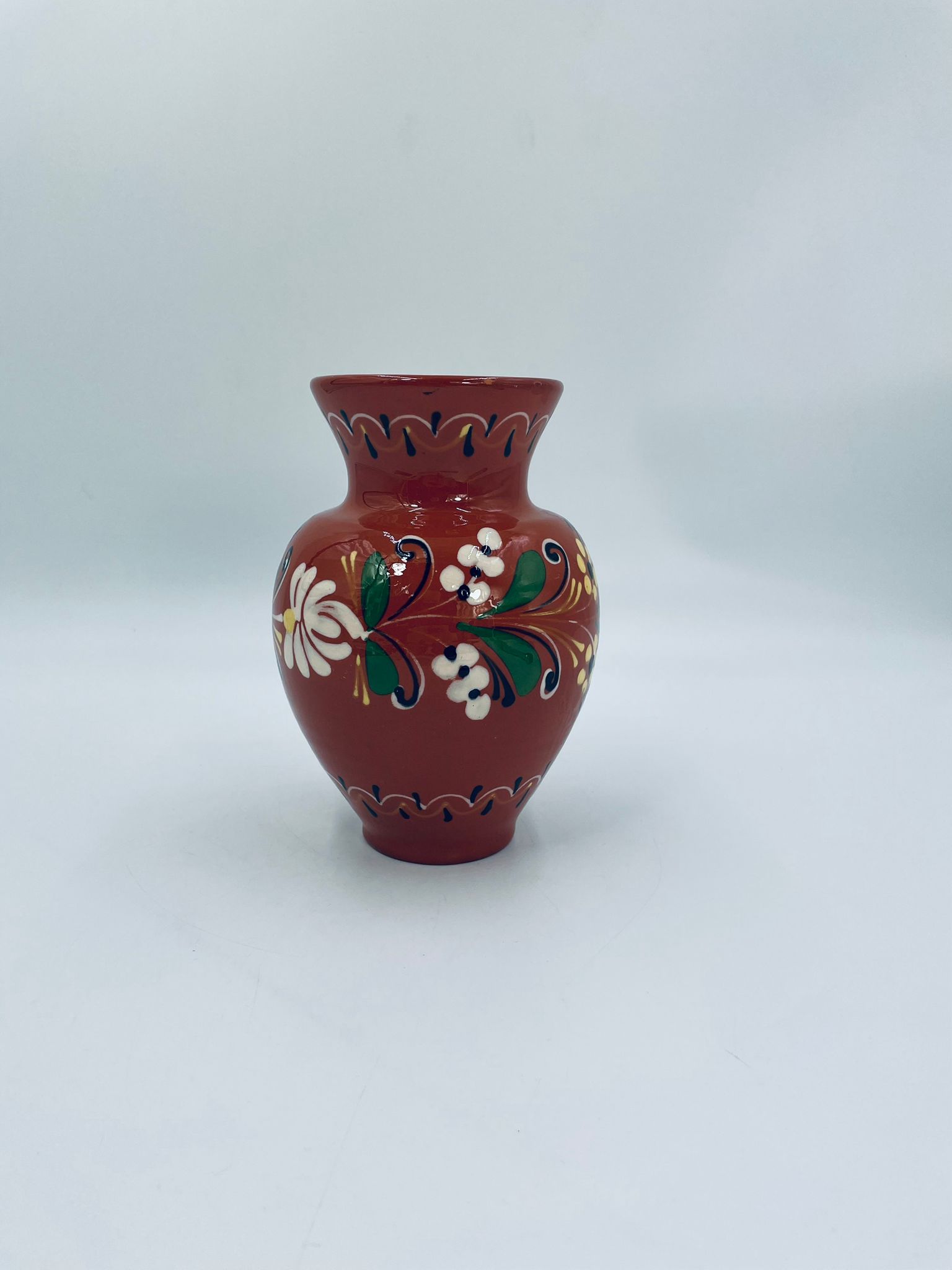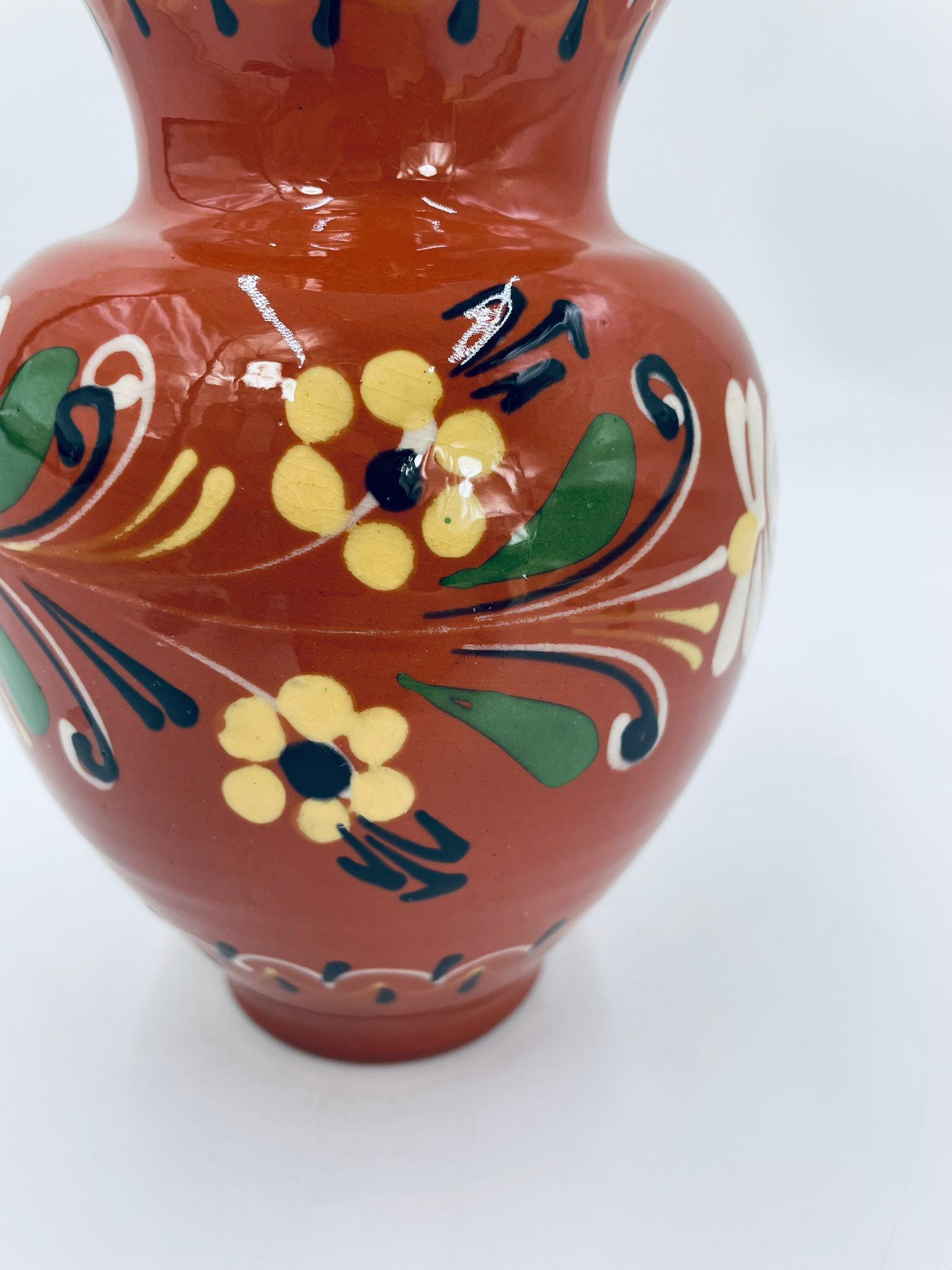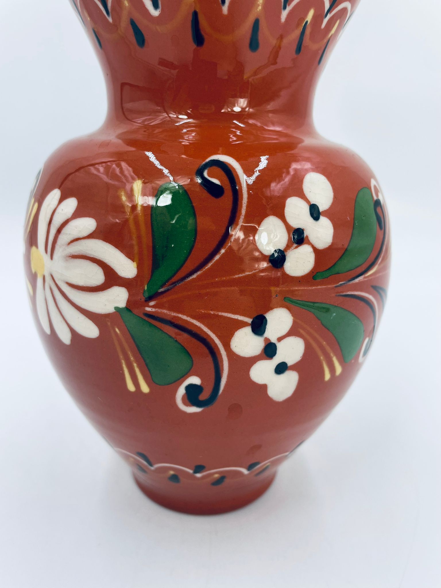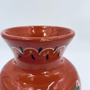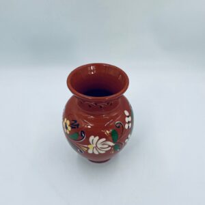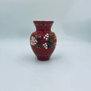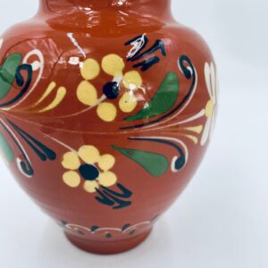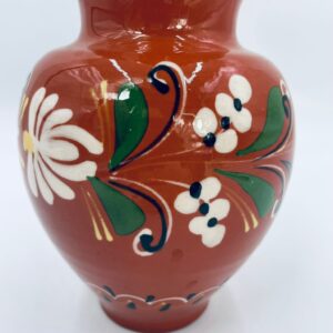 Wazon dekoracyjny Węgierski, wykonany z wysokiej jakości ceramiki. Wazon charakteryzuje się rustykalnym stylem z ręcznie malowanymi kwiatami i ozdobnymi akcentami. Posiada pęknięcie szkliwa i mały uszczerbek na górnym rancie.