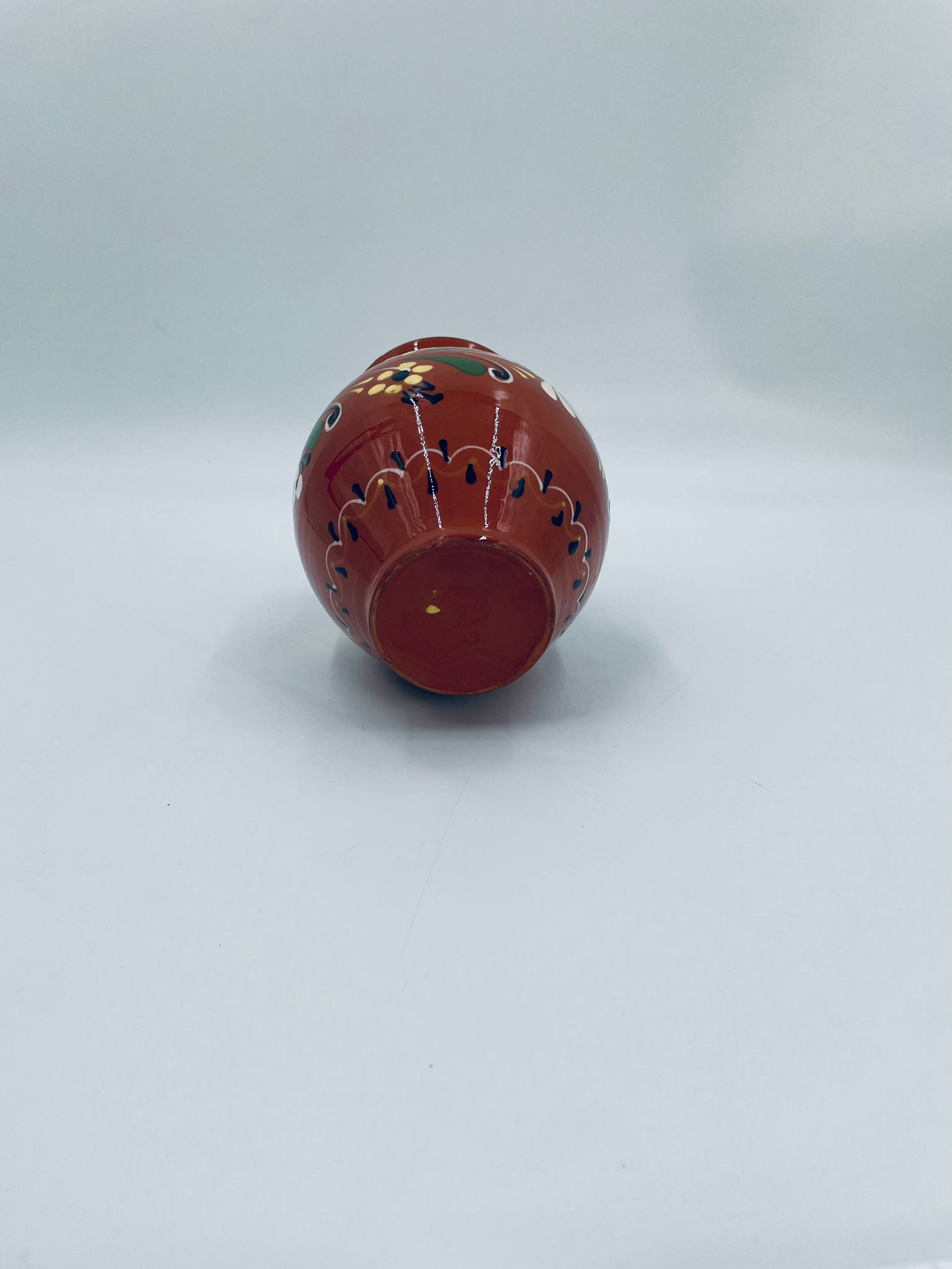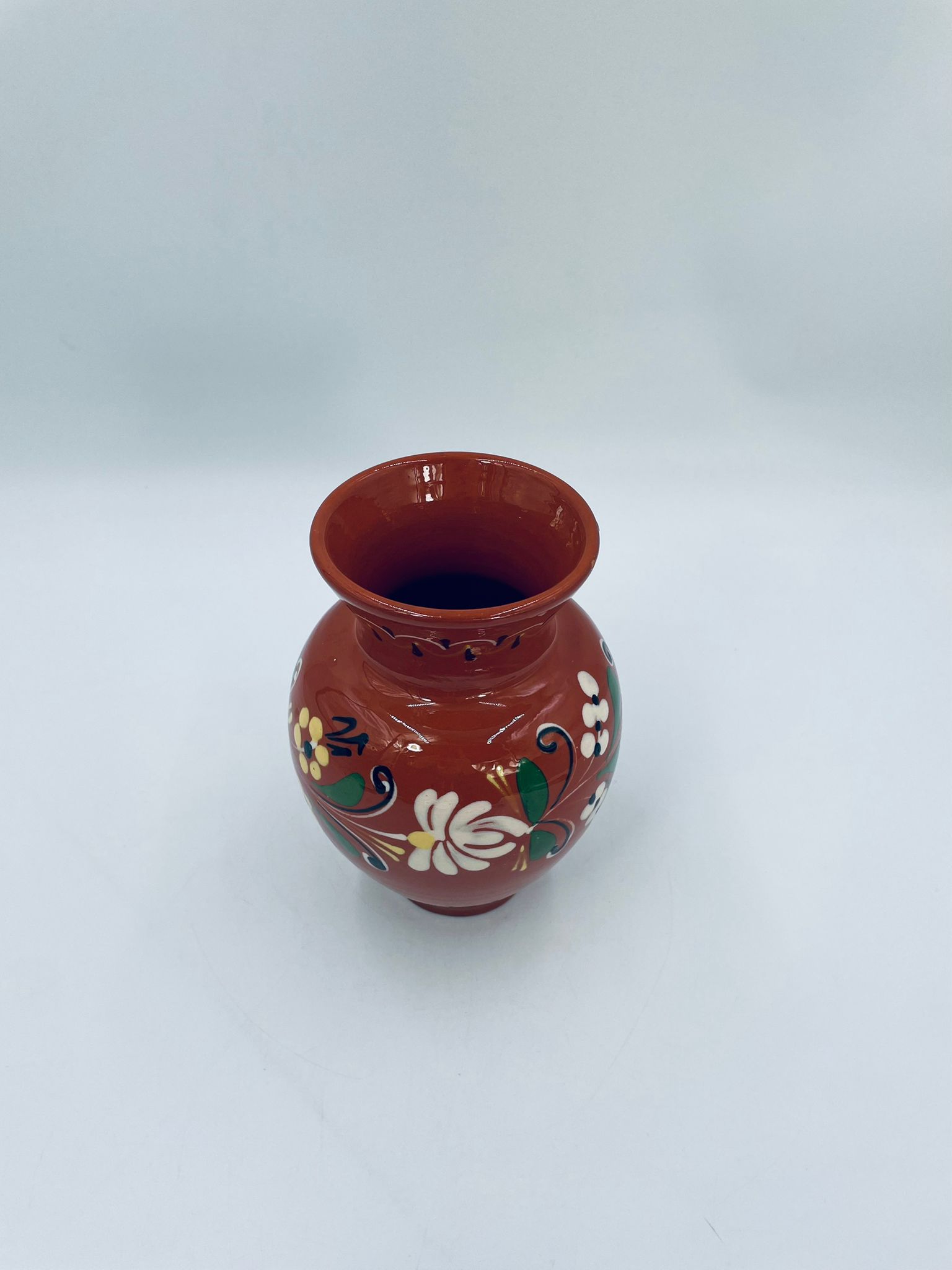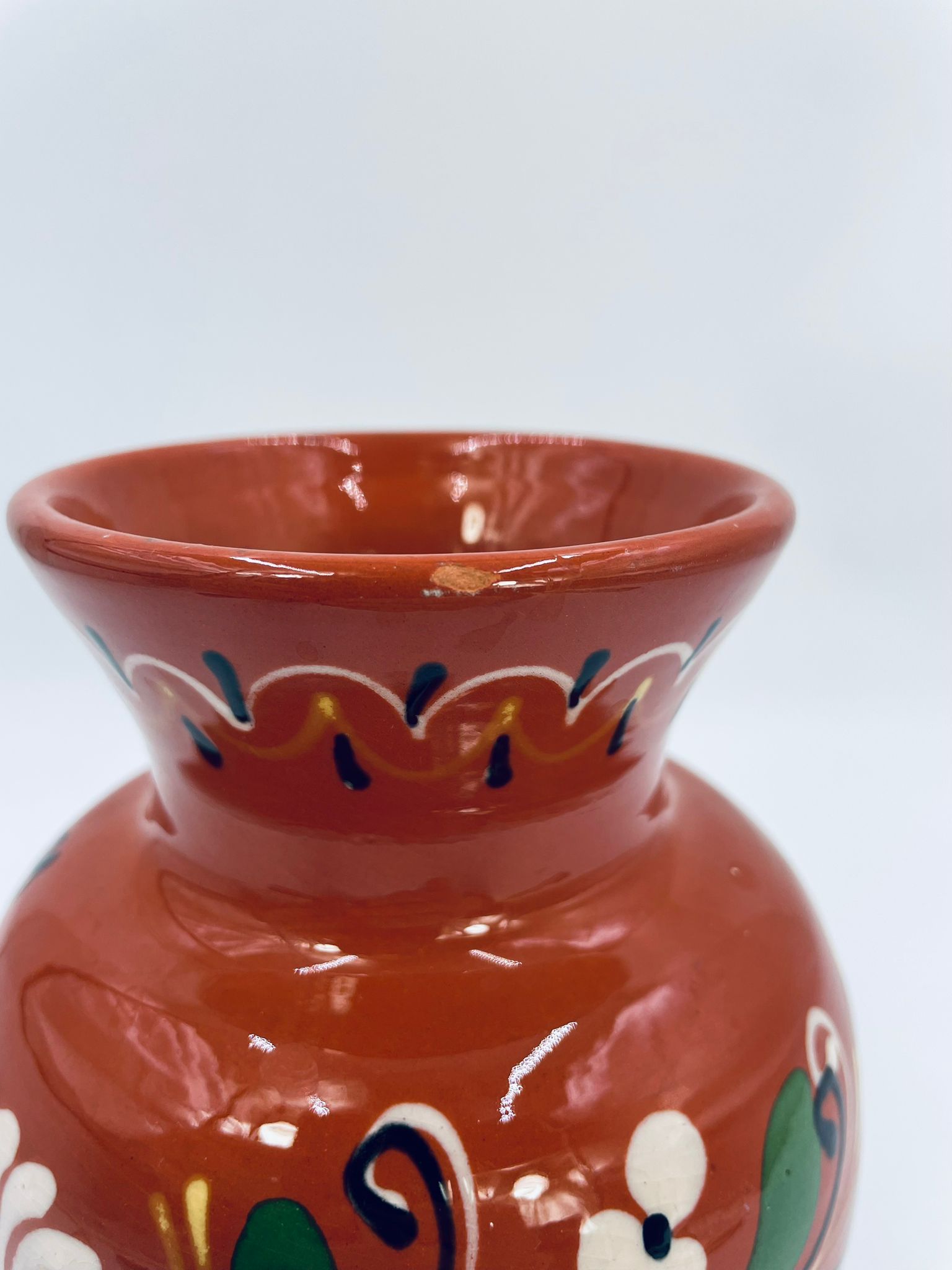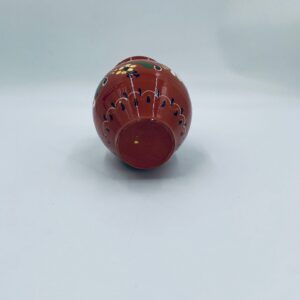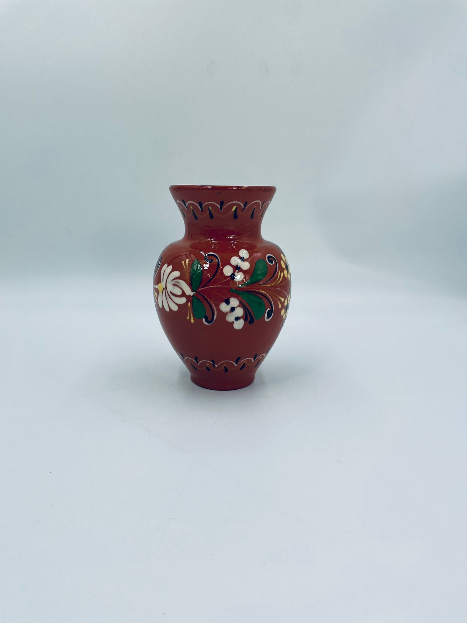 Wazon dekoracyjny Węgierski, wykonany z wysokiej jakości ceramiki. Wazon charakteryzuje się rustykalnym stylem z ręcznie malowanymi kwiatami i ozdobnymi akcentami. Posiada pęknięcie szkliwa i mały uszczerbek na górnym rancie.
