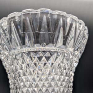 Elegancki, kryształowy wazon w stylu vintage. Posiada charakterystyczny, rzeźbiony wzór, który dodaje jej uroku. Może być wykorzystana jako dekoracja lub do przechowywania kwiatów. Mimo że jest używana, zachowała swój blask i jest w dobrym stanie.