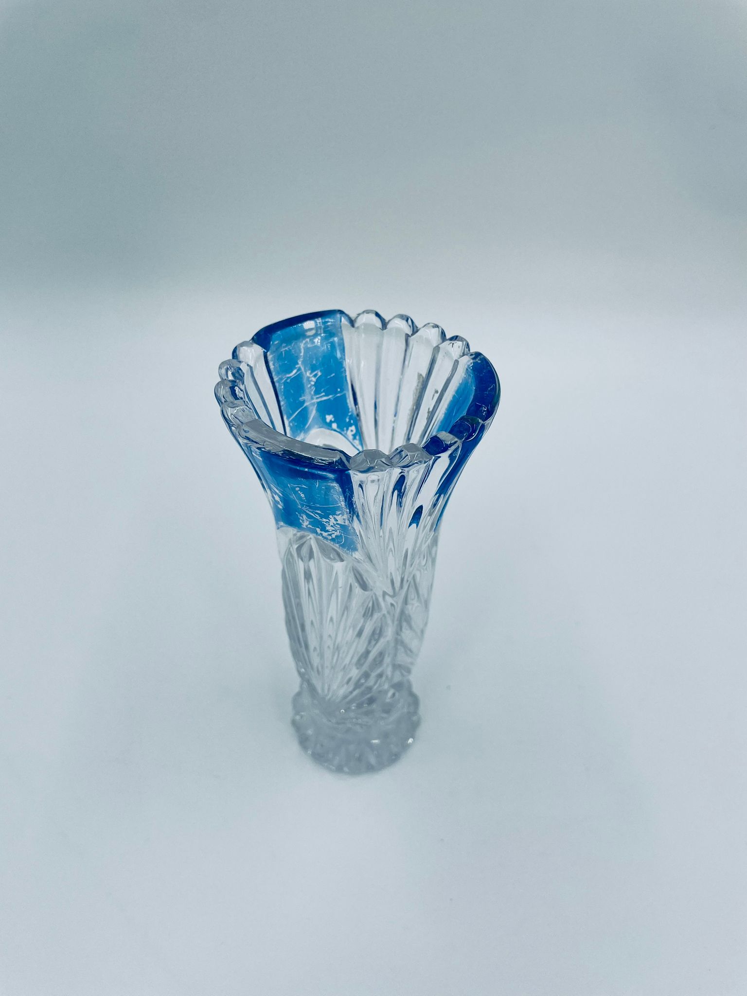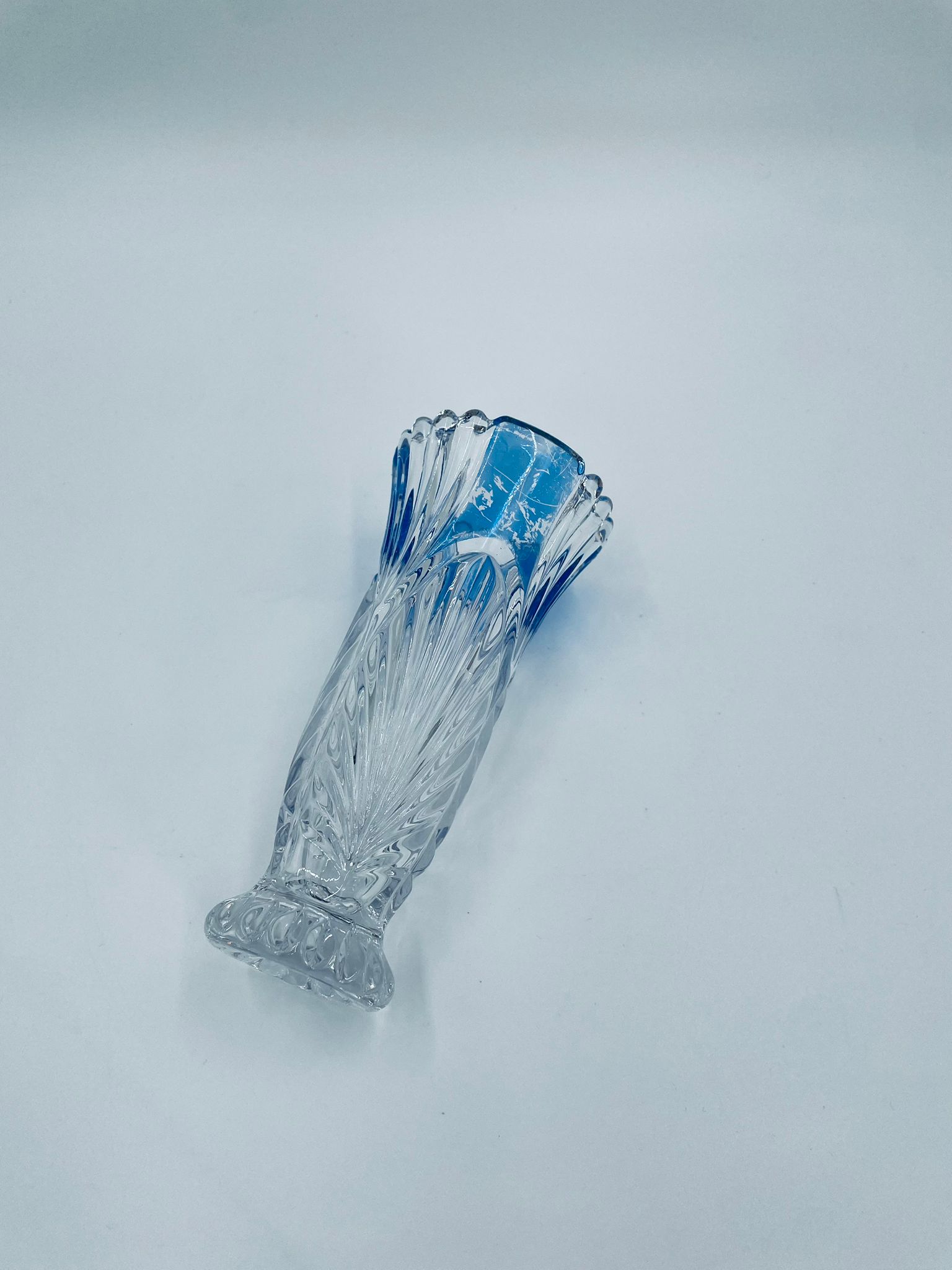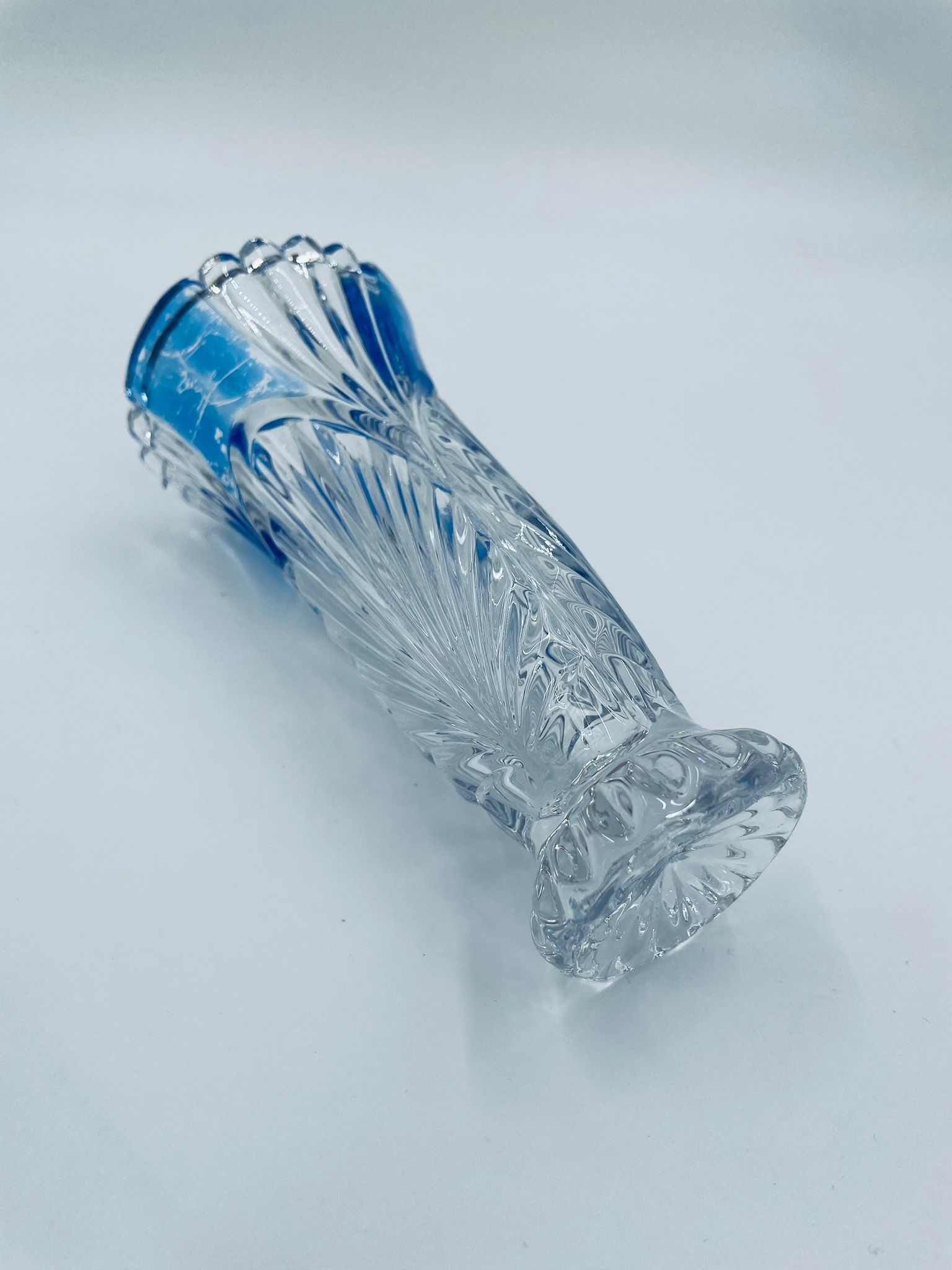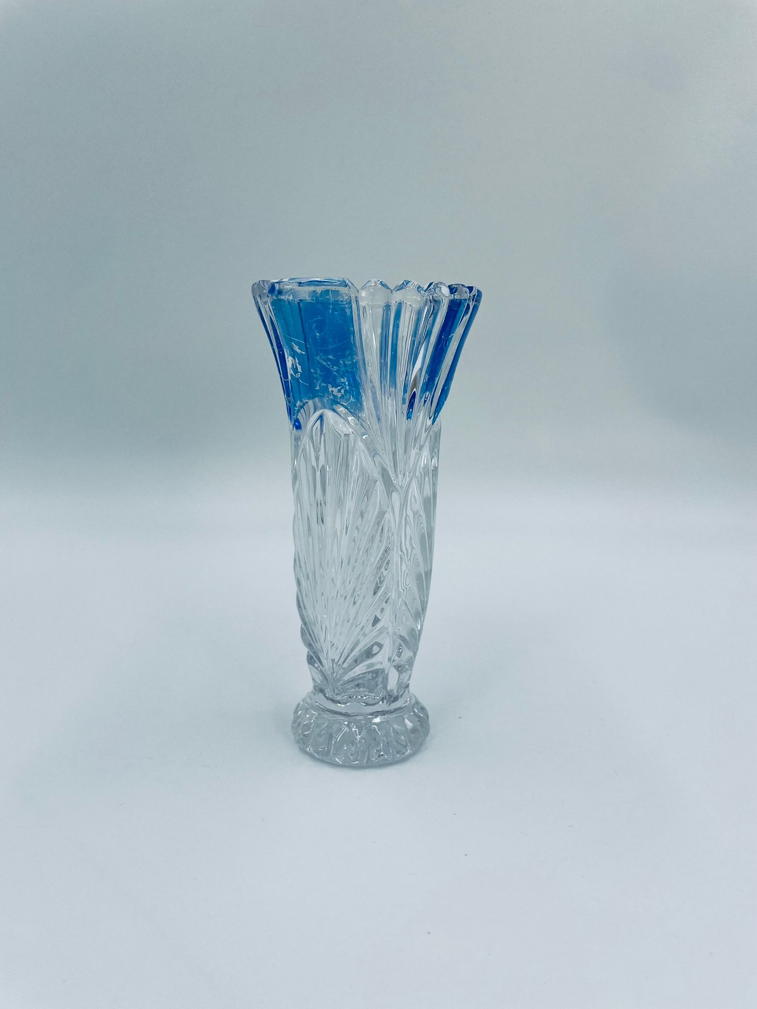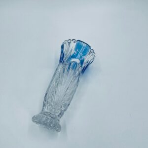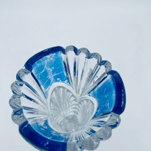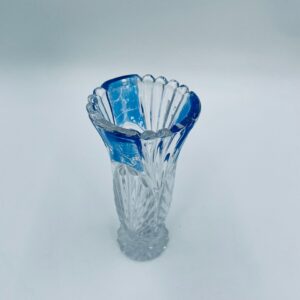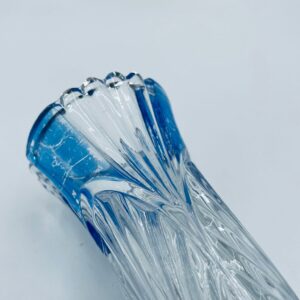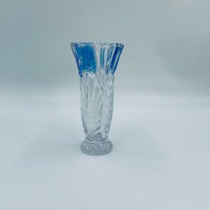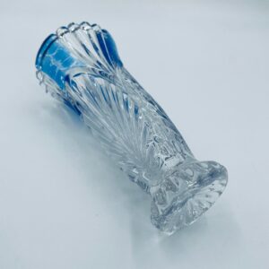 Wazon dekoracyjny wytwórni Anna Hutte Bleikristal, wykonany z prawdziwego kryształu ołowiowego, który zawiera ponad 24% ołowiu PbO, co nadaje zwiększa jego przejrzystość i blask. Wazon zdobiony rzeźbionym wzorem liścia, falistą górną krawędzią, ozdobną podstawą oraz z niebieskim akcentem w górnej części. Posiada przetarcie na niebieskim kolorze.