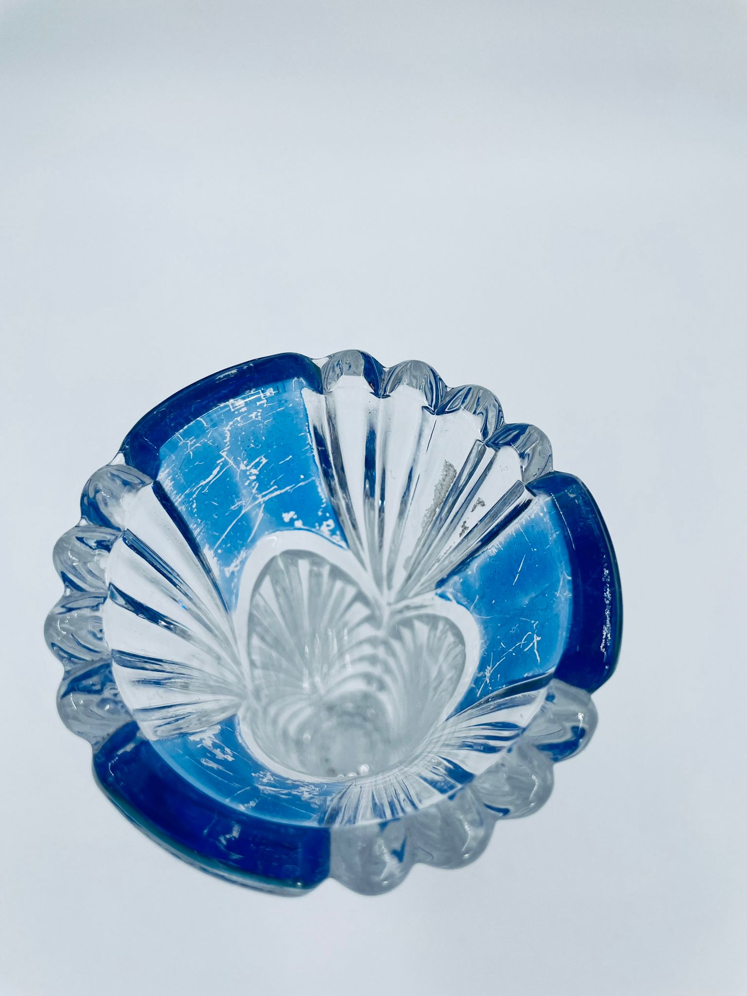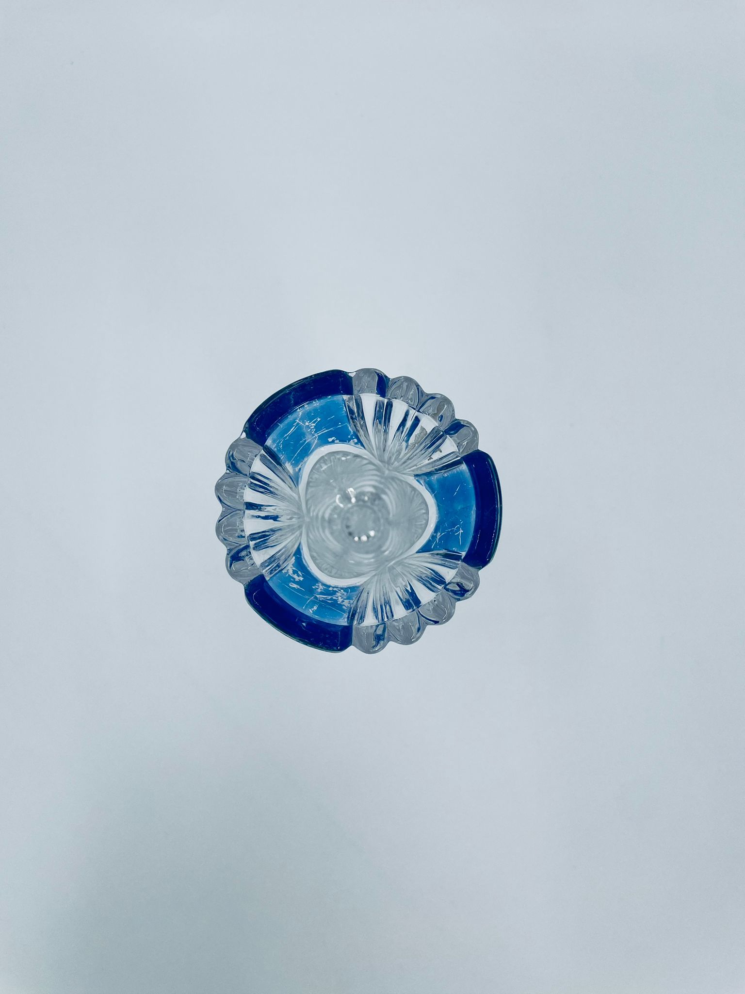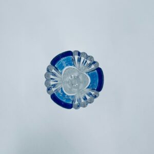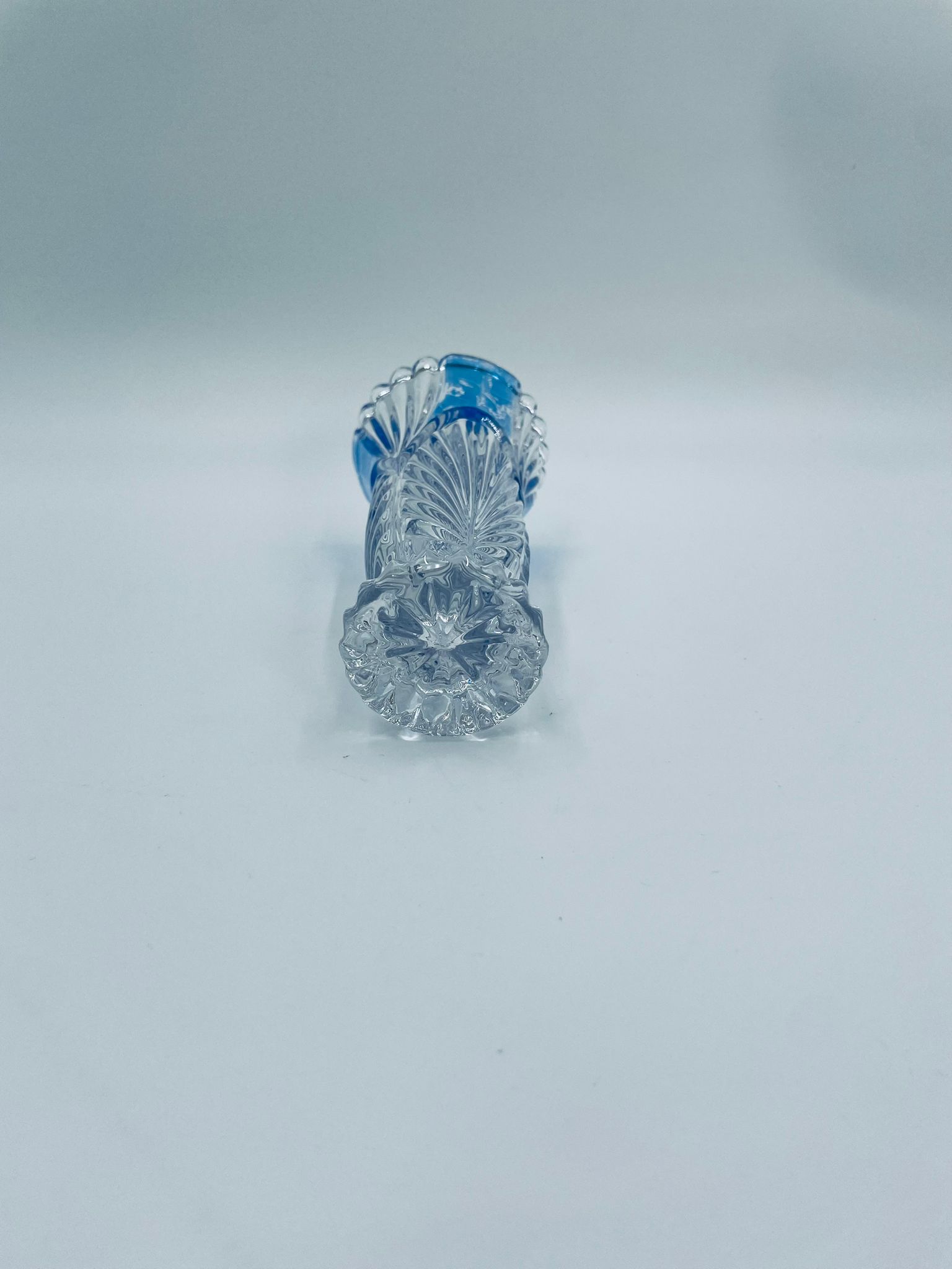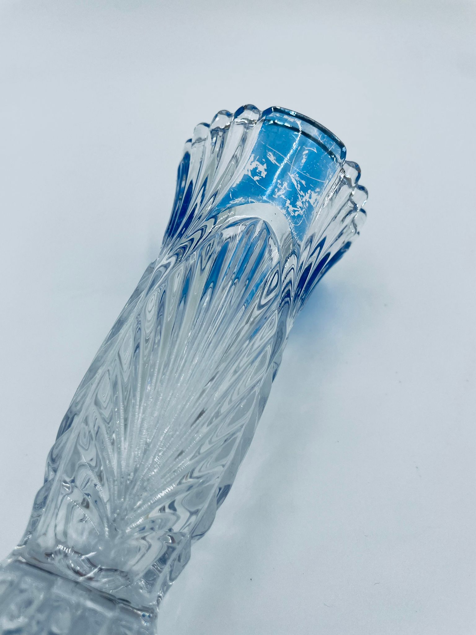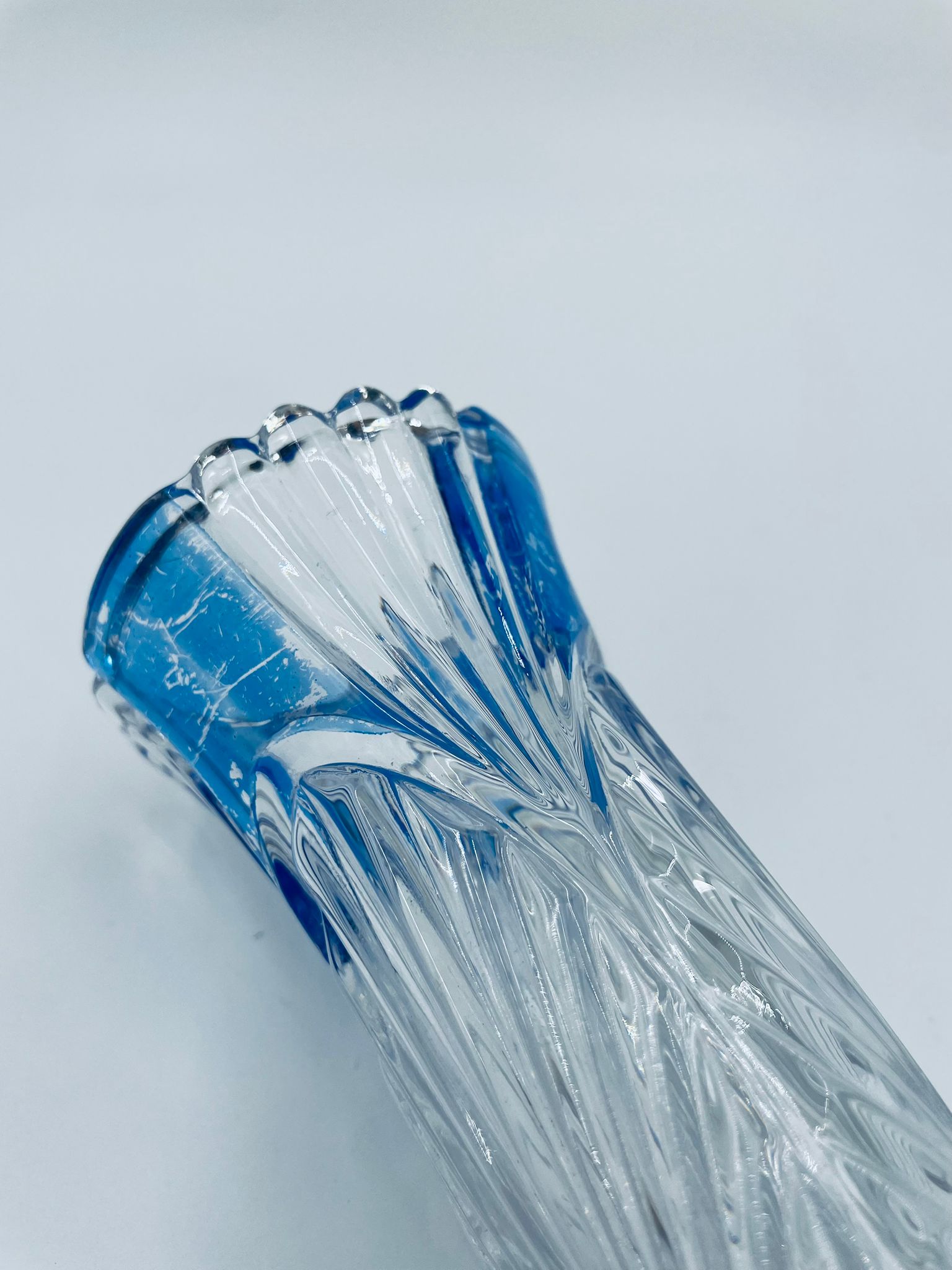 Wazon dekoracyjny wytwórni Anna Hutte Bleikristal, wykonany z prawdziwego kryształu ołowiowego, który zawiera ponad 24% ołowiu PbO, co nadaje zwiększa jego przejrzystość i blask. Wazon zdobiony rzeźbionym wzorem liścia, falistą górną krawędzią, ozdobną podstawą oraz z niebieskim akcentem w górnej części. Posiada przetarcie na niebieskim kolorze.