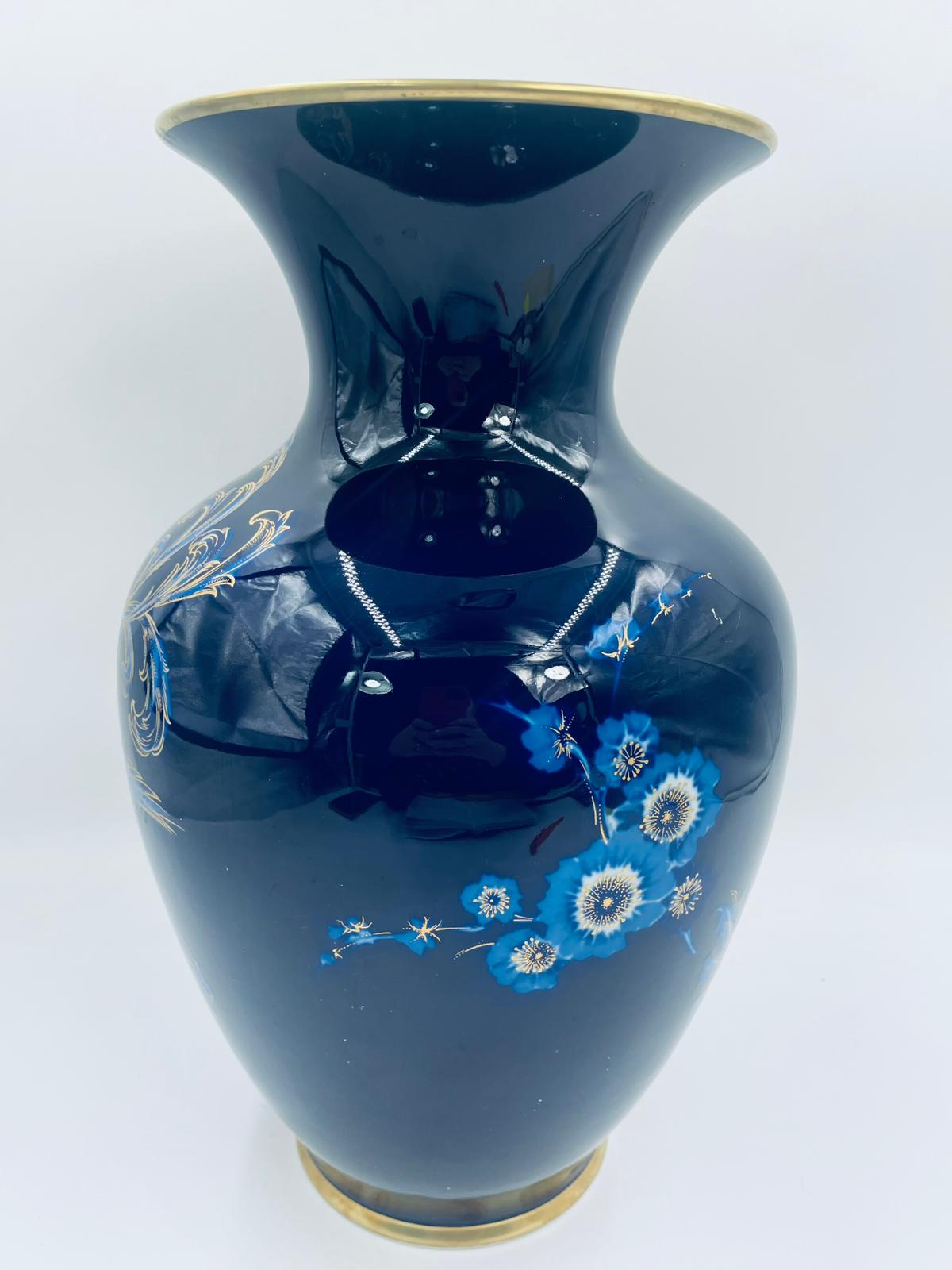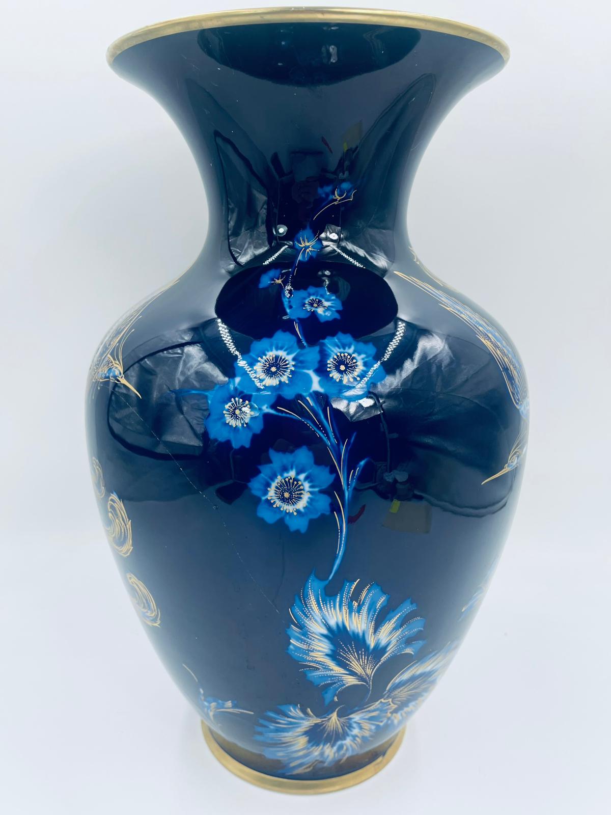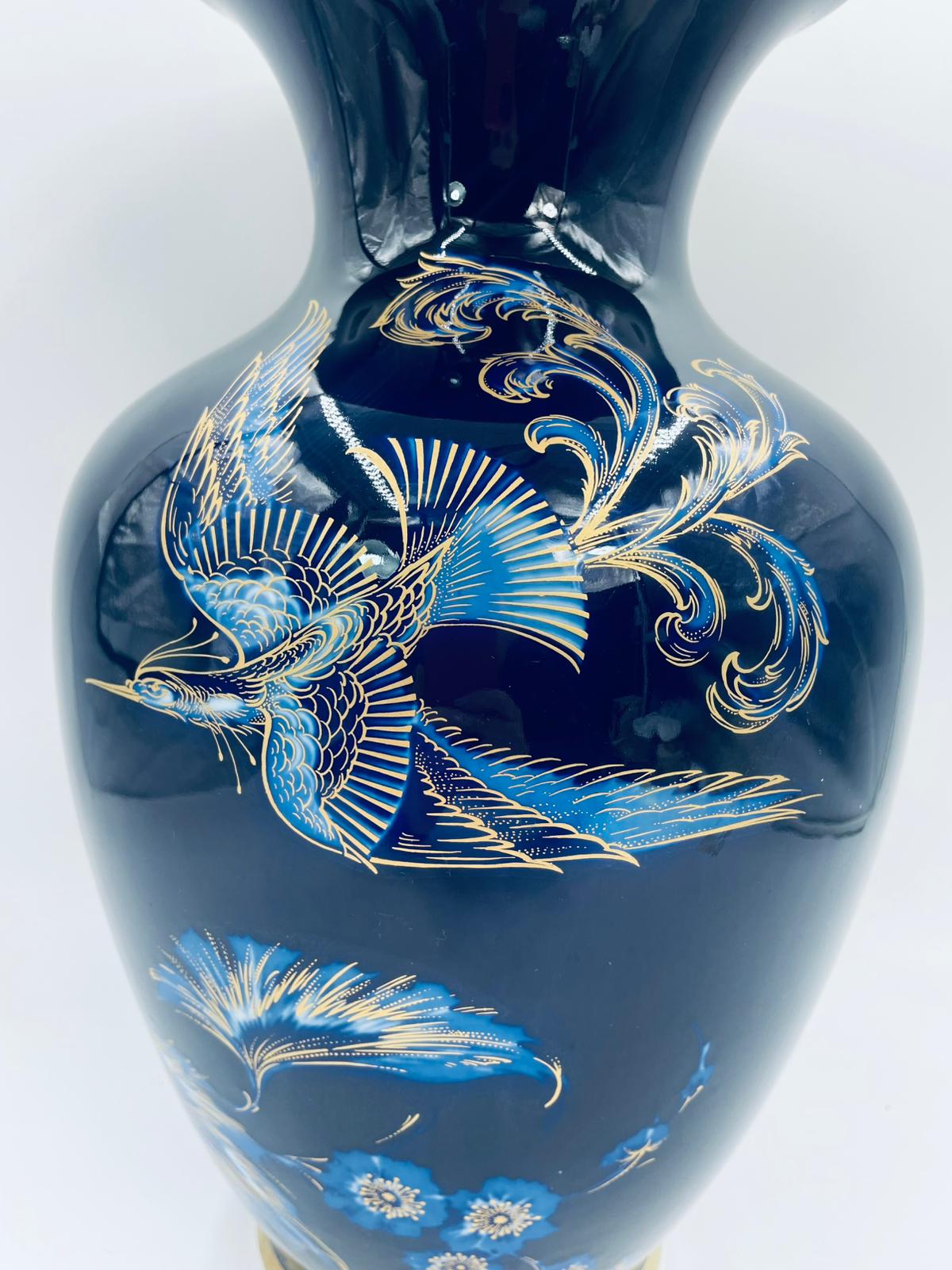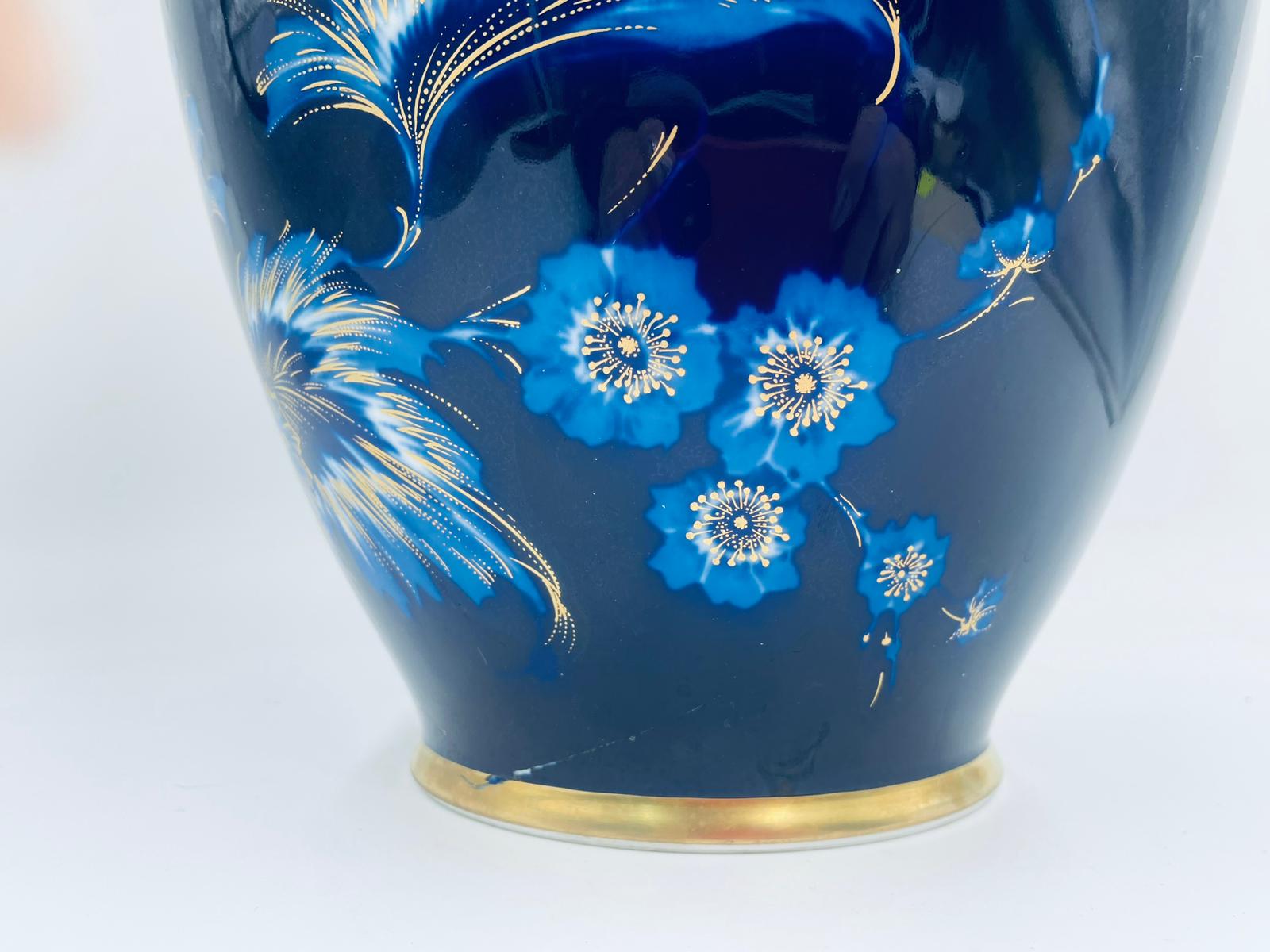 Duży wazon kobaltowo- niebieski Inglasur Schumman Arzberg. Wazon przedstawia rajskiego ptaka. Wykończony złotym rantem.