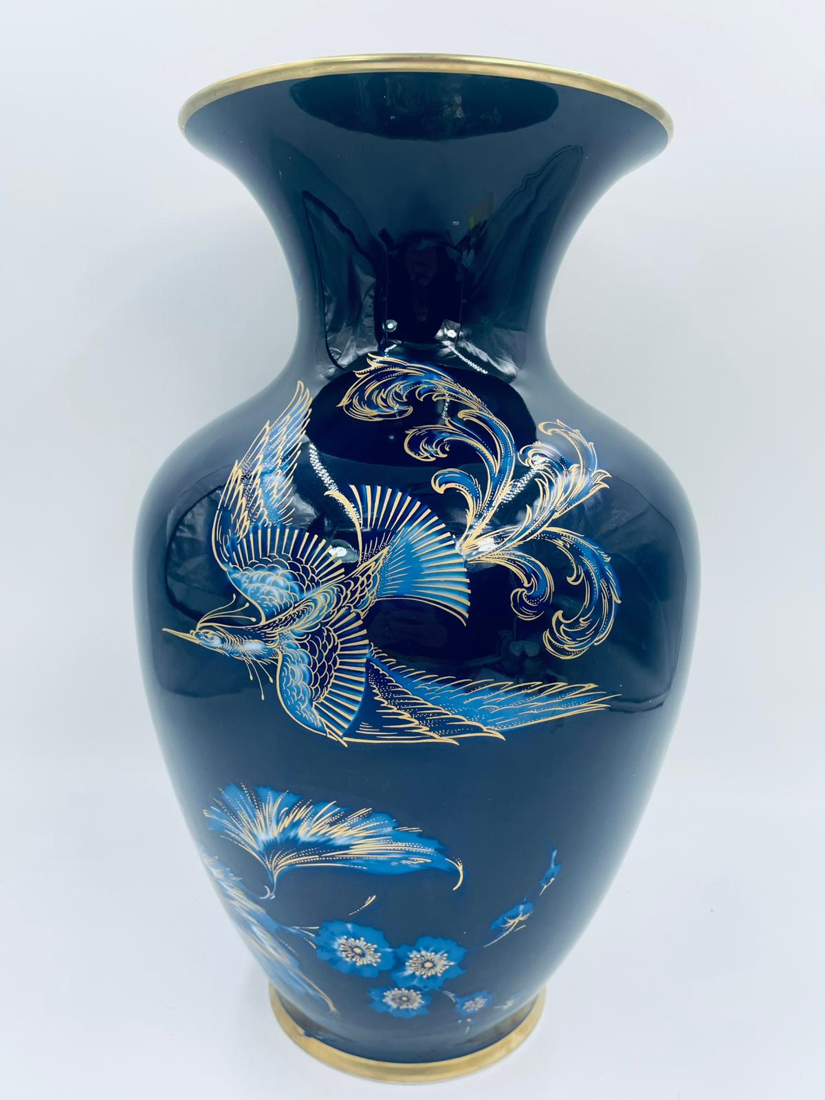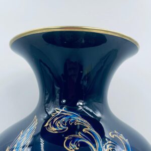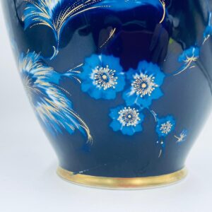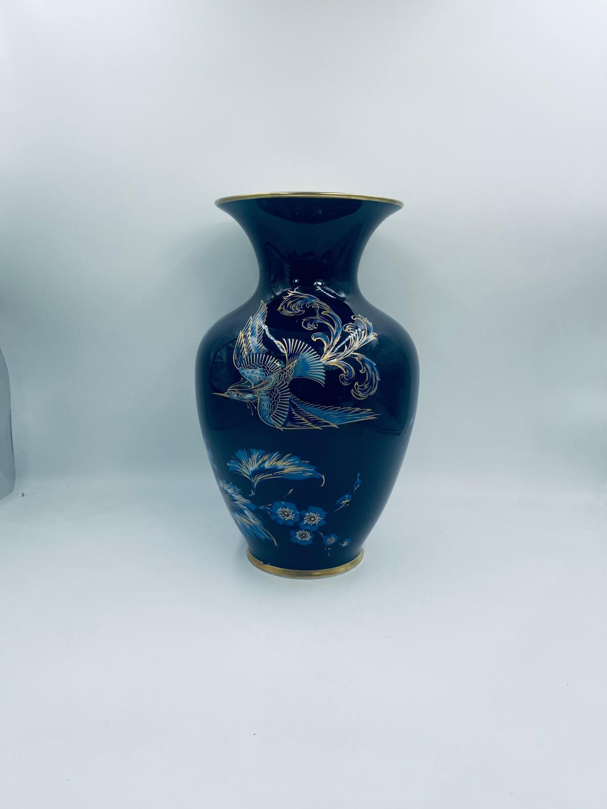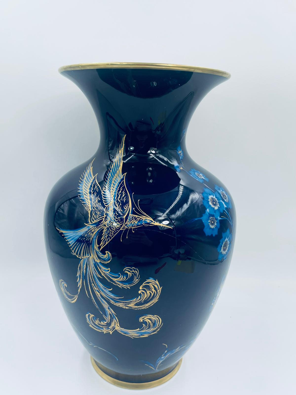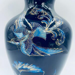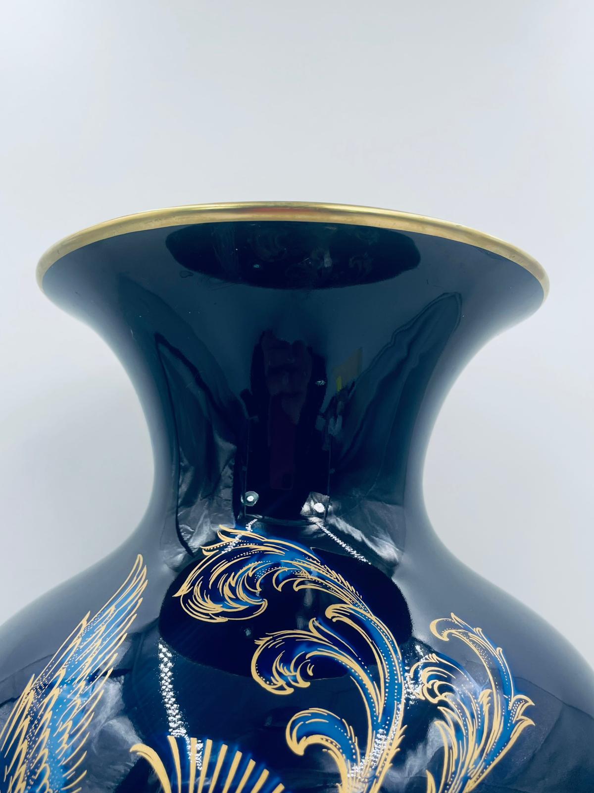 Duży wazon kobaltowo- niebieski Inglasur Schumman Arzberg. Wazon przedstawia rajskiego ptaka. Wykończony złotym rantem.