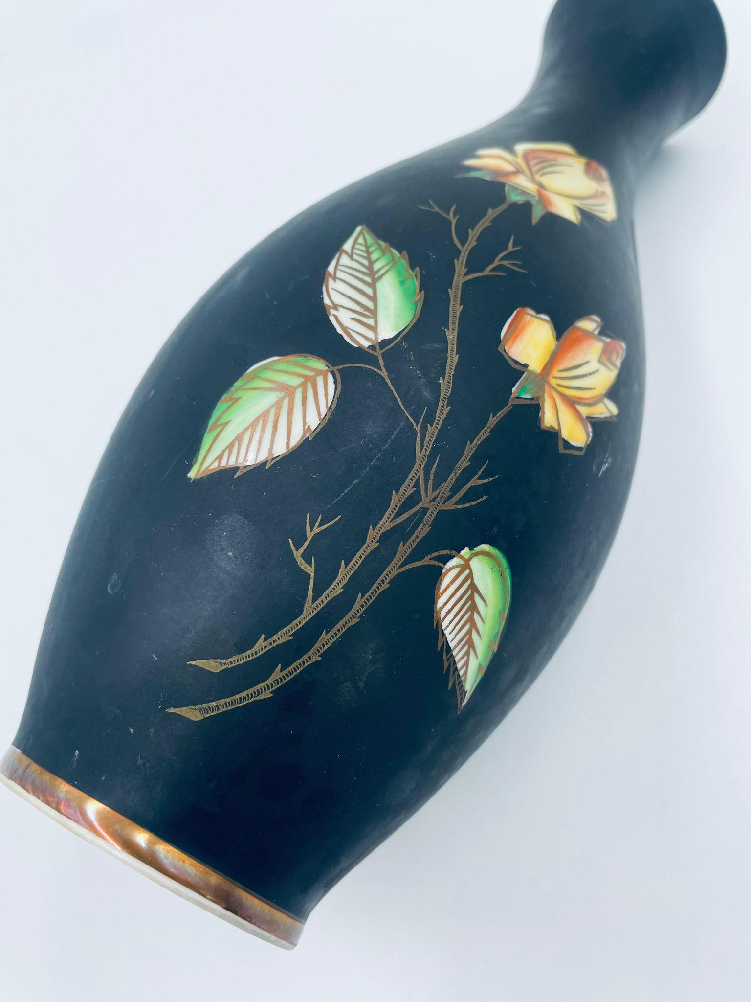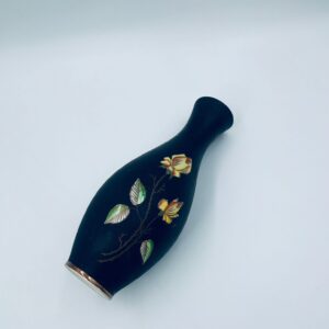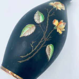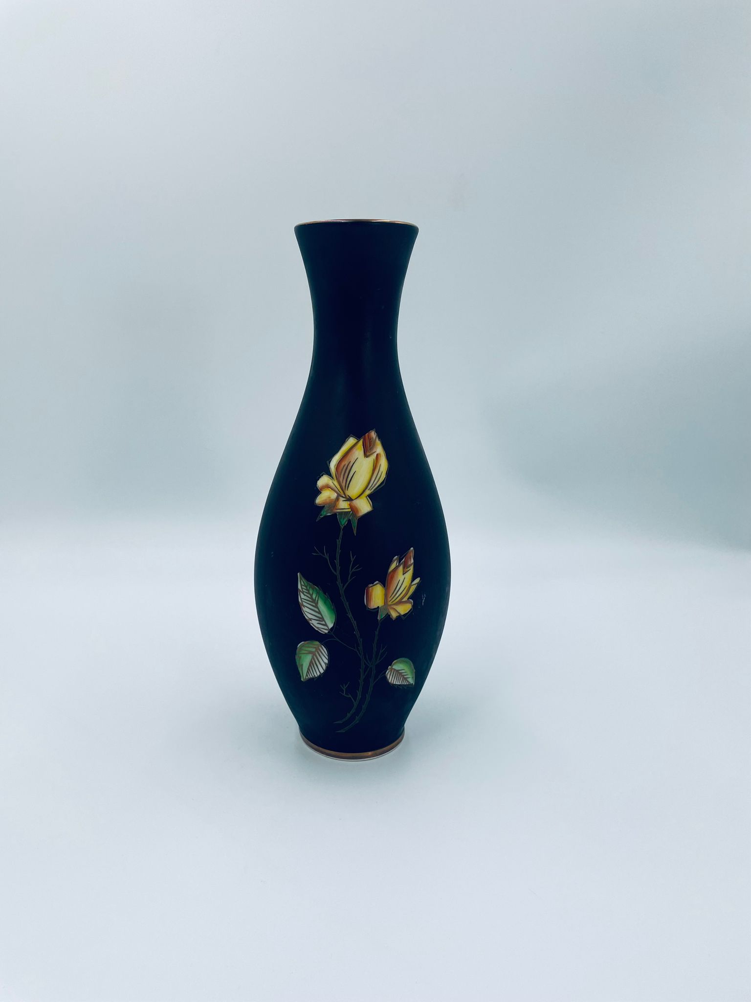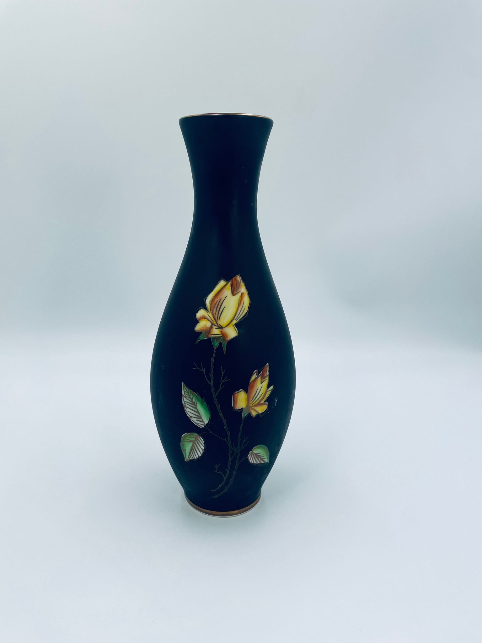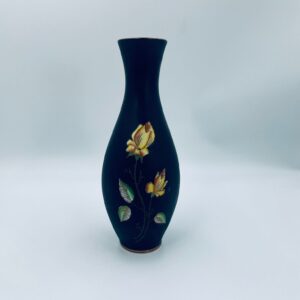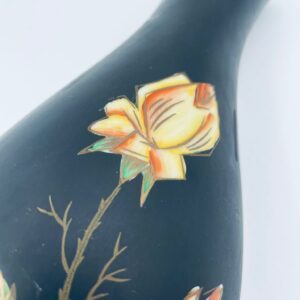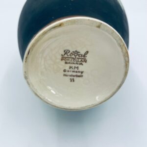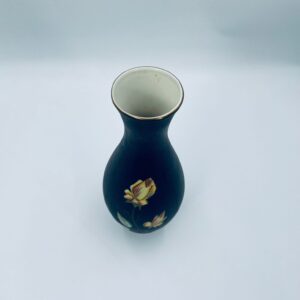Wazon dekoracyjny wytwórni Royal Porzellan Bavaria KM Germany, pochodzący z fabryki Kerafina GmbH w Marktredwitz z lat 60tych XX wieku, wykonany z najwyższej jakości porcelany. Wazon ręcznie wykonany, z czarna , matową powierzchnia, ozdobiony ręcznie malowanymi, żółtymi różami z zielonymi liśćmi, wykończony złoceniem na ratach. Posiada małe przetarcie oraz pęknięcie szkliwa od spodu.