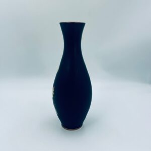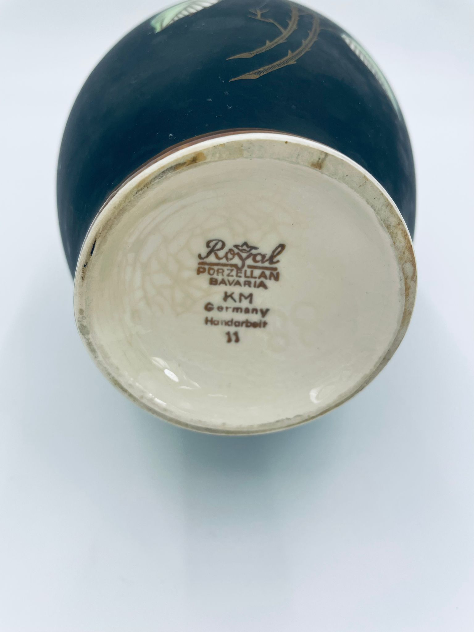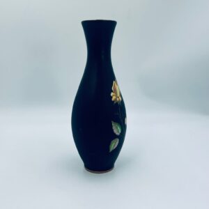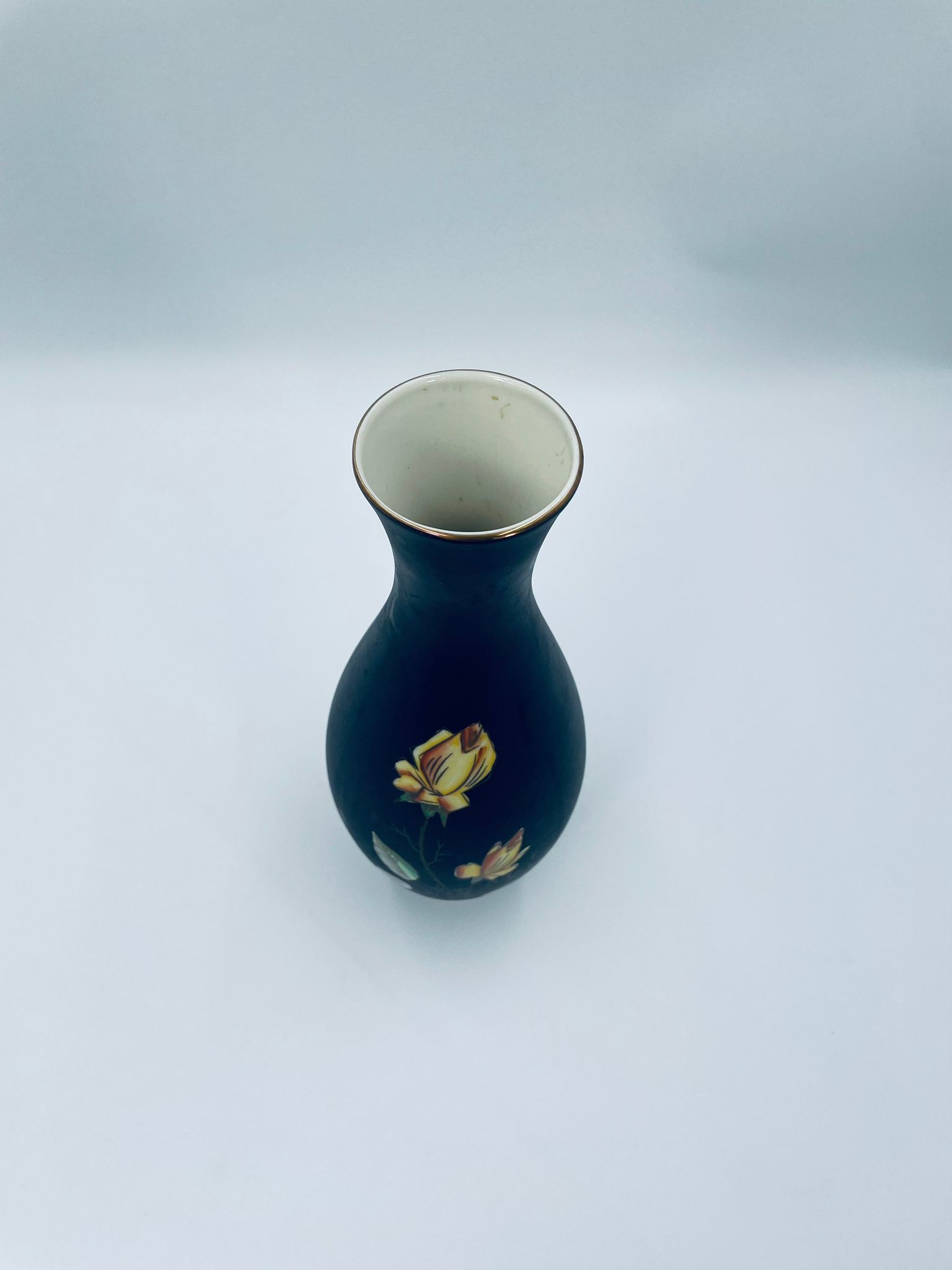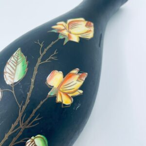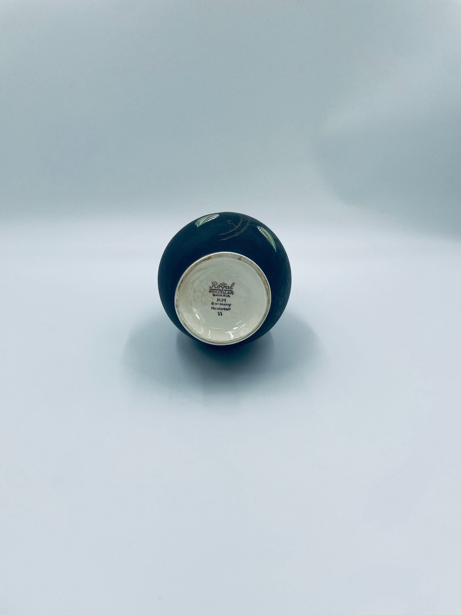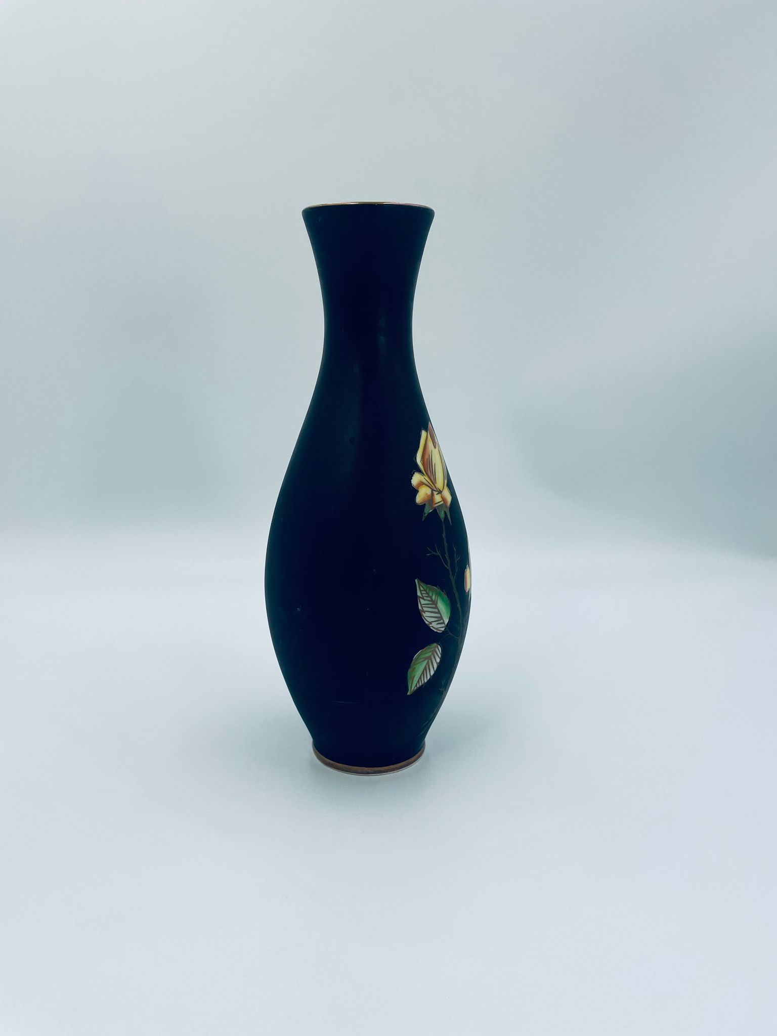 Wazon dekoracyjny wytwórni Royal Porzellan Bavaria KM Germany, pochodzący z fabryki Kerafina GmbH w Marktredwitz z lat 60tych XX wieku, wykonany z najwyższej jakości porcelany. Wazon ręcznie wykonany, z czarna , matową powierzchnia, ozdobiony ręcznie malowanymi, żółtymi różami z zielonymi liśćmi, wykończony złoceniem na ratach. Posiada małe przetarcie oraz pęknięcie szkliwa od spodu.