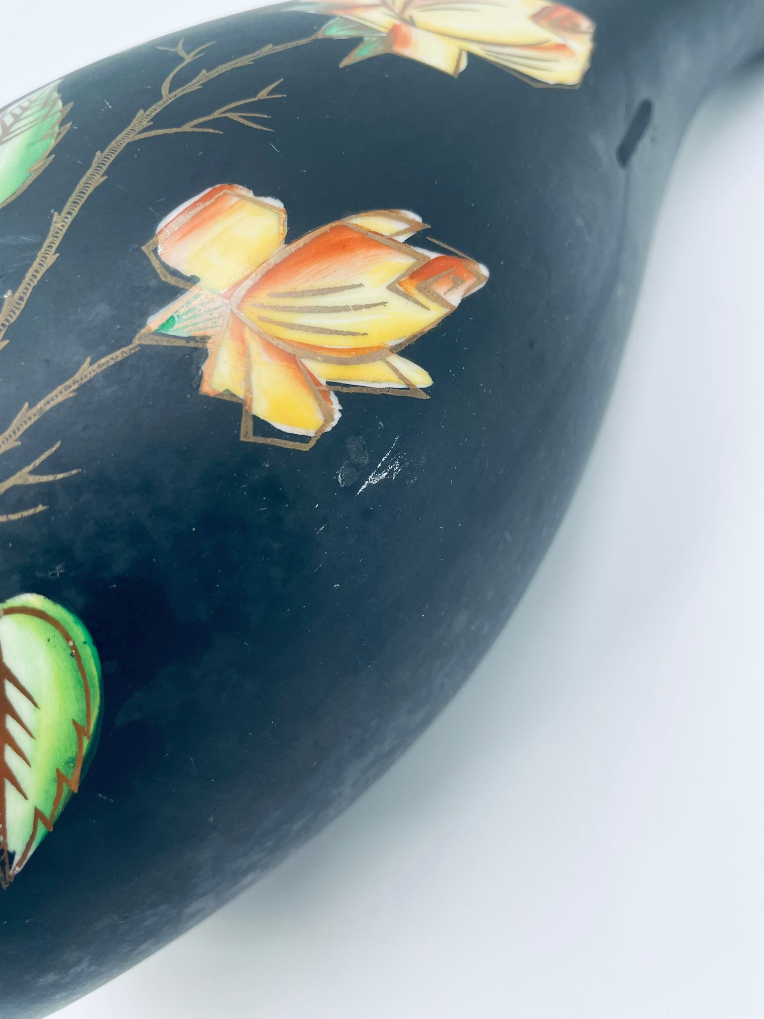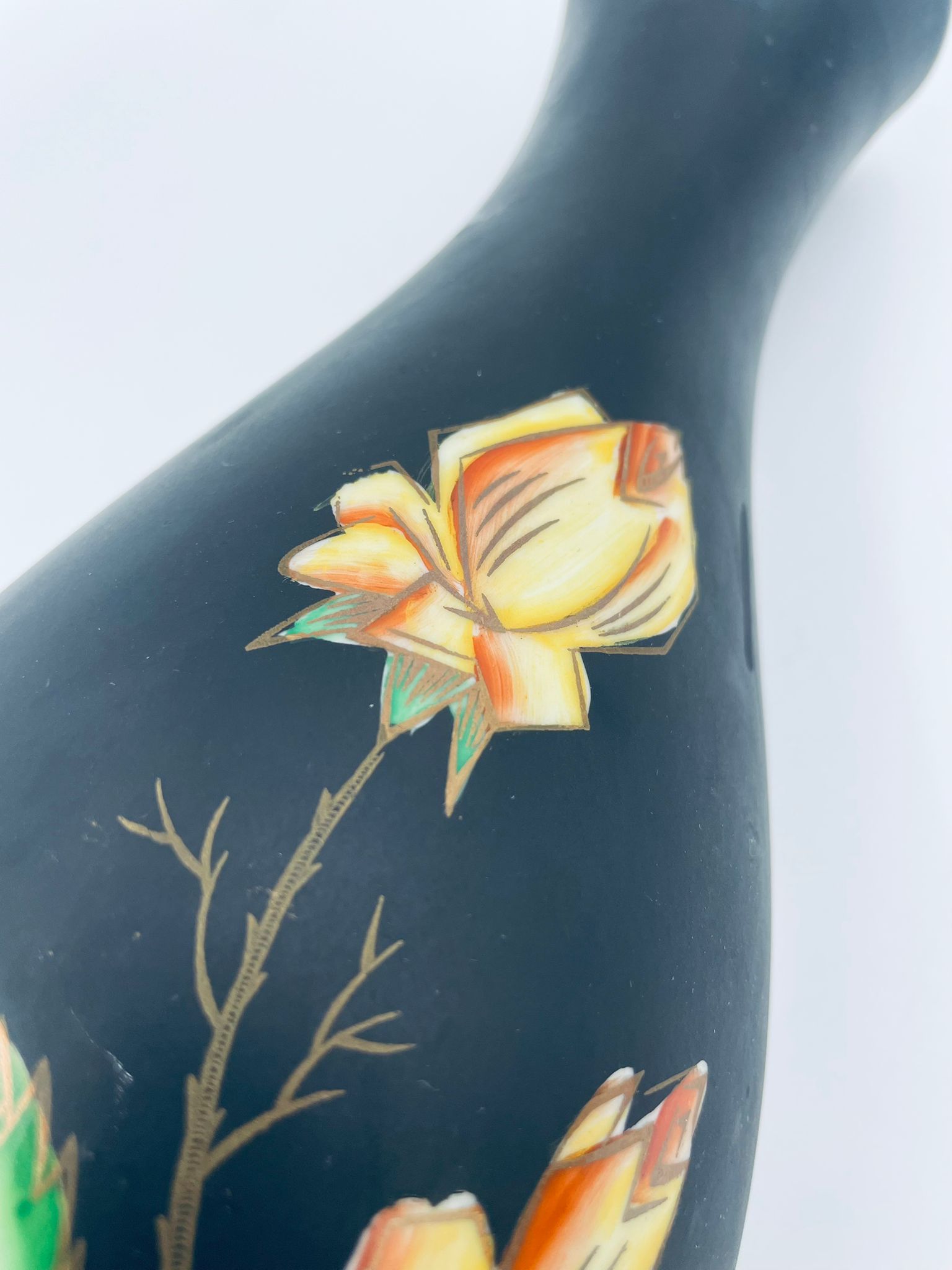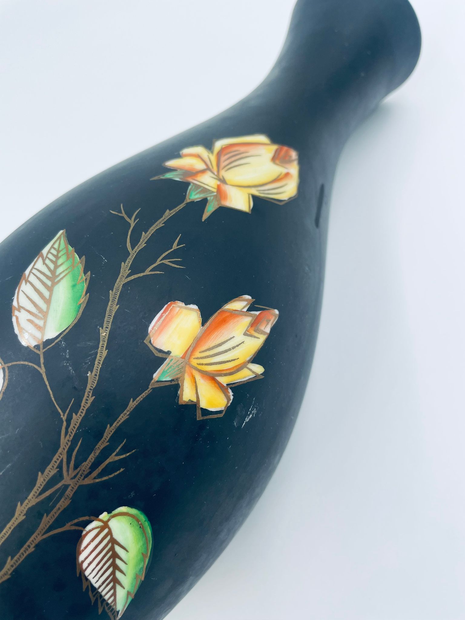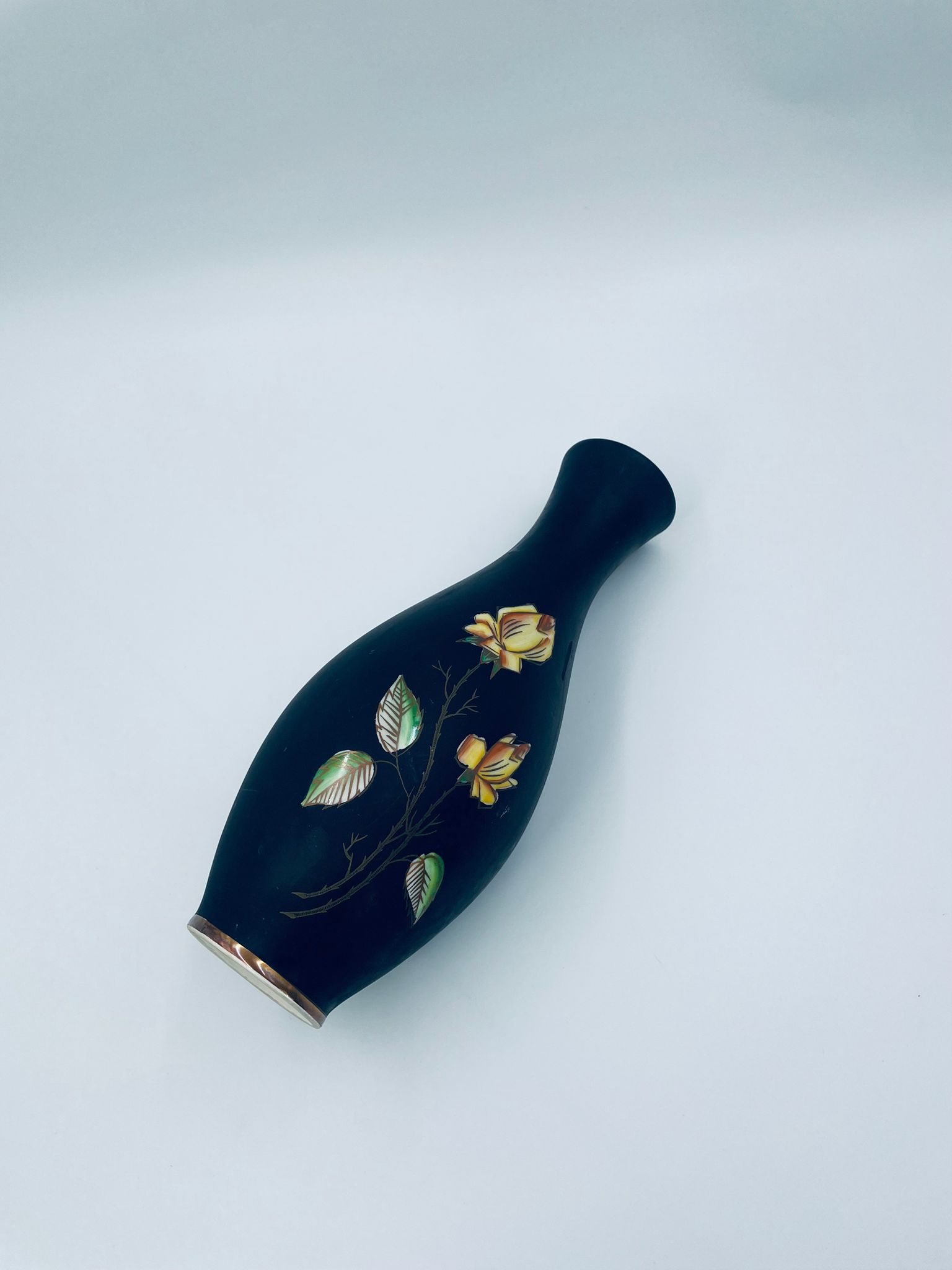 Wazon dekoracyjny wytwórni Royal Porzellan Bavaria KM Germany, pochodzący z fabryki Kerafina GmbH w Marktredwitz z lat 60tych XX wieku, wykonany z najwyższej jakości porcelany. Wazon ręcznie wykonany, z czarna , matową powierzchnia, ozdobiony ręcznie malowanymi, żółtymi różami z zielonymi liśćmi, wykończony złoceniem na ratach. Posiada małe przetarcie oraz pęknięcie szkliwa od spodu.