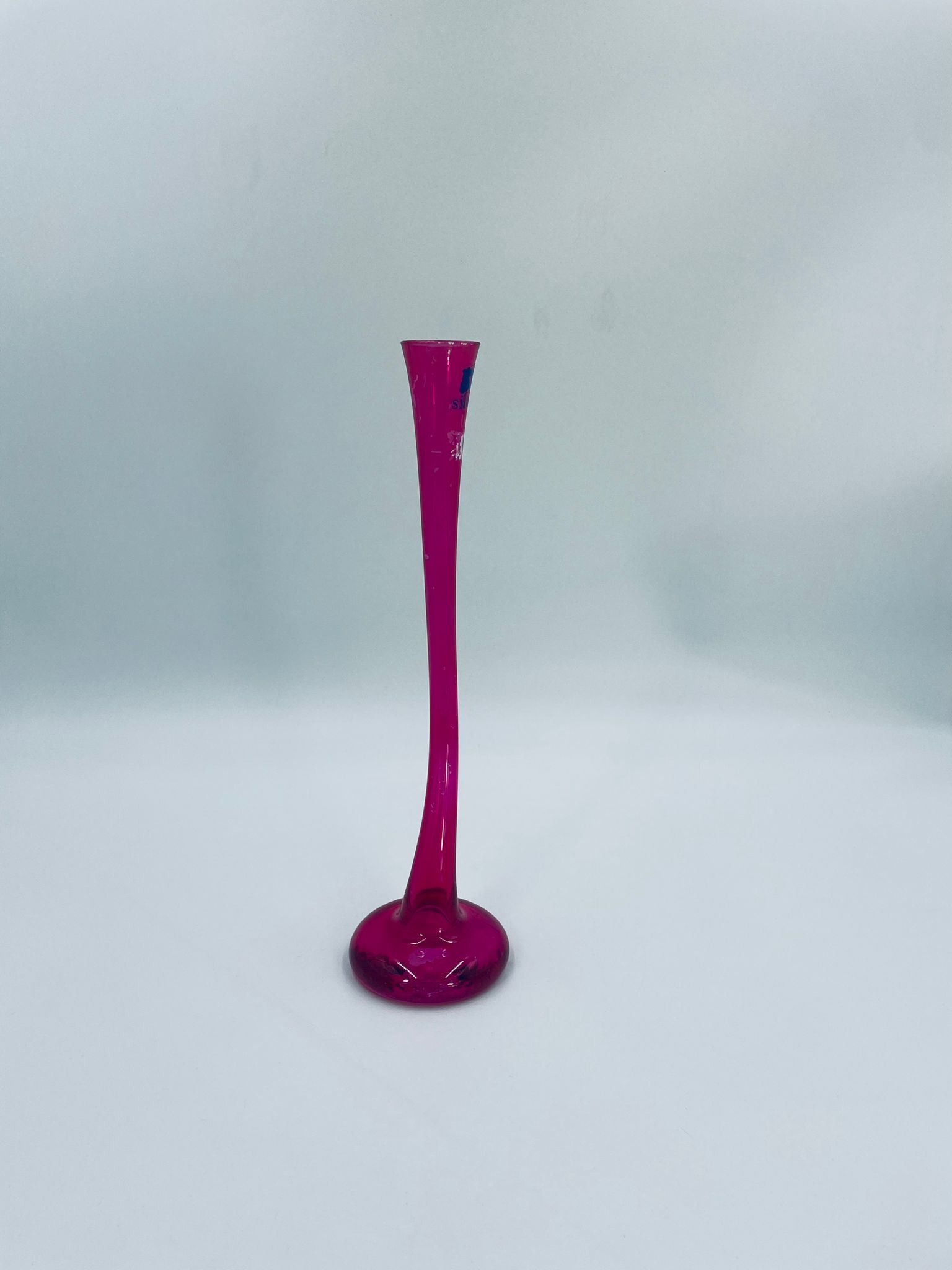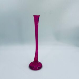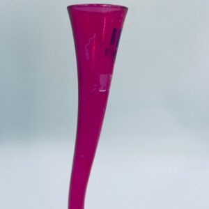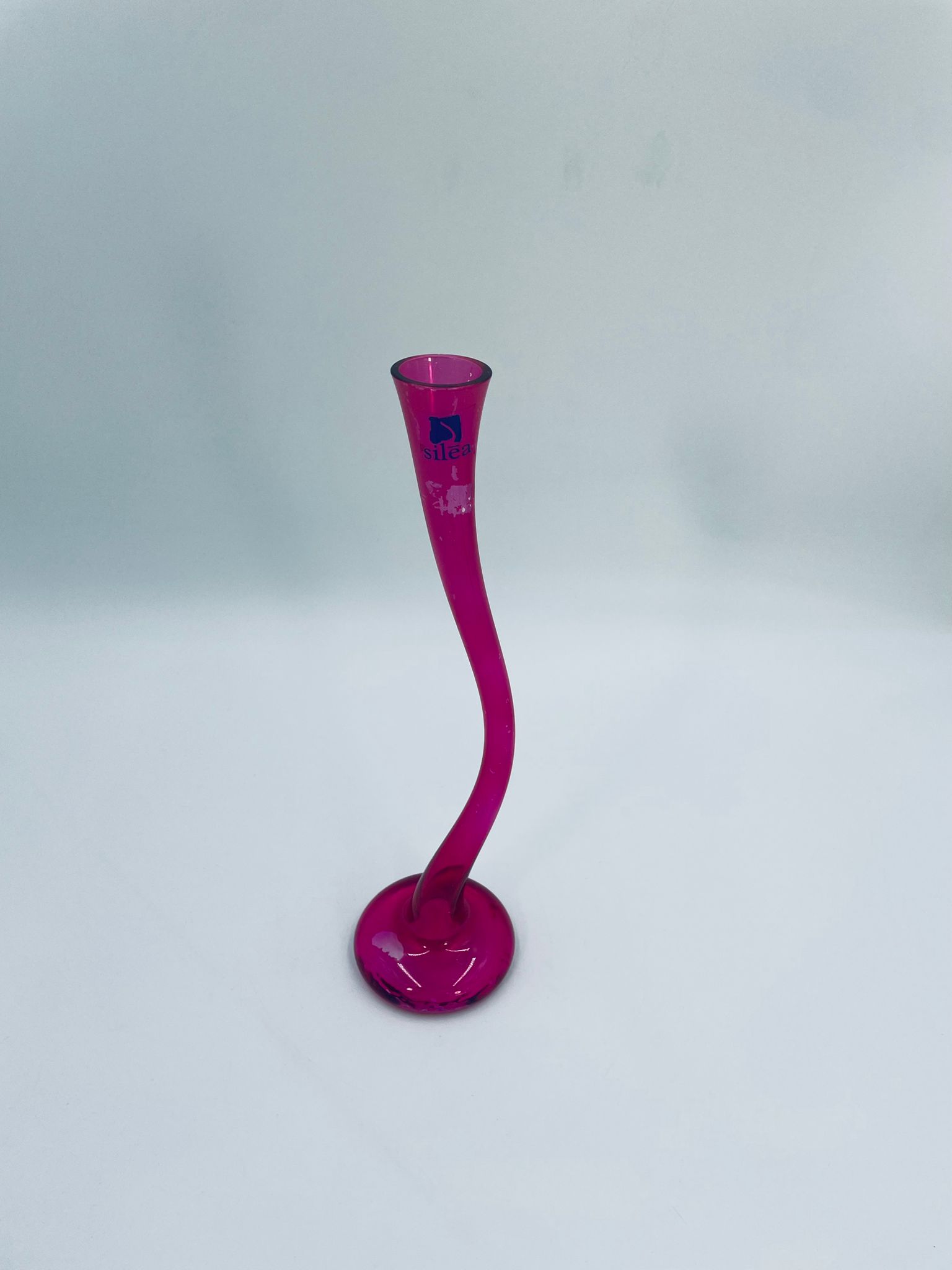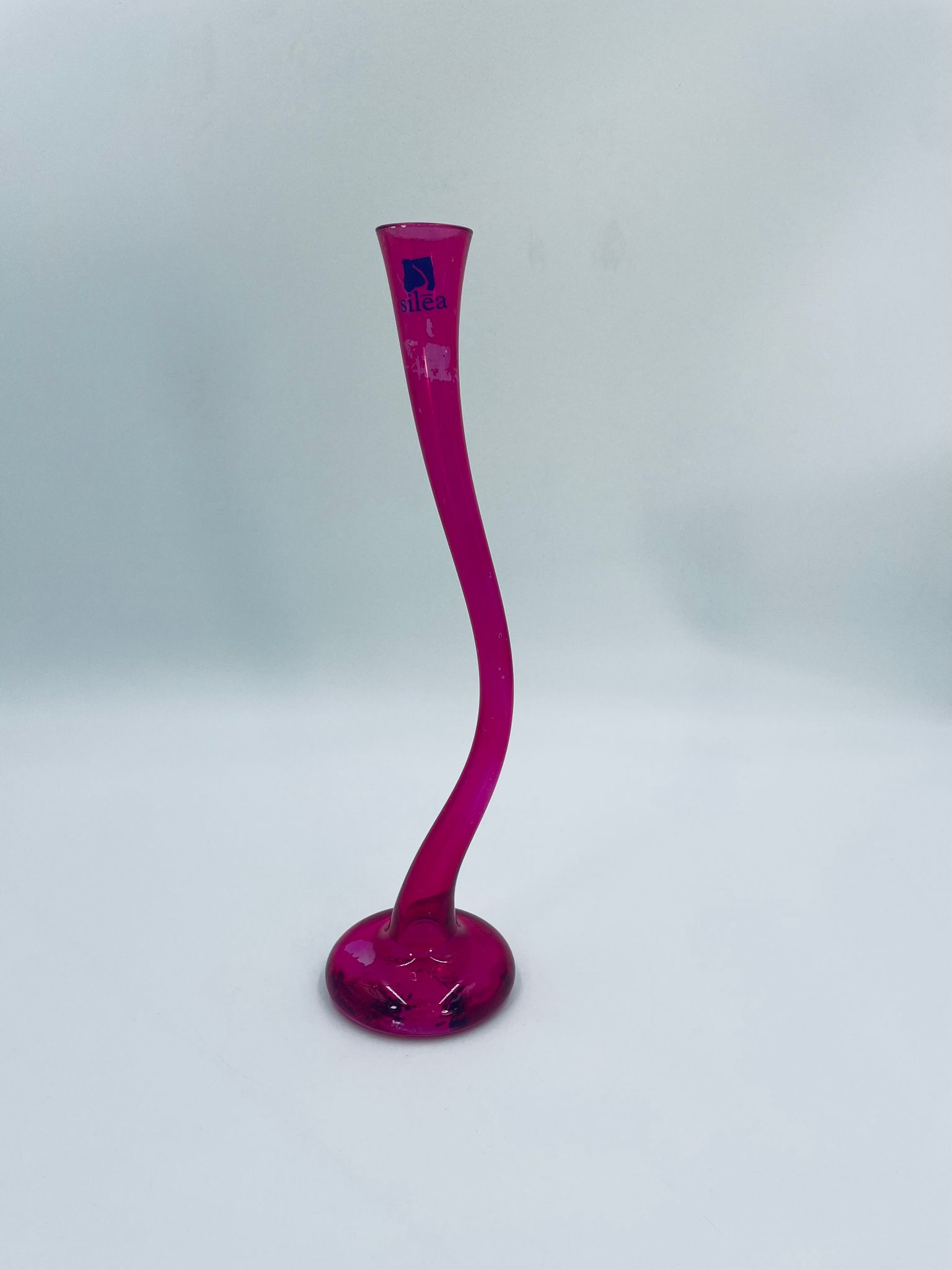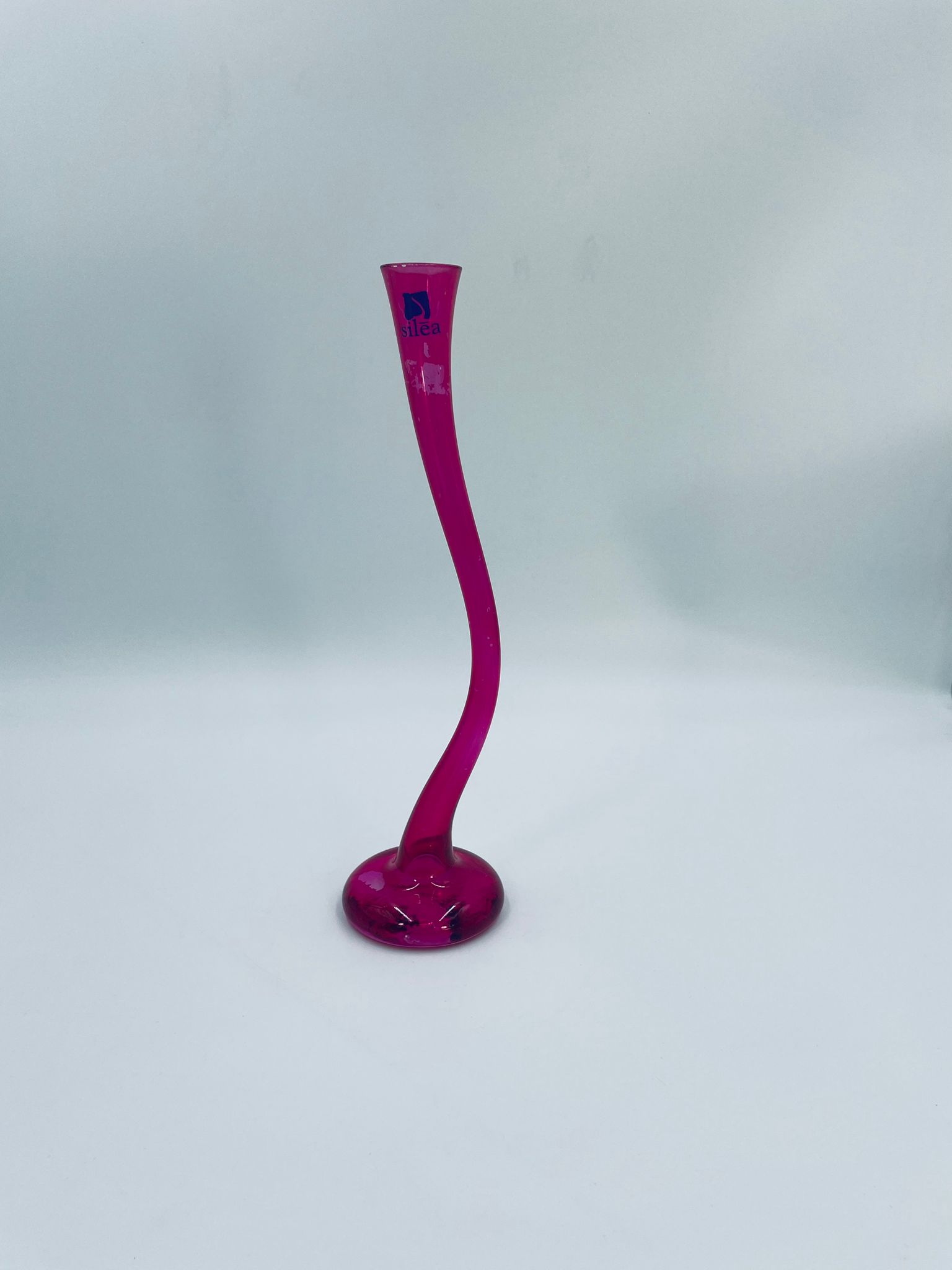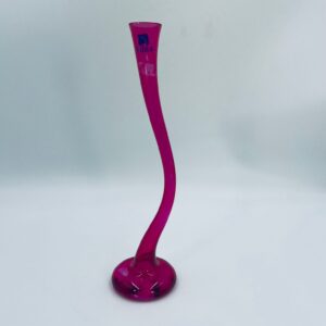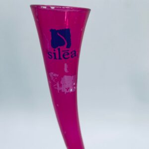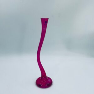 Wazon dekoracyjny marki Silea, wykonany z wysokiej jakości szkła. Wazon o różowej barwie i charakterystycznym, wygiętym kształtem. Posiada przetarcie na kolorze.