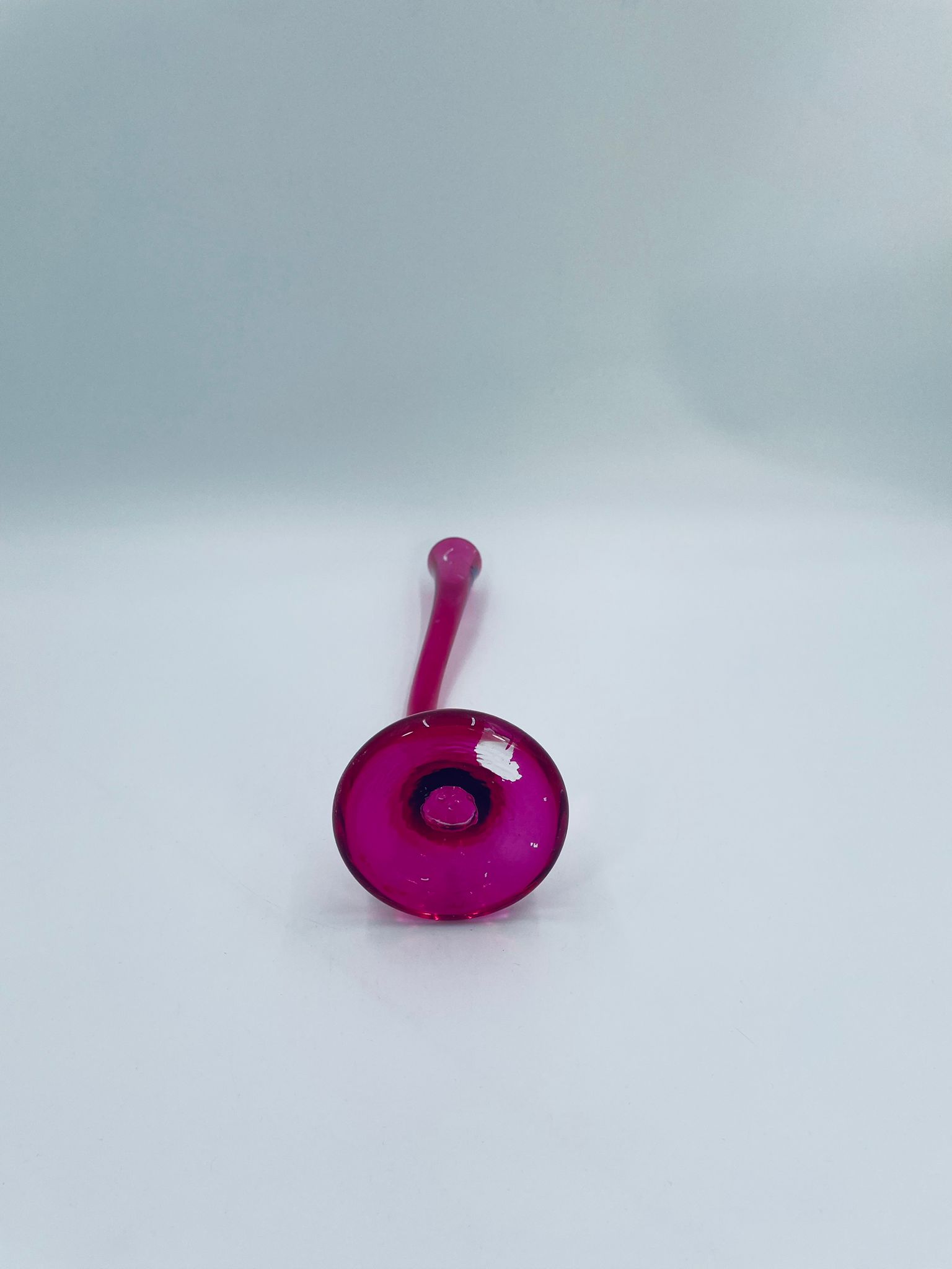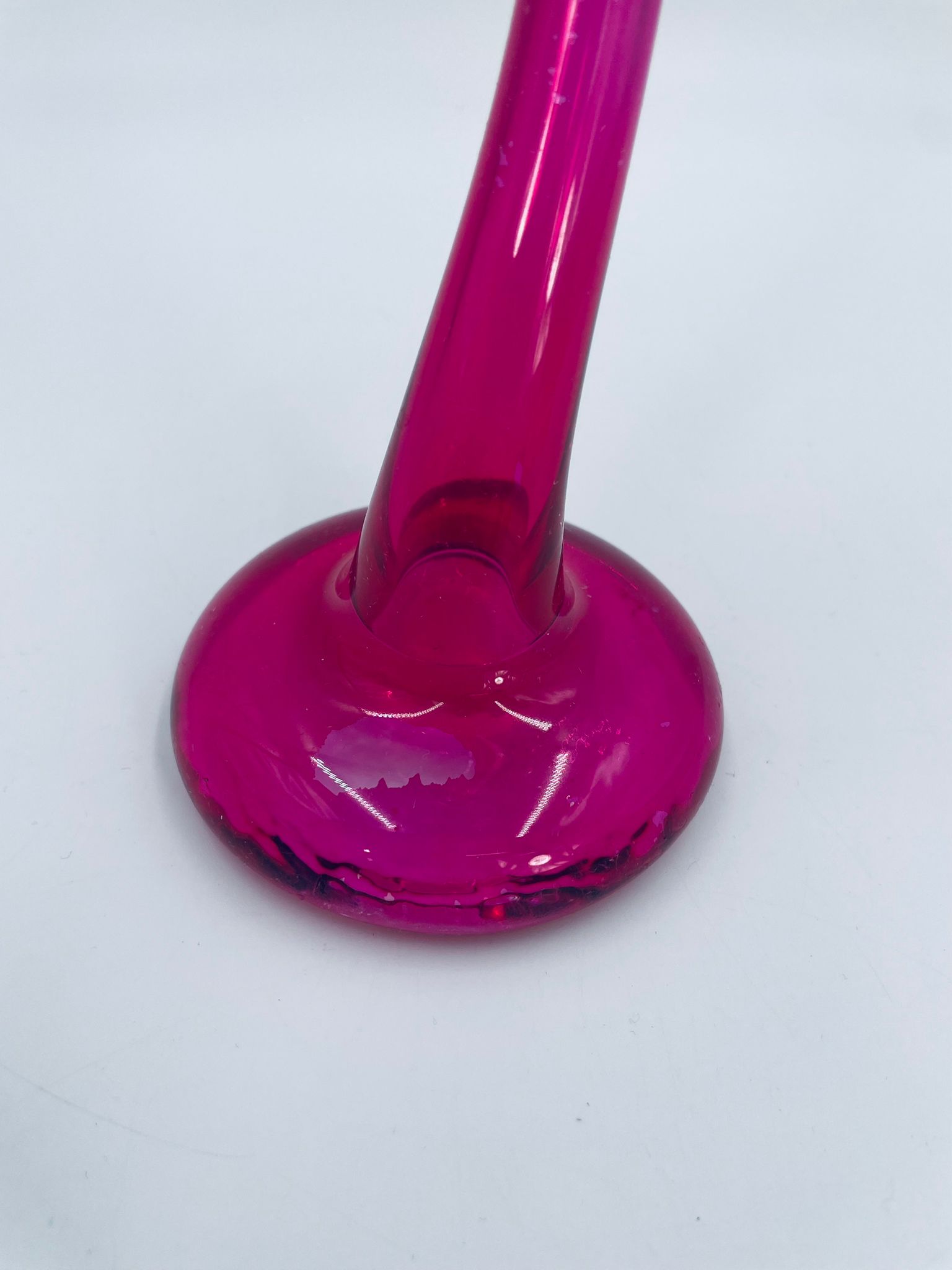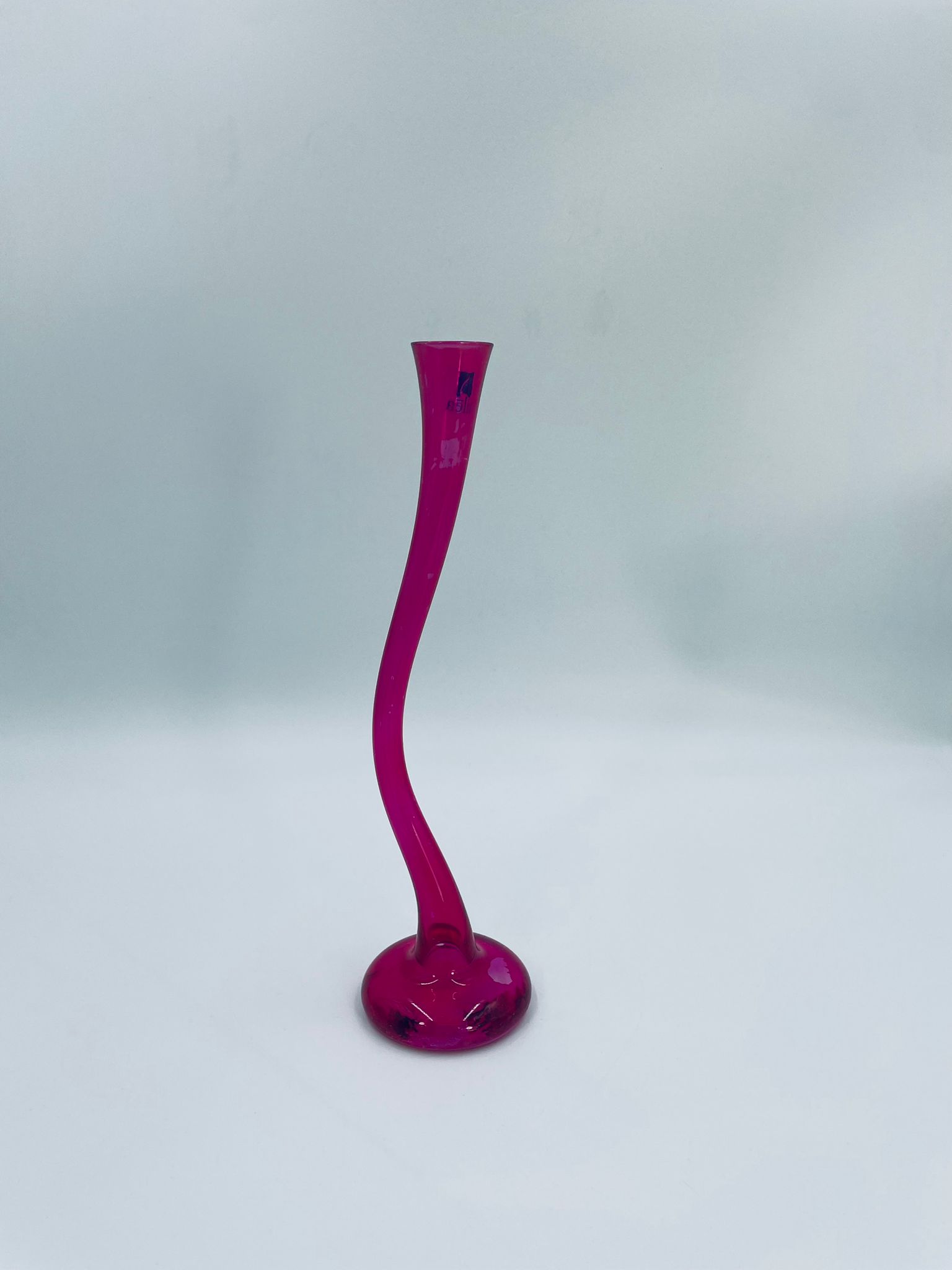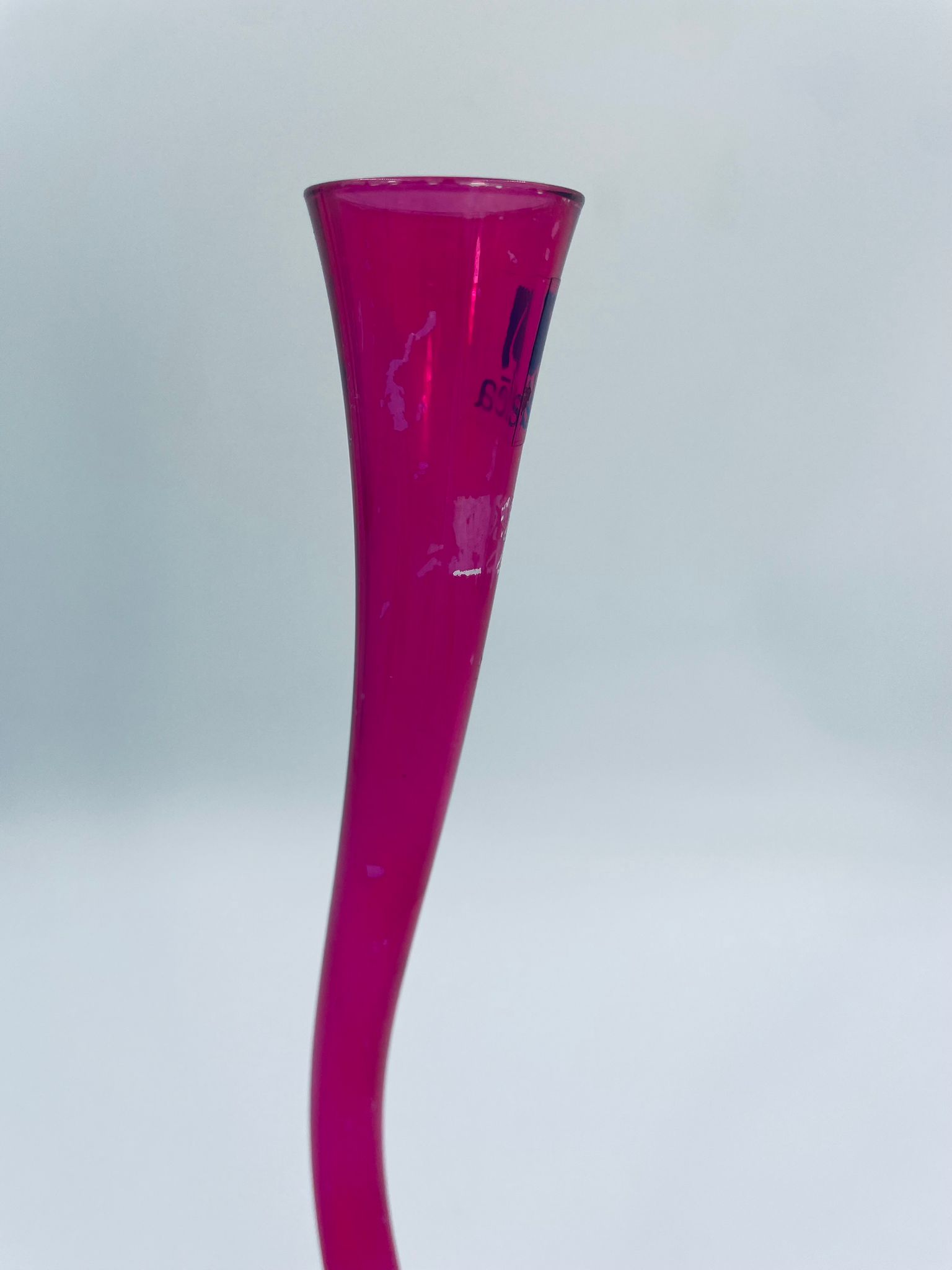 Wazon dekoracyjny marki Silea, wykonany z wysokiej jakości szkła. Wazon o różowej barwie i charakterystycznym, wygiętym kształtem. Posiada przetarcie na kolorze.