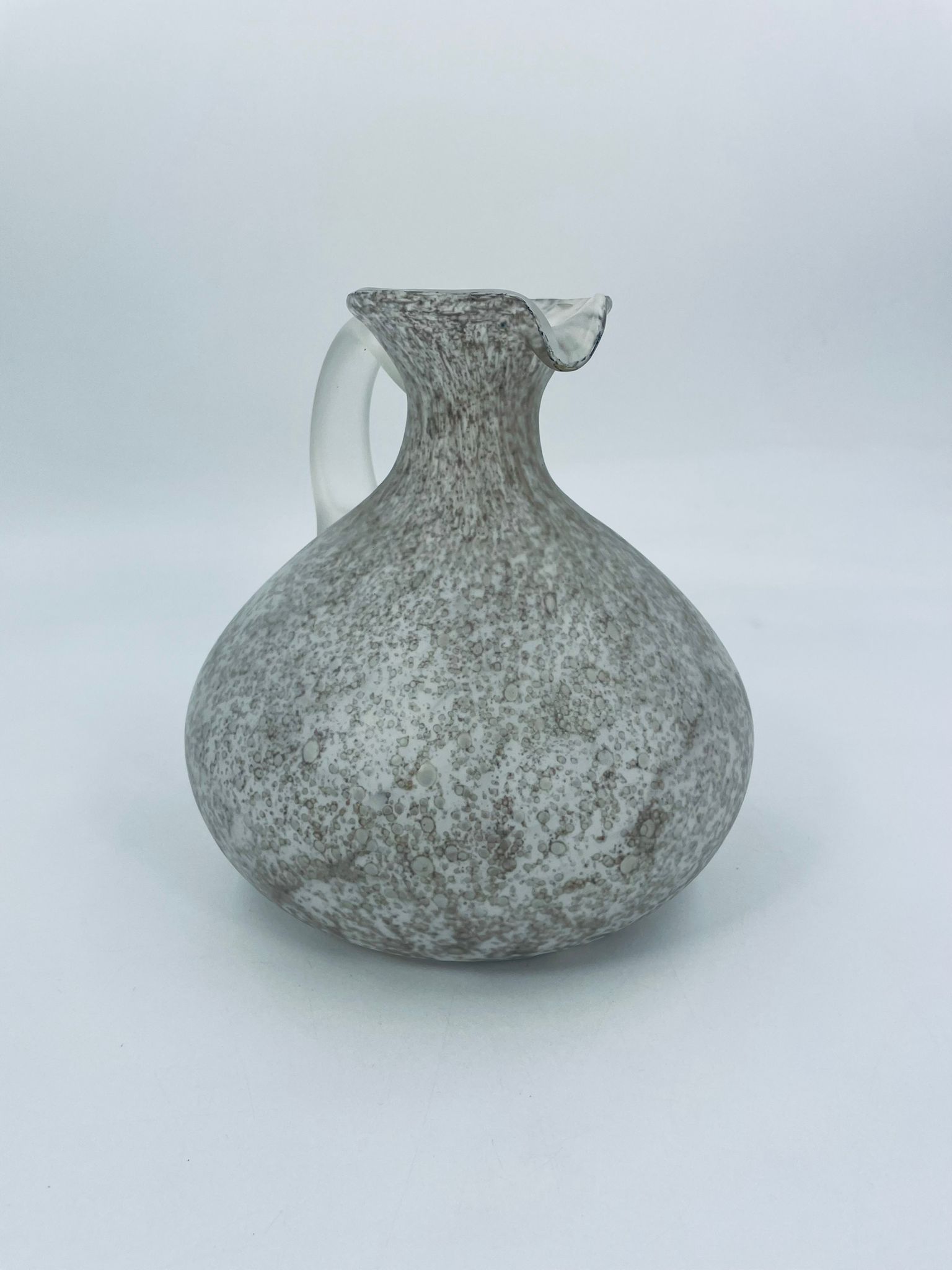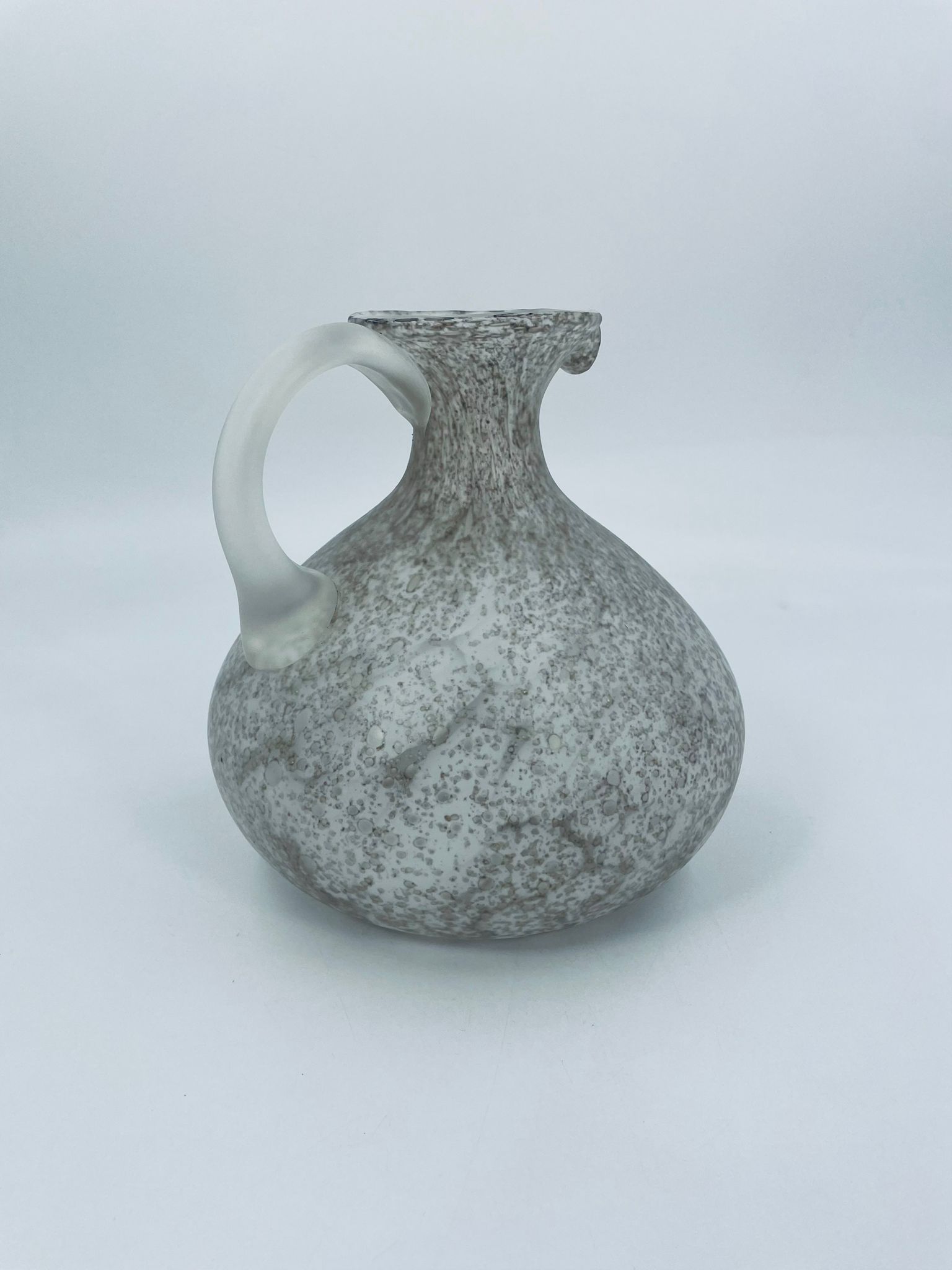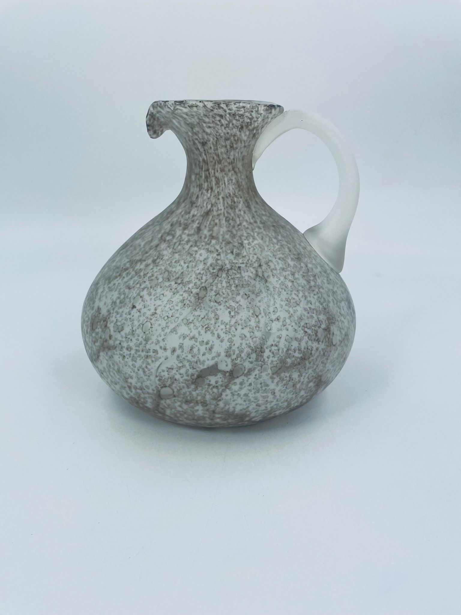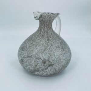 Wazon szklany w stylu Vintage, który swoim kształtem przypomina dzbanek z uchwytem. Przedmiot jest w odcieniu szarości-beżu z prymitywnym wzornictwem kropek. Uchwyt bezbarwny.