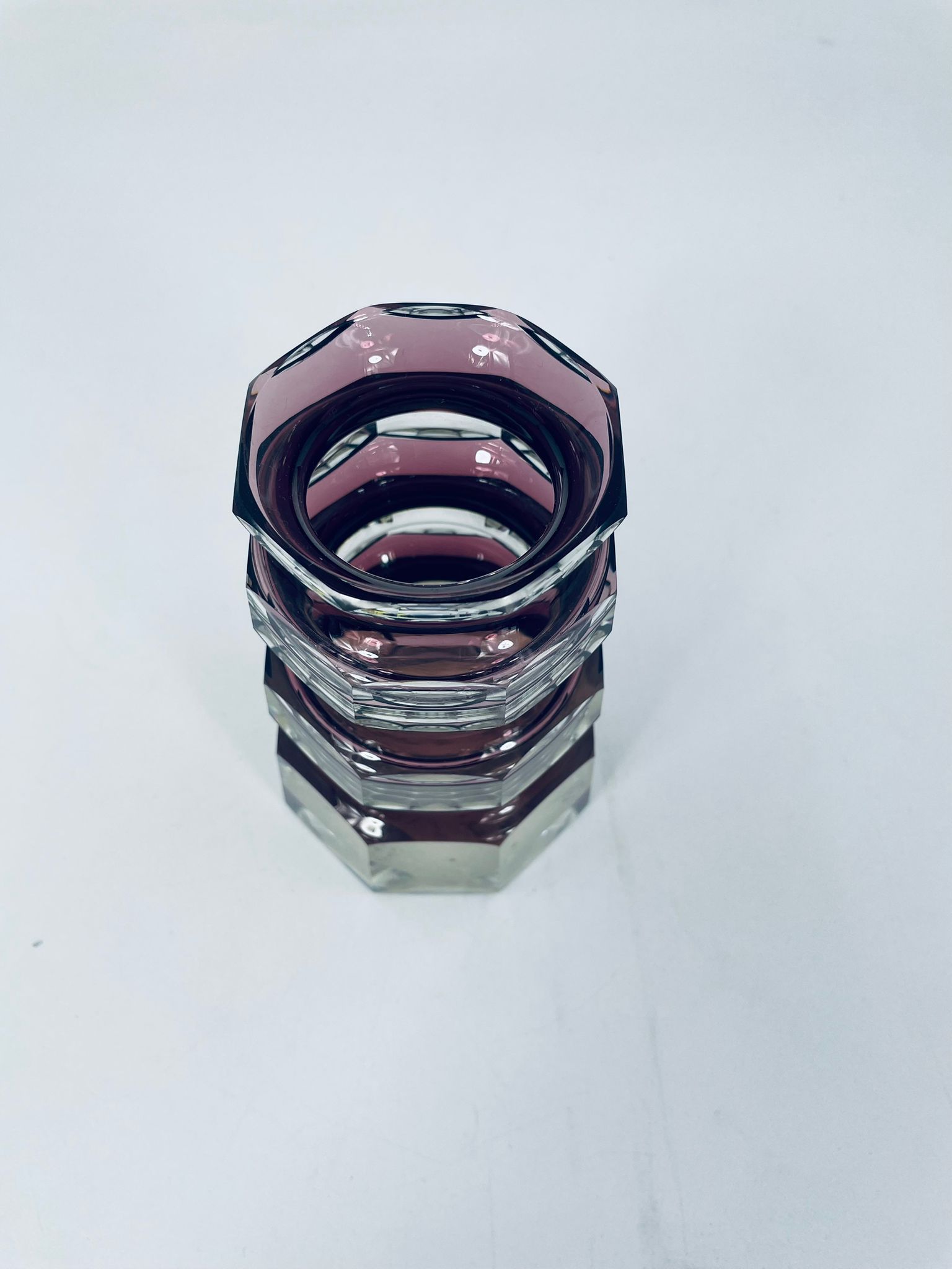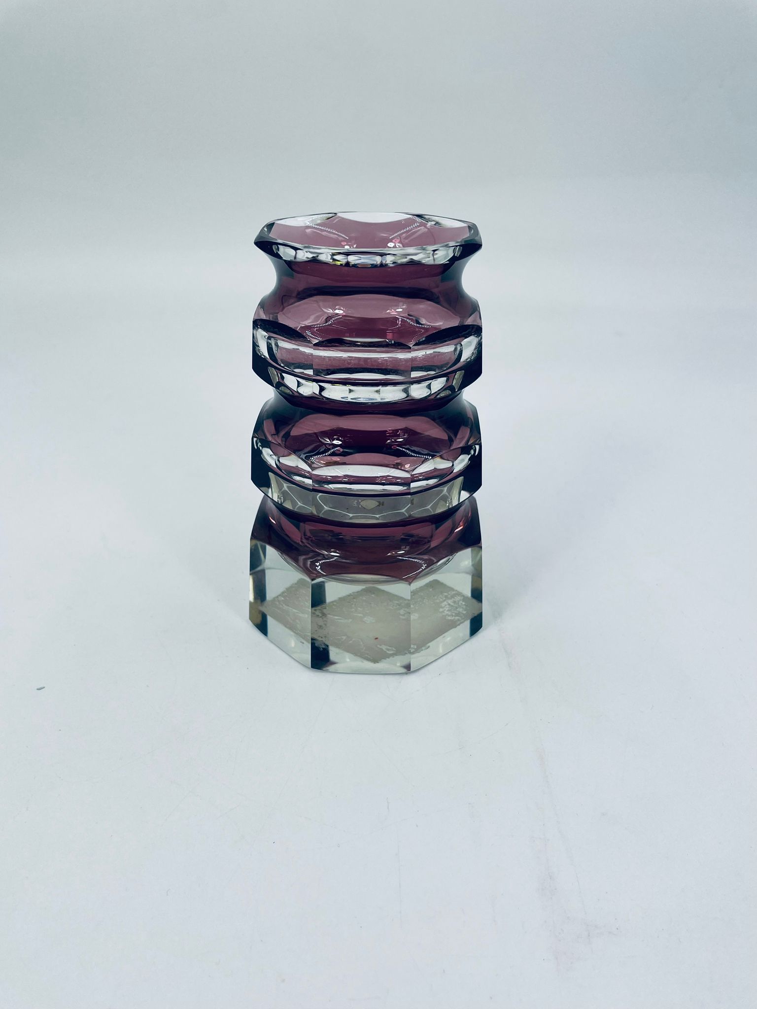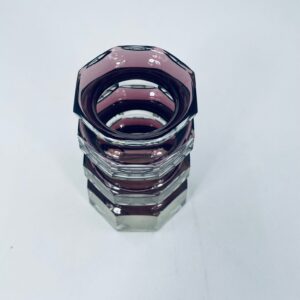 Kryształowy wazon w kolorze fioletu, pochodzi z lat 60-70tych, poziomowy, żebrowany. Wazon zabytkowy