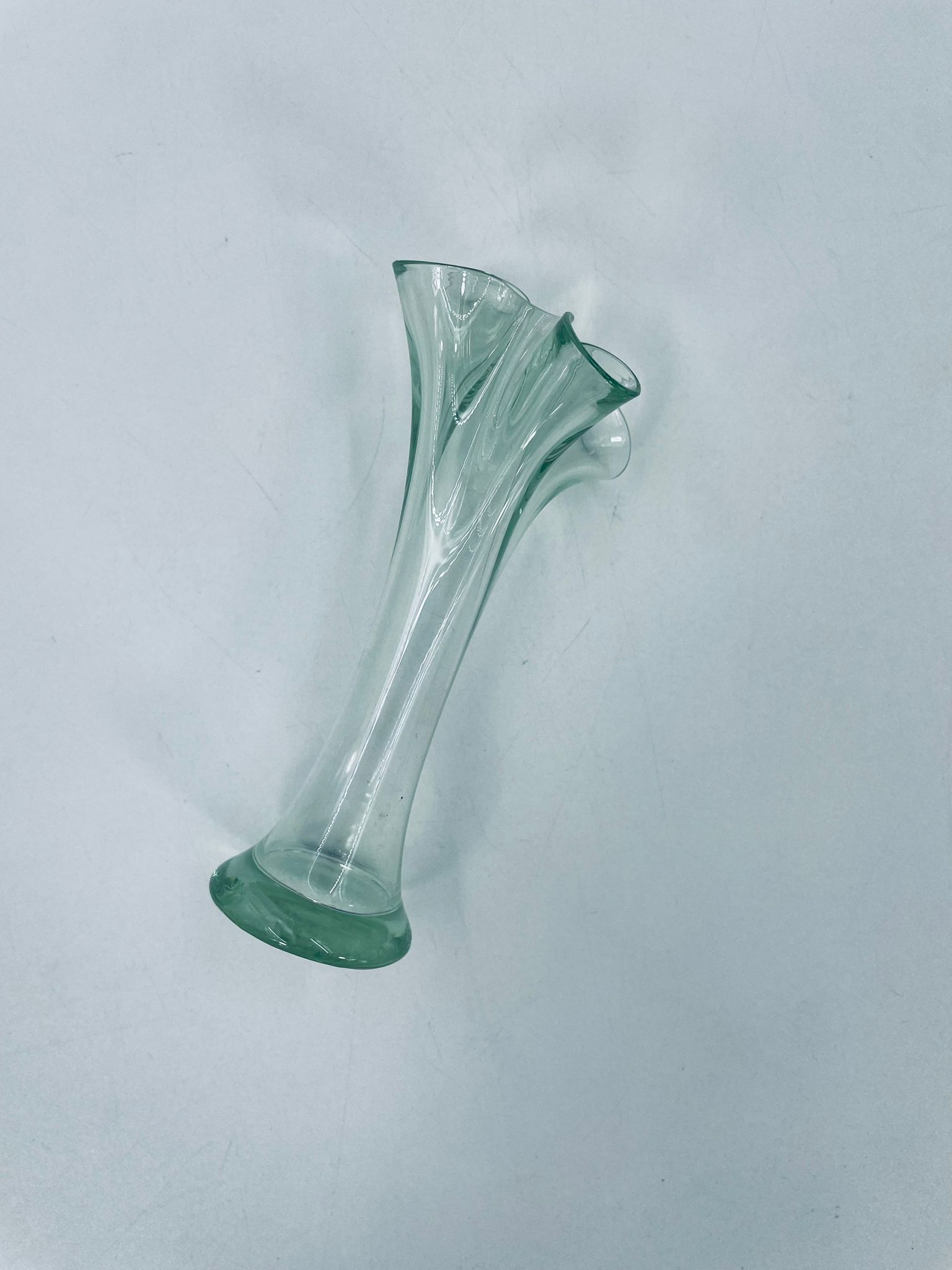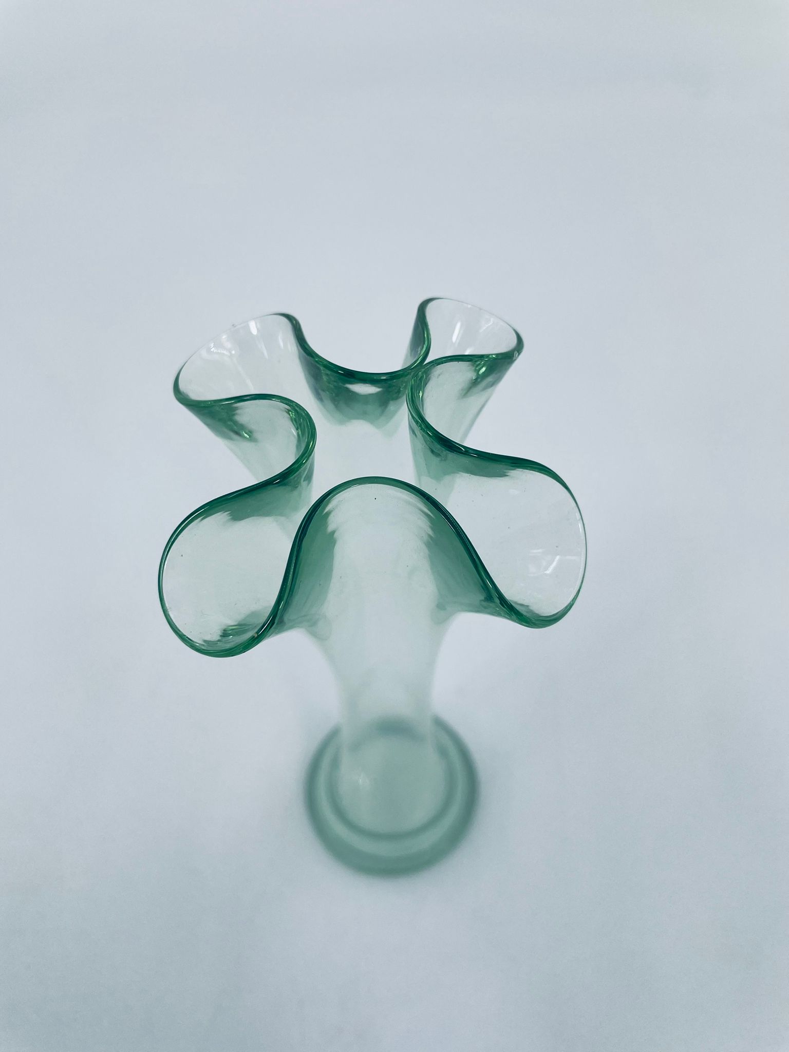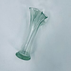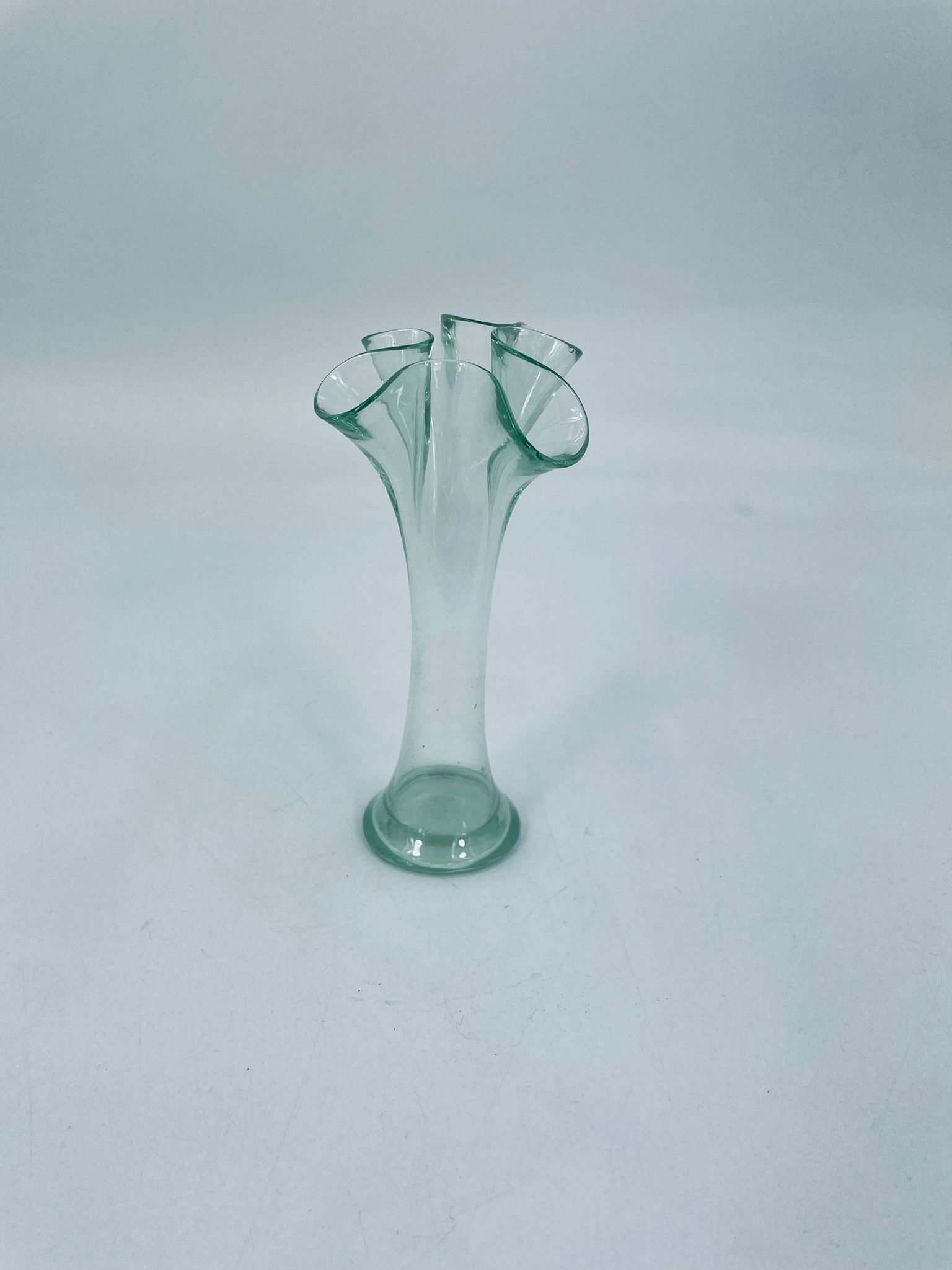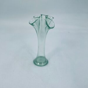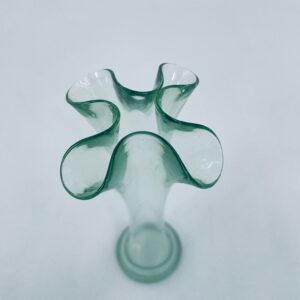 Wazonik w stylu Vintage z jasnozielonego szkła z ozdobną falbaniasta krawędzią. Oryginalny przedmiot prezentuje abstrakcyjny motyw artystyczny.