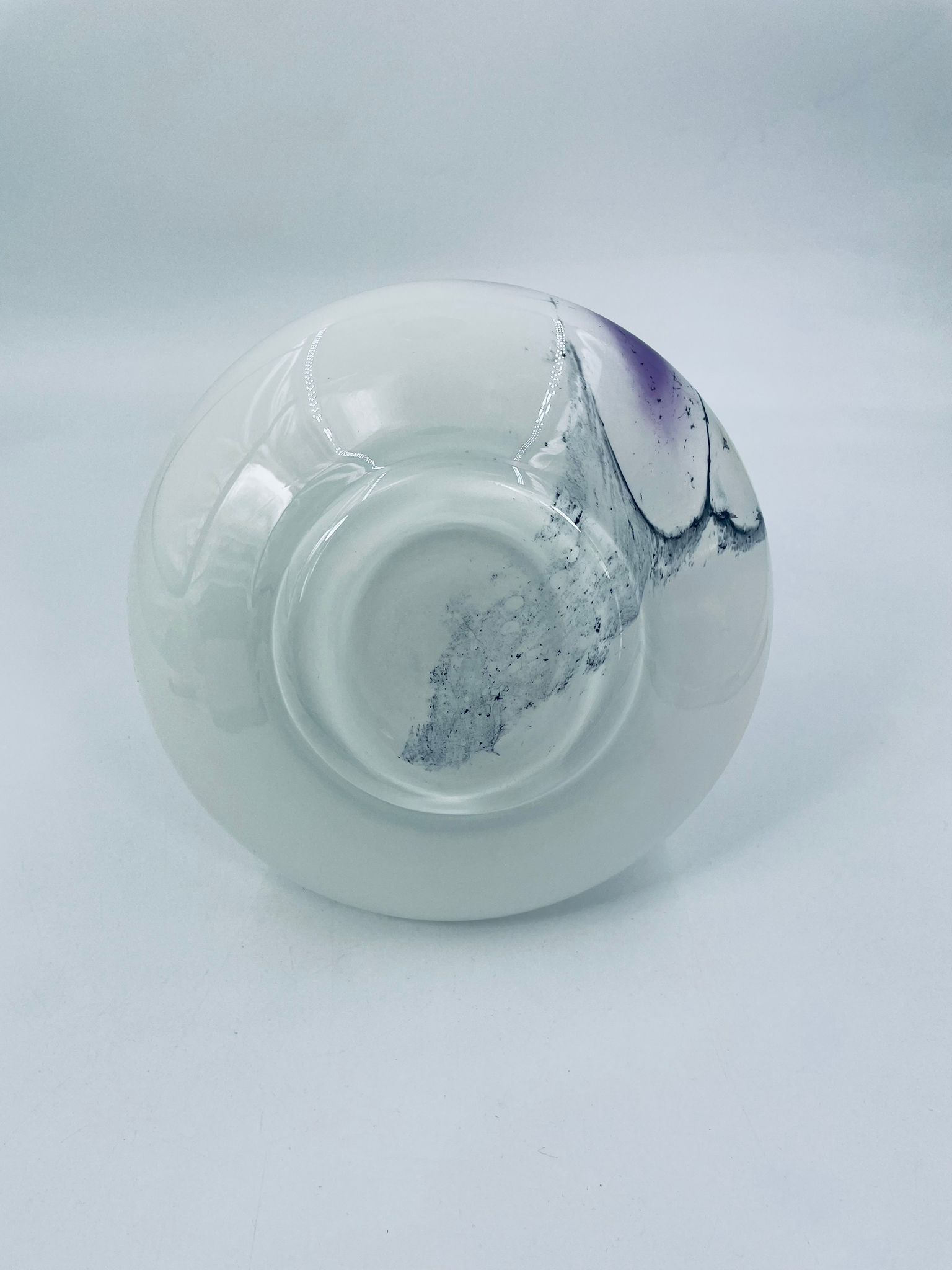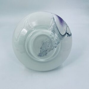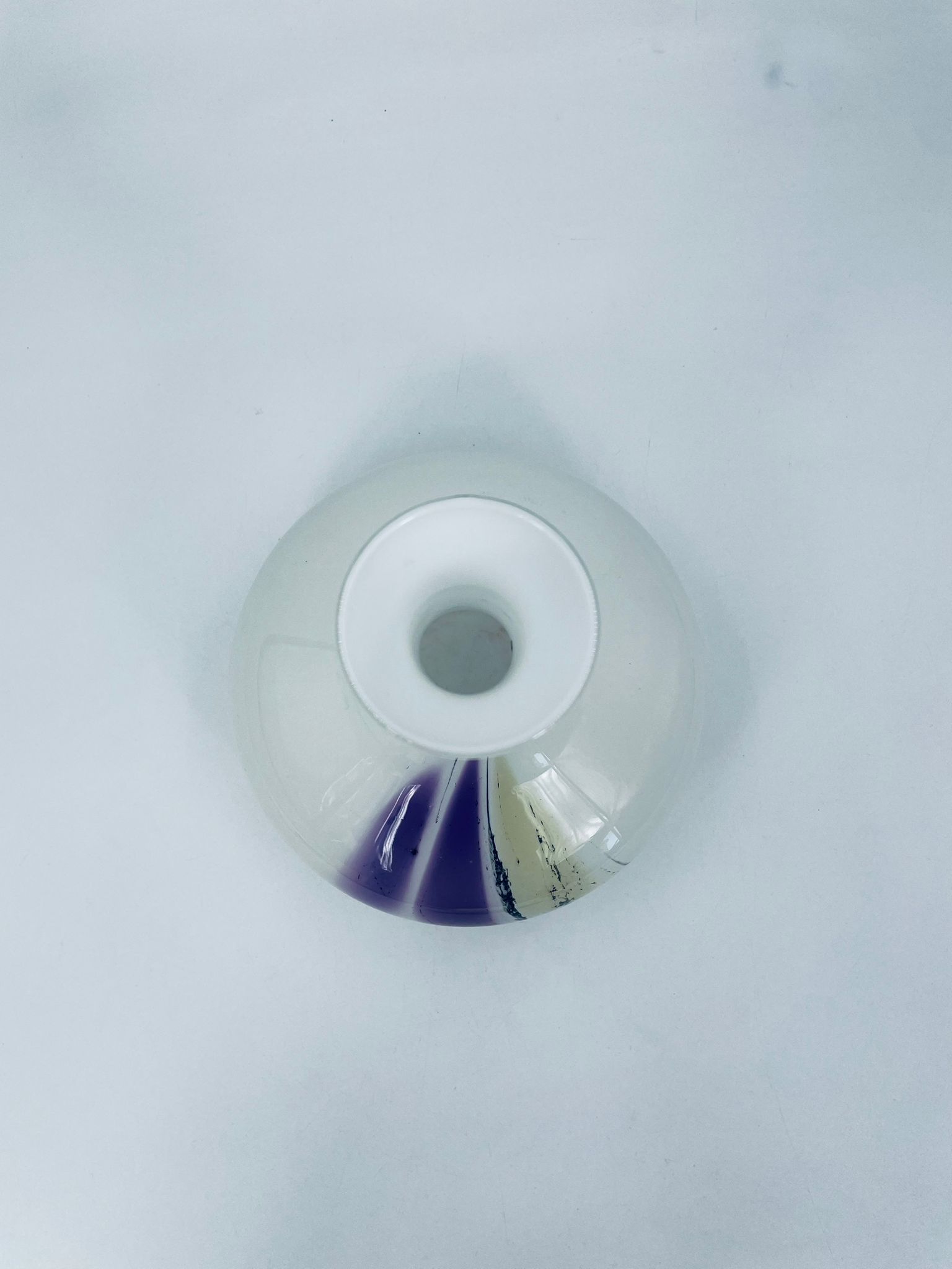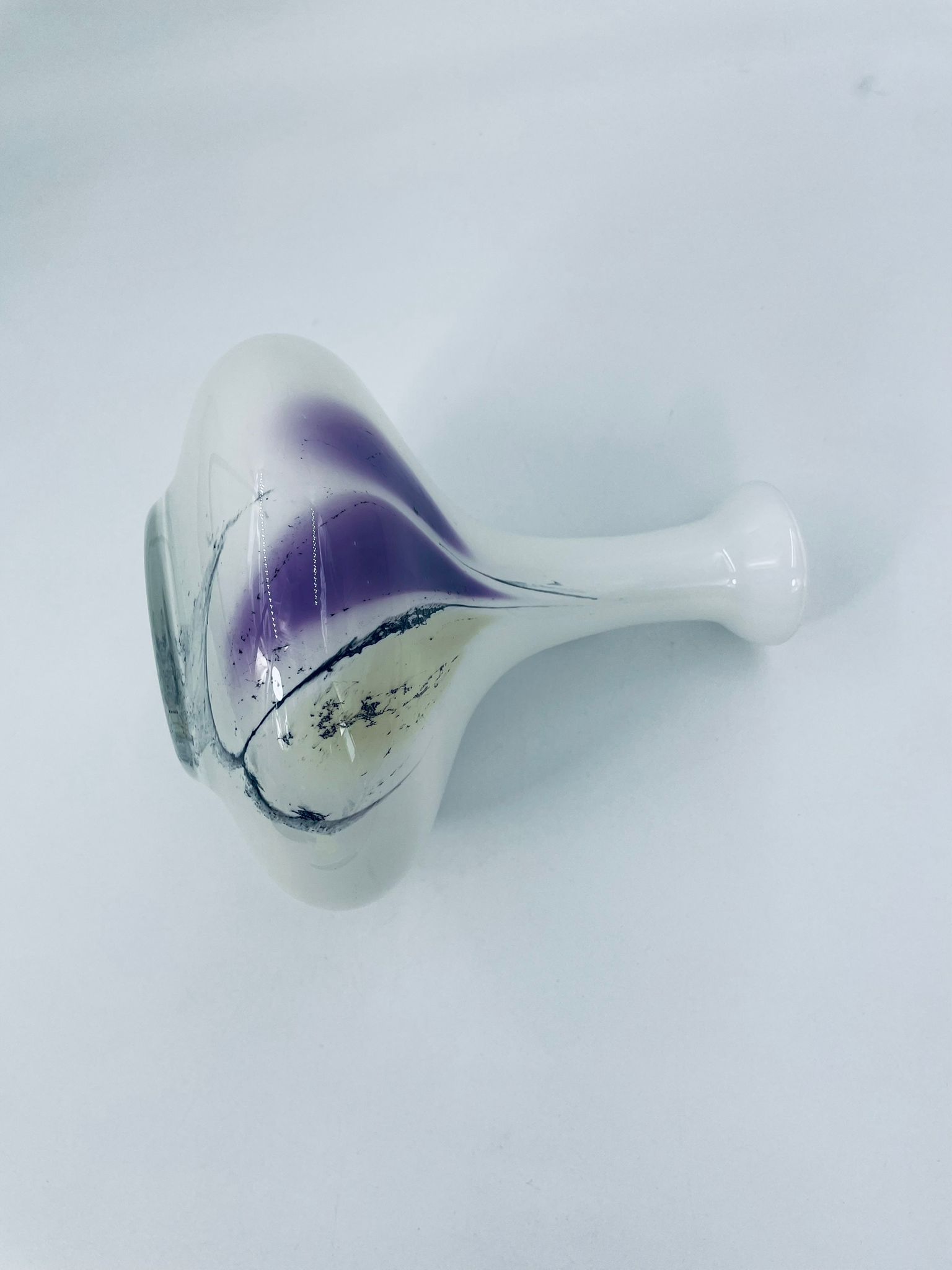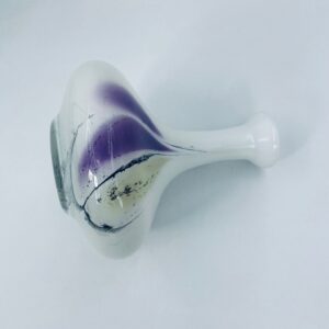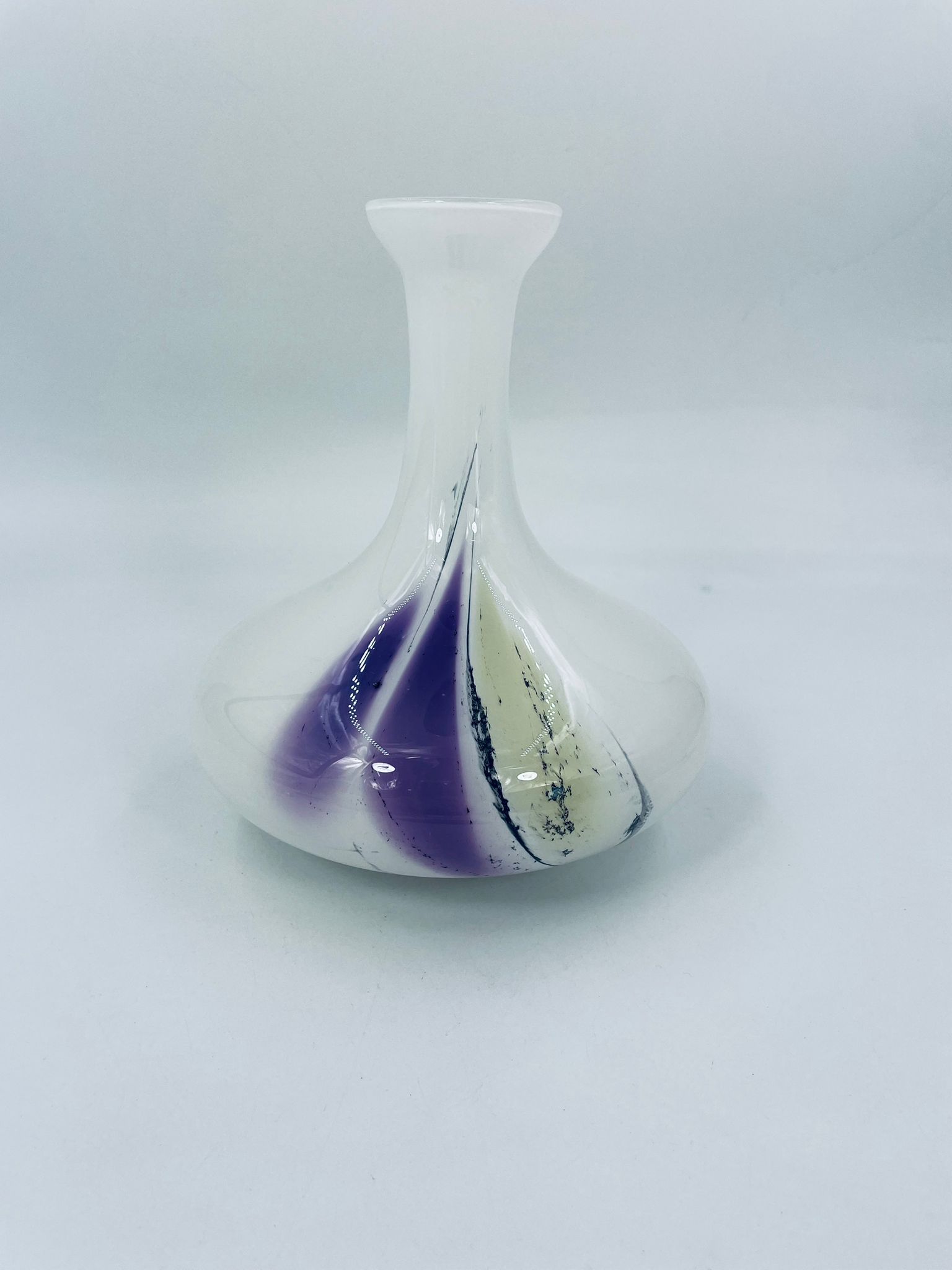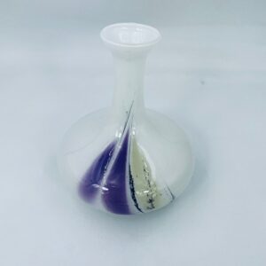 Wazon ze szkła Murano w stylu Vintage. Dekoracyjny wazon z piękną kolorystyką, na białym tle elementy szkła plamistego w kolorze fioletowo-żółtym- czarnym. Piękna ozdoba każdego wnętrza.