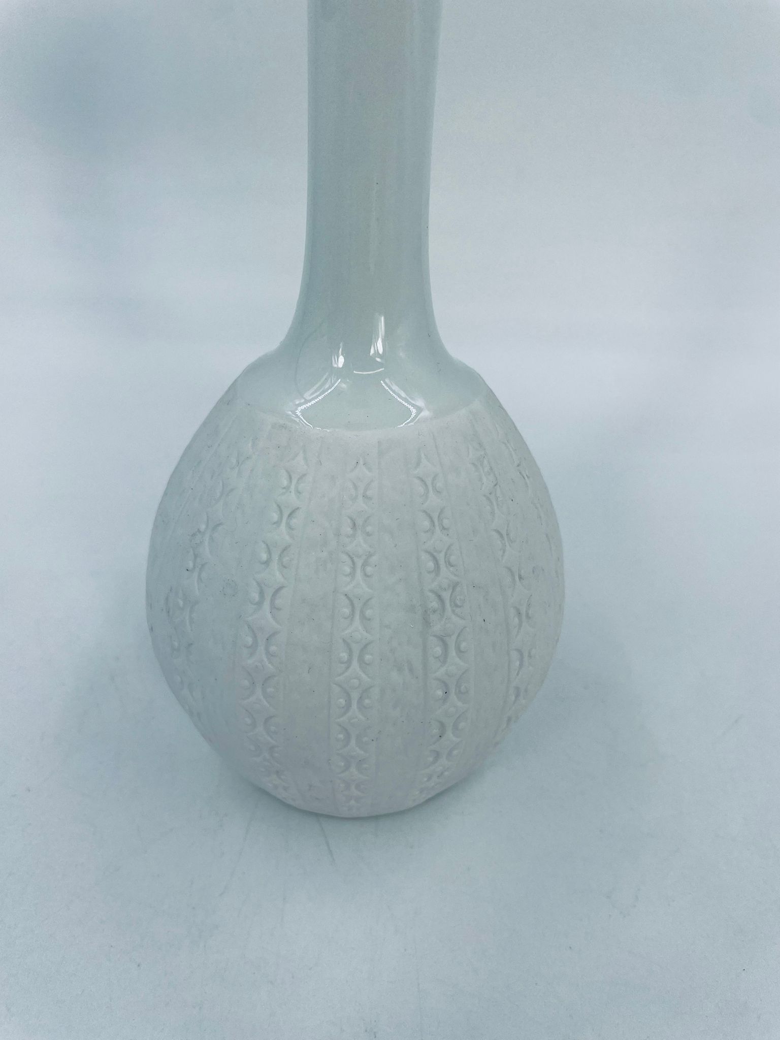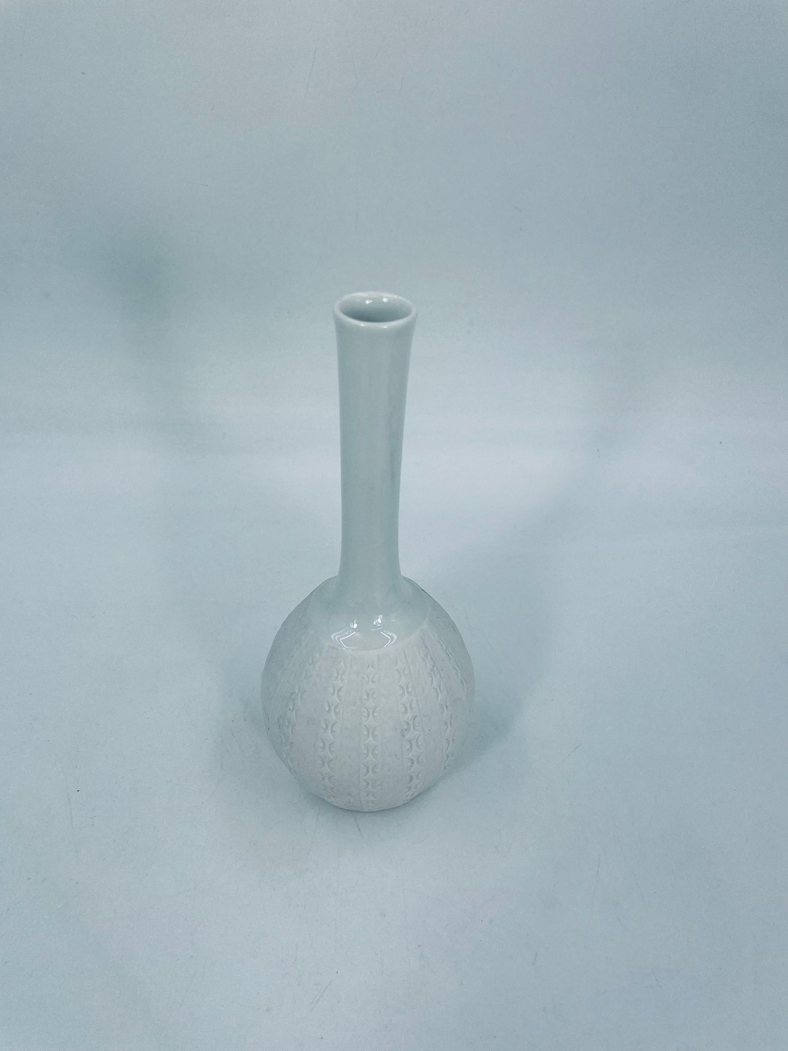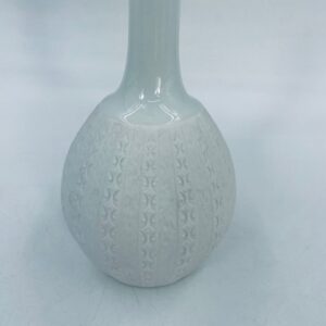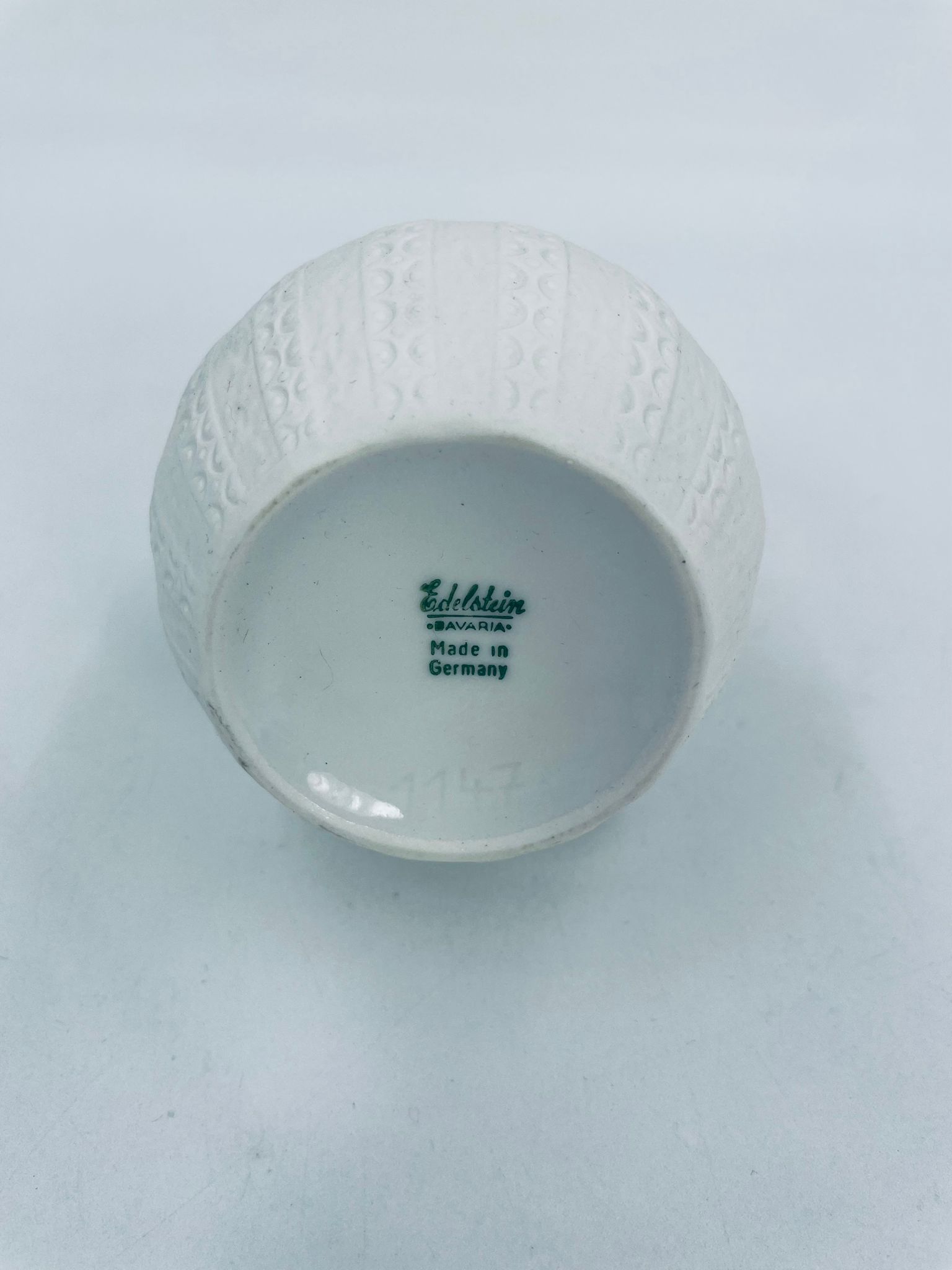 Wazonik dekoracyjny wytwórni Edelstein Bavaria, wykonany z wysokiej jakości białej porcelany częściowo biskwitowej. Wazon charakteryzuje się kulistym brzuścem- nieszkliwionym, z tłoczonym reliefem w postaci stylizowanych wzorów oraz długa, wąska szyjką- szkliwiona.