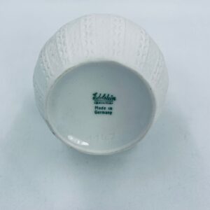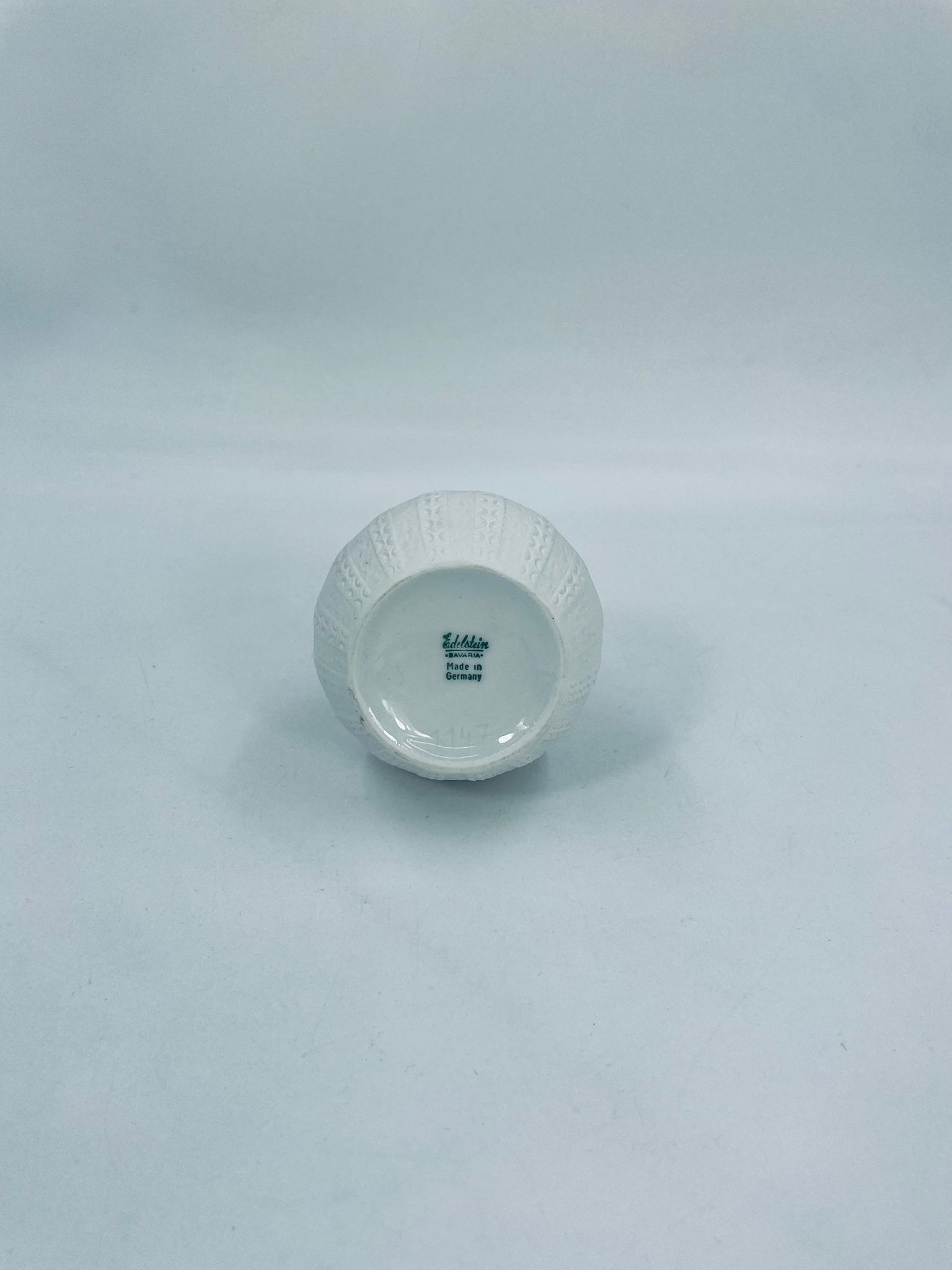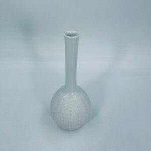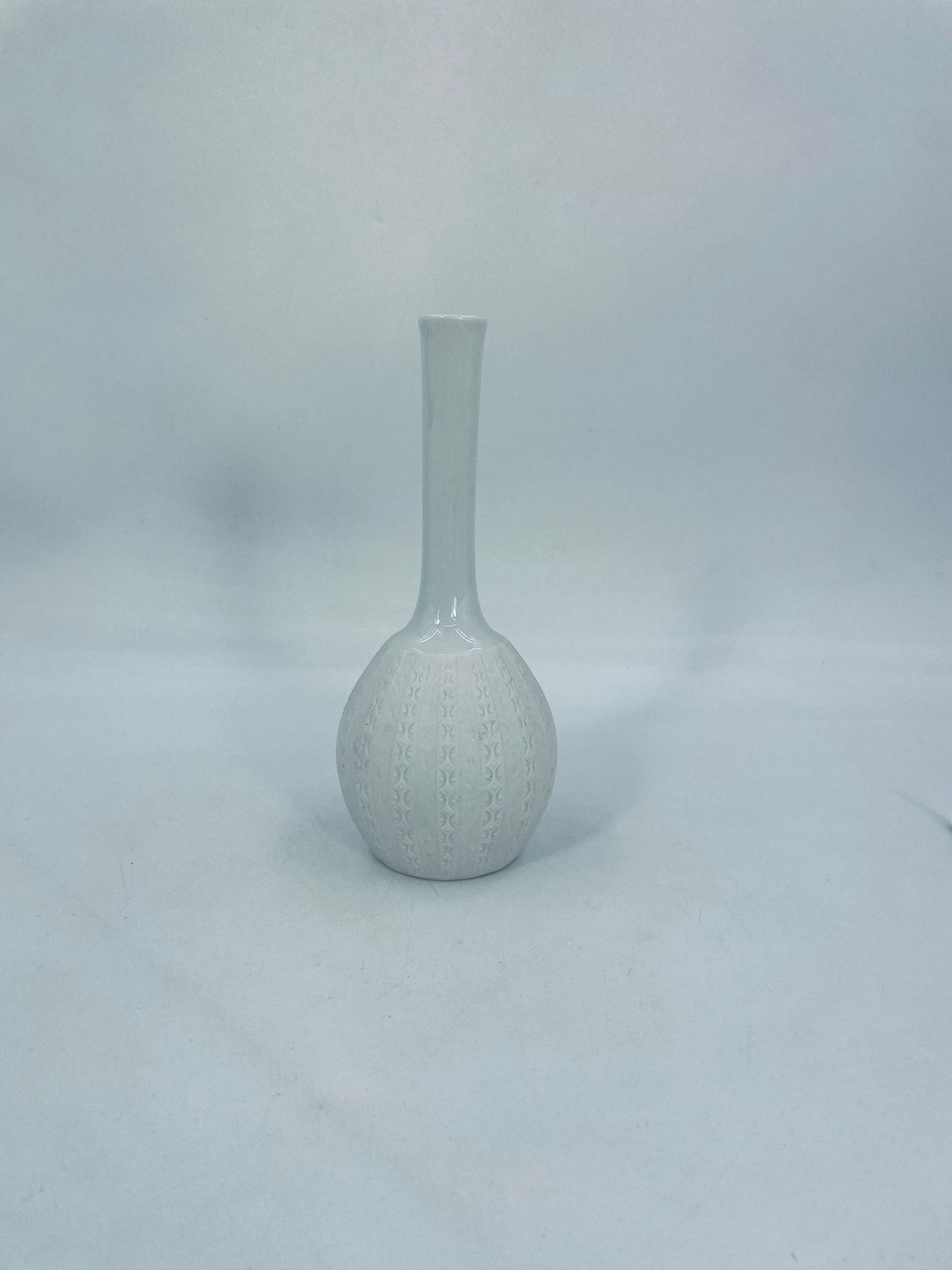 Wazonik dekoracyjny wytwórni Edelstein Bavaria, wykonany z wysokiej jakości białej porcelany częściowo biskwitowej. Wazon charakteryzuje się kulistym brzuścem- nieszkliwionym, z tłoczonym reliefem w postaci stylizowanych wzorów oraz długa, wąska szyjką- szkliwiona.