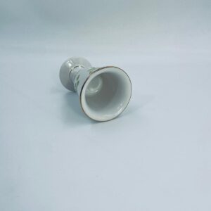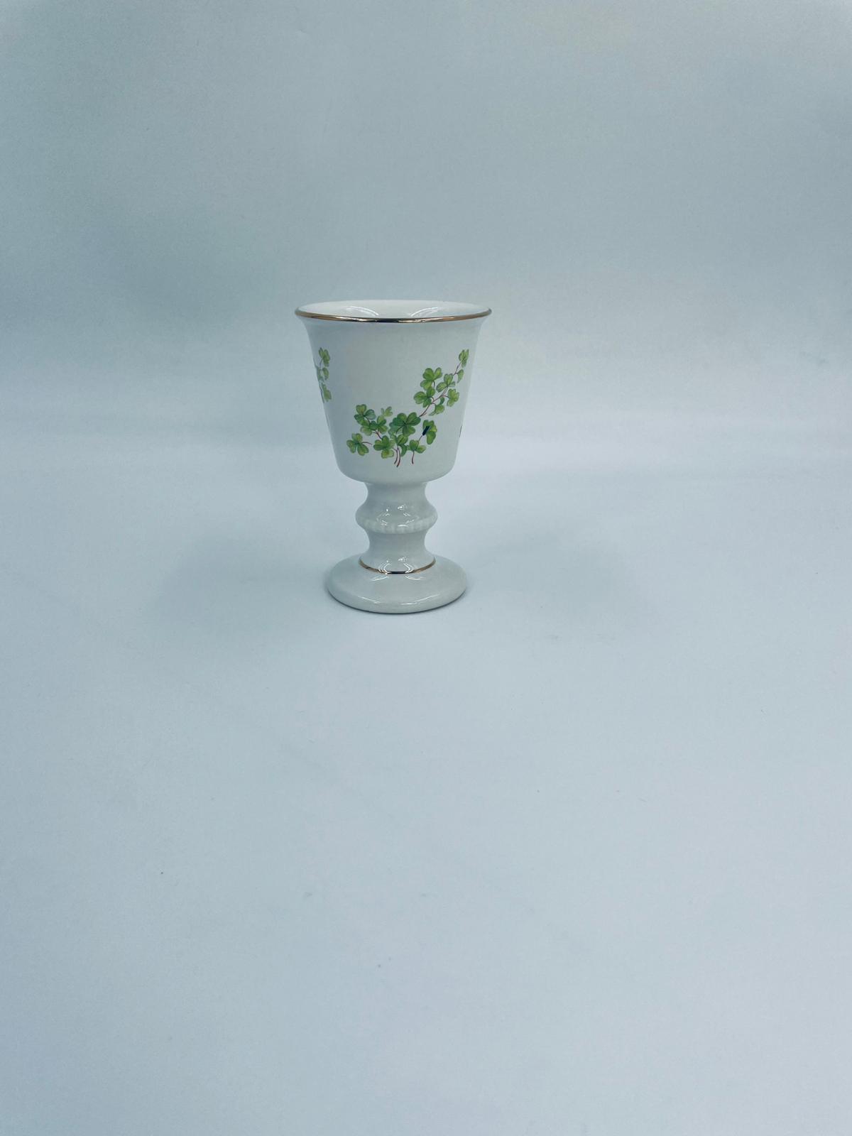 Wazonik, kielich wytwórni Wade Ireland wykonany z wysokiej jakości białej porcelany. Charakteryzuje się eleganckim wzorem koniczyny, symbolizującym irlandzkie dziedzictwo, ozdobna nóżka, wykończony złoceniem na górnym rancie. Przedmiot może służyć jako wazonik na małe kwiaty, kielich lub jako element dekoracyjny.