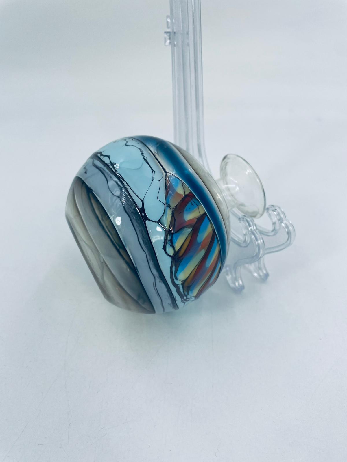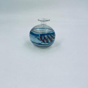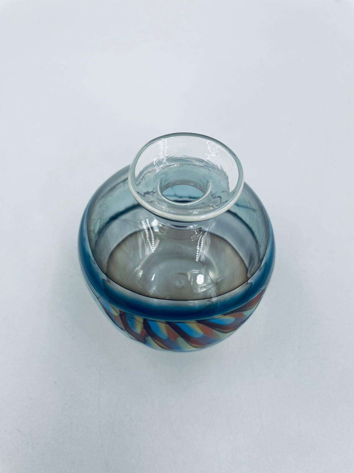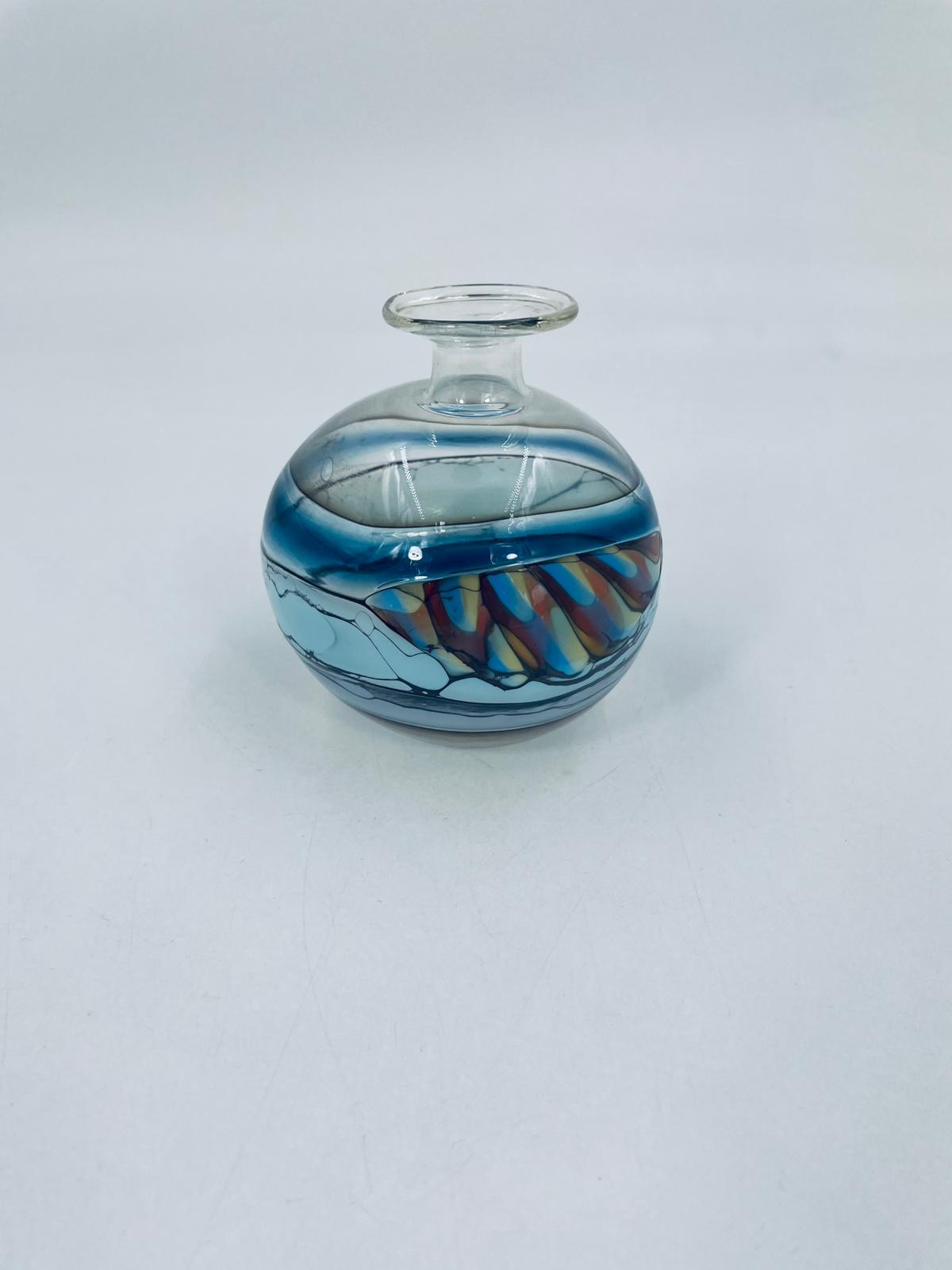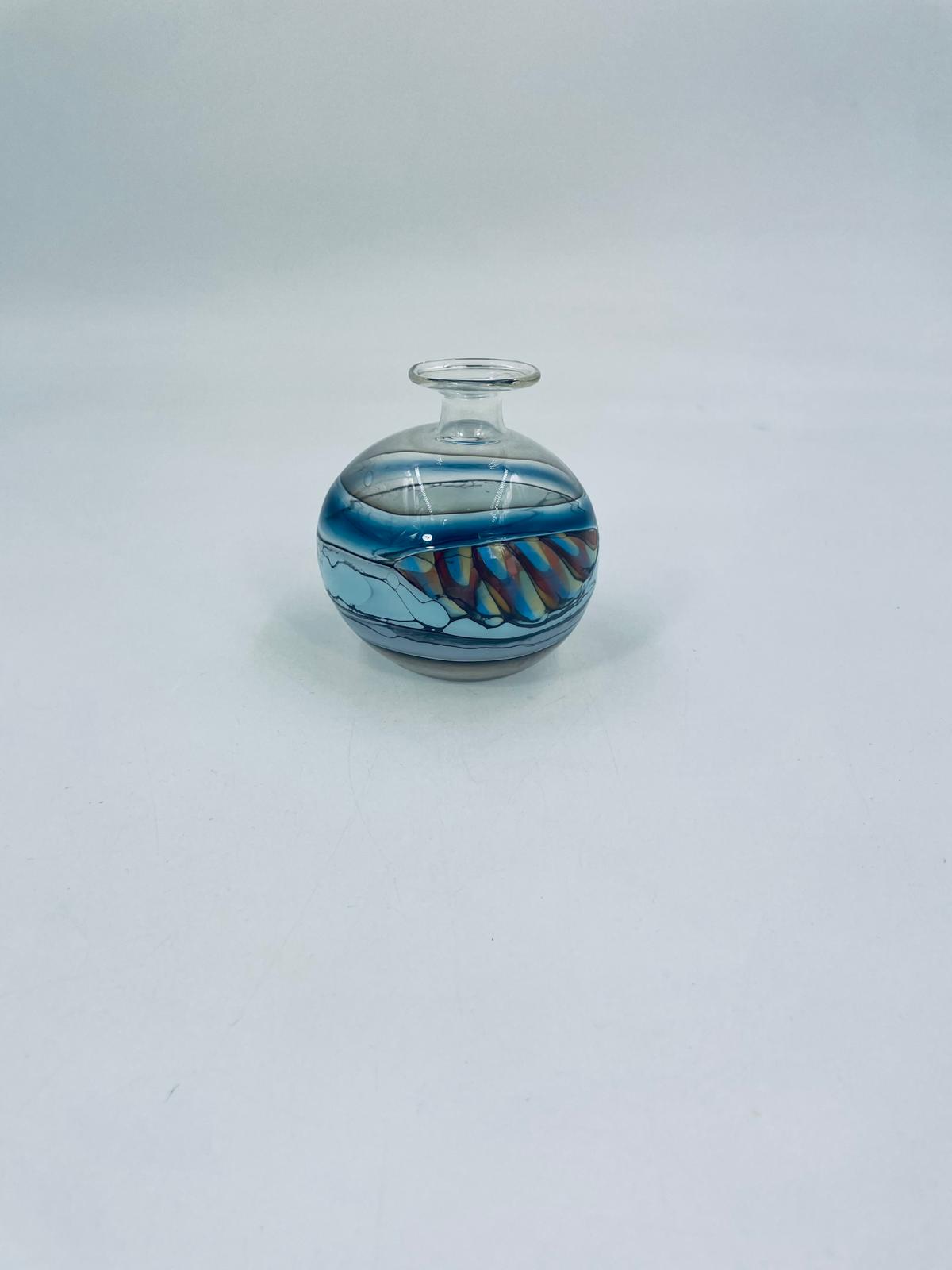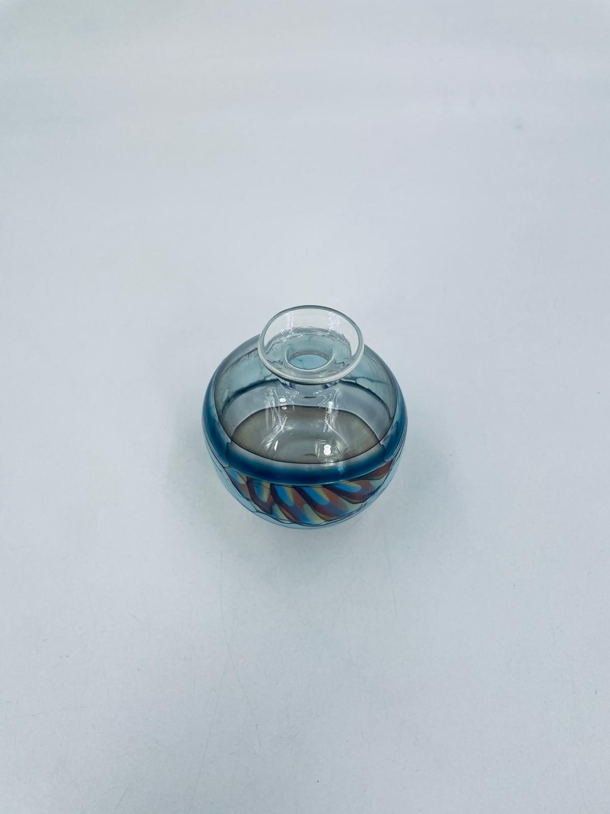Wazonik twórcy Pavla Molnara, wykonany z wysokiej jakości cienkiego szkła dmuchanego, artystycznego. Wazonik przezroczysty z przejściami różnych kolorów. Piękna ozdoba do każdego wnętrza.