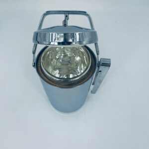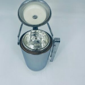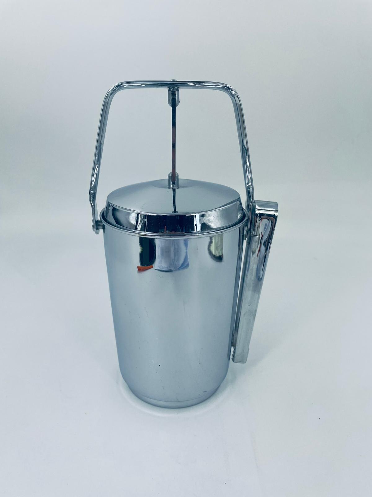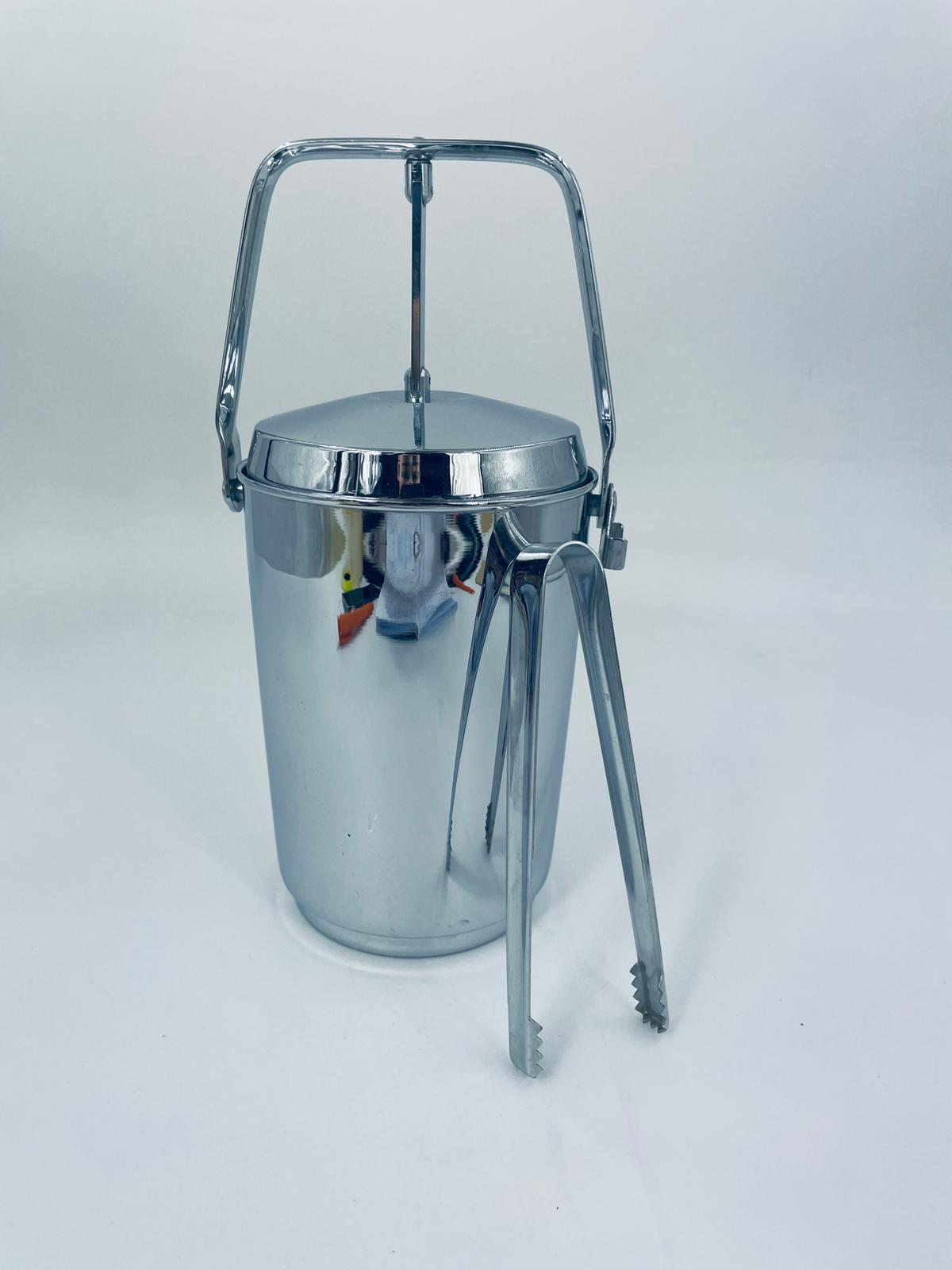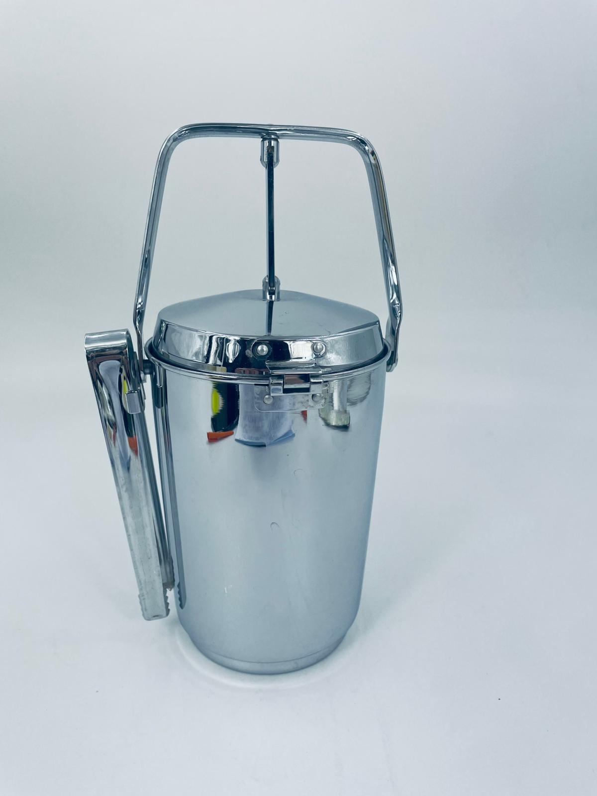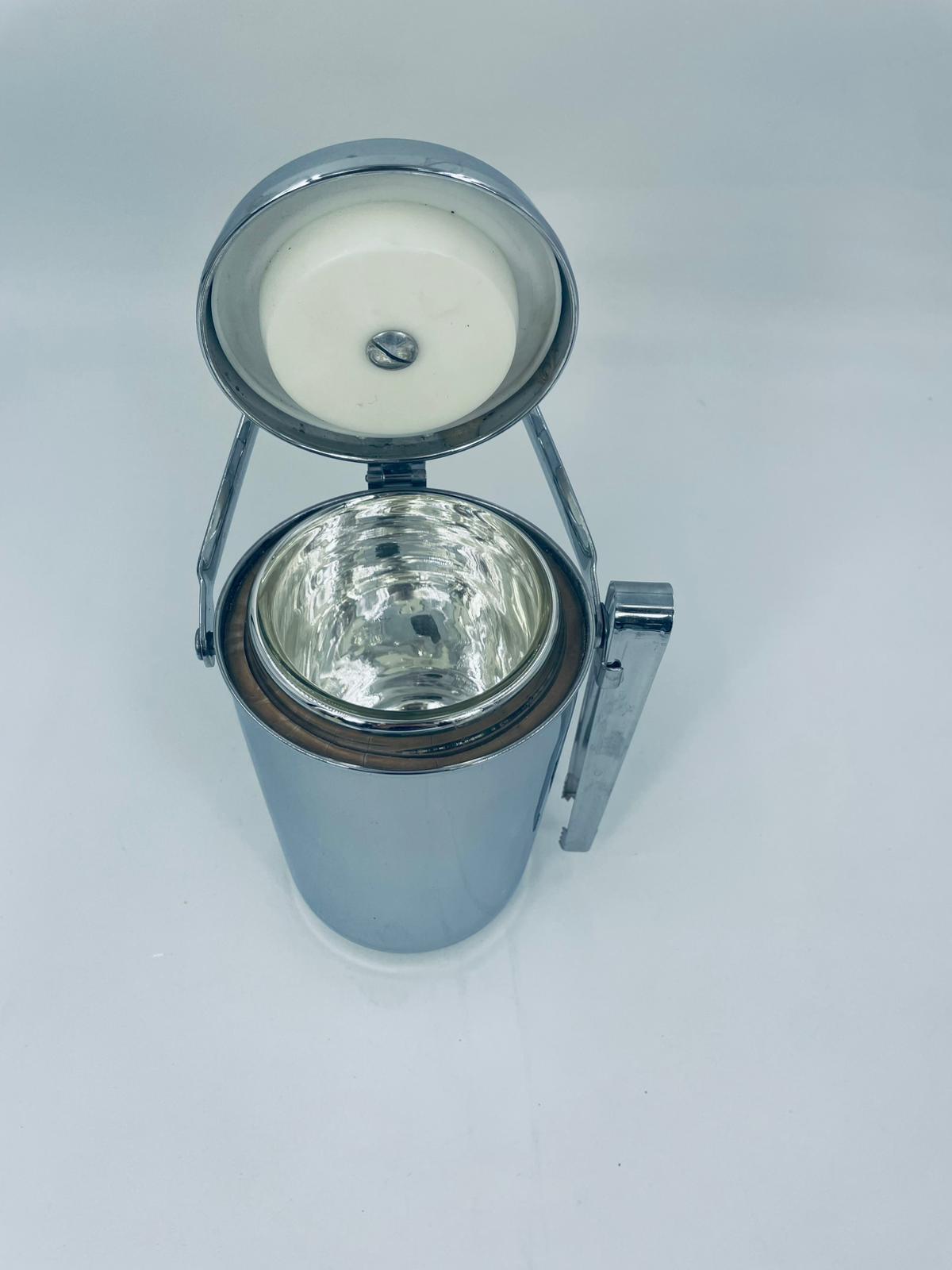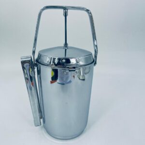 Zabytkowe wiaderko na lód Aldi Western Germany. W zestawie szczypce do lodu znajdujące się na uchwycie z boku, wiaderko ma ciekawy mechanizm otwierania.