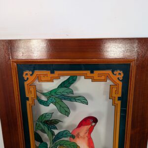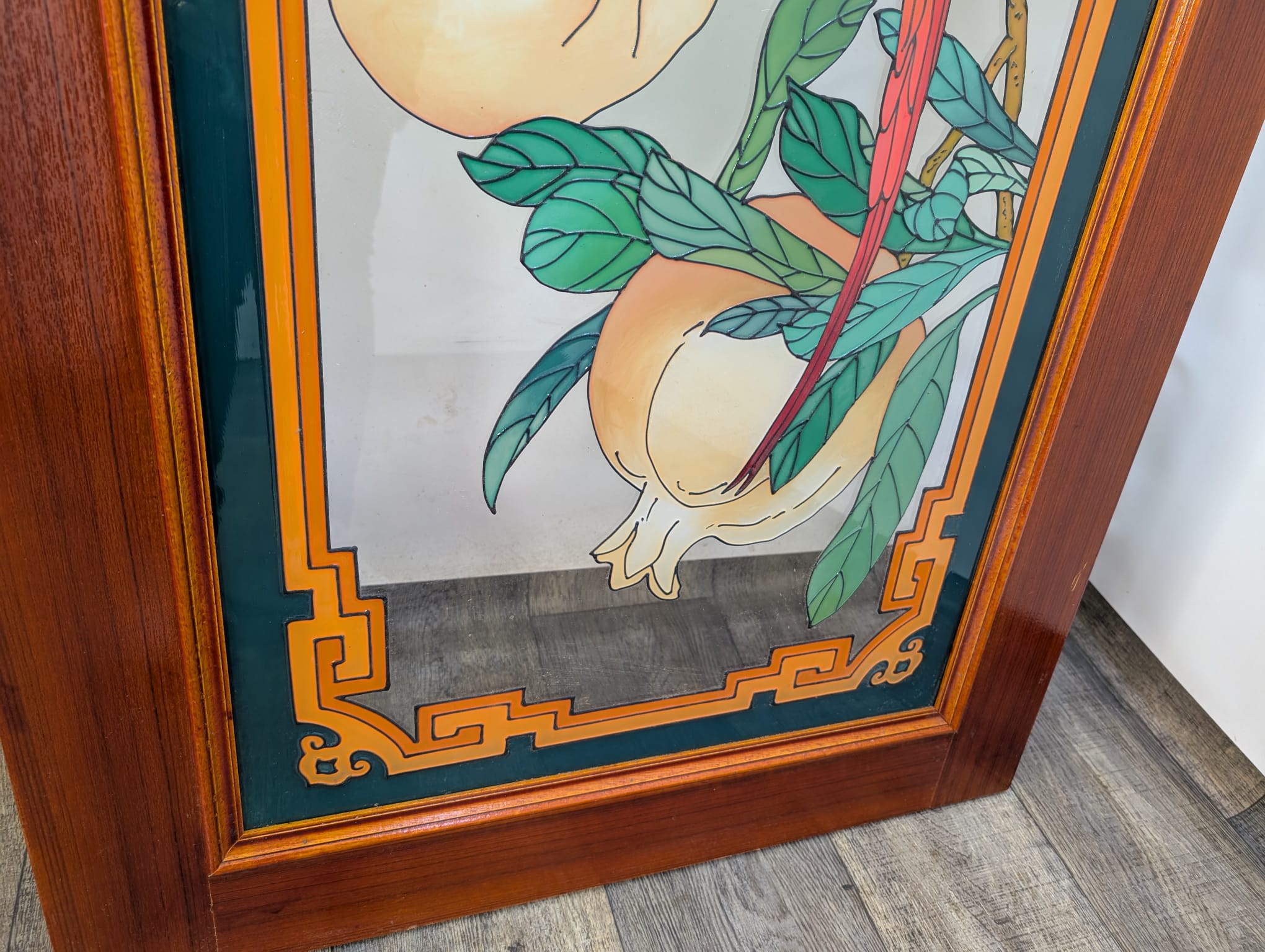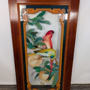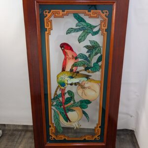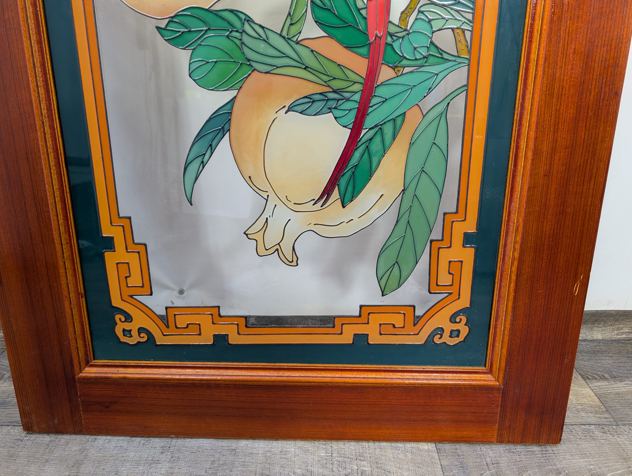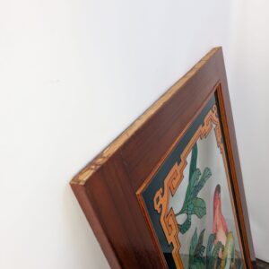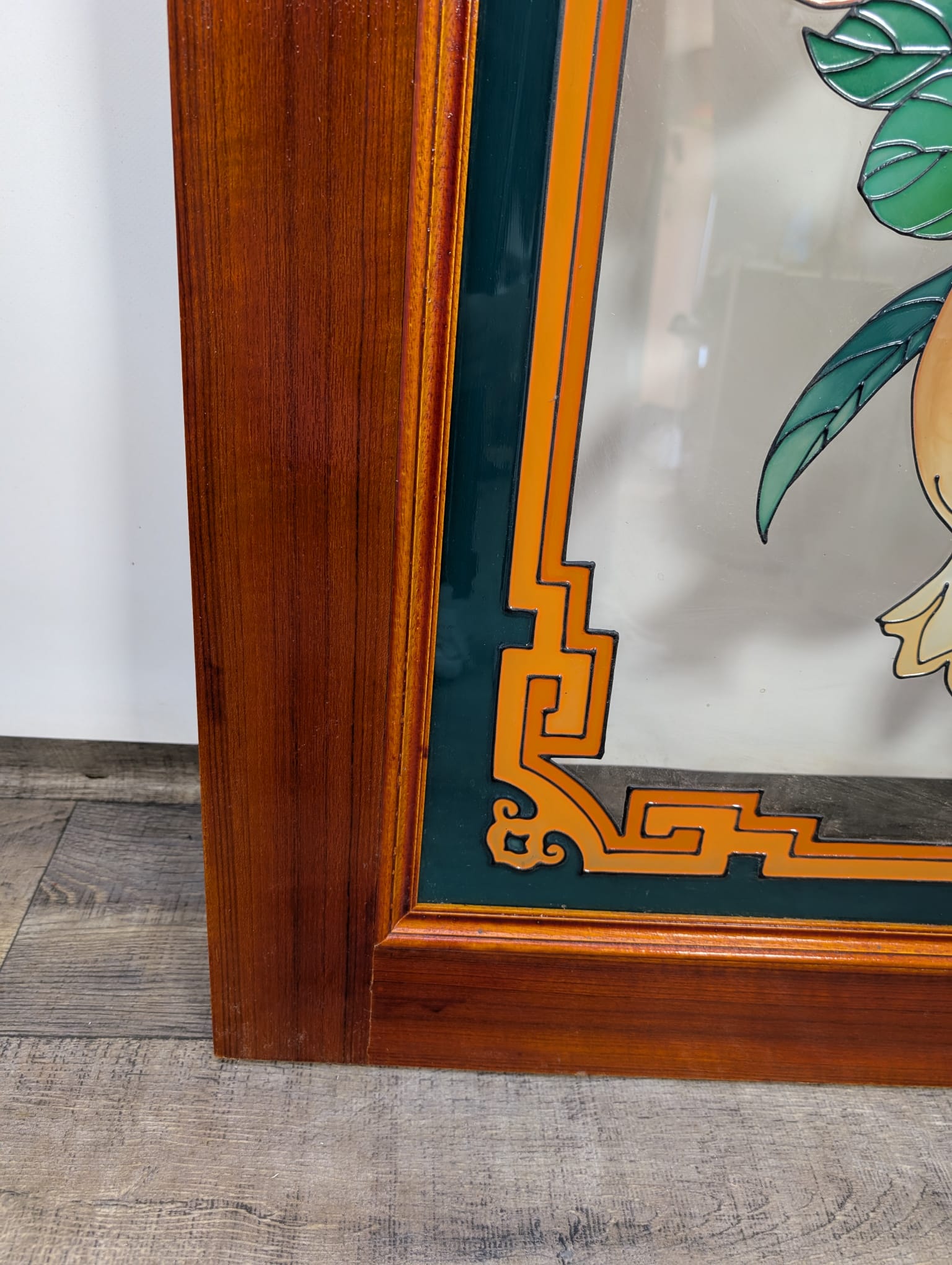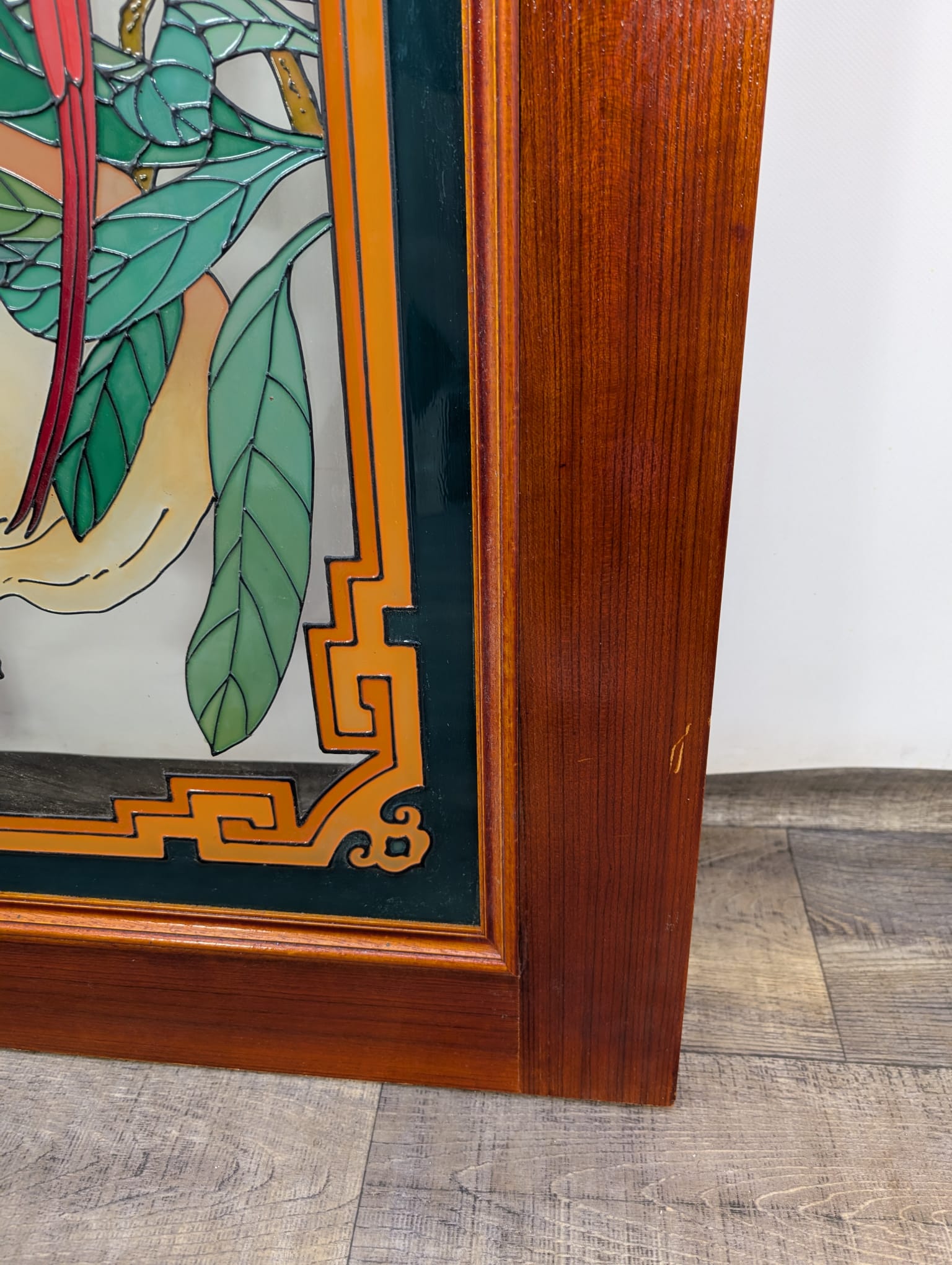 Witraż w drewnianej ramie malowany na szkle charakterystyczne na kultury chińskiej.