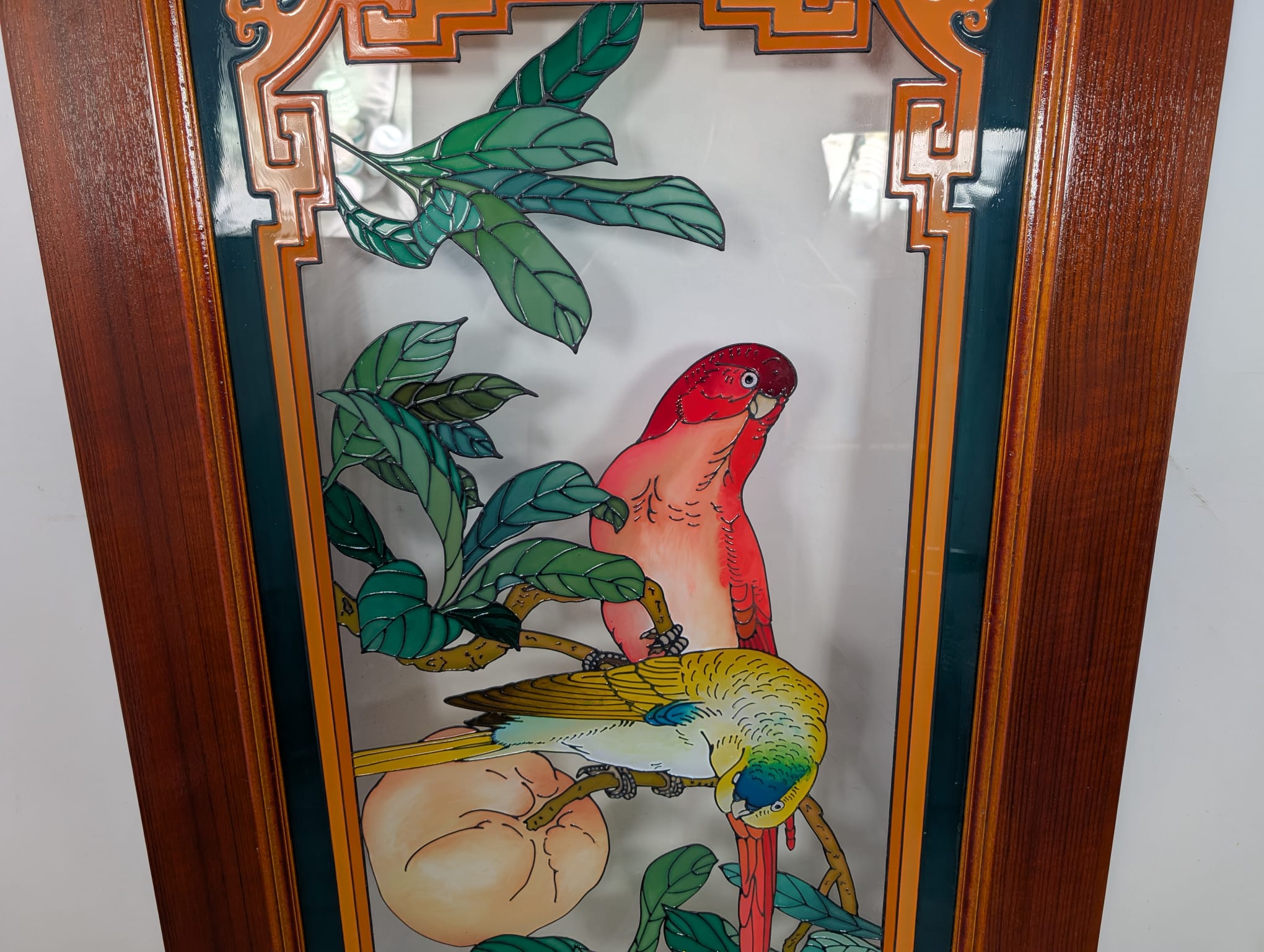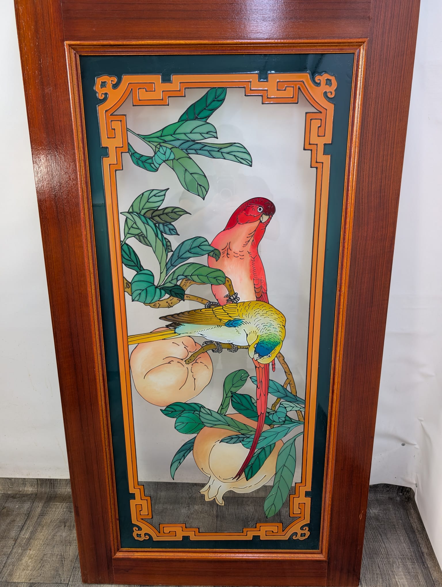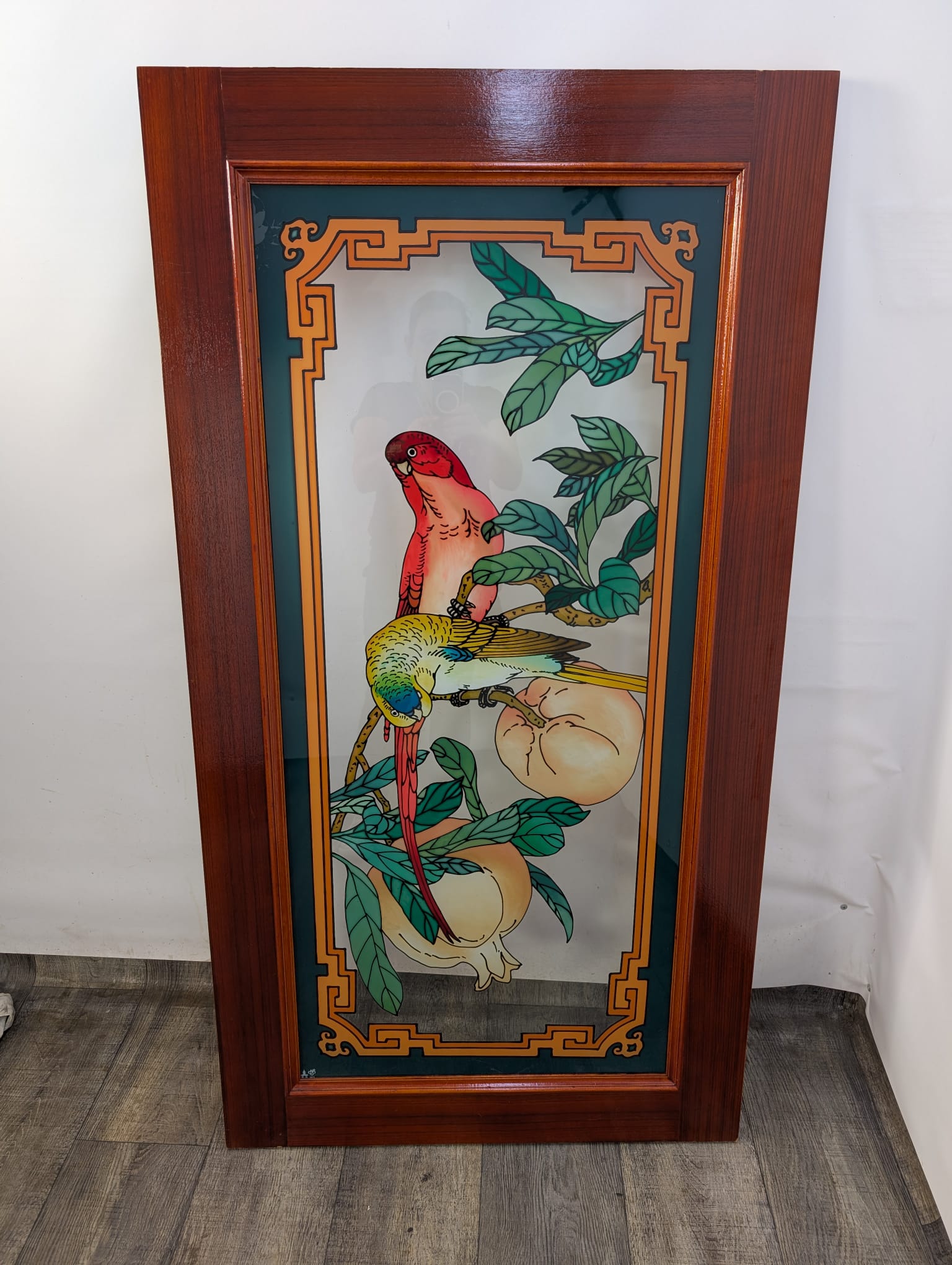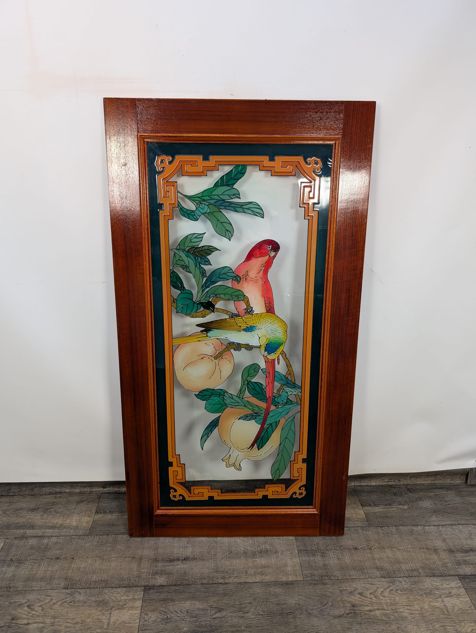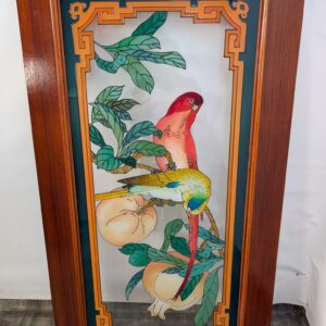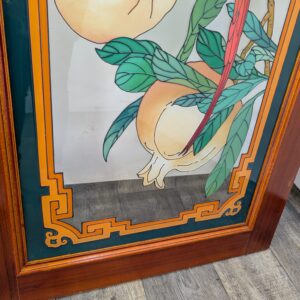 Witraż w drewnianej ramie malowany na szkle charakterystyczne na kultury chińskiej.