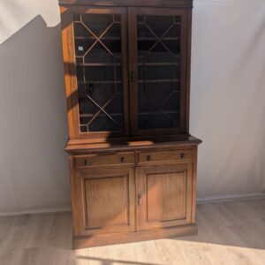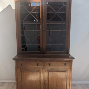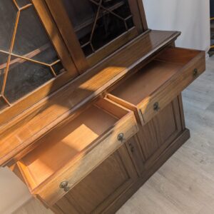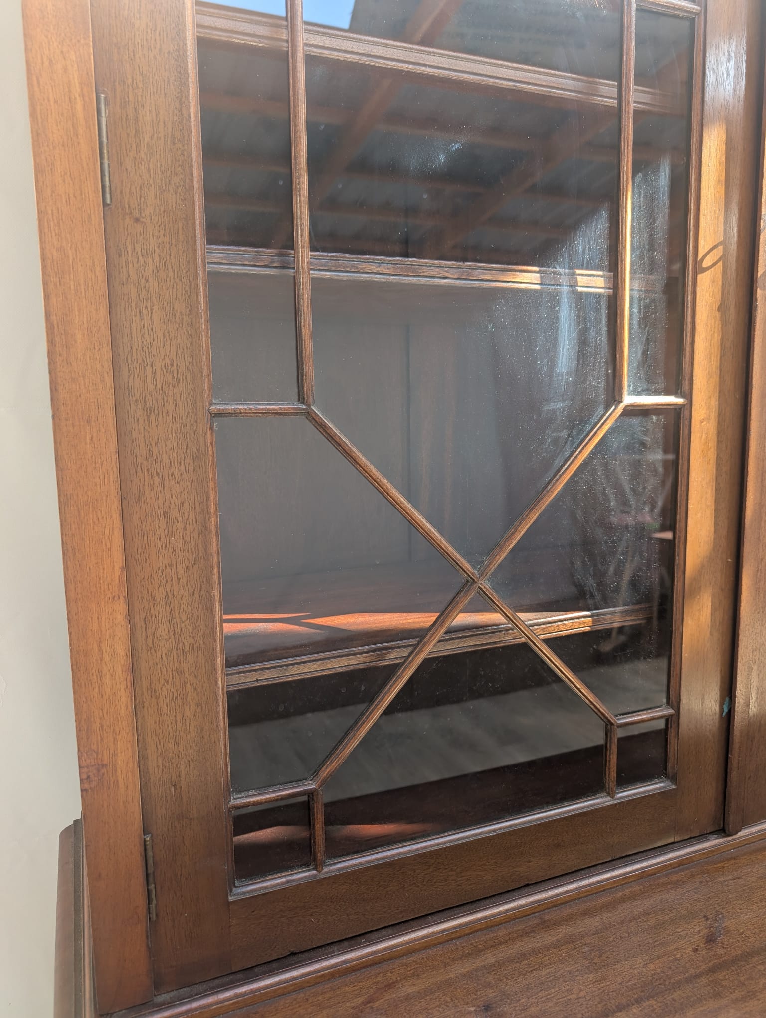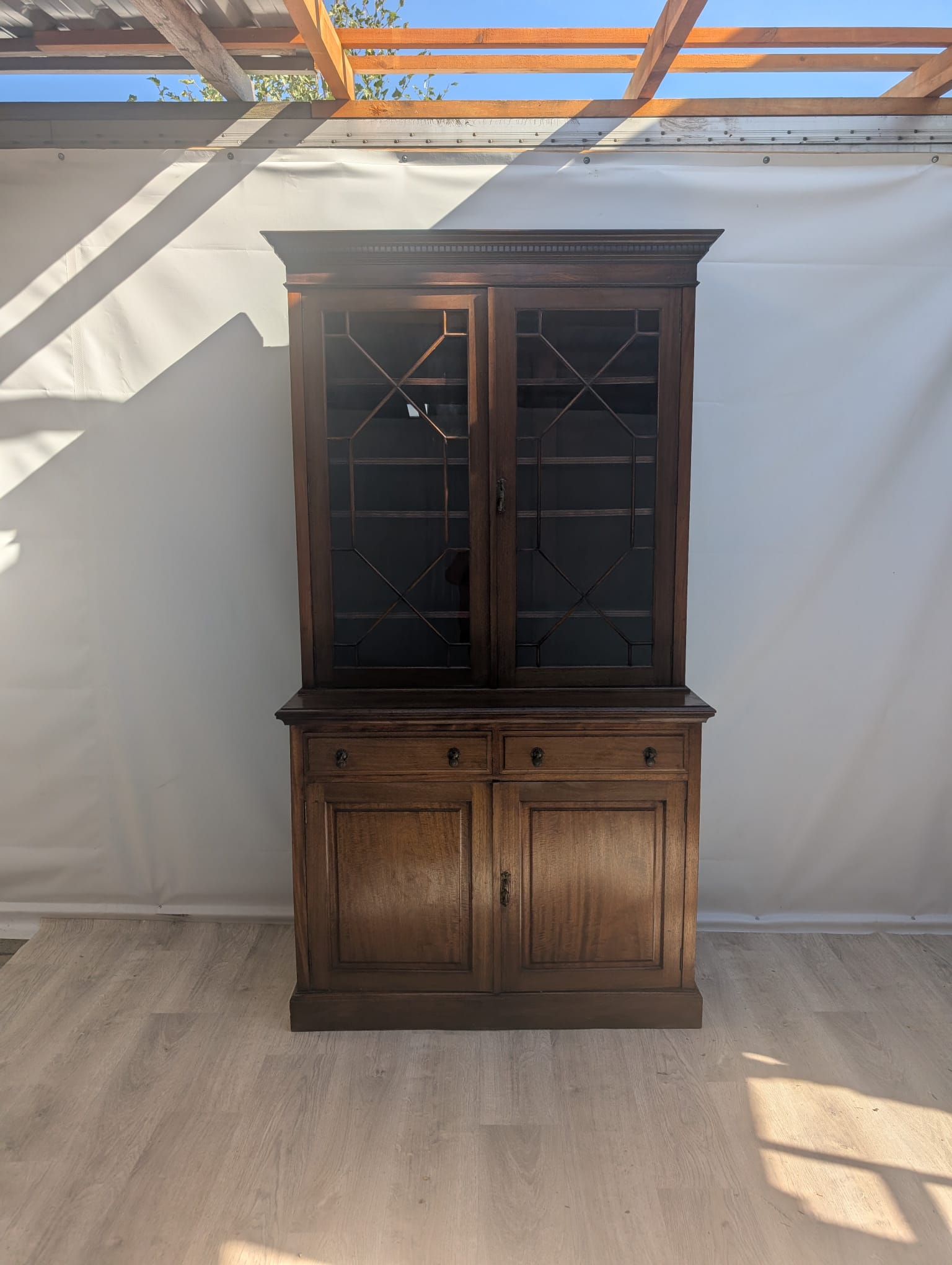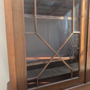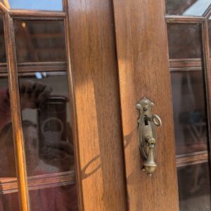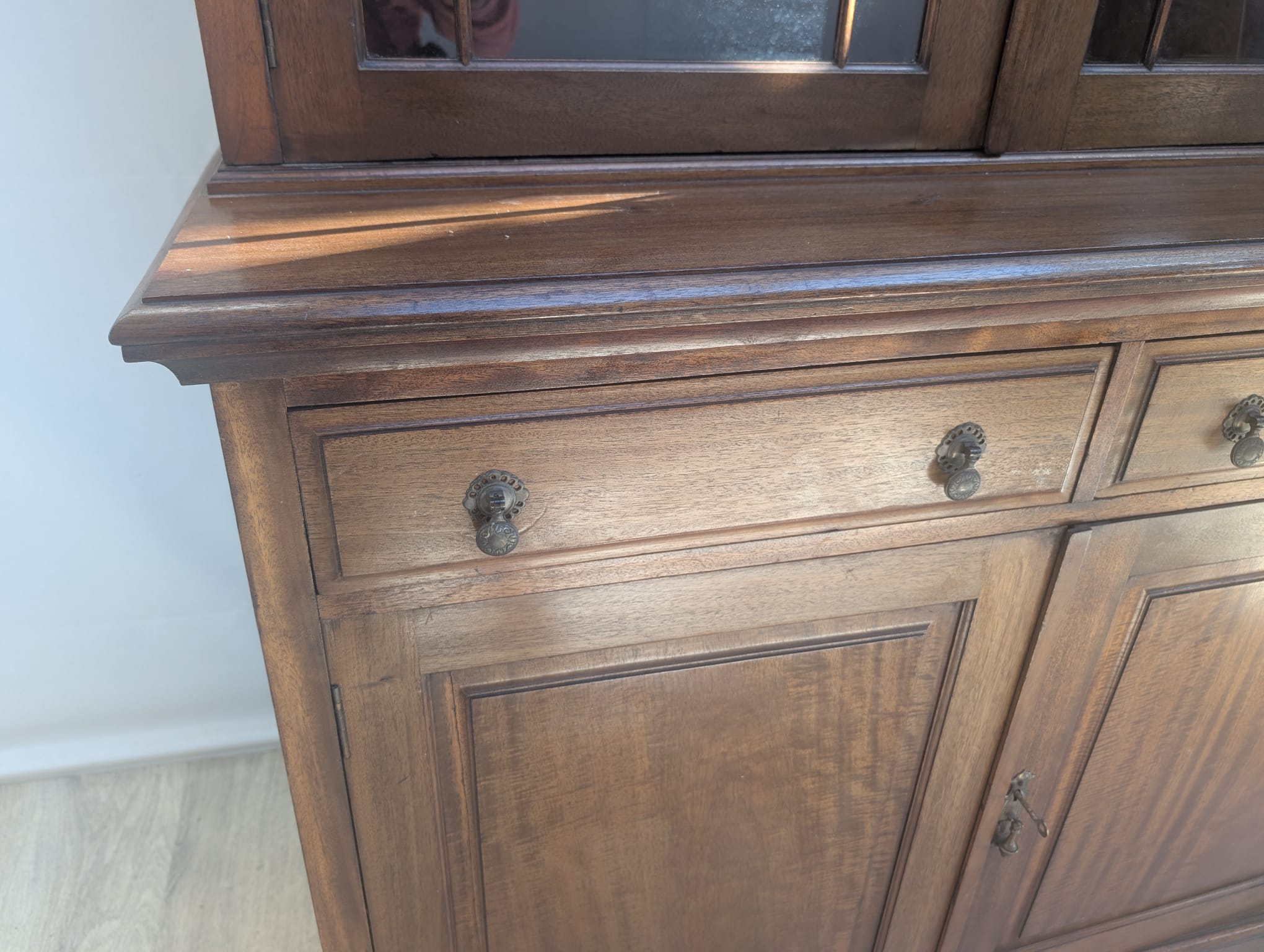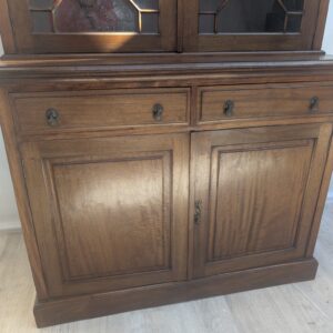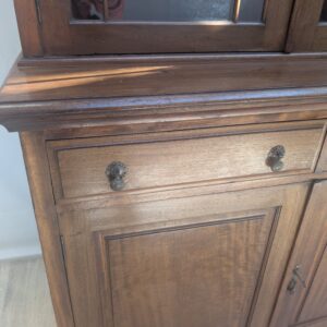 Stylowy kredens w stylu vintage z lat 40. XX wieku, wykonany z drewna pokryta fornirem mahoniowym. Składa się z górnej części z przeszklonymi drzwiami oraz dolnej części z dwoma drzwiami. Mebel w dobrym stanie zachowania, idealnie wpisujący się w klasyczny wystrój wnętrza.