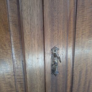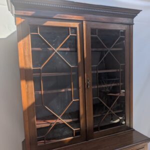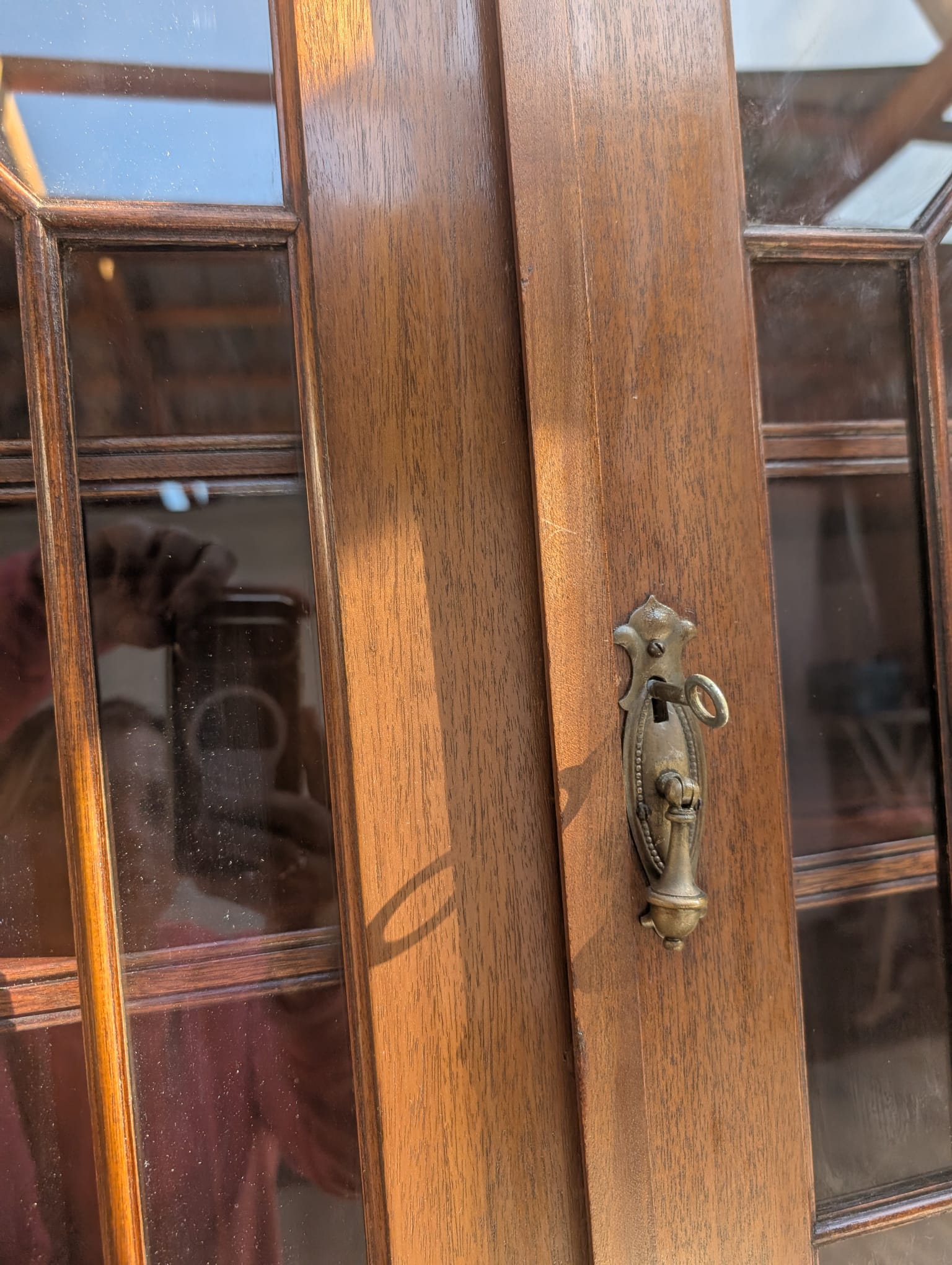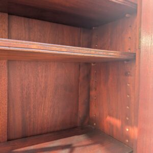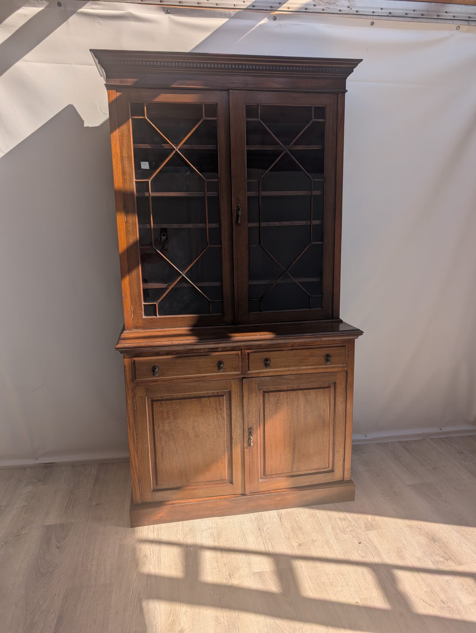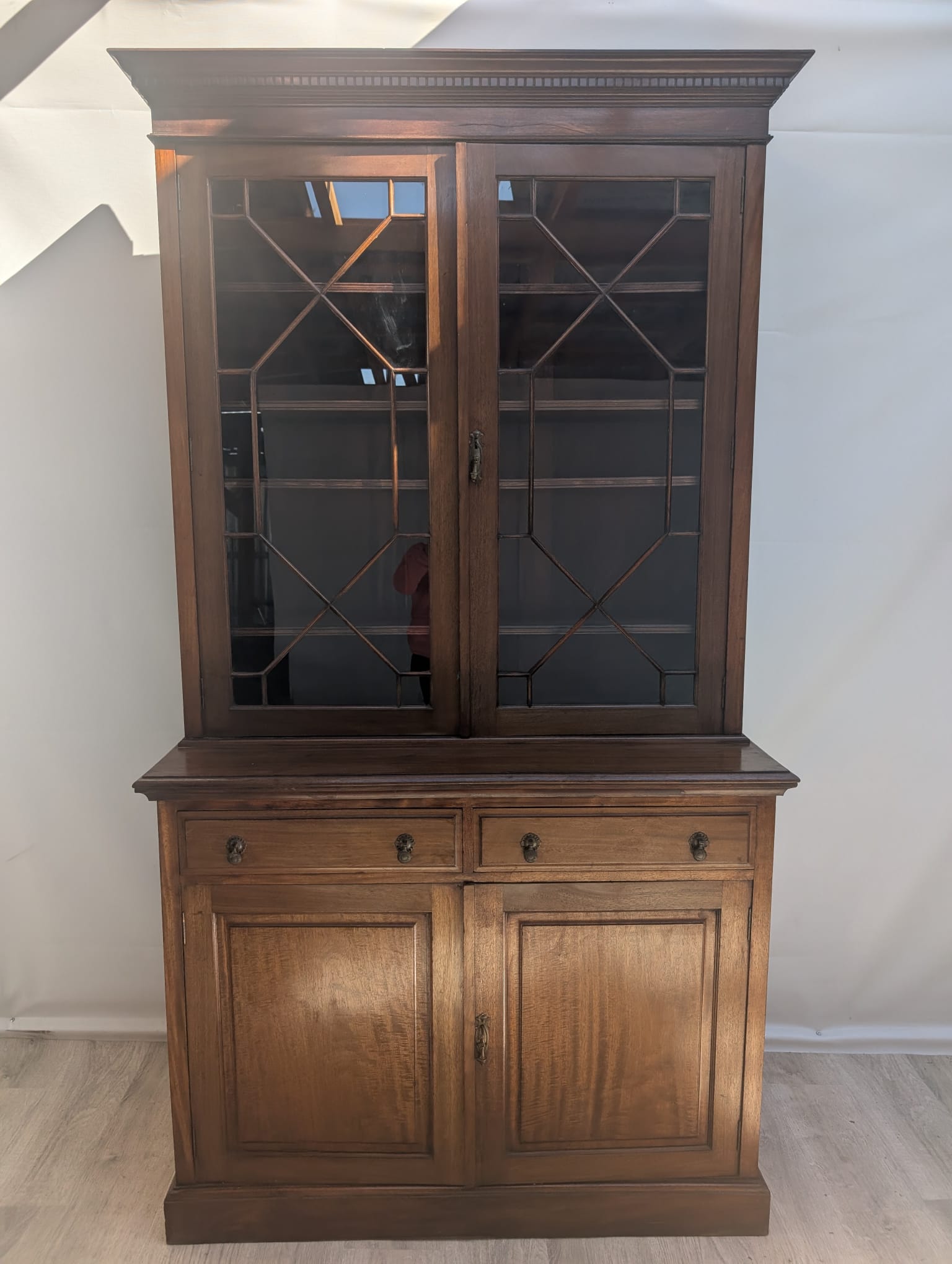 Stylowy kredens w stylu vintage z lat 40. XX wieku, wykonany z drewna pokryta fornirem mahoniowym. Składa się z górnej części z przeszklonymi drzwiami oraz dolnej części z dwoma drzwiami. Mebel w dobrym stanie zachowania, idealnie wpisujący się w klasyczny wystrój wnętrza.