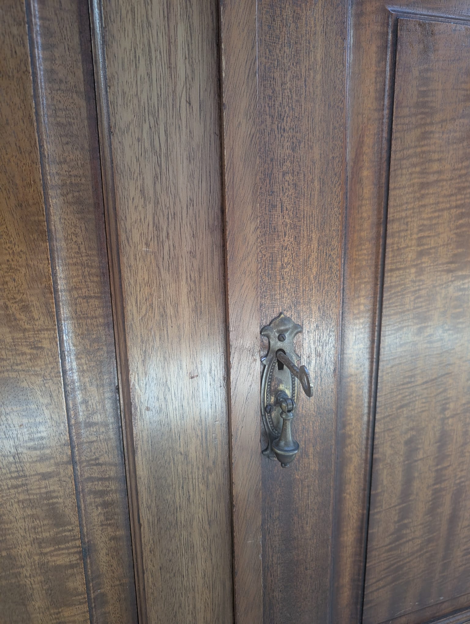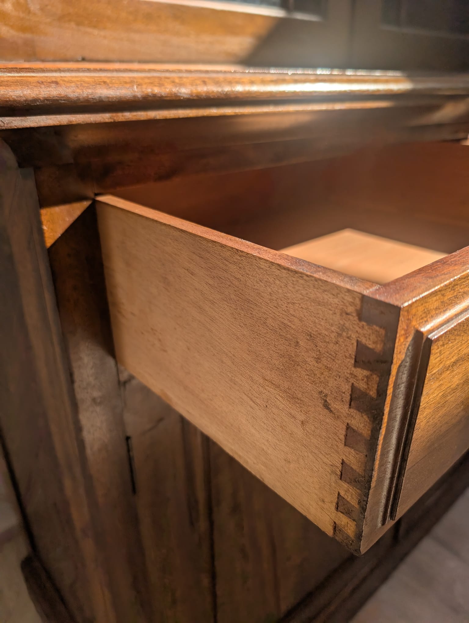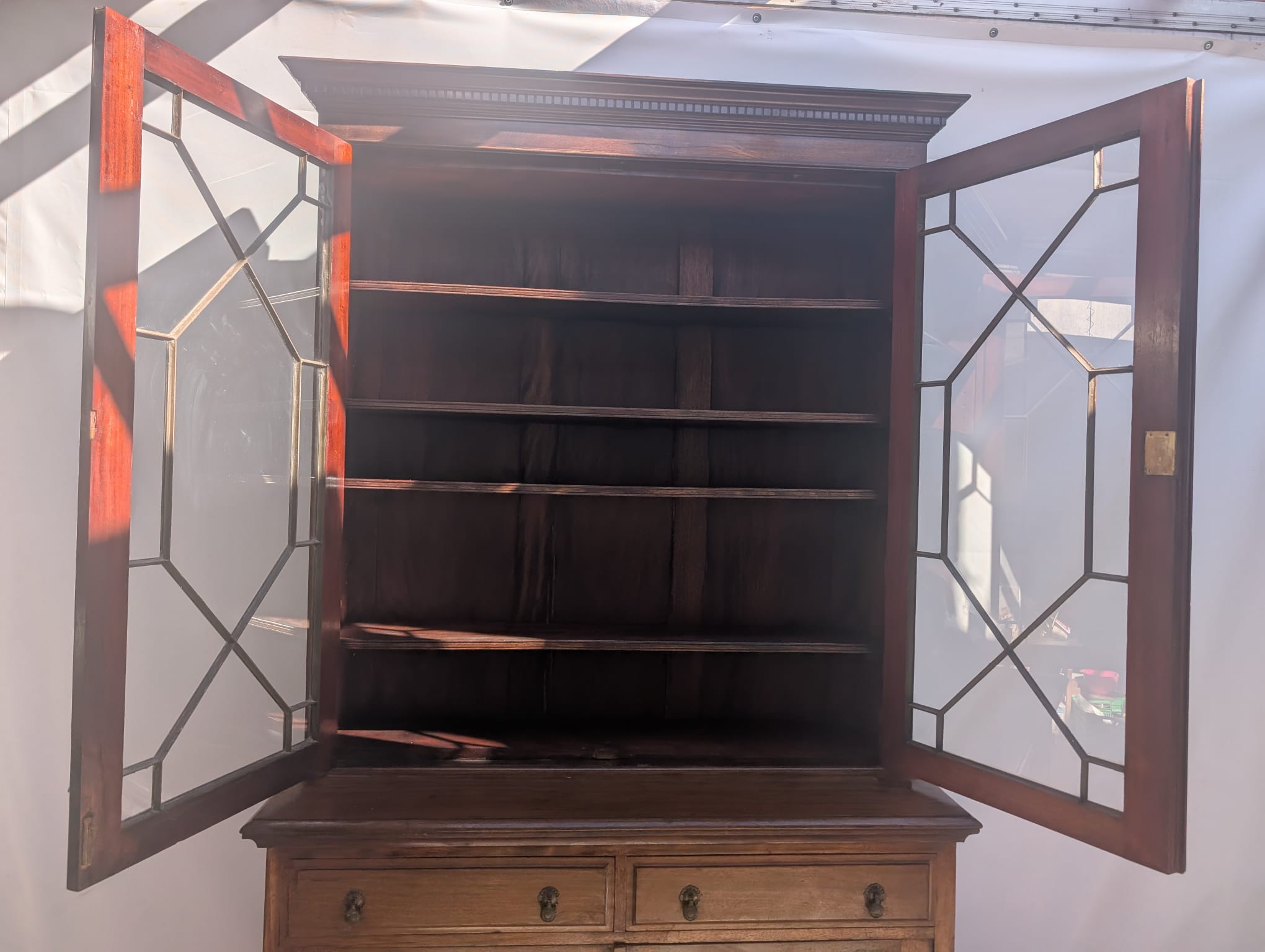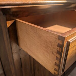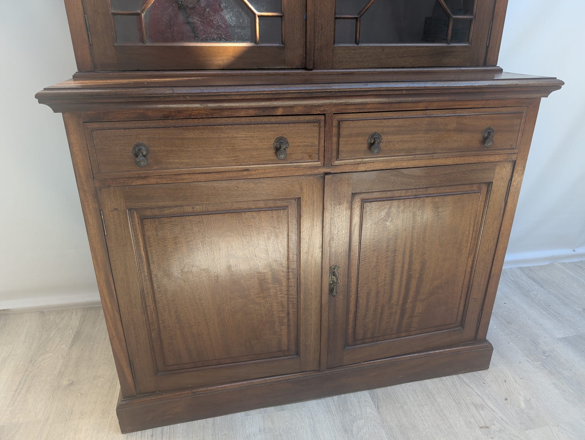 Stylowy kredens w stylu vintage z lat 40. XX wieku, wykonany z drewna pokryta fornirem mahoniowym. Składa się z górnej części z przeszklonymi drzwiami oraz dolnej części z dwoma drzwiami. Mebel w dobrym stanie zachowania, idealnie wpisujący się w klasyczny wystrój wnętrza.