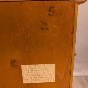 Posiada charakterystyczne uchwyty i drewniane wykończenie. Mebel w dobrym stanie, nadaje się do wykorzystania jako praktyczna szafka lub dekoracja wnętrza.