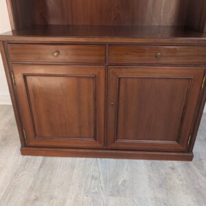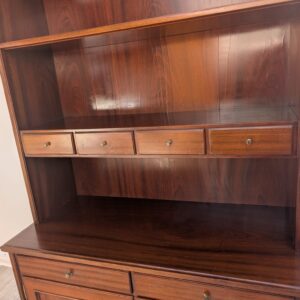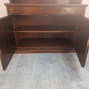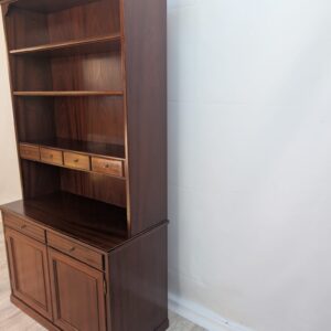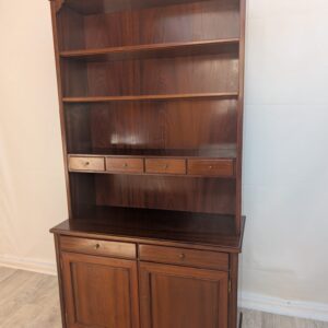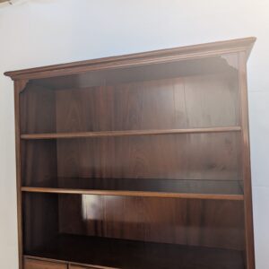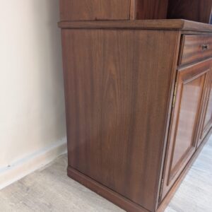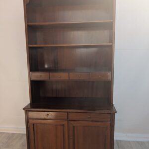 Stylowy, angielski regał w kolorze orzechowym z lat 70-tych. Posiada pojemne szafki i półki, które pozwolą na wygodne przechowywanie książek lub innych przedmiotów. Solidna konstrukcja i elegancki design sprawią, że będzie on piękną ozdobą każdego wnętrza.