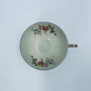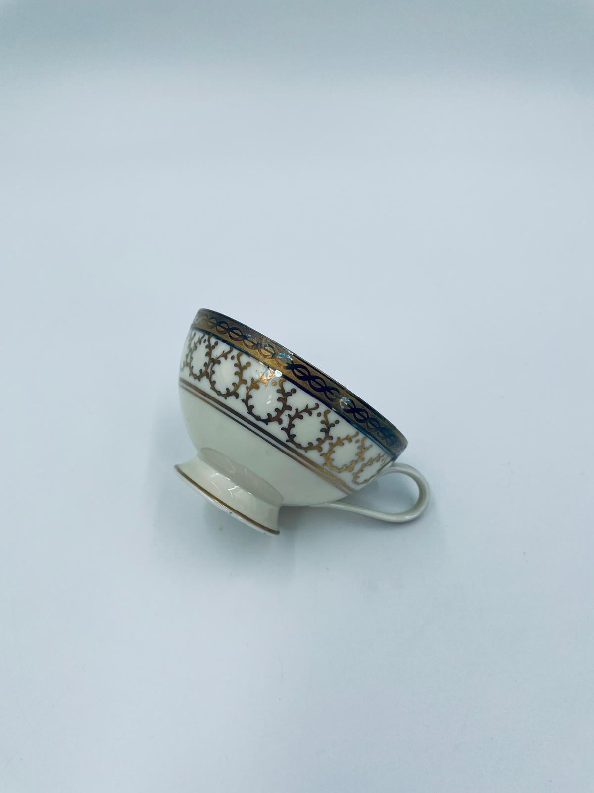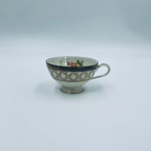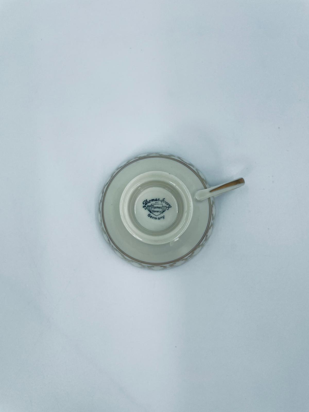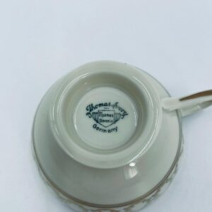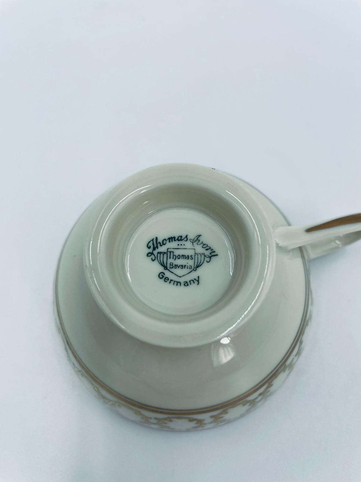 Zabytkowa filiżanka kolekcjonerska wytwórni Thomas Ivory Bavaria, wykonana z wysokiej jakości porcelany w kolorze ecru. Filiżanka posiada misterny wzór kwiatowy wewnątrz oraz złoty wzór z zewnątrz, wykończona złoceniem na rancie. Posiada przetarcie na złoceniu.