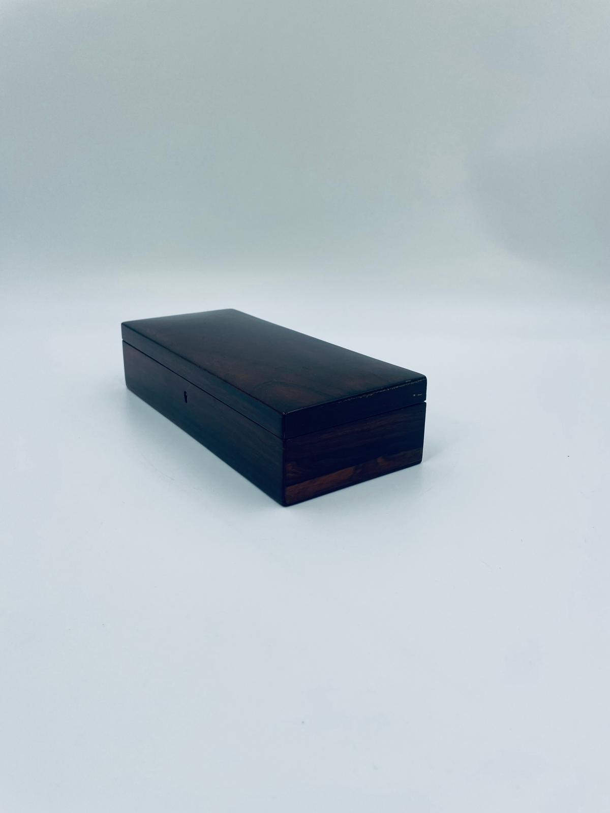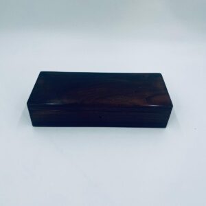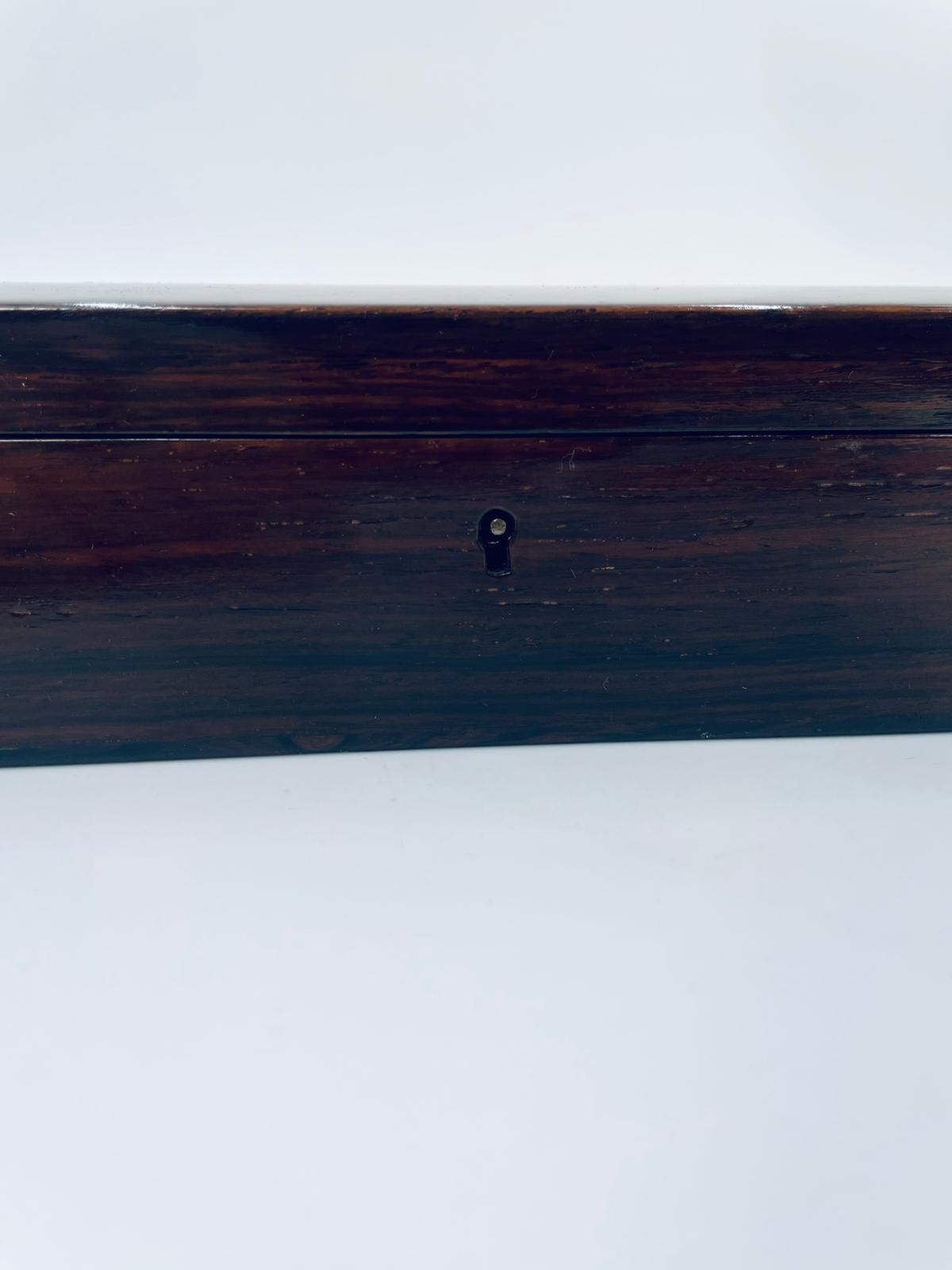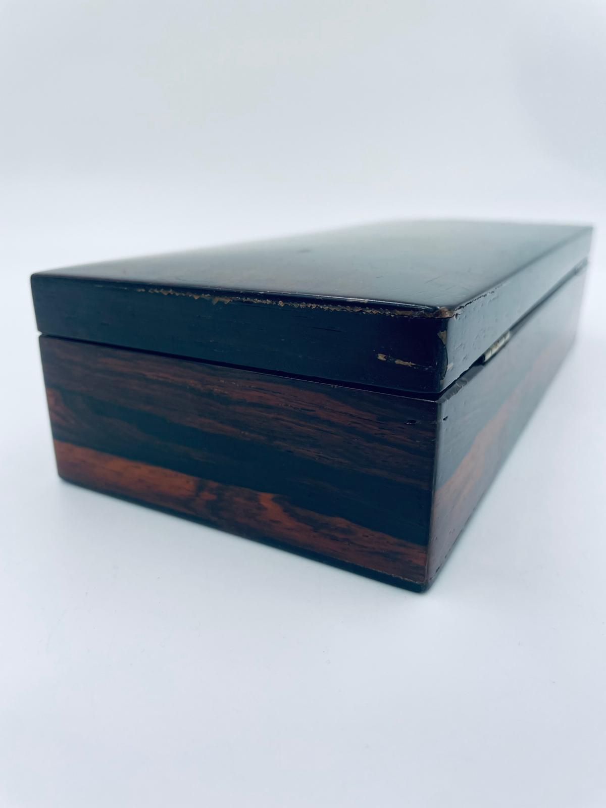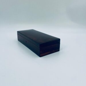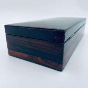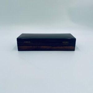 Zabytkowa szkatułka w stylu Vintage, wykonana z drewna o ciemnobrązowym odcieniu z gładką, lakierowaną powierzchnią. Szkatułka zamykana na zamek (brak klucza). Posiada drobne zarysowania.