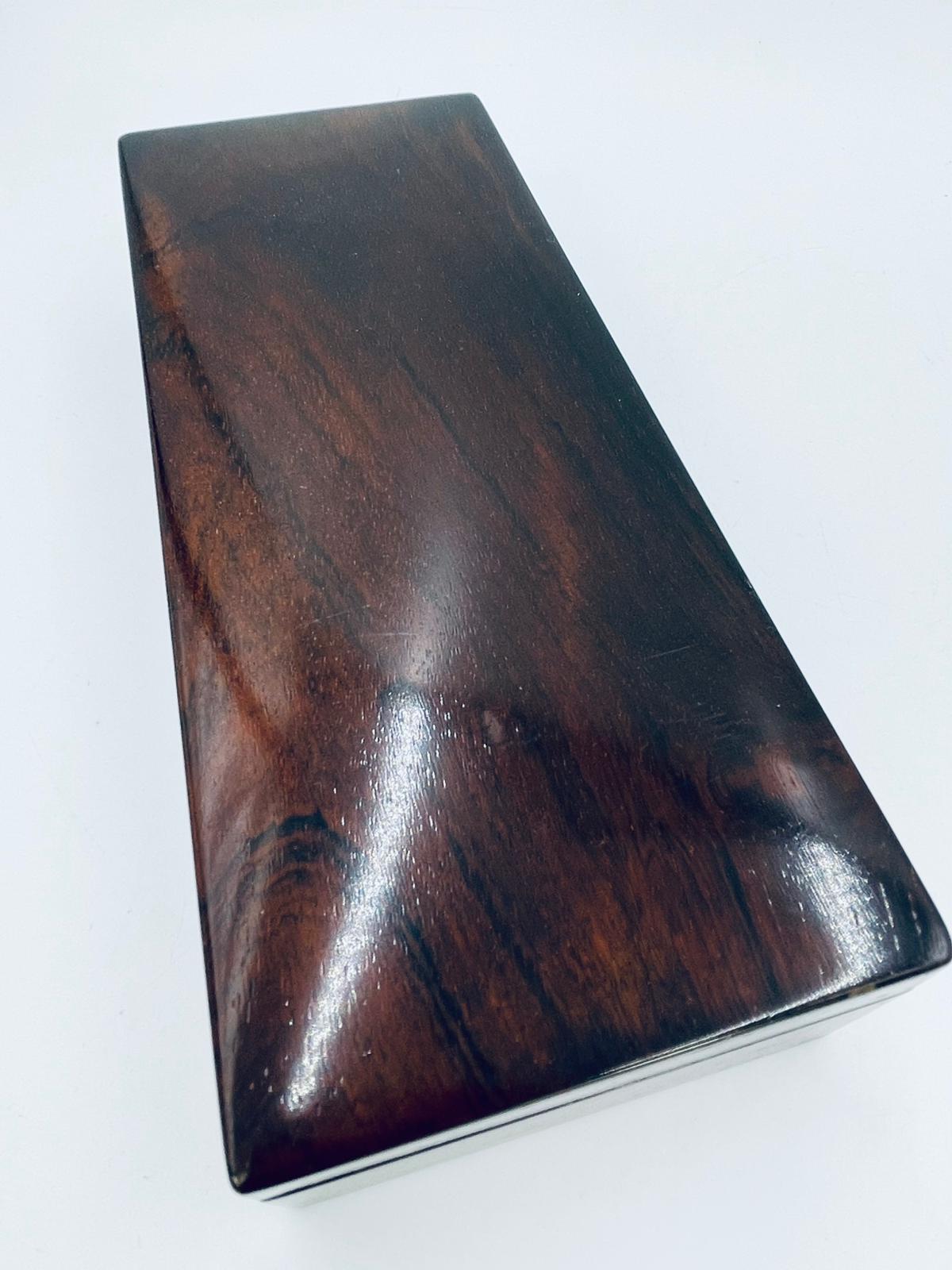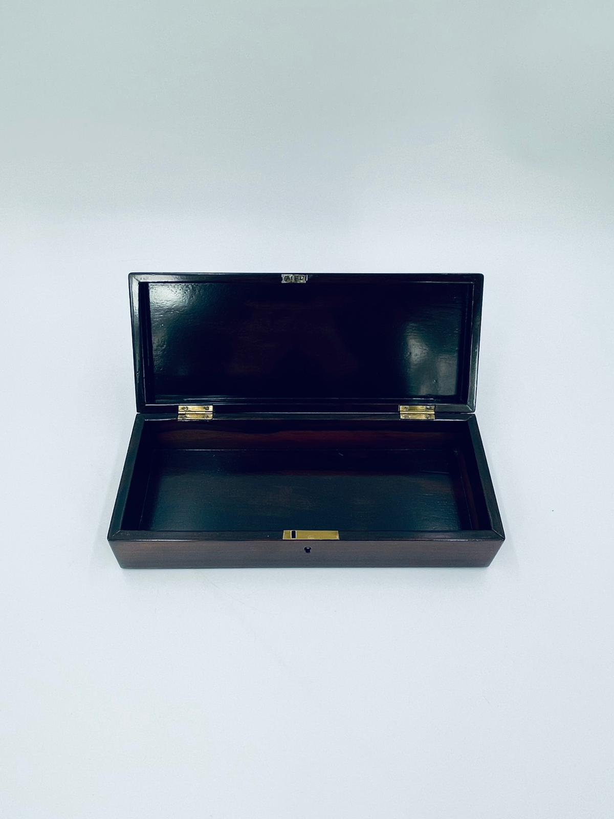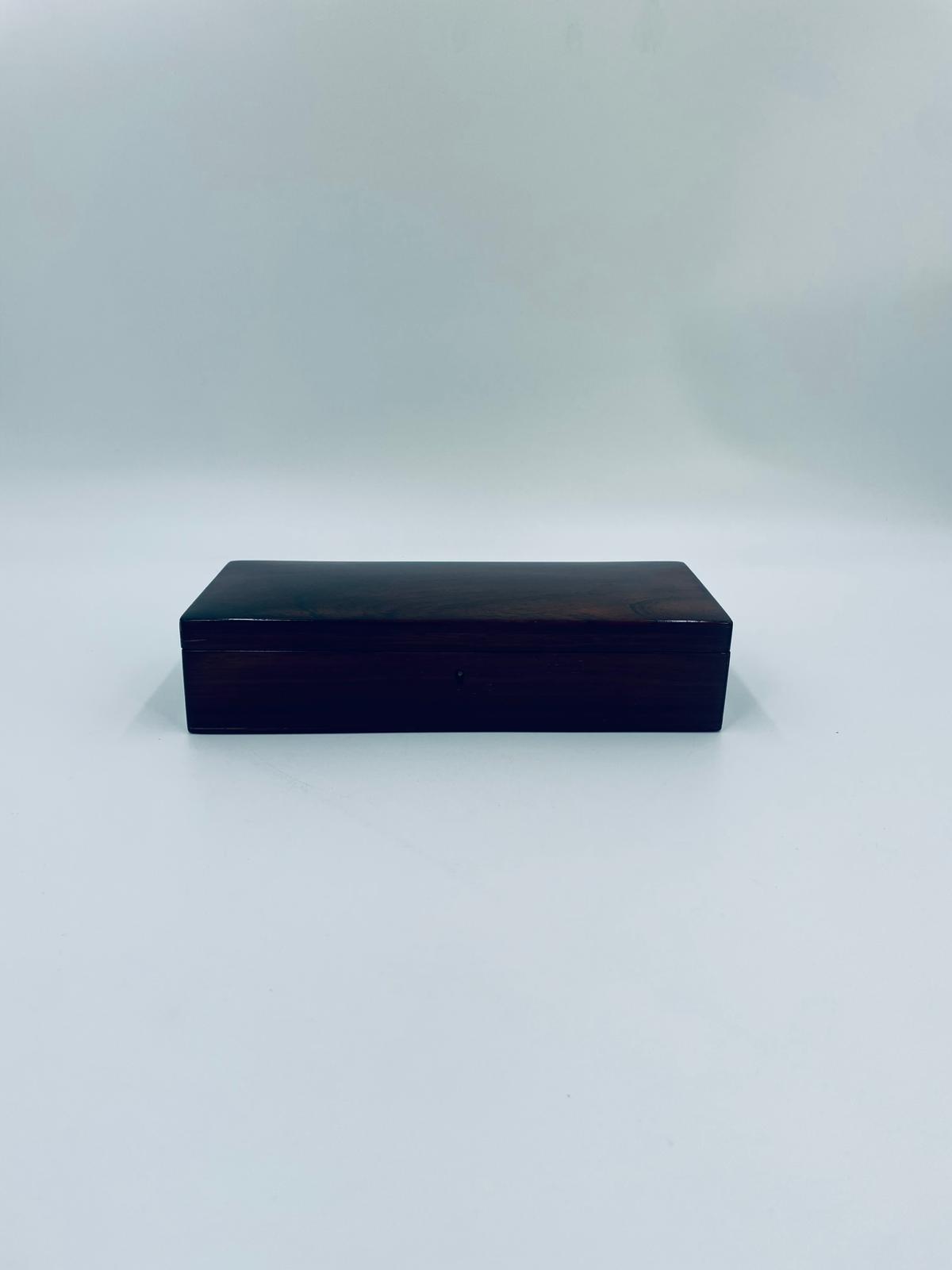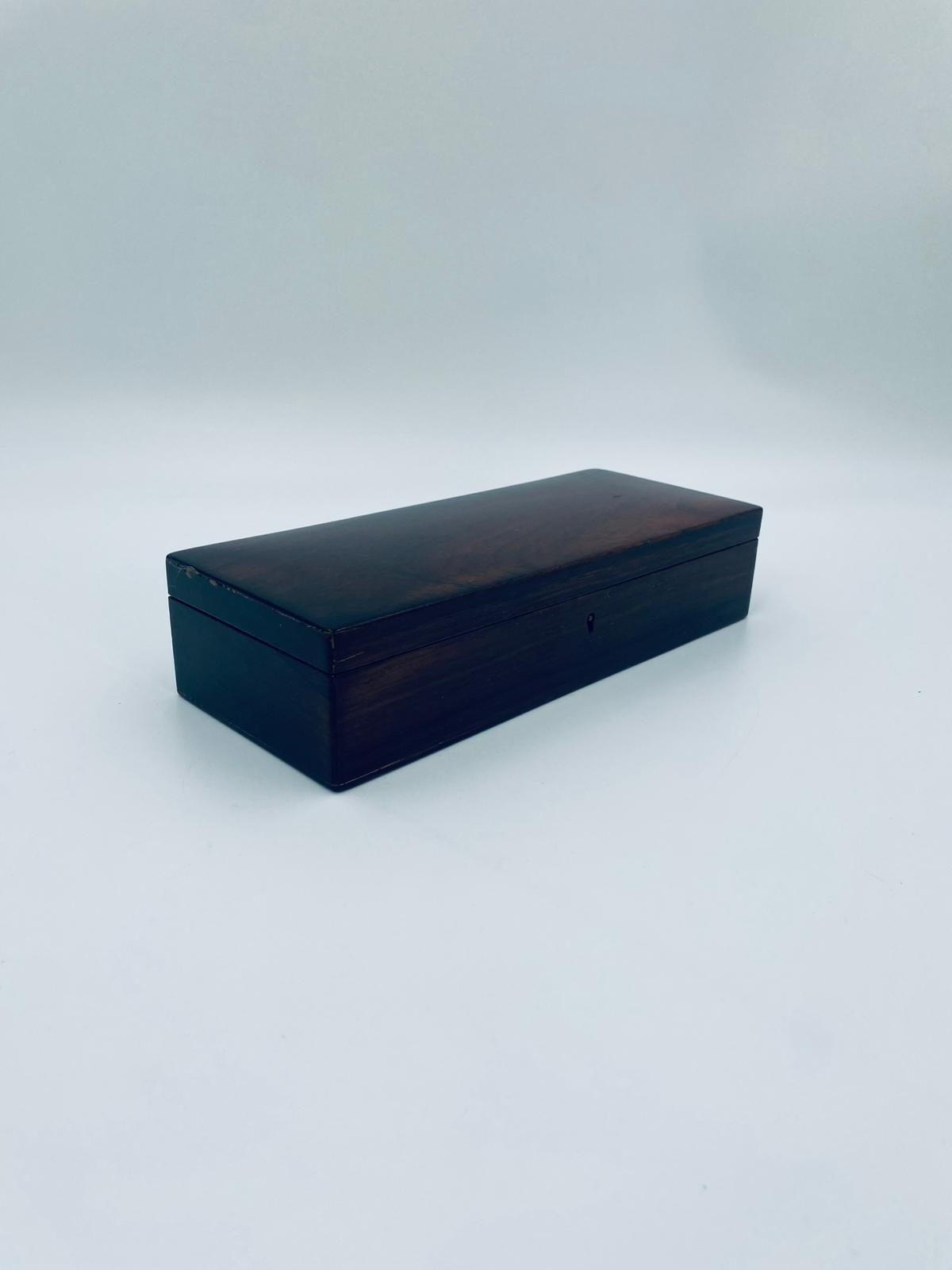 Zabytkowa szkatułka w stylu Vintage, wykonana z drewna o ciemnobrązowym odcieniu z gładką, lakierowaną powierzchnią. Szkatułka zamykana na zamek (brak klucza). Posiada drobne zarysowania.