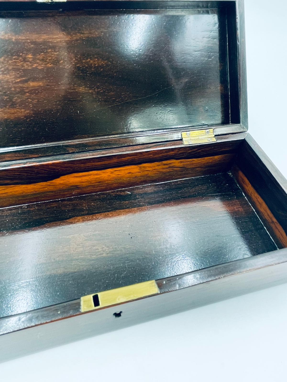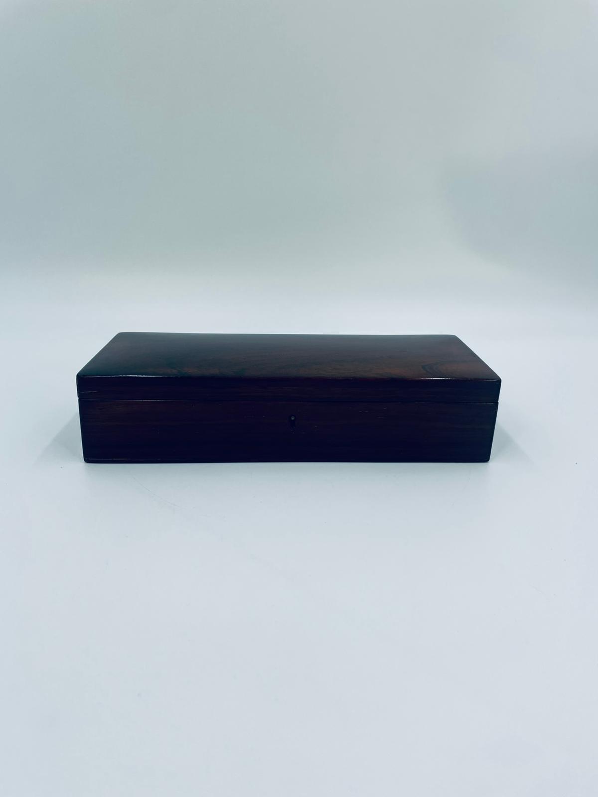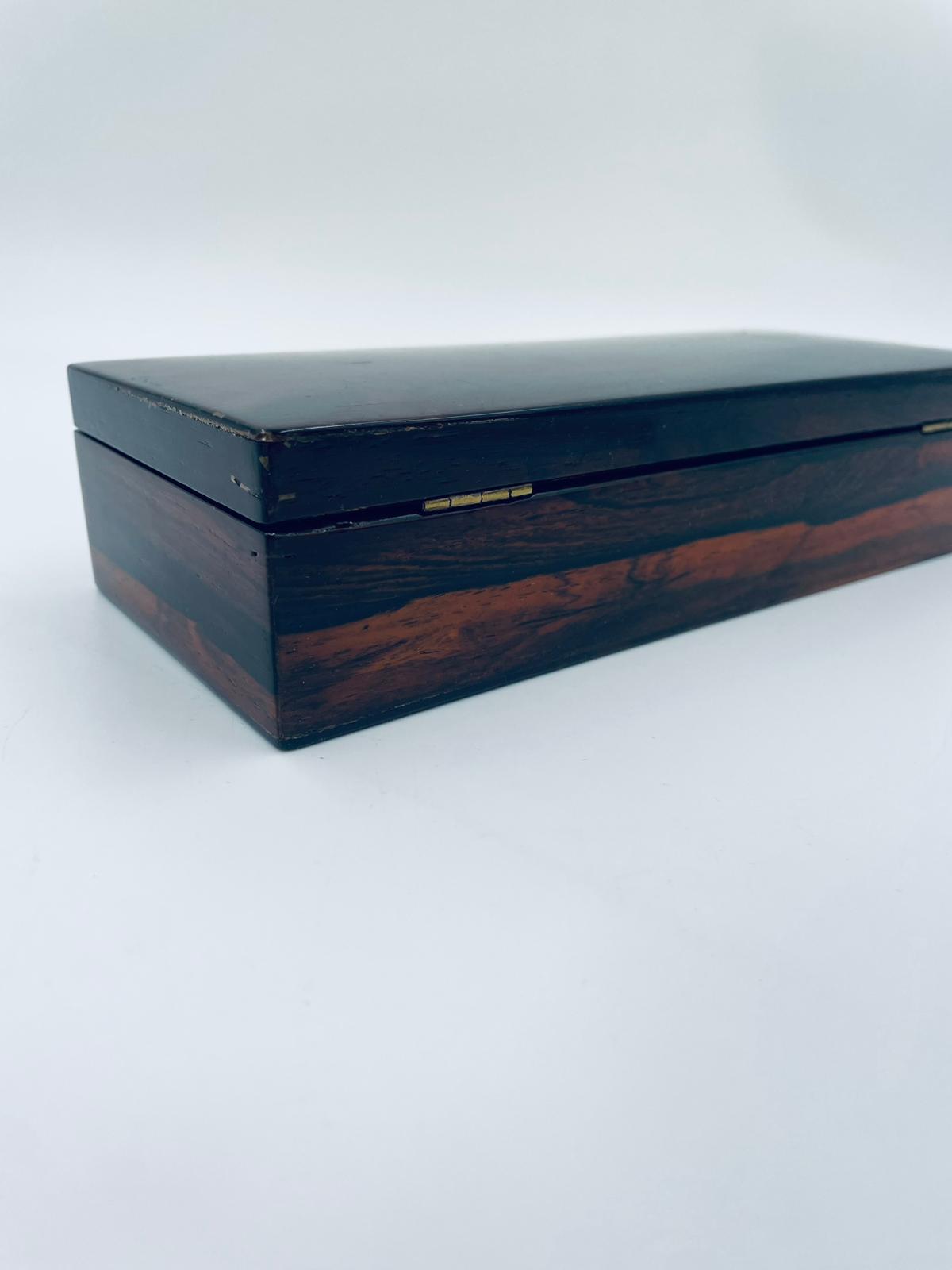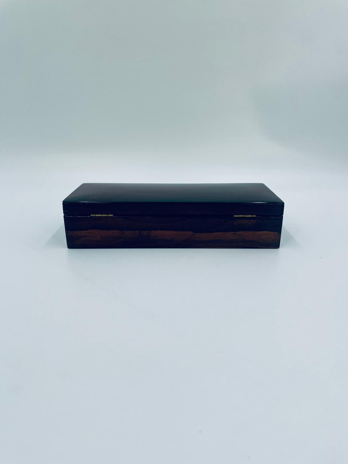 Zabytkowa szkatułka w stylu Vintage, wykonana z drewna o ciemnobrązowym odcieniu z gładką, lakierowaną powierzchnią. Szkatułka zamykana na zamek (brak klucza). Posiada drobne zarysowania.