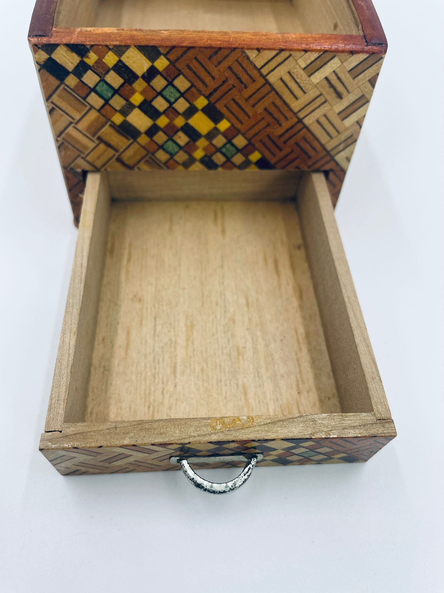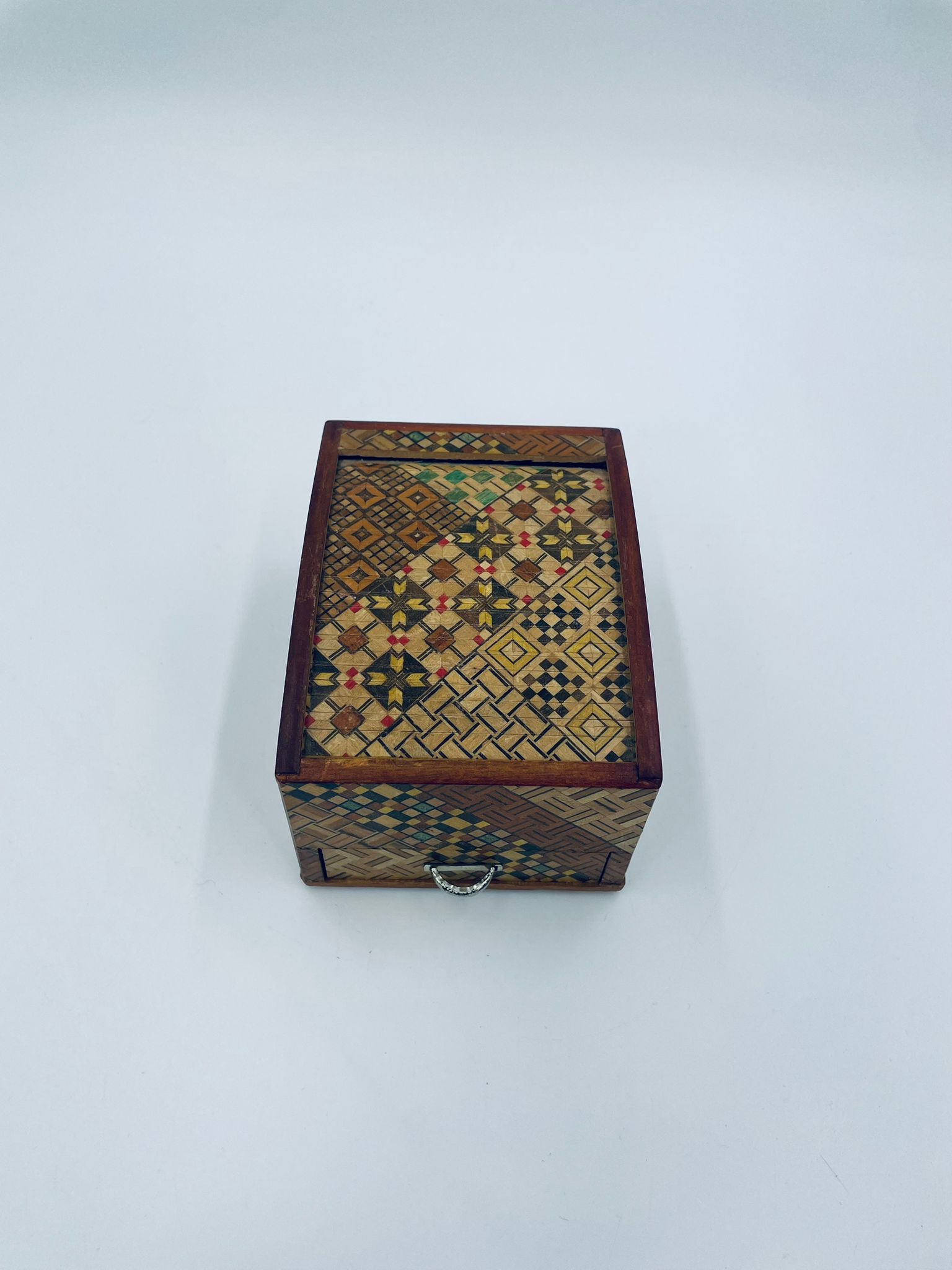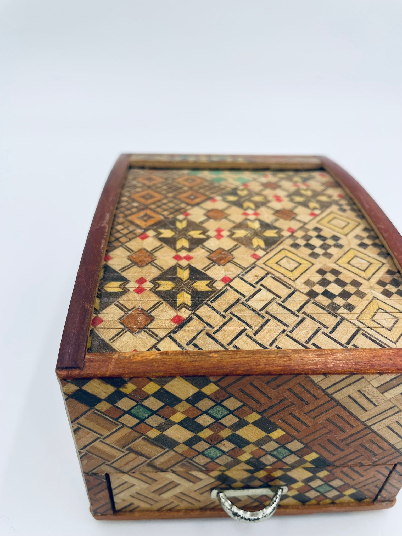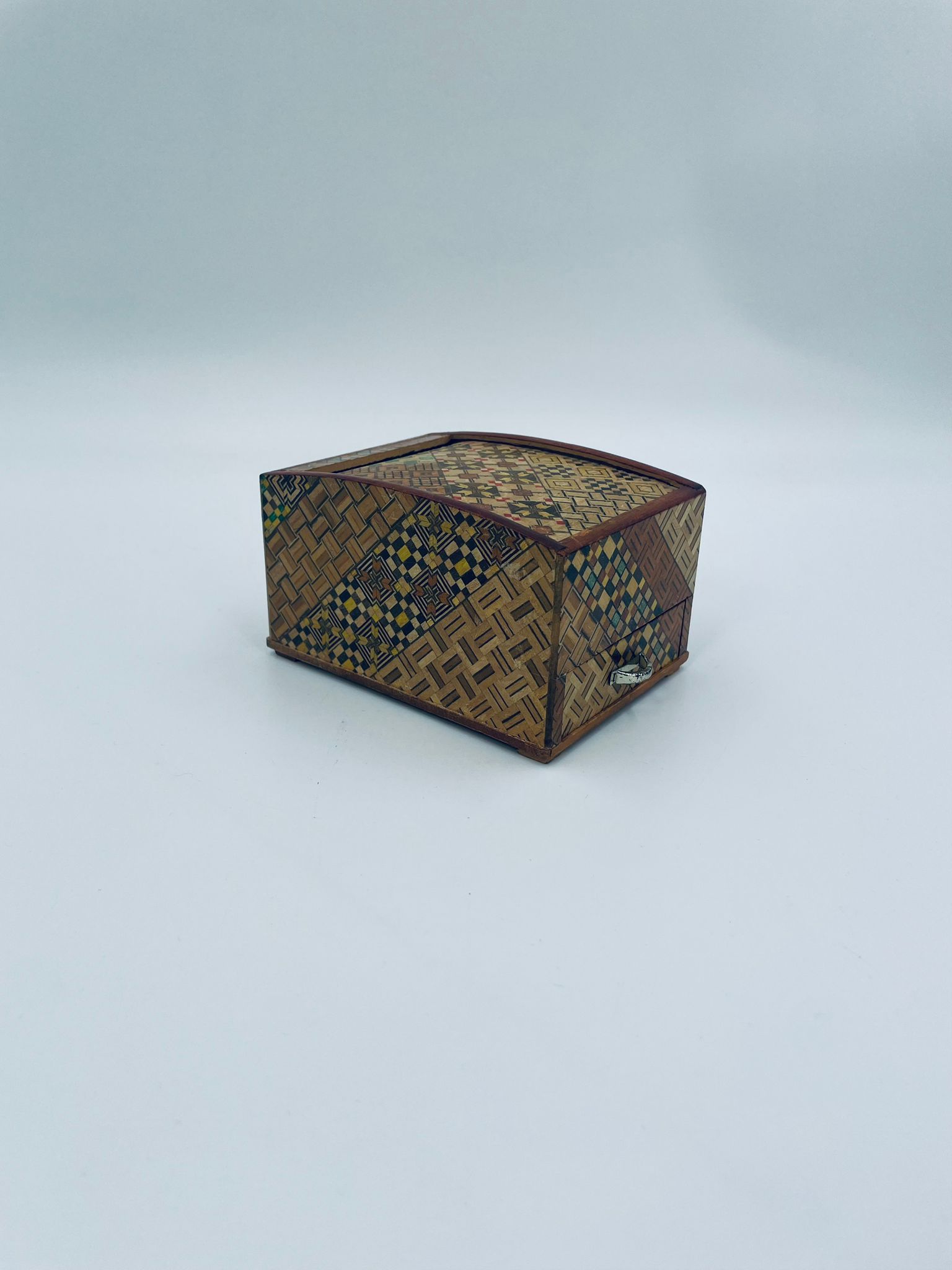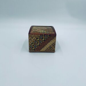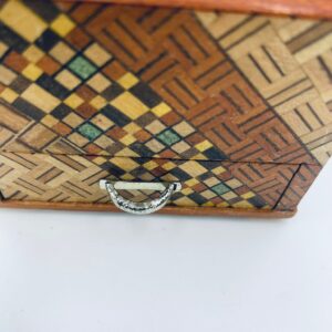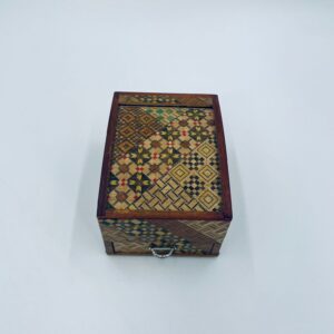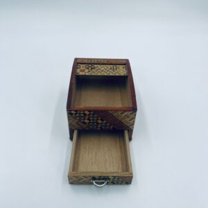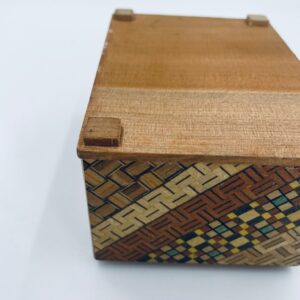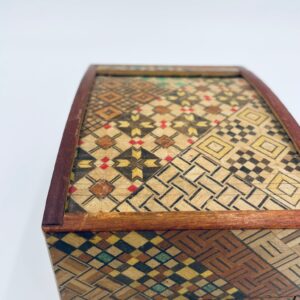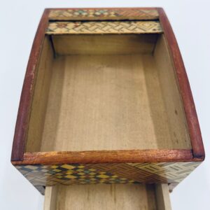 Zabytkowa szkatułka Japońska , pudełko zagadka pochodzące z Hakone, Himitsu-bako w stylu Hakone Yosegi, wykonane z drewna z tradycyjną japońską mozaiką zwaną Yosegi. Szkatułka we wzorach geometrycznych, które powstają z połączenia różnych rodzajów naturalnie barwionych gatunków drewna. Otwieranie szuflady powoduje również otwarcie jej górnej pokrywy. Otwieranie i zamykanie szuflady sygnalizowane jest dźwiękiem. Posiada małe przetarcie na uchwycie.