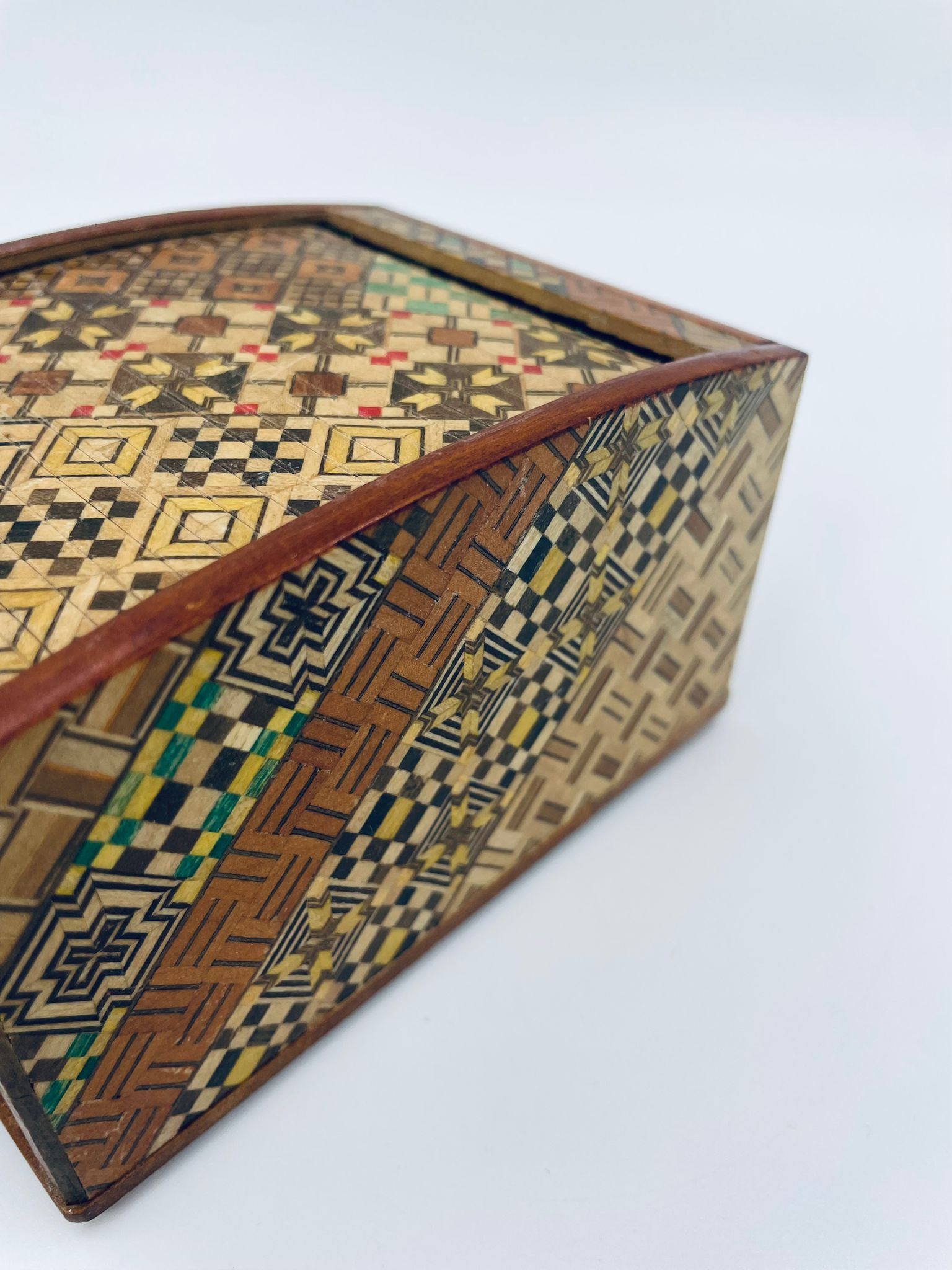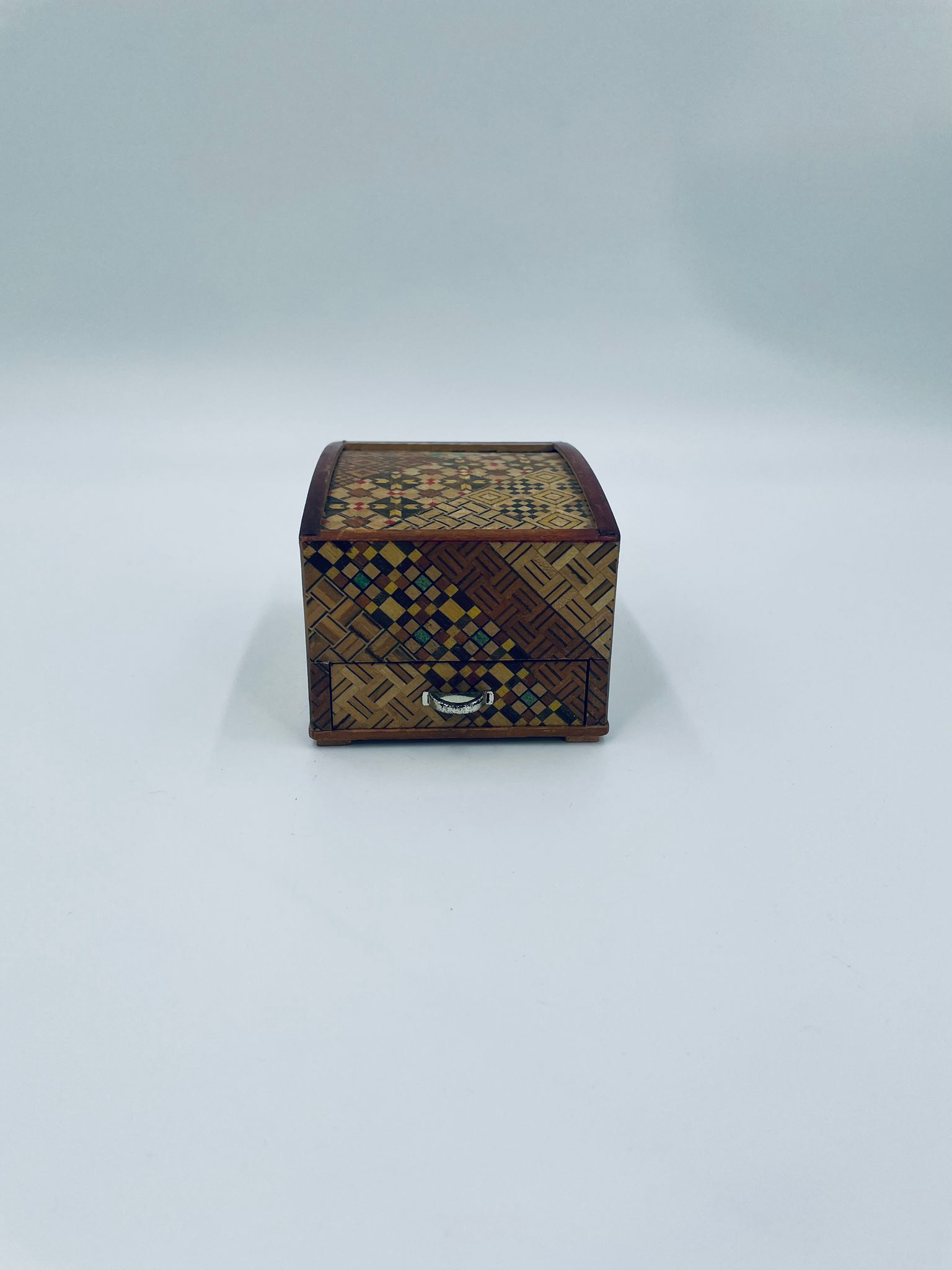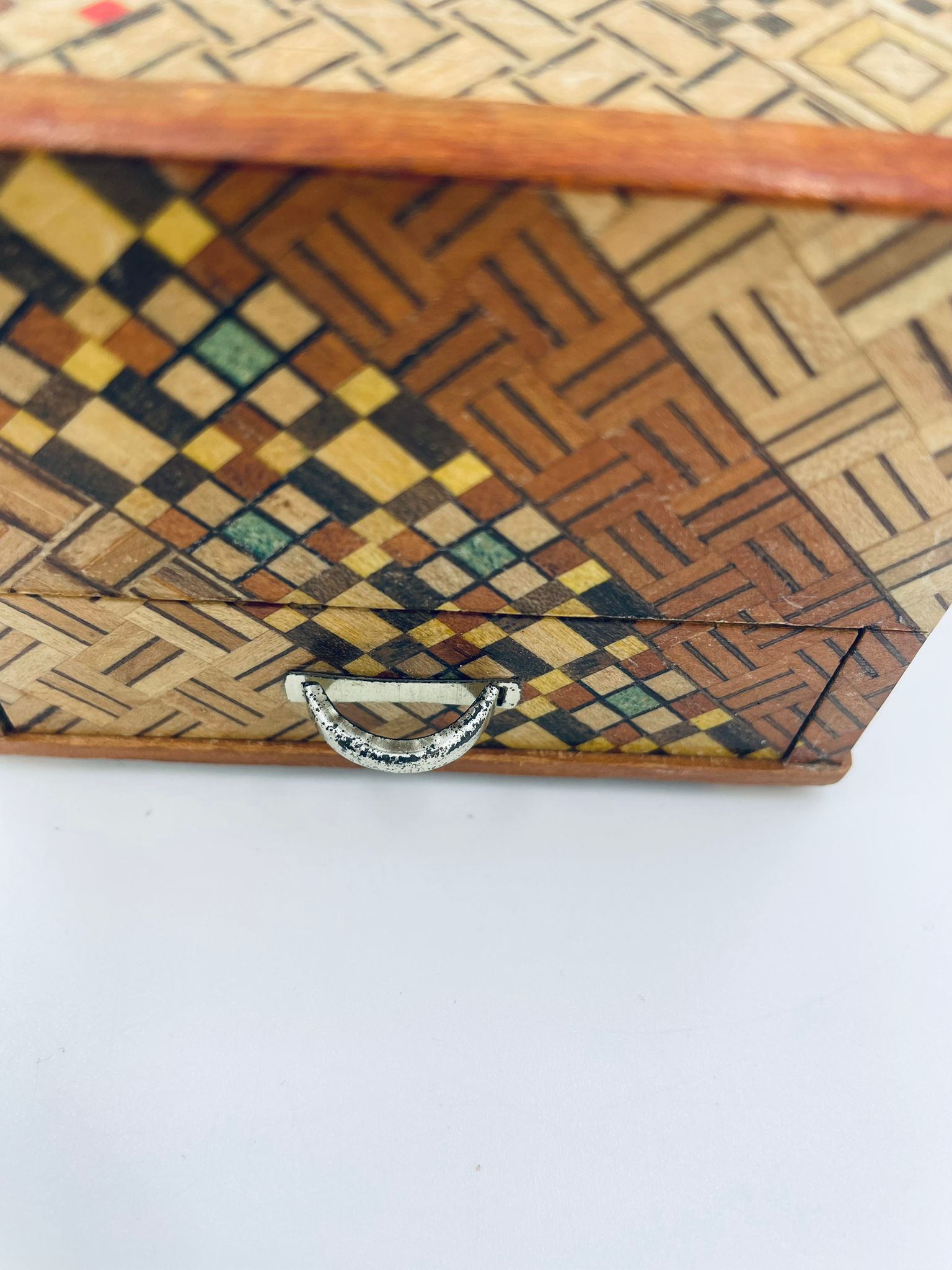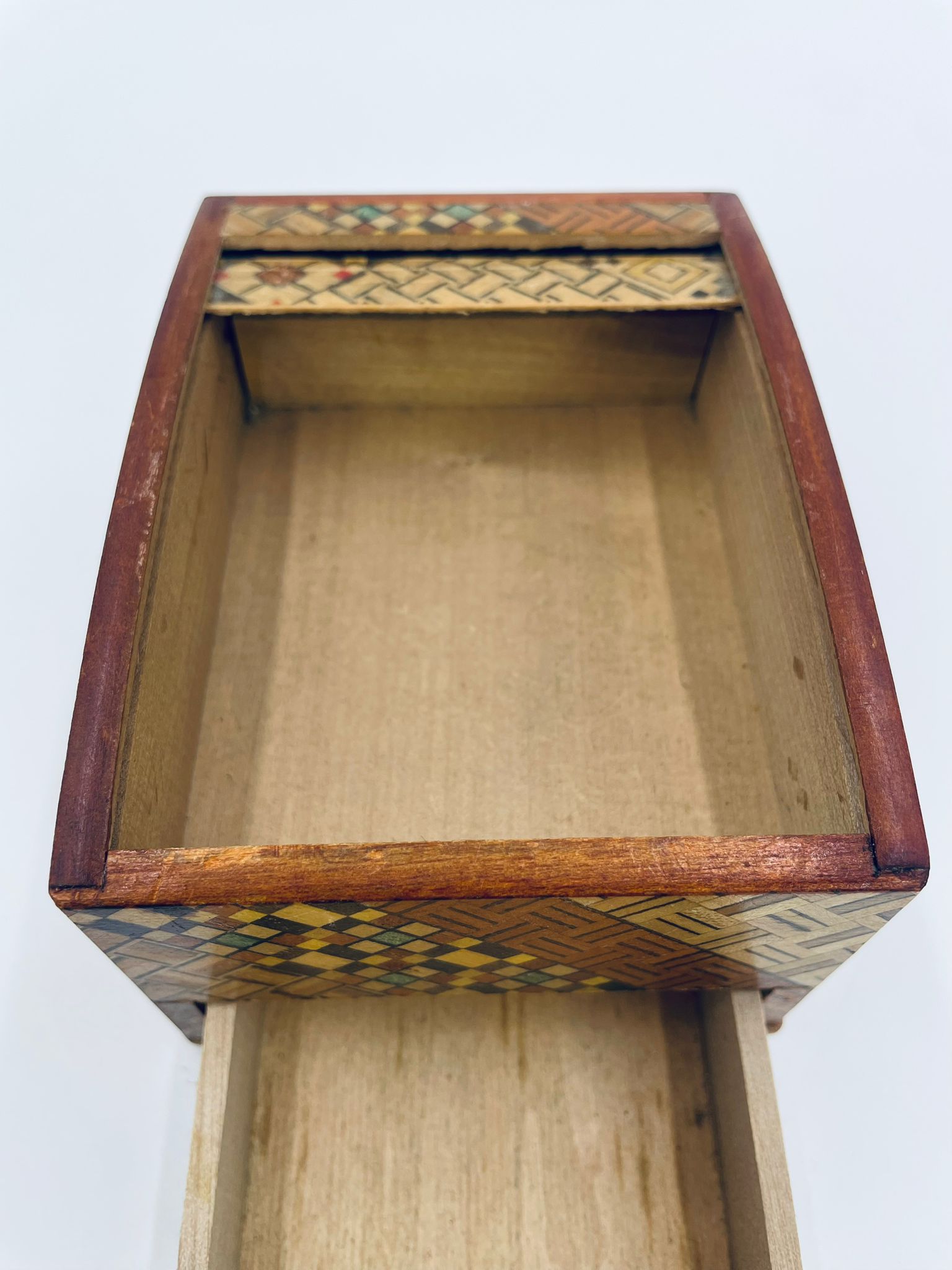 Zabytkowa szkatułka Japońska , pudełko zagadka pochodzące z Hakone, Himitsu-bako w stylu Hakone Yosegi, wykonane z drewna z tradycyjną japońską mozaiką zwaną Yosegi. Szkatułka we wzorach geometrycznych, które powstają z połączenia różnych rodzajów naturalnie barwionych gatunków drewna. Otwieranie szuflady powoduje również otwarcie jej górnej pokrywy. Otwieranie i zamykanie szuflady sygnalizowane jest dźwiękiem. Posiada małe przetarcie na uchwycie.