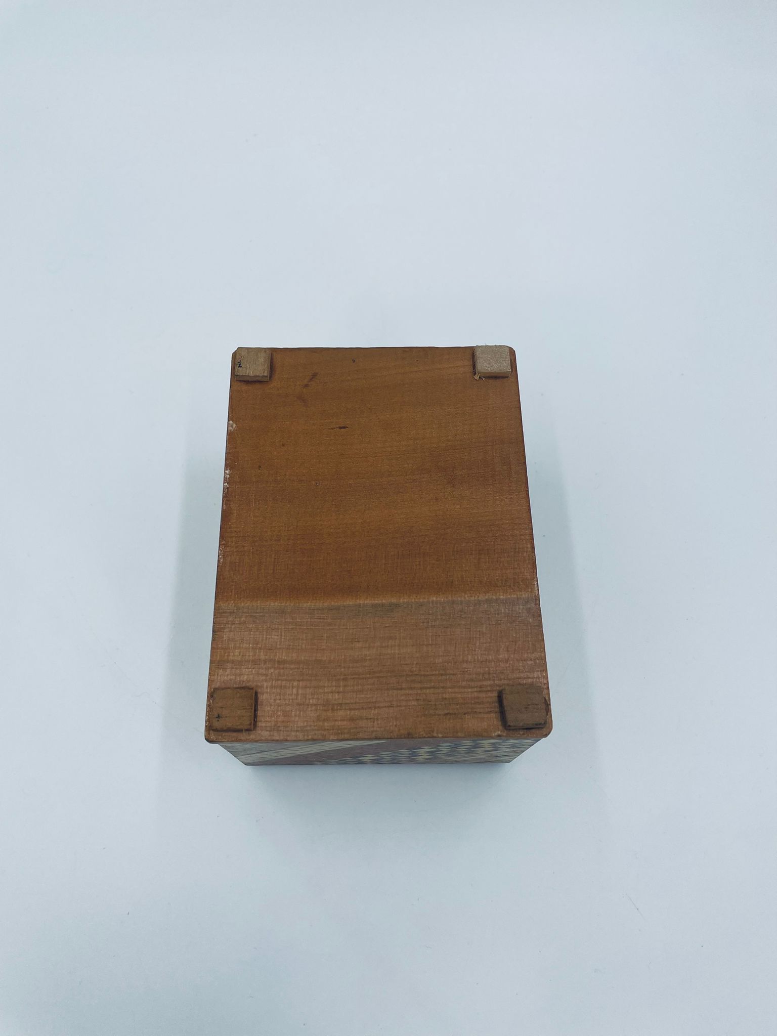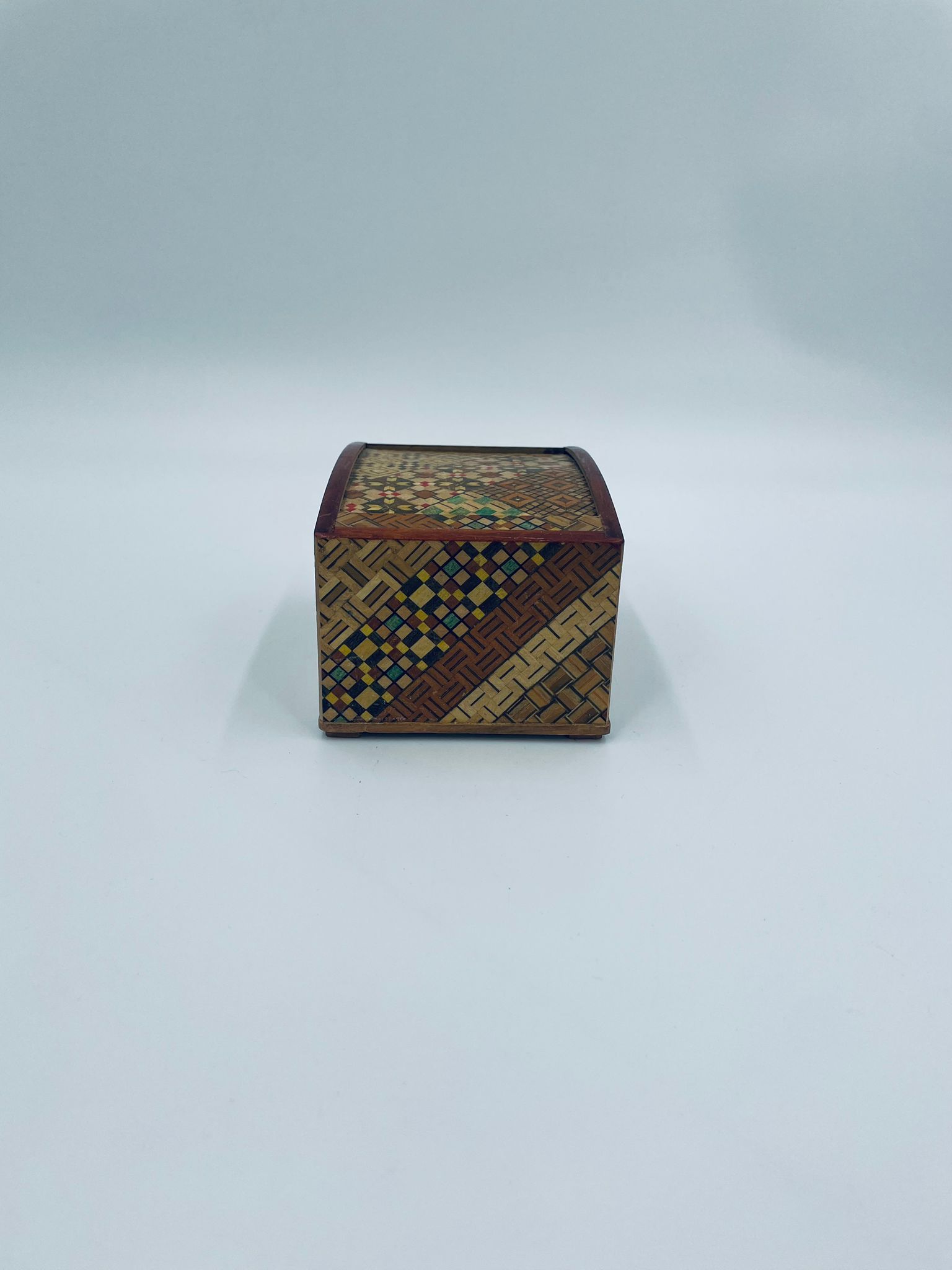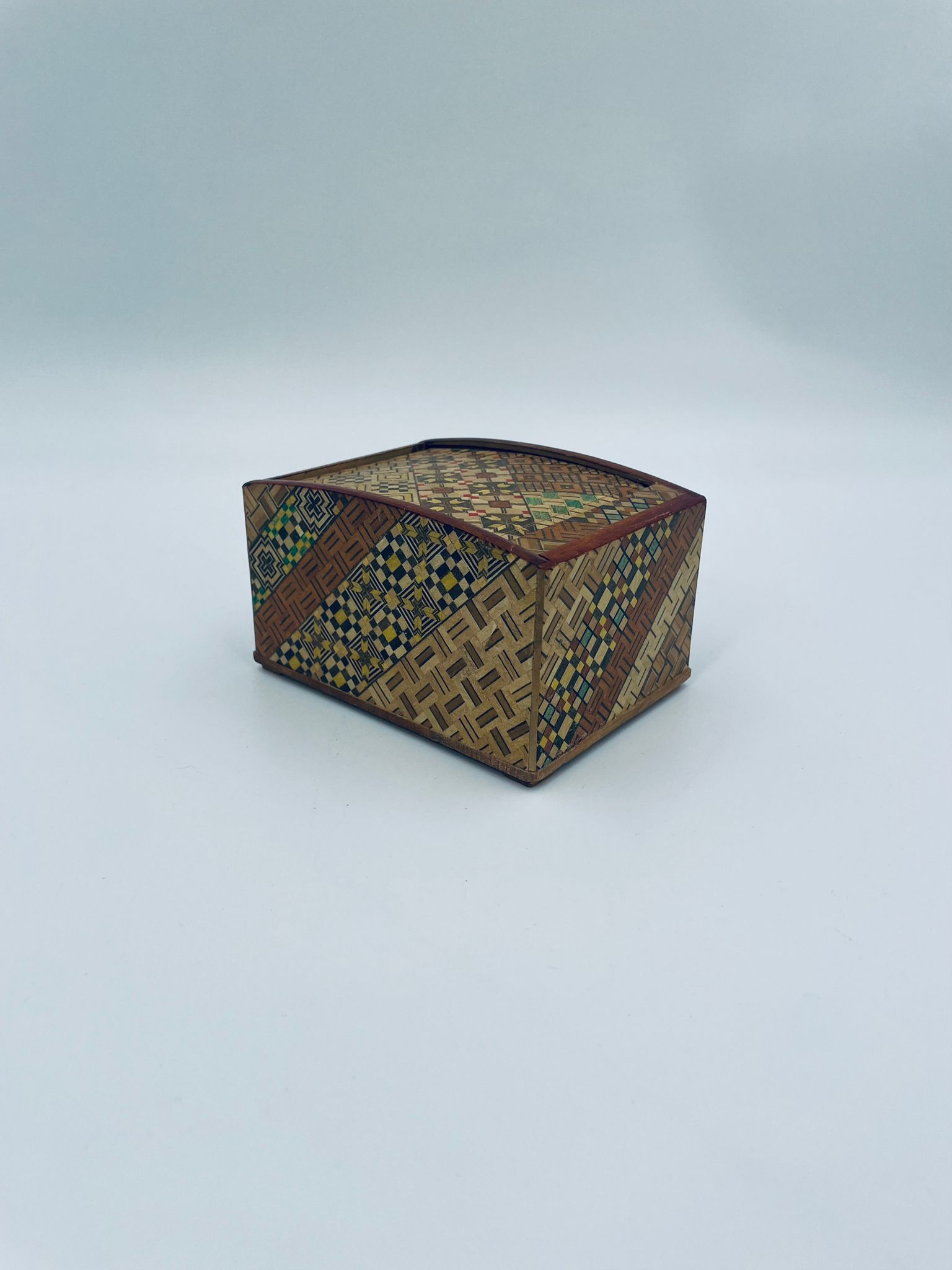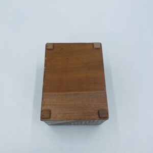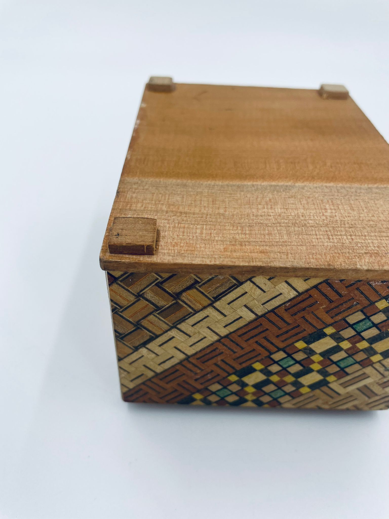 Zabytkowa szkatułka Japońska , pudełko zagadka pochodzące z Hakone, Himitsu-bako w stylu Hakone Yosegi, wykonane z drewna z tradycyjną japońską mozaiką zwaną Yosegi. Szkatułka we wzorach geometrycznych, które powstają z połączenia różnych rodzajów naturalnie barwionych gatunków drewna. Otwieranie szuflady powoduje również otwarcie jej górnej pokrywy. Otwieranie i zamykanie szuflady sygnalizowane jest dźwiękiem. Posiada małe przetarcie na uchwycie.