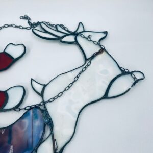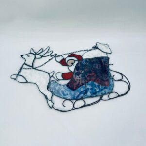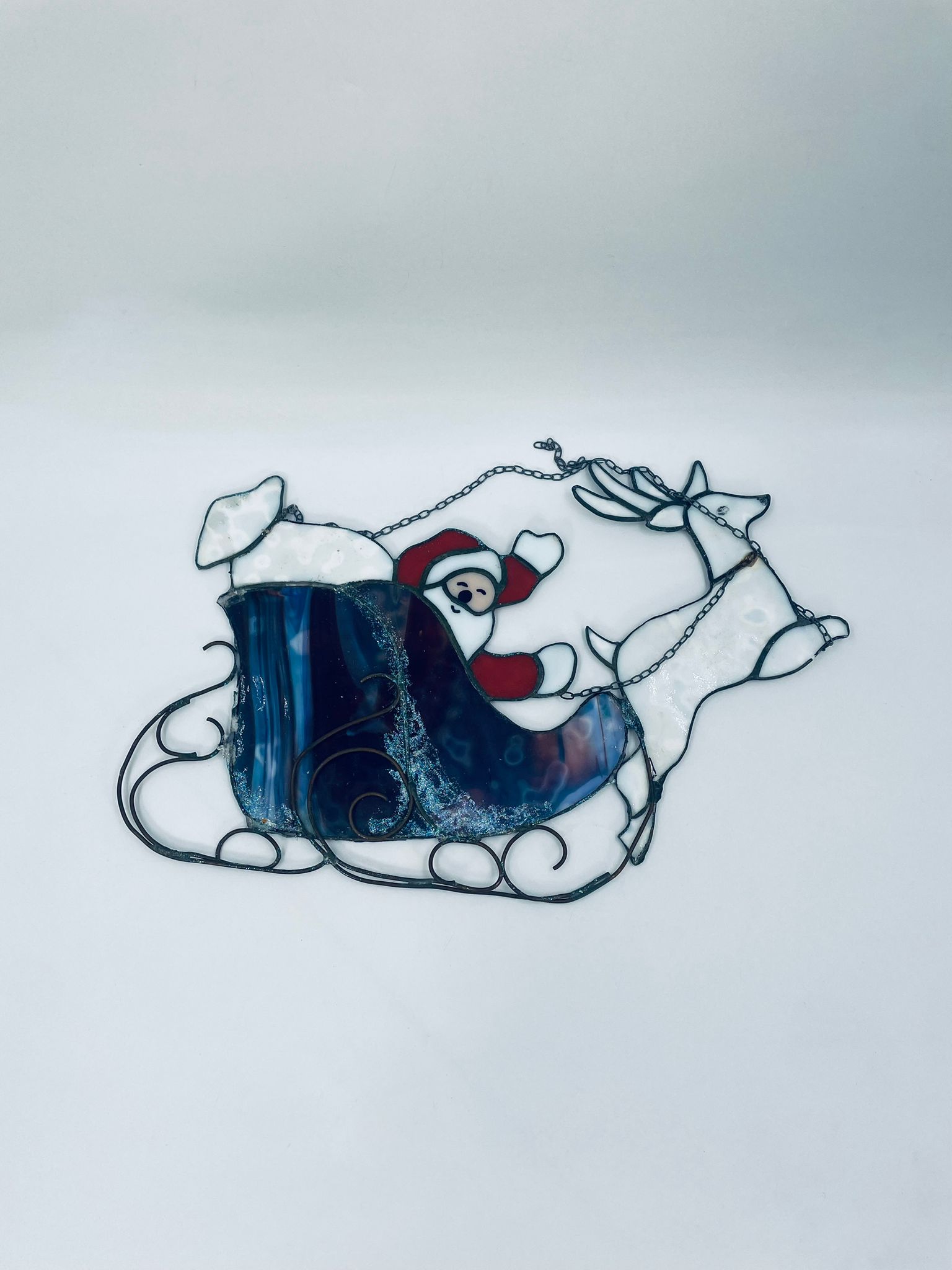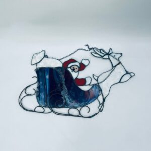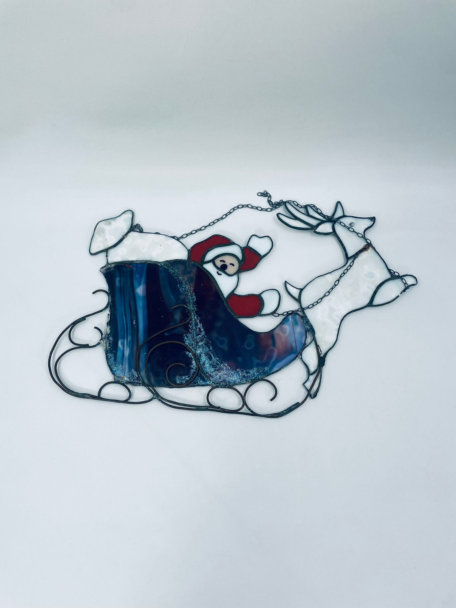 Zawieszka dekoracyjna w stylu Vintage, wykonana z kolorowego szkła, połączonego metalowym elementem, co nadaje jej charakterystycznego wyglądu witrażu. Witraż przedstawia Świętego Mikołaja w saniach ciągniętych przez renifera.
