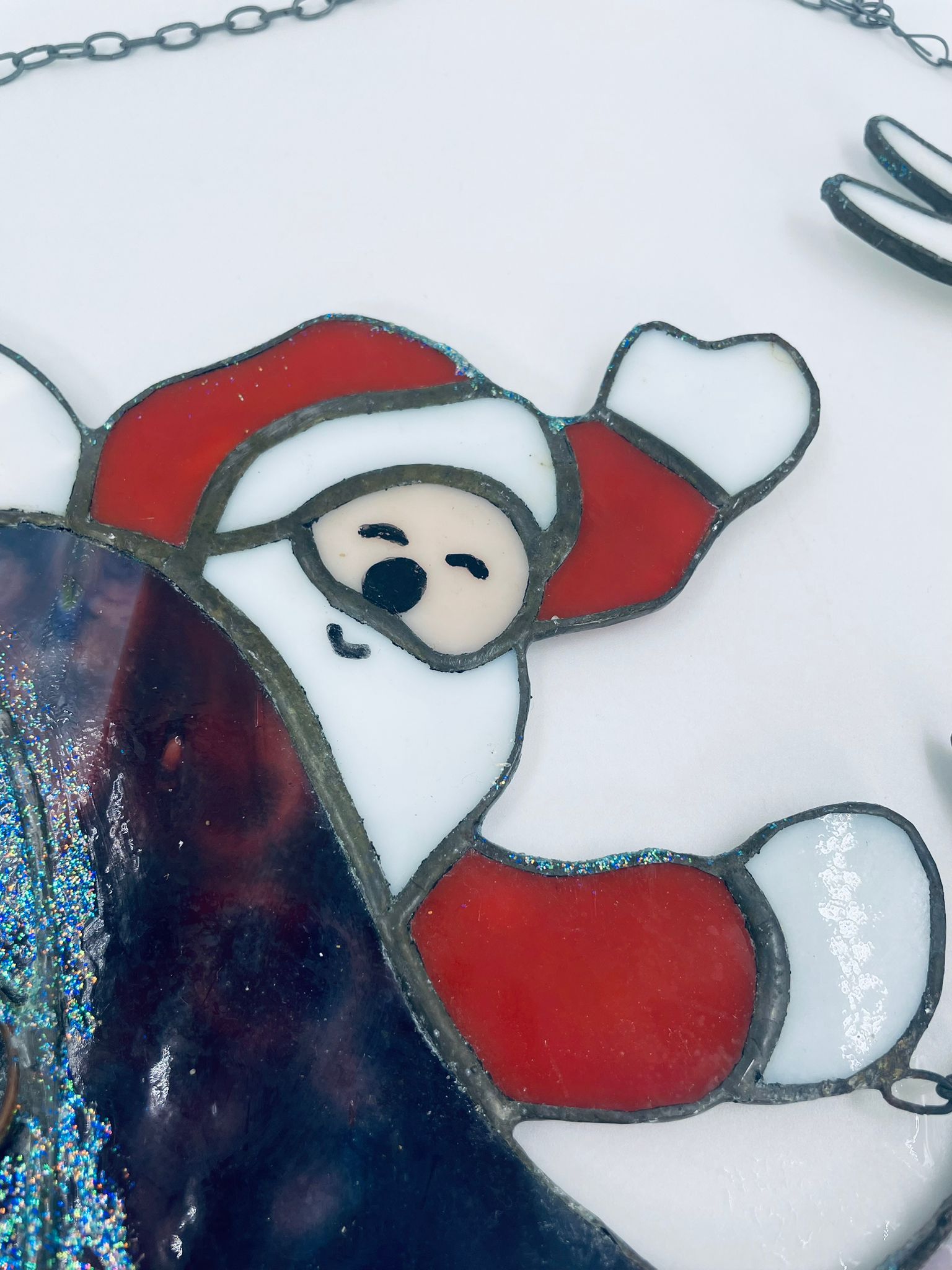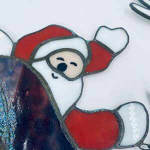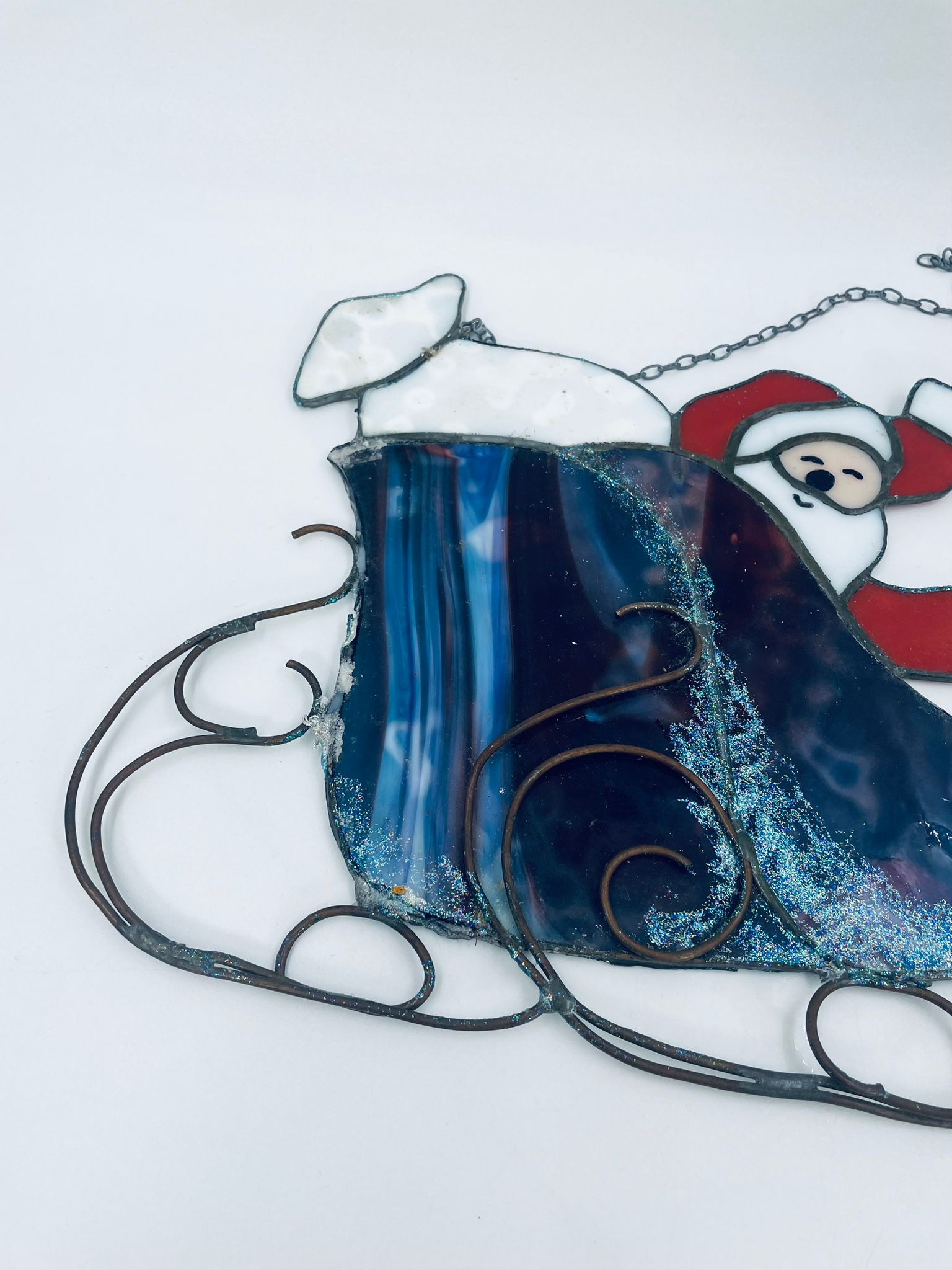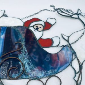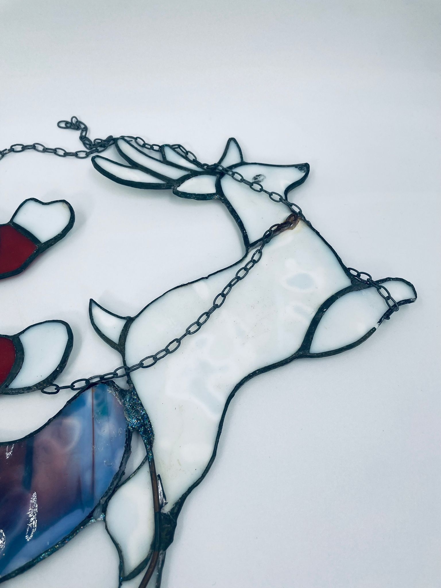 Zawieszka dekoracyjna w stylu Vintage, wykonana z kolorowego szkła, połączonego metalowym elementem, co nadaje jej charakterystycznego wyglądu witrażu. Witraż przedstawia Świętego Mikołaja w saniach ciągniętych przez renifera.