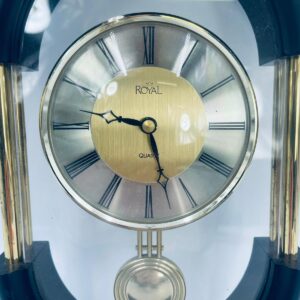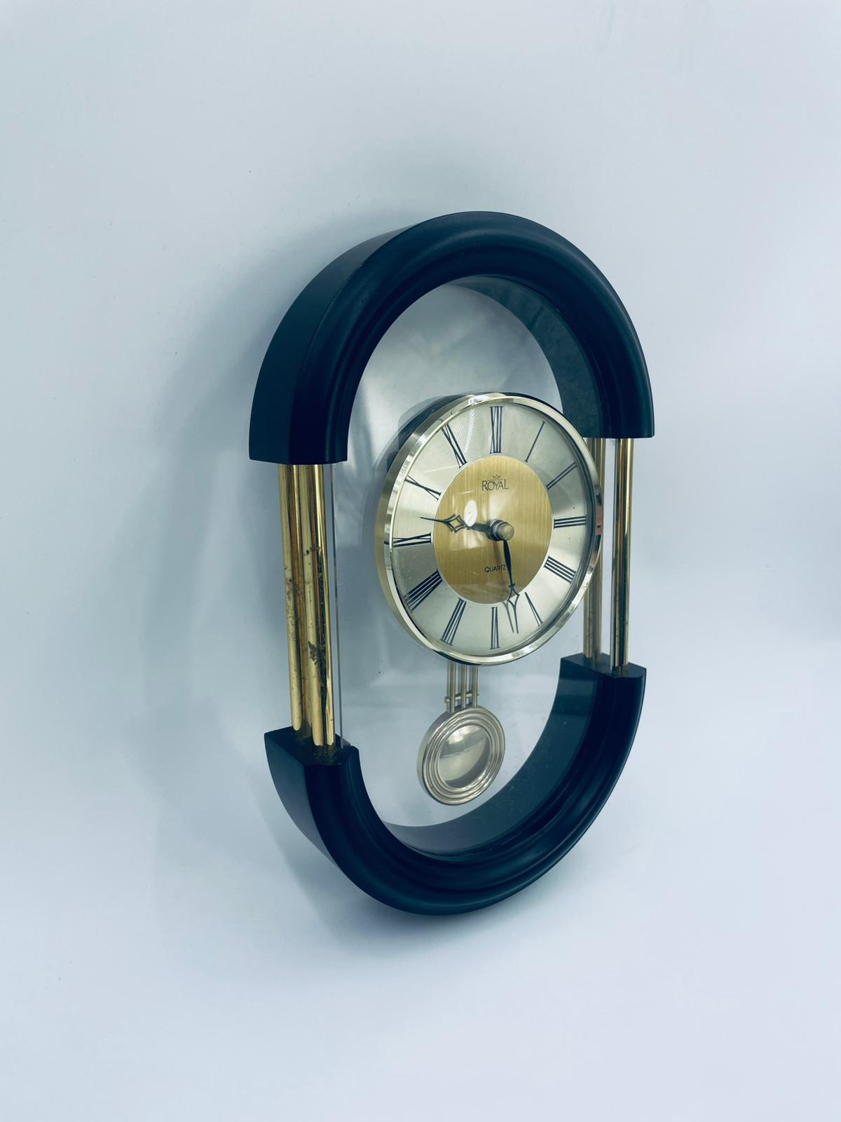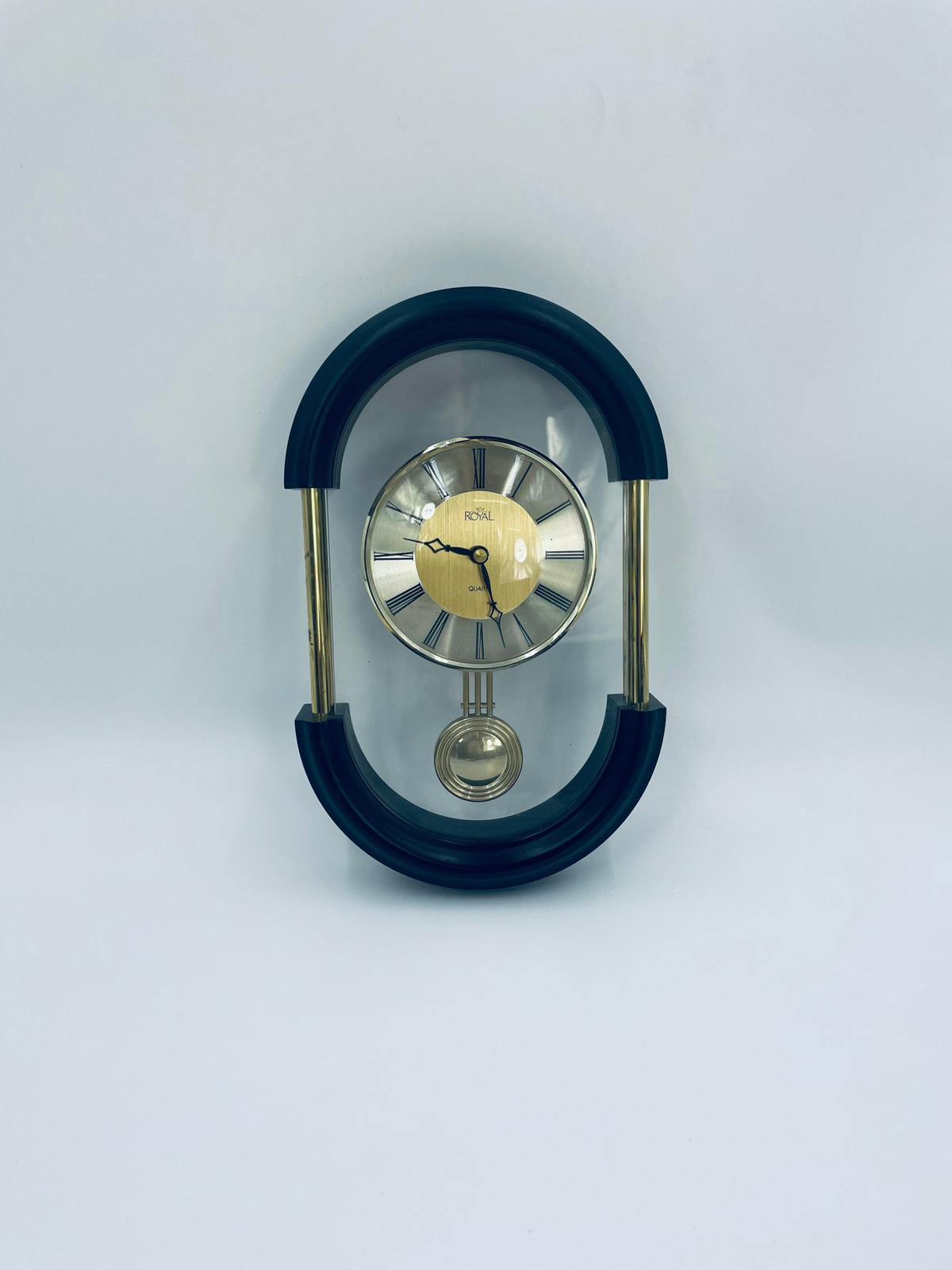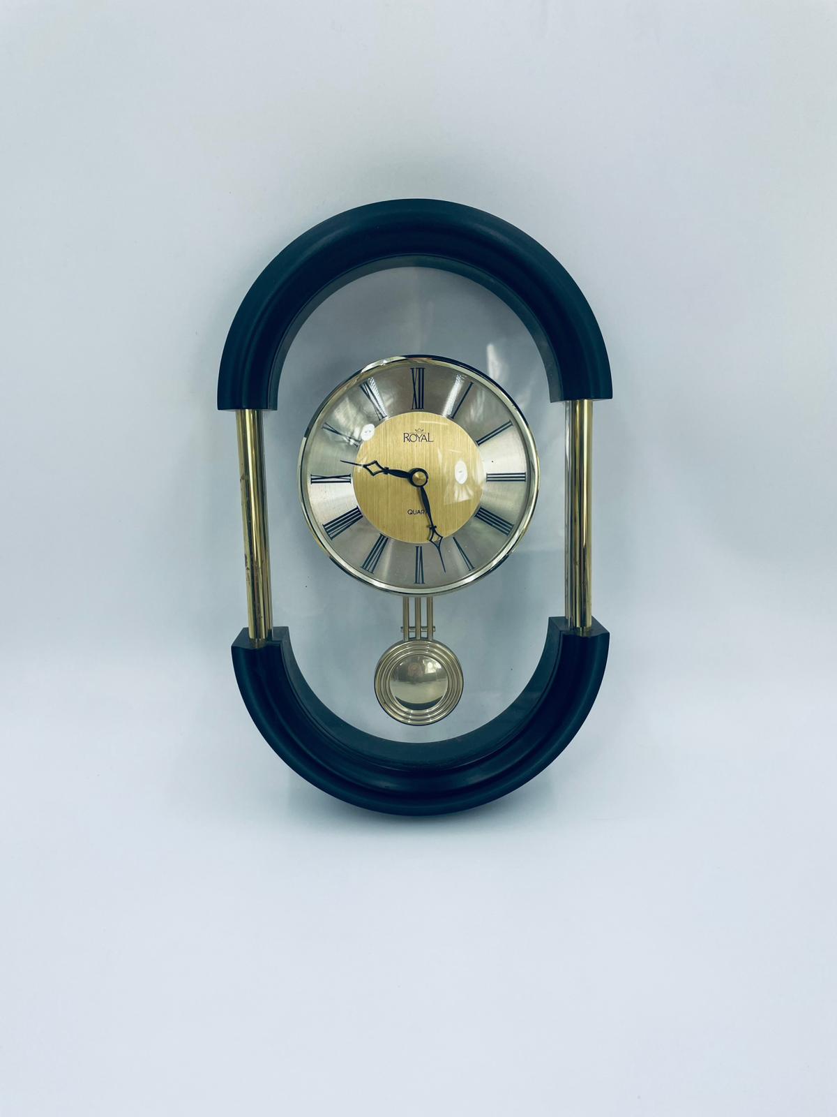 Zegar kolekcjonerski, ścienny, wahadłowy wytwórni Royal Quartz. Zegar w owalnej, drewnianej, czarnej obudowie ze złotymi detalami. Wyposażony jest w precyzyjny mechanizm kwarcowy (na baterie), tarcze w złotym kolorze z rzymskimi cyframi oraz złote wahadło. Posiada przetarcie na złoceniu.