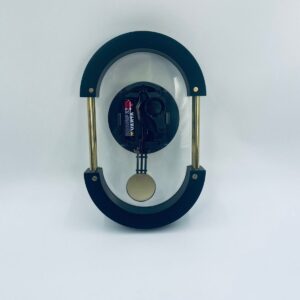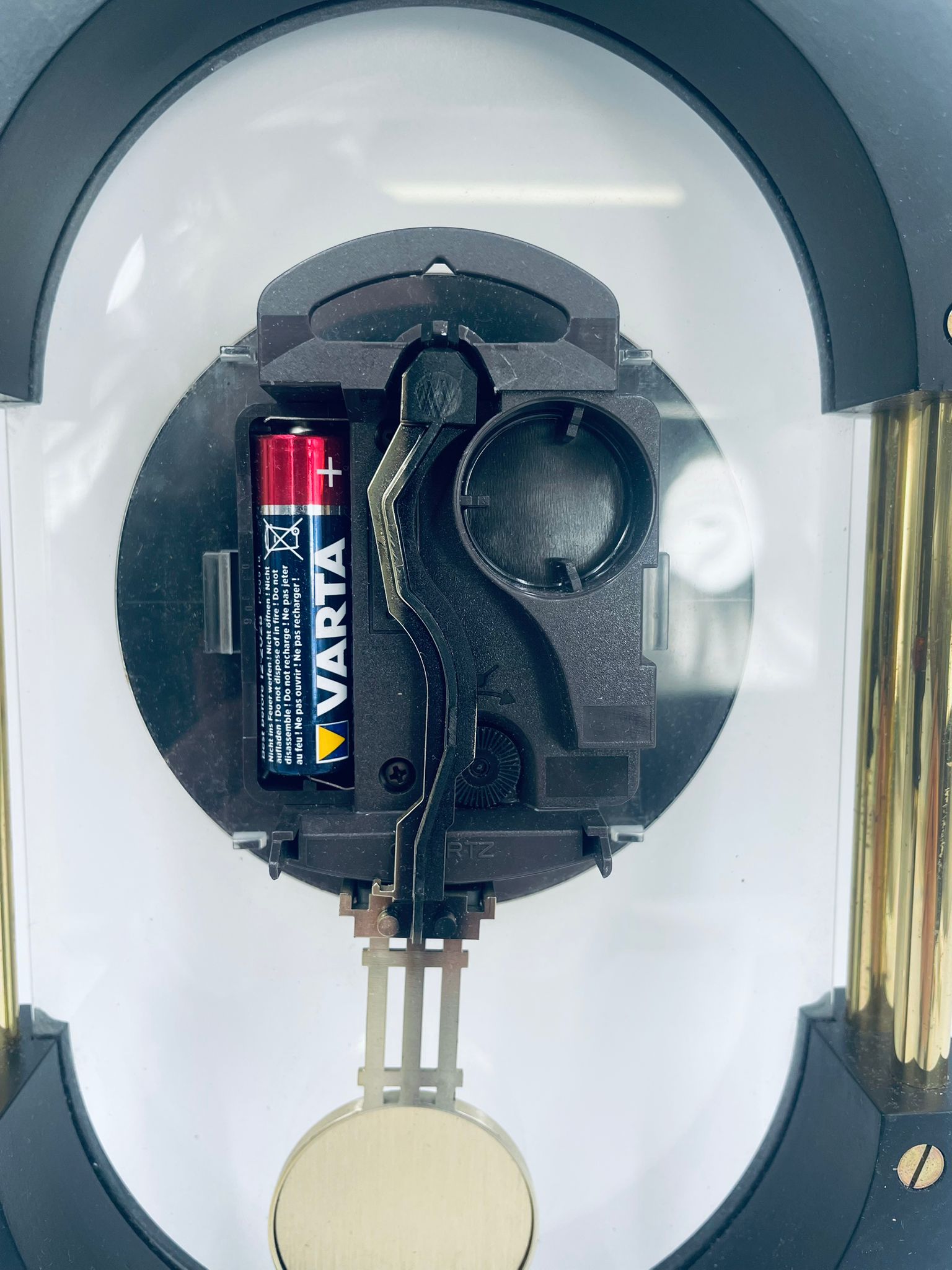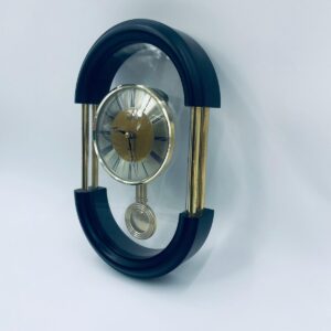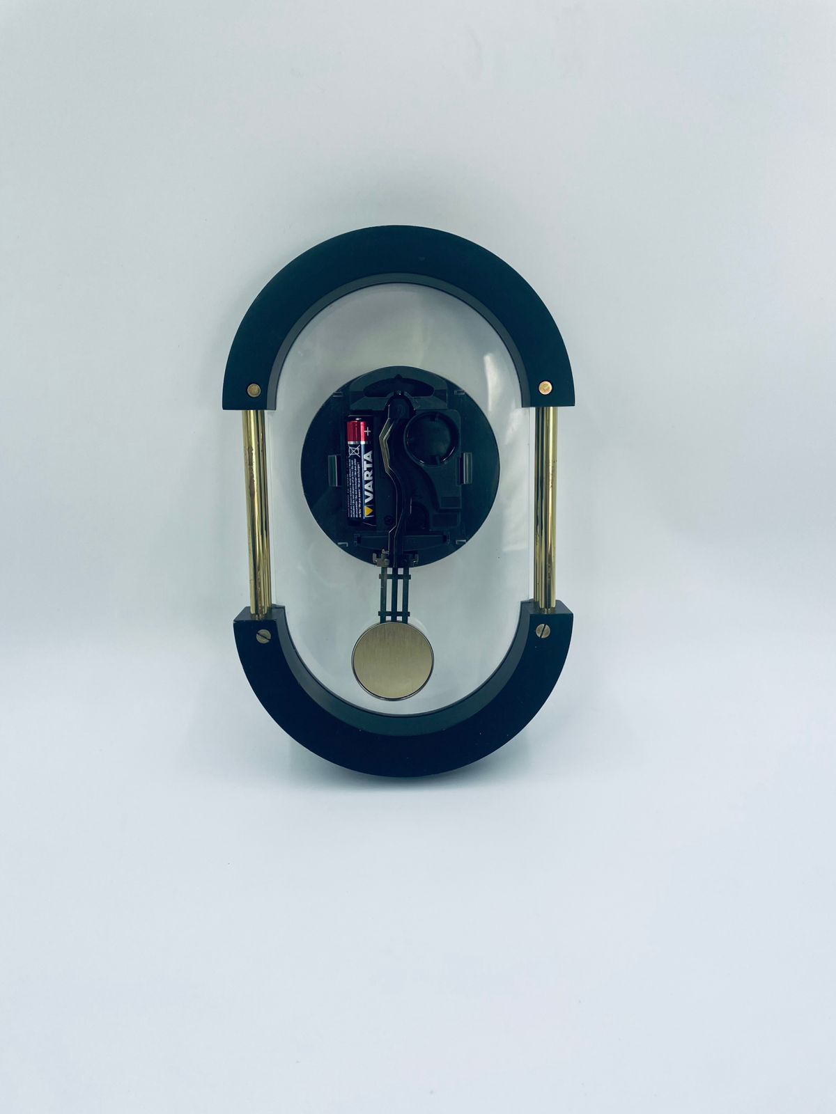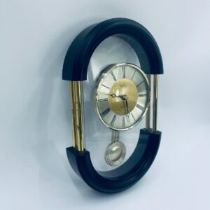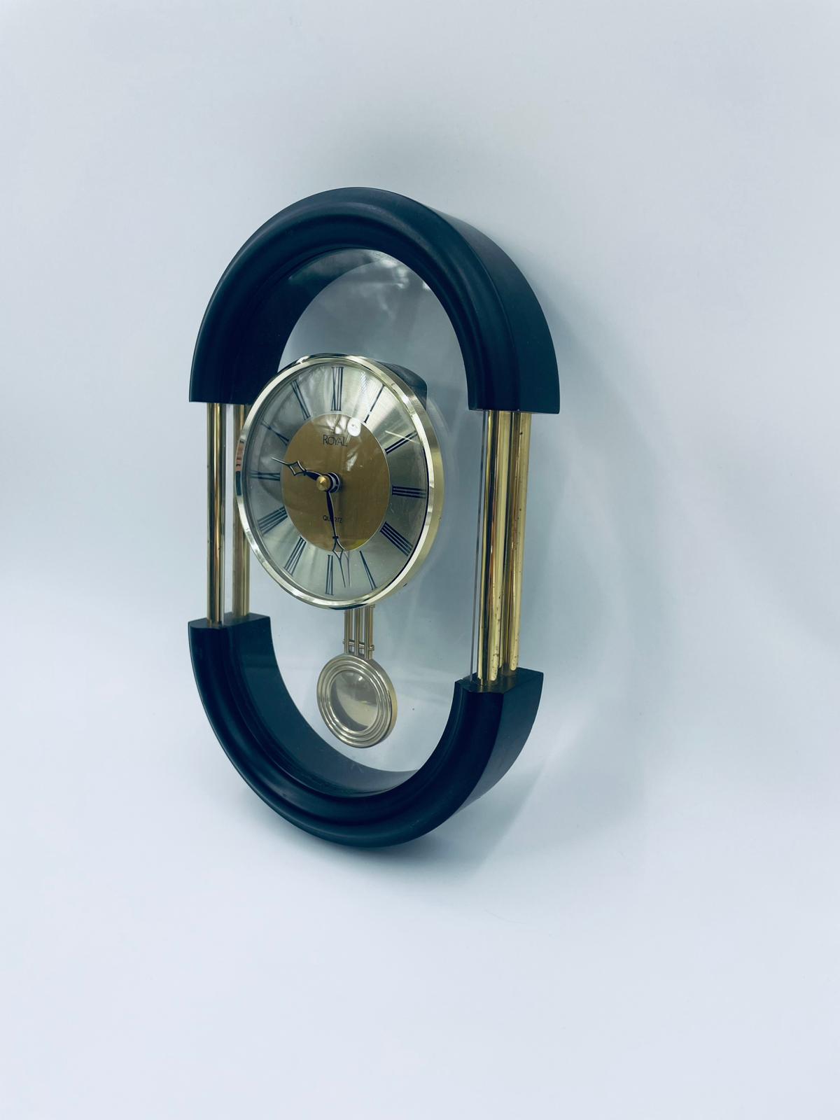 Zegar kolekcjonerski, ścienny, wahadłowy wytwórni Royal Quartz. Zegar w owalnej, drewnianej, czarnej obudowie ze złotymi detalami. Wyposażony jest w precyzyjny mechanizm kwarcowy (na baterie), tarcze w złotym kolorze z rzymskimi cyframi oraz złote wahadło. Posiada przetarcie na złoceniu.