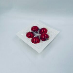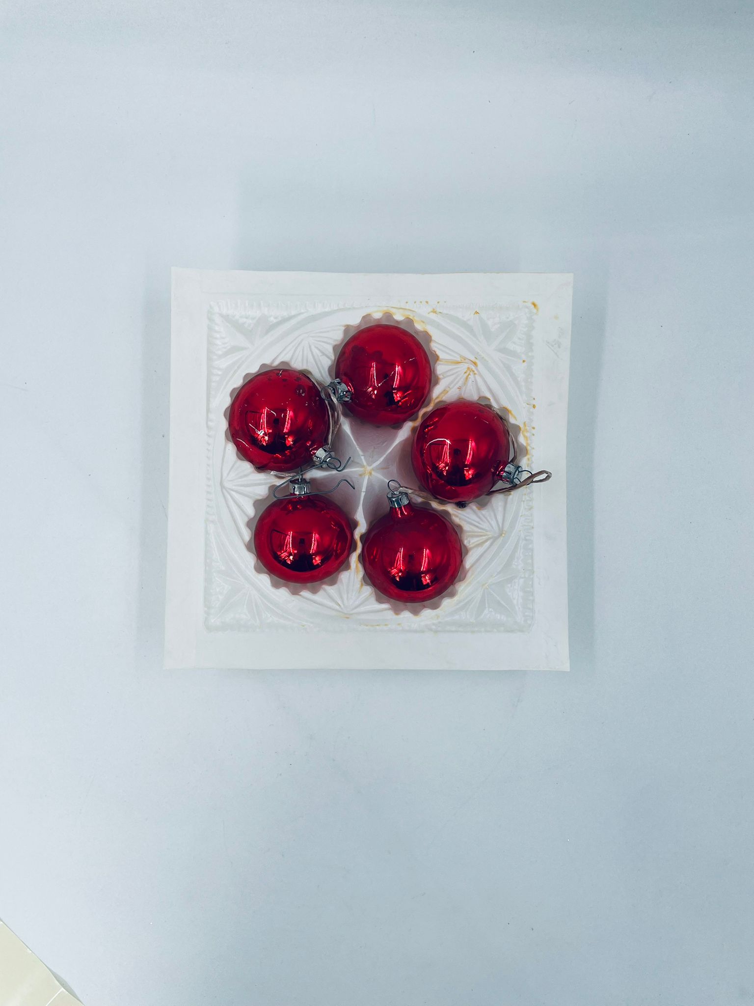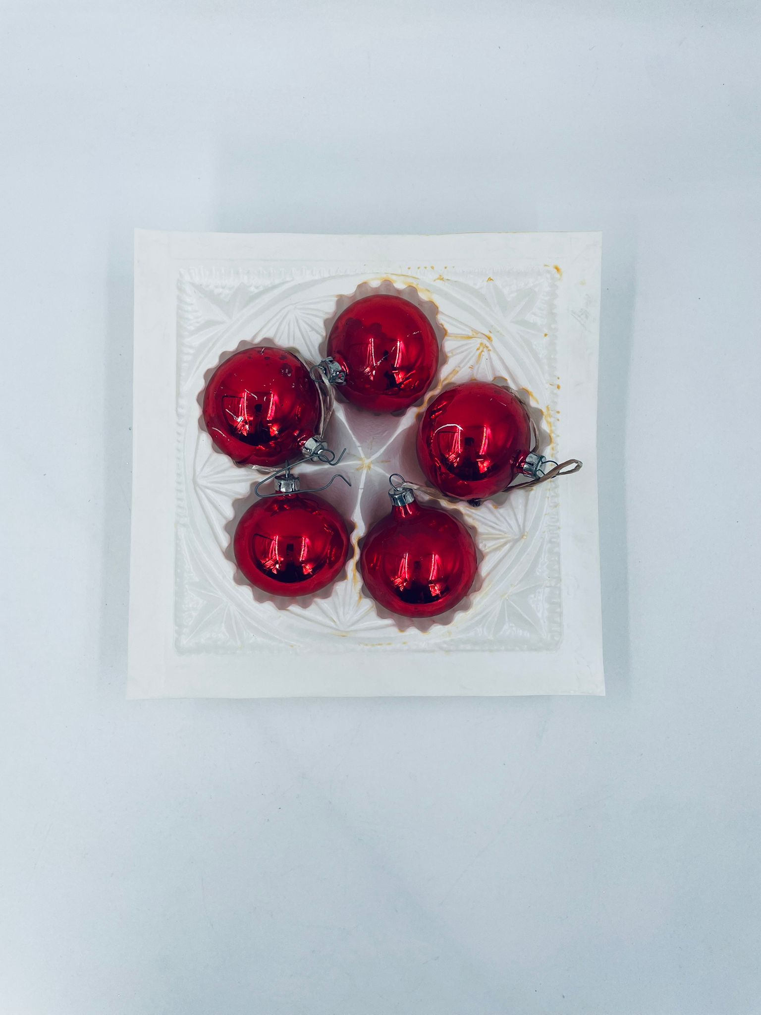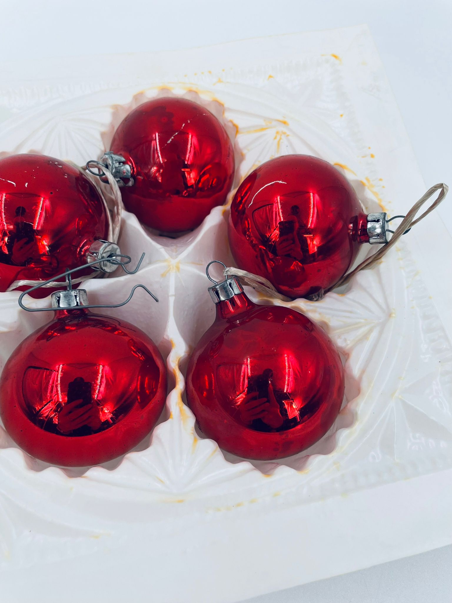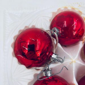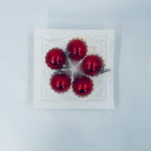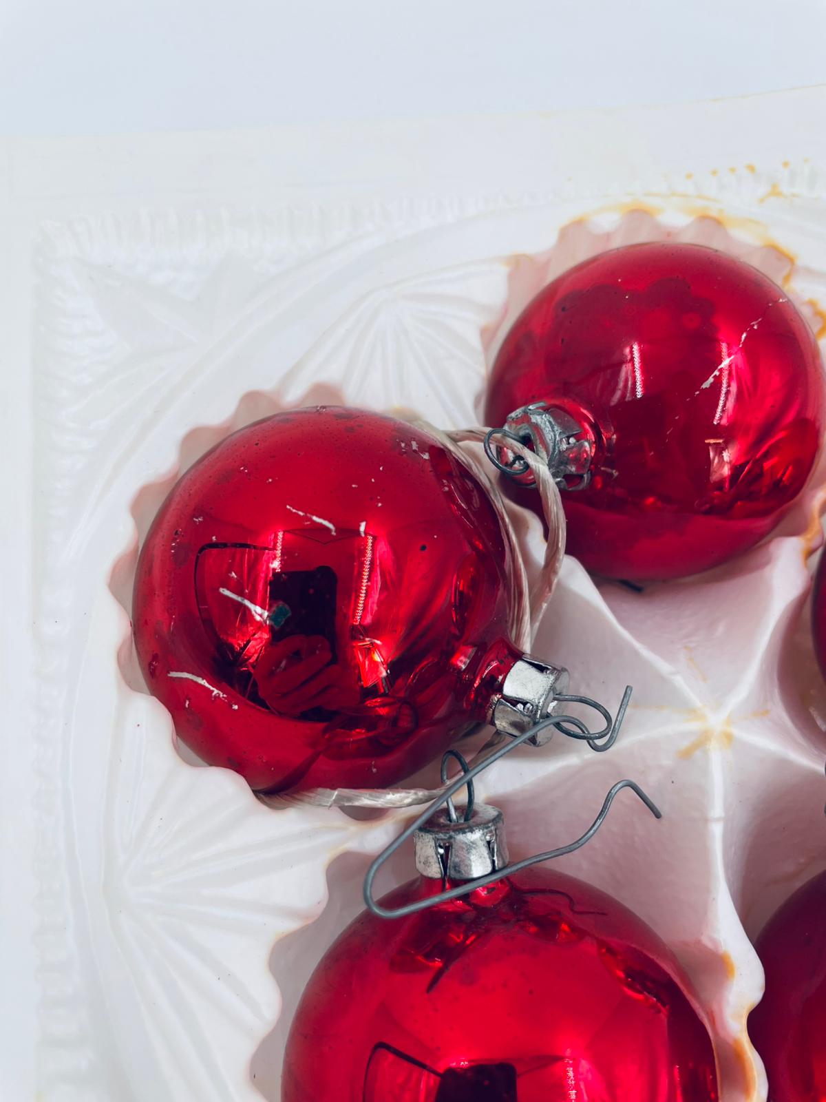 Zestaw zabytkowych bombek na choinkę w stylu Vintage, wykonanych z ręcznie dmuchanego szkła. Bombki barwione na kolor czerwony. Drobne zarysowania.