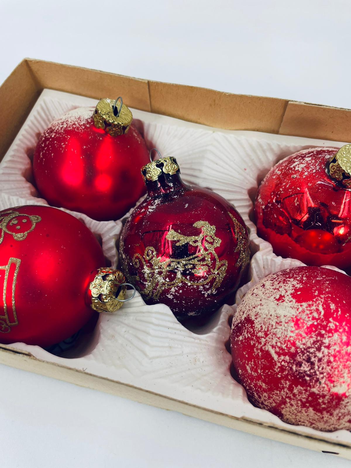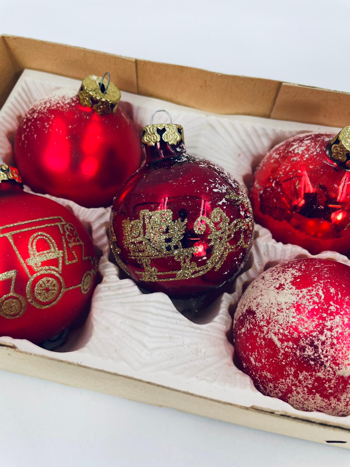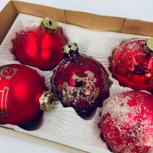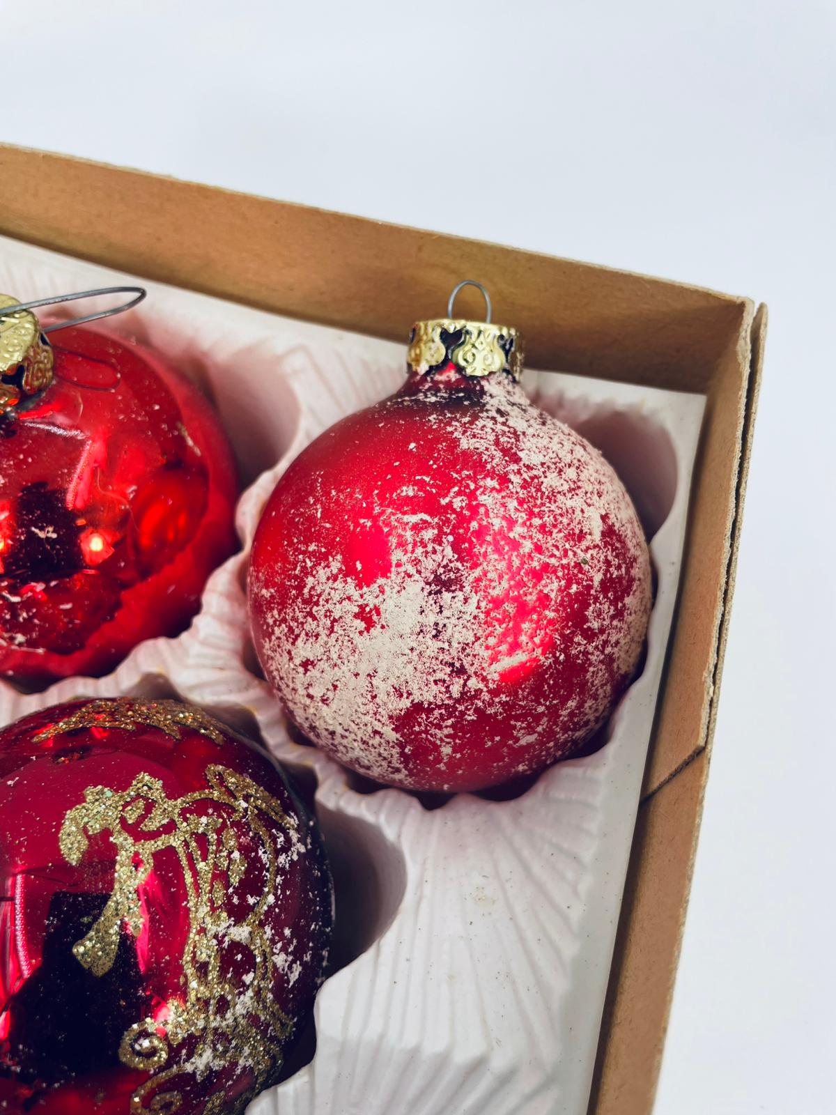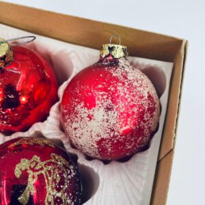 Zestaw zabytkowych bombek na choinkę w stylu Vintage, wykonanych z ręcznie dmuchanego szkła. Bombki barwione na kolor czerwony, ozdobione brokatowym wzorem oraz sztucznym śniegiem.