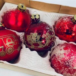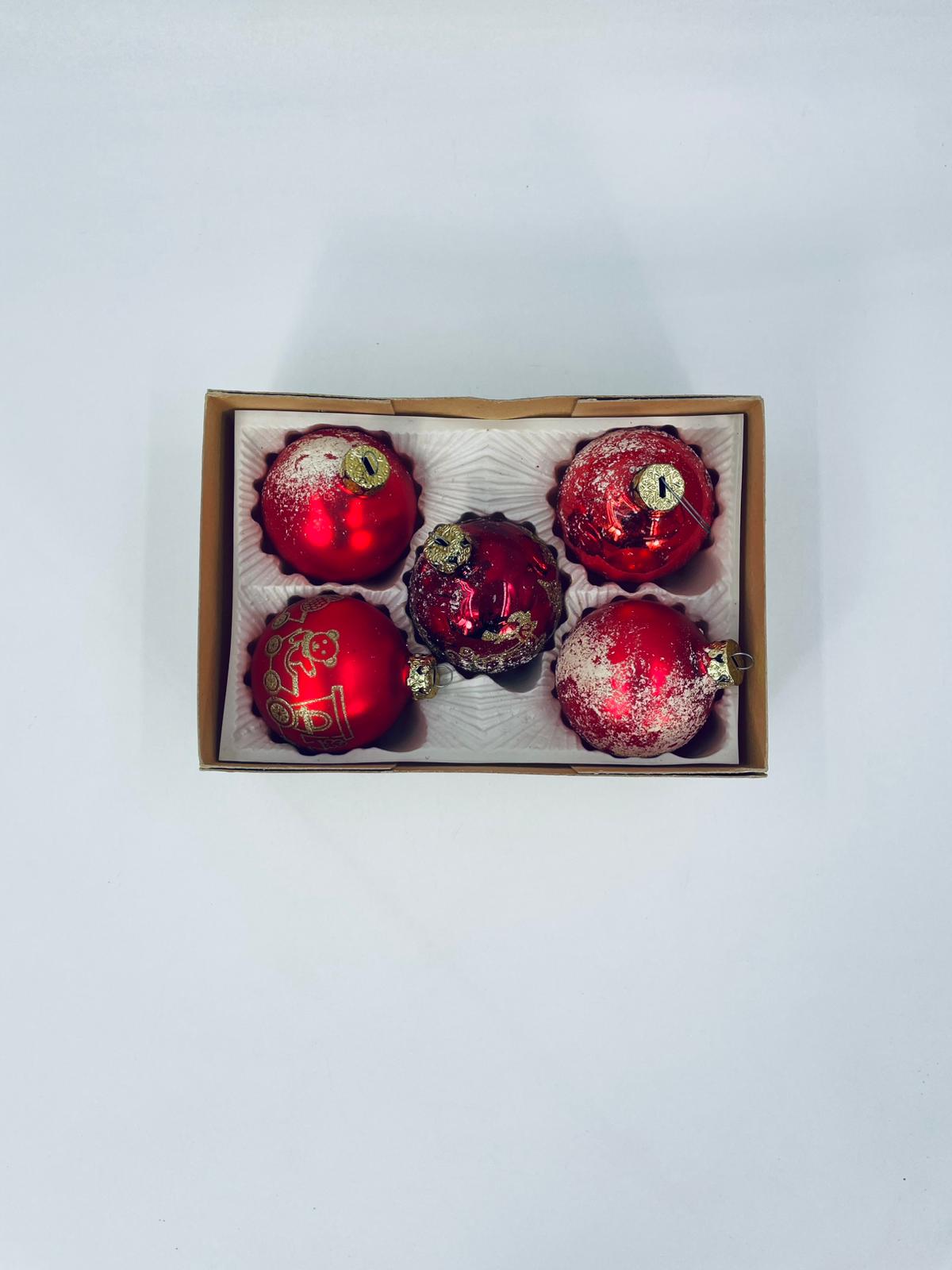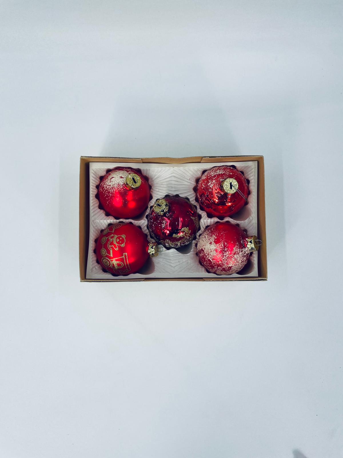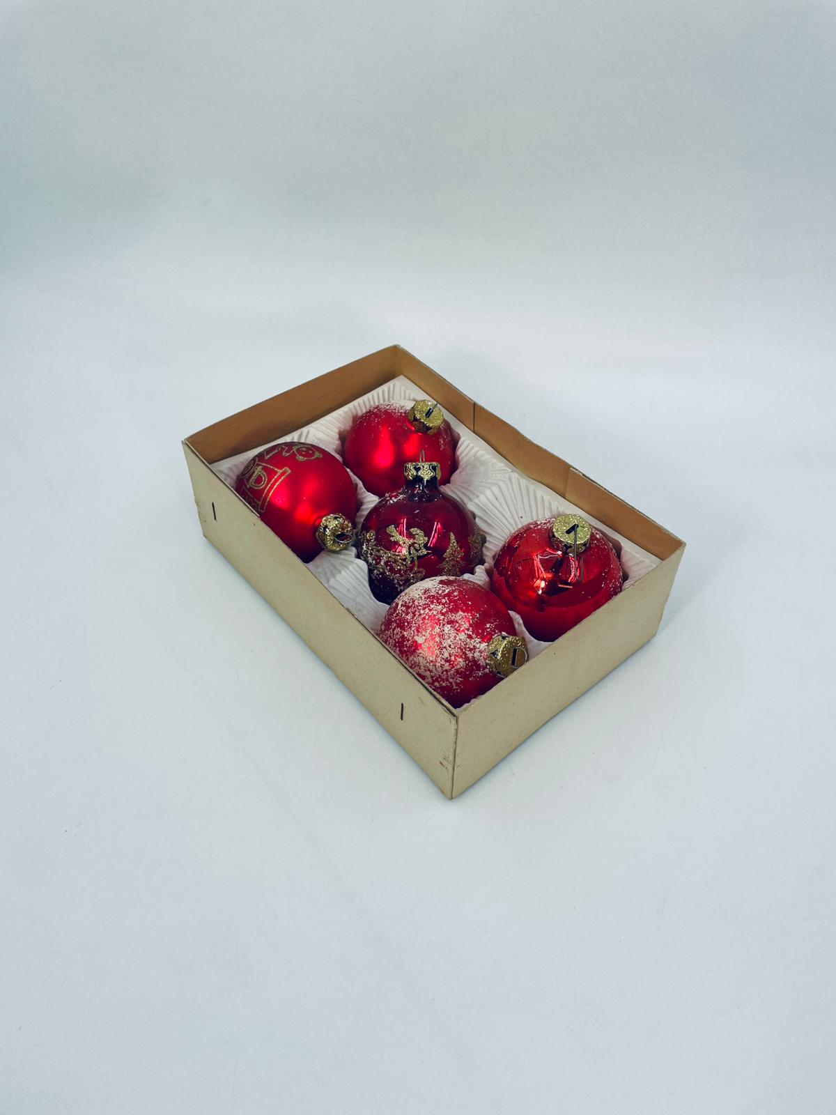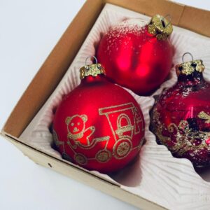 Zestaw zabytkowych bombek na choinkę w stylu Vintage, wykonanych z ręcznie dmuchanego szkła. Bombki barwione na kolor czerwony, ozdobione brokatowym wzorem oraz sztucznym śniegiem.