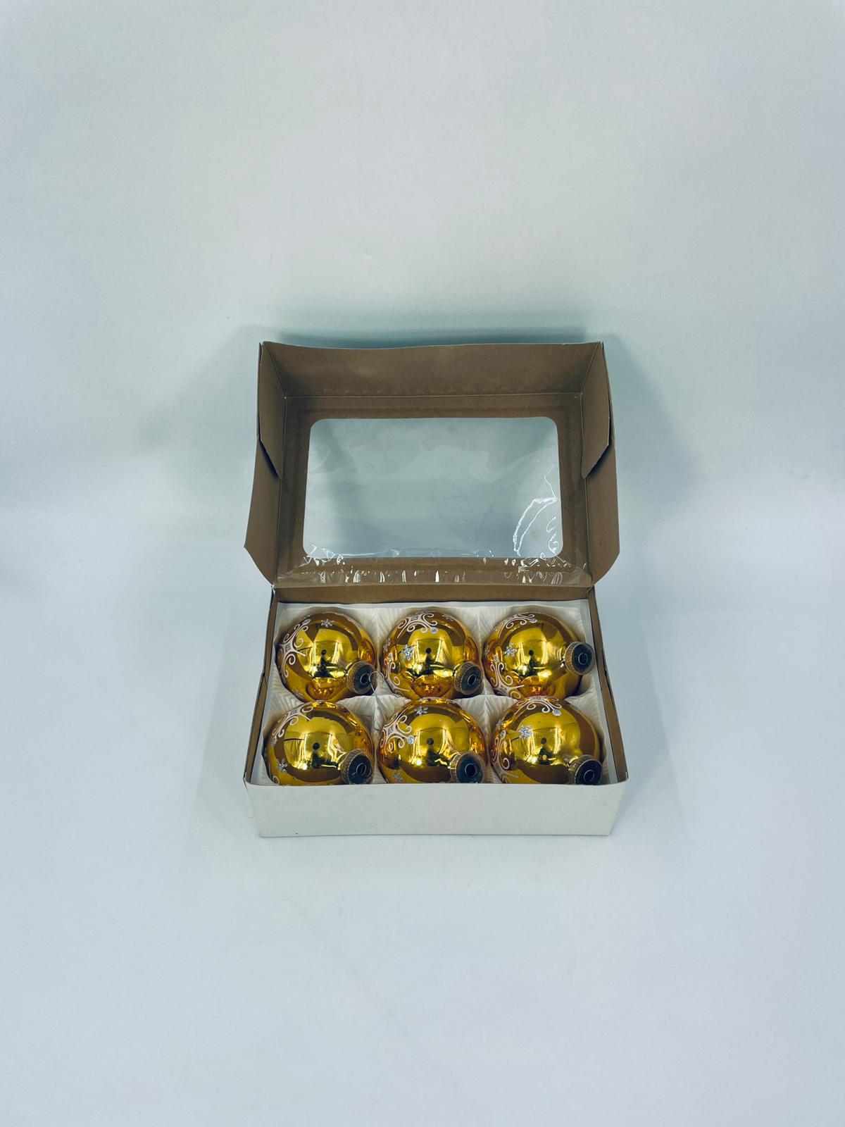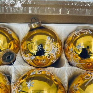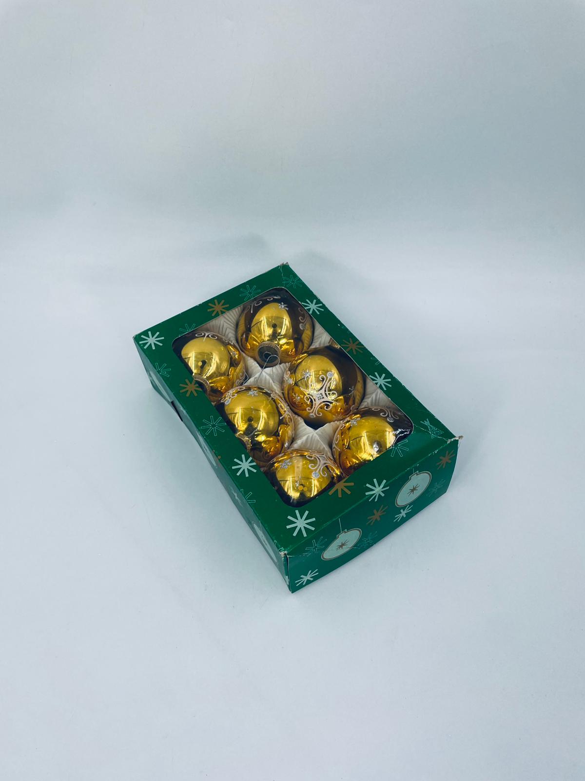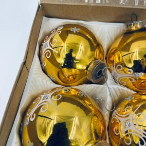 Zestaw zabytkowych bombek na choinkę w stylu Vintage, wykonanych z ręcznie dmuchanego szkła. Bombki barwione na kolor złoty z ozdobnym wzorem.Drobne zarysowania.