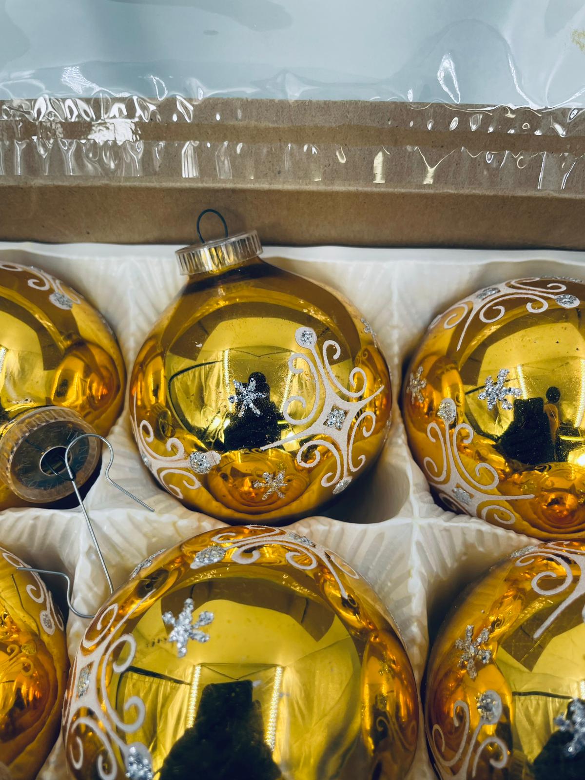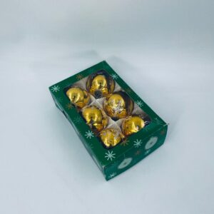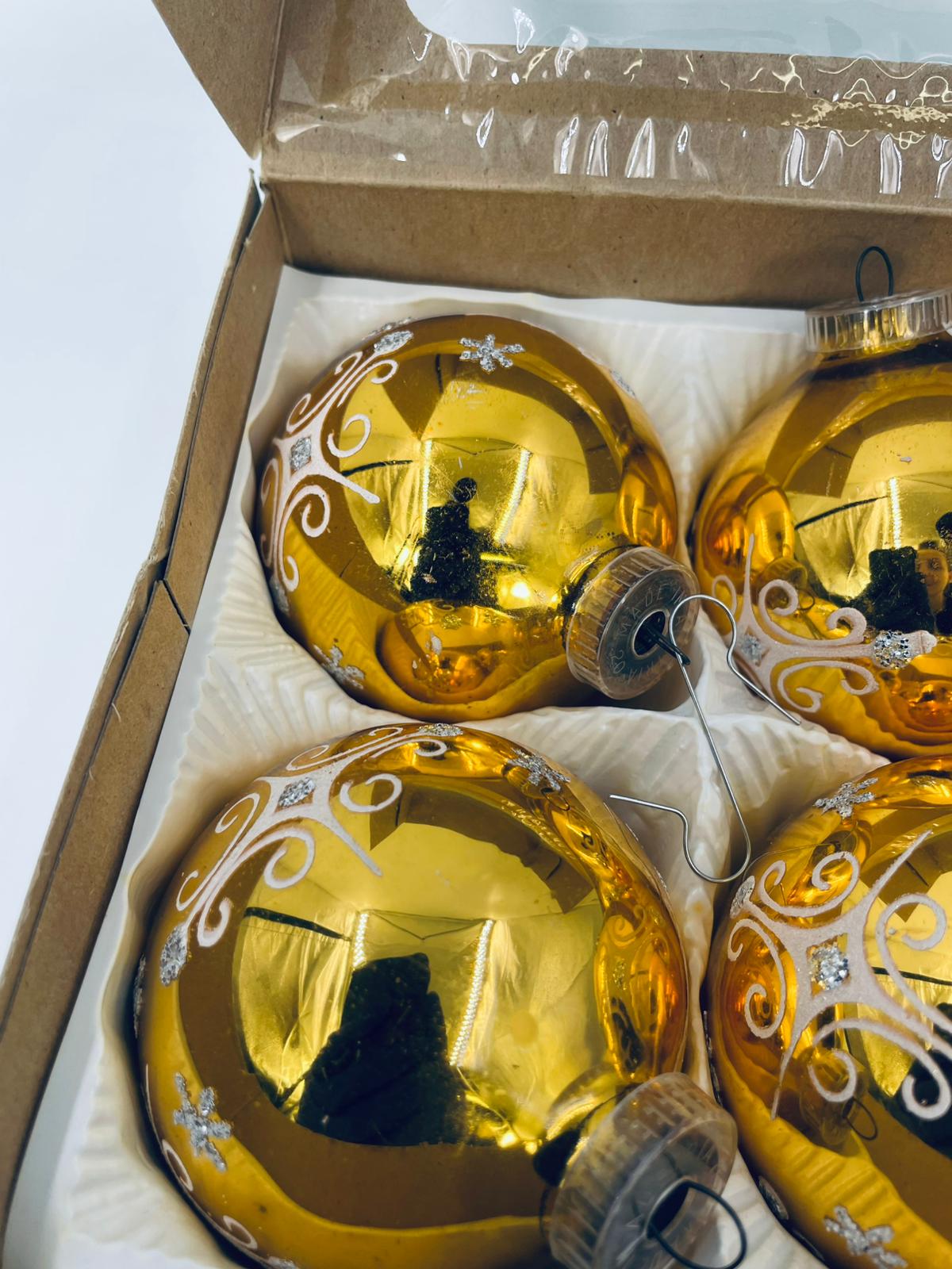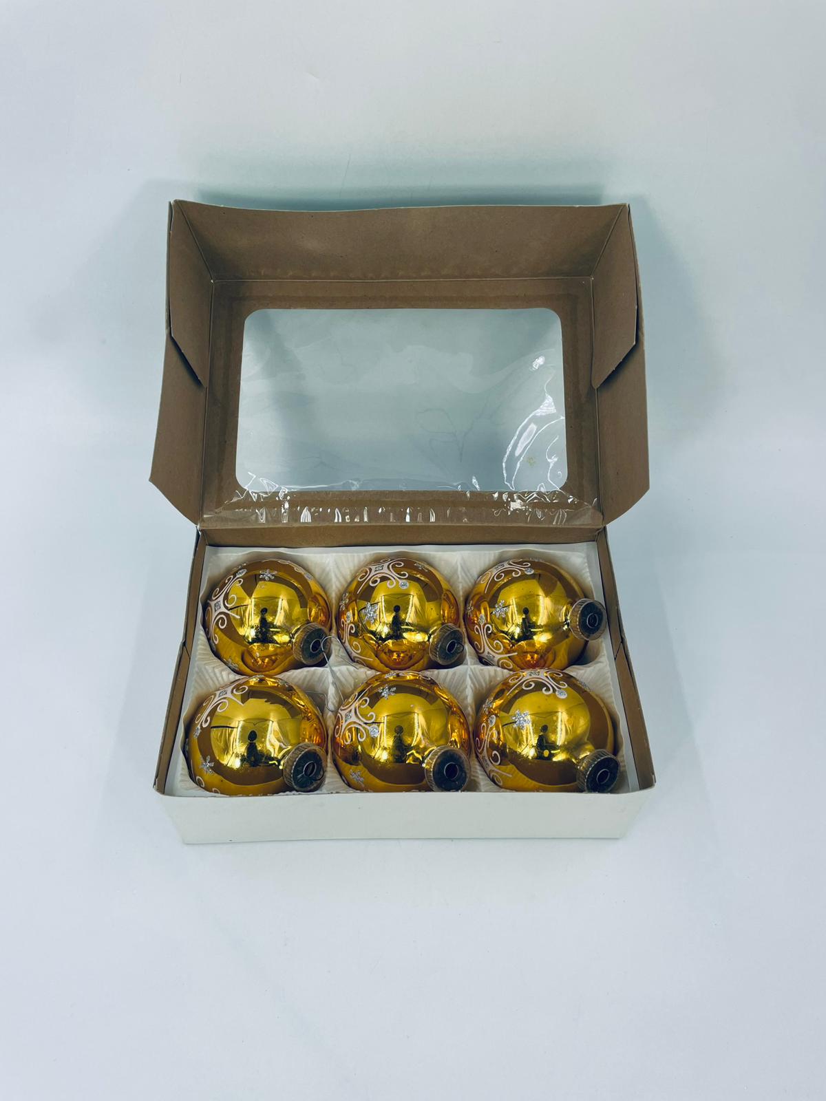 Zestaw zabytkowych bombek na choinkę w stylu Vintage, wykonanych z ręcznie dmuchanego szkła. Bombki barwione na kolor złoty z ozdobnym wzorem.Drobne zarysowania.
