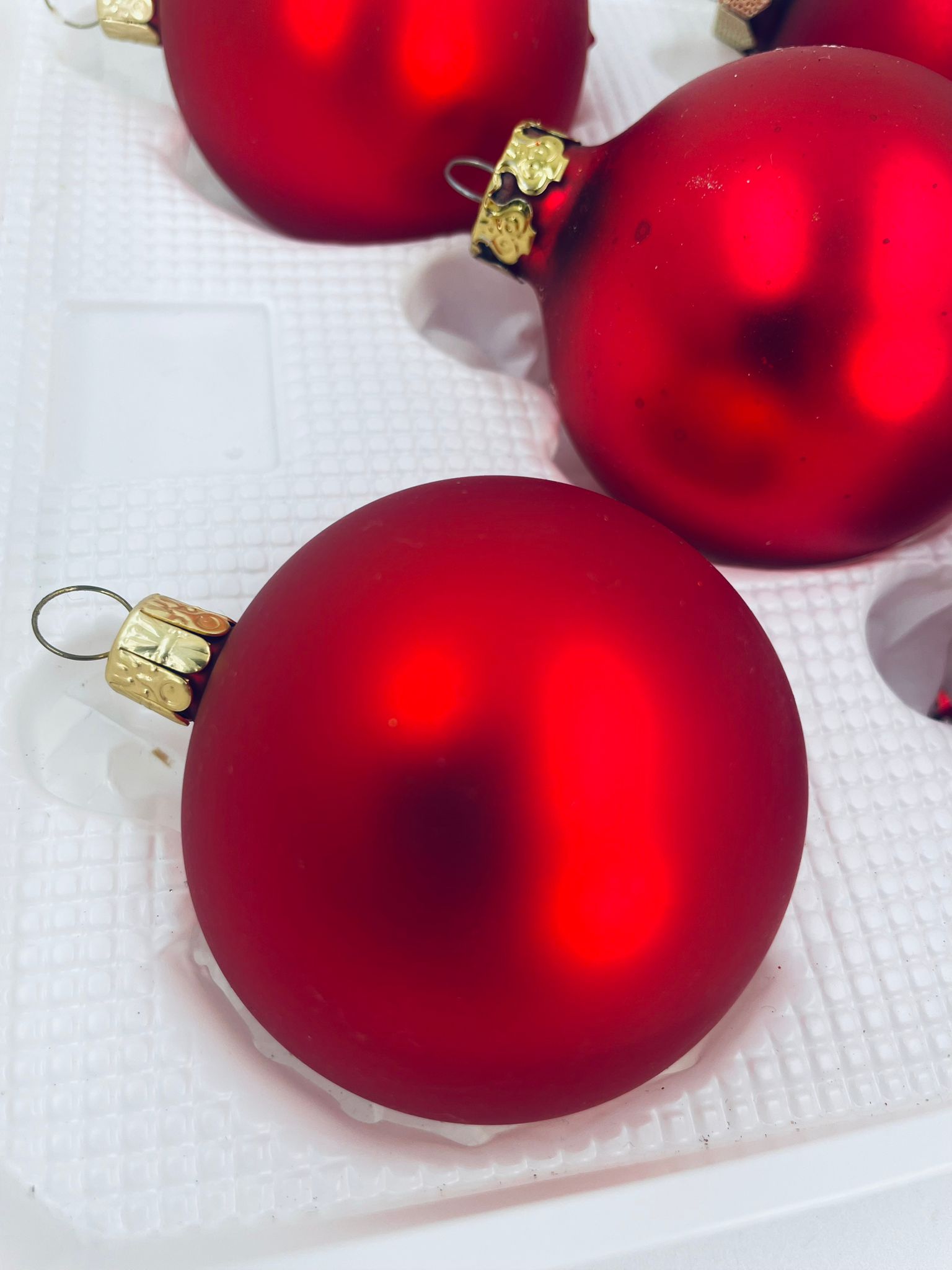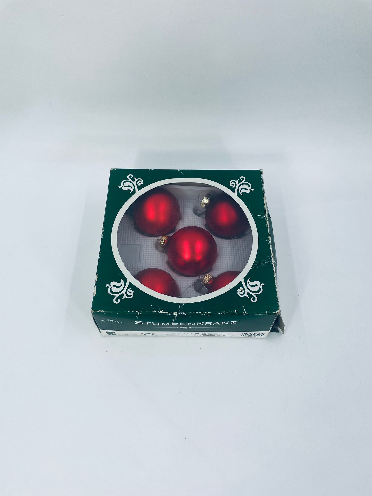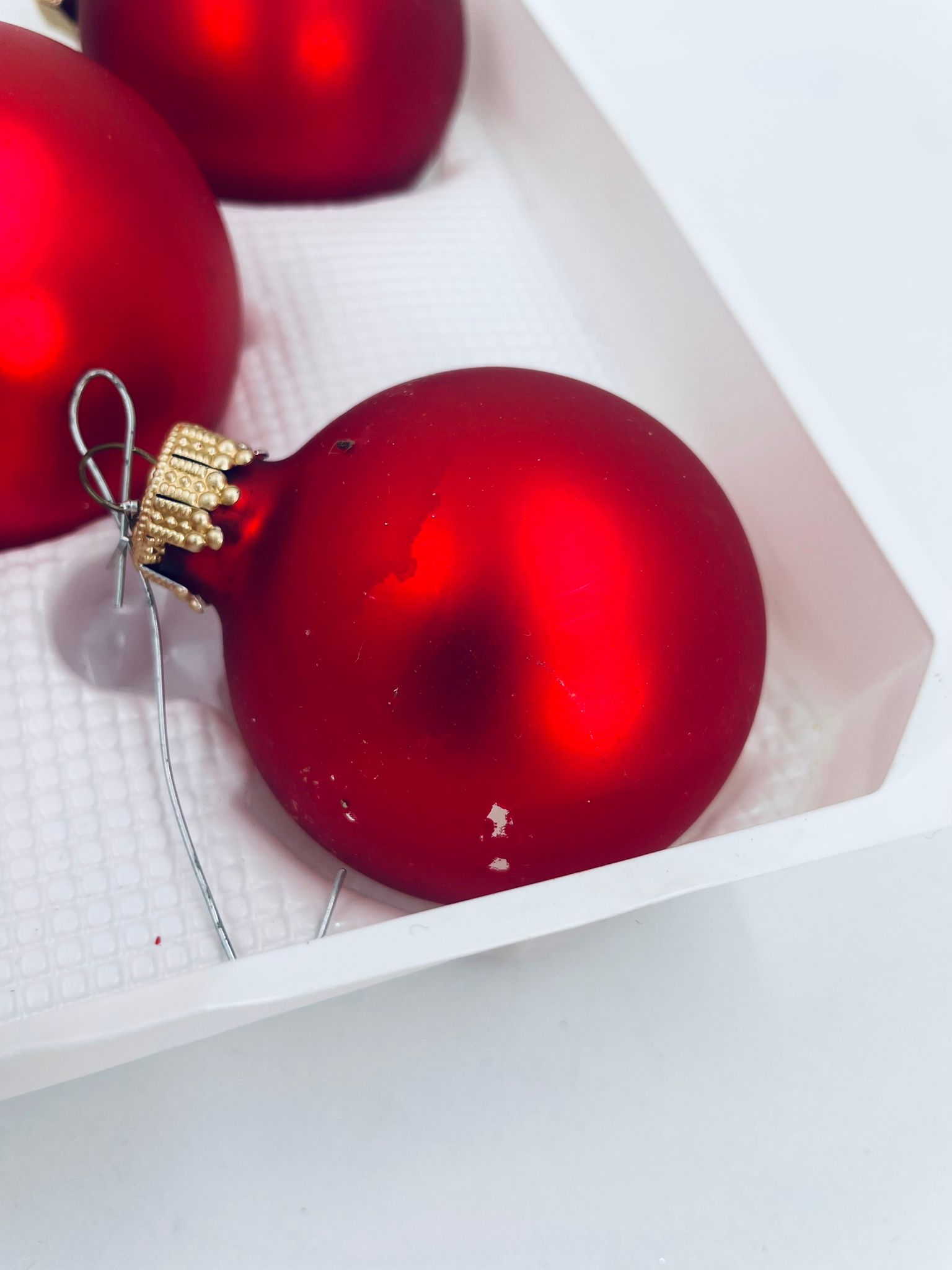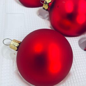 Zestaw różnych zabytkowych bombek na choinkę w stylu Vintage, wykonanych z ręcznie dmuchanego szkła. Bombki barwione na kolor czerwony. Drobne zarysowania.