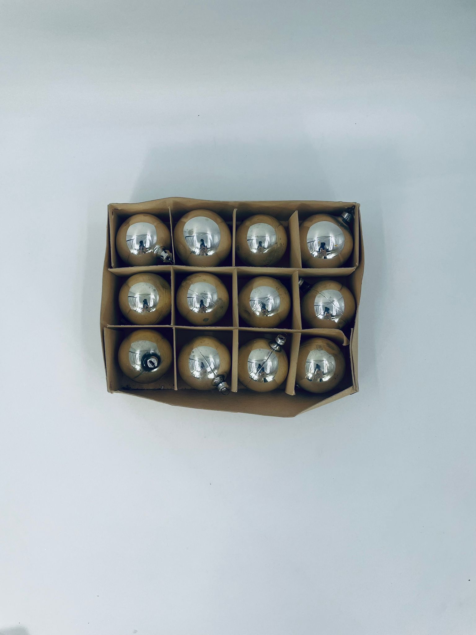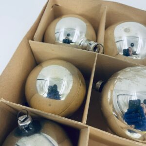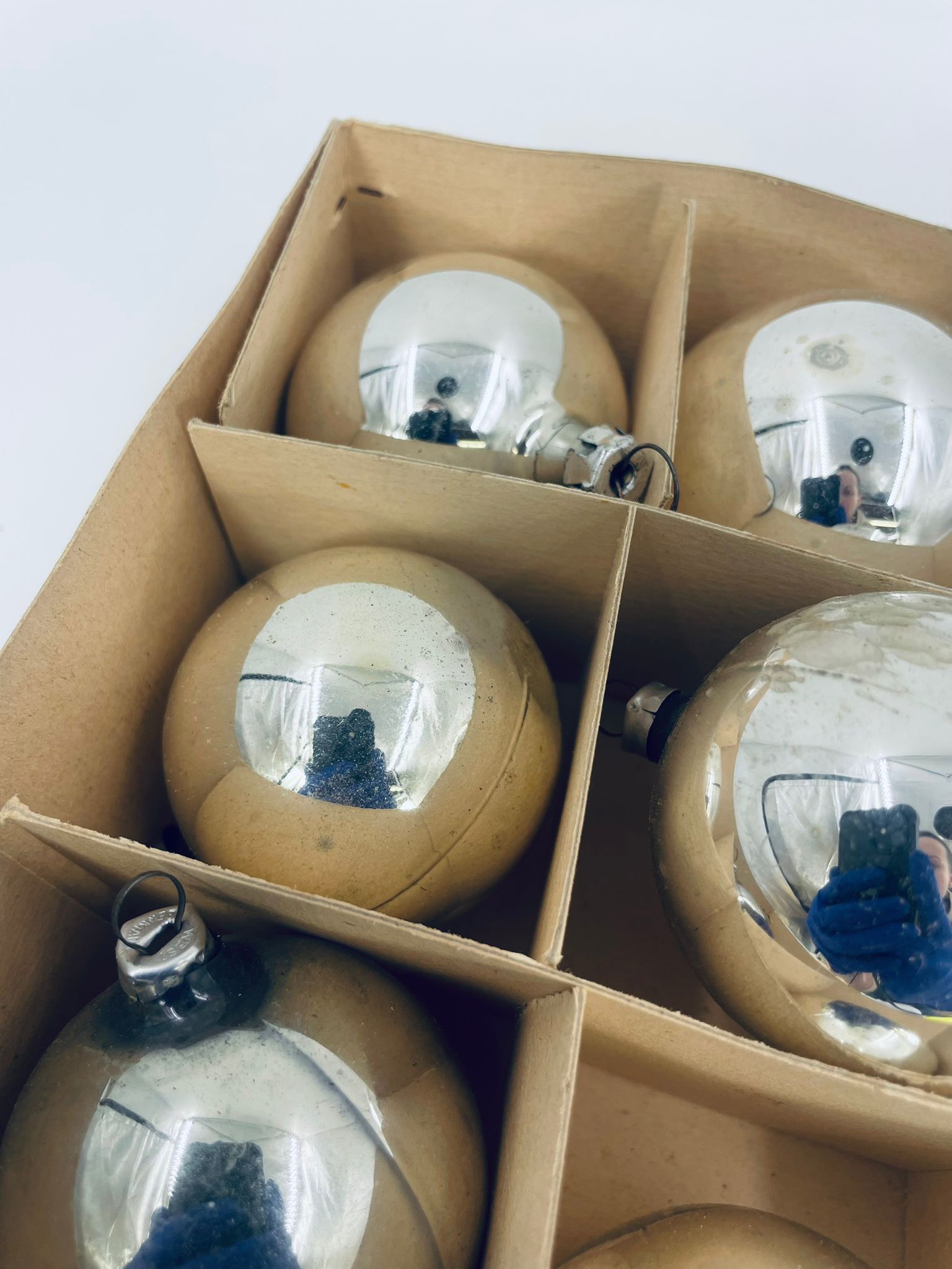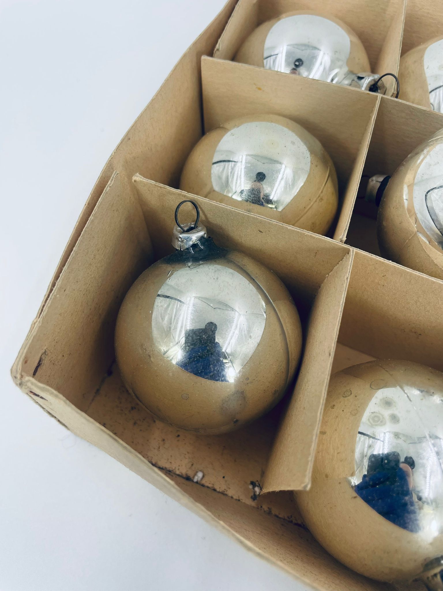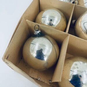 Zestaw zabytkowych bombek na choinkę w stylu Vintage, wykonanych z ręcznie dmuchanego szkła. Bombki barwione na kolor srebrny. Drobne zarysowania.