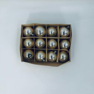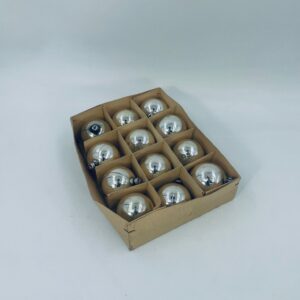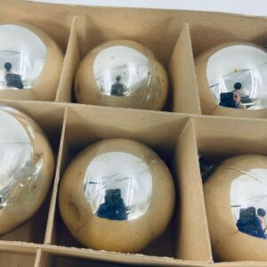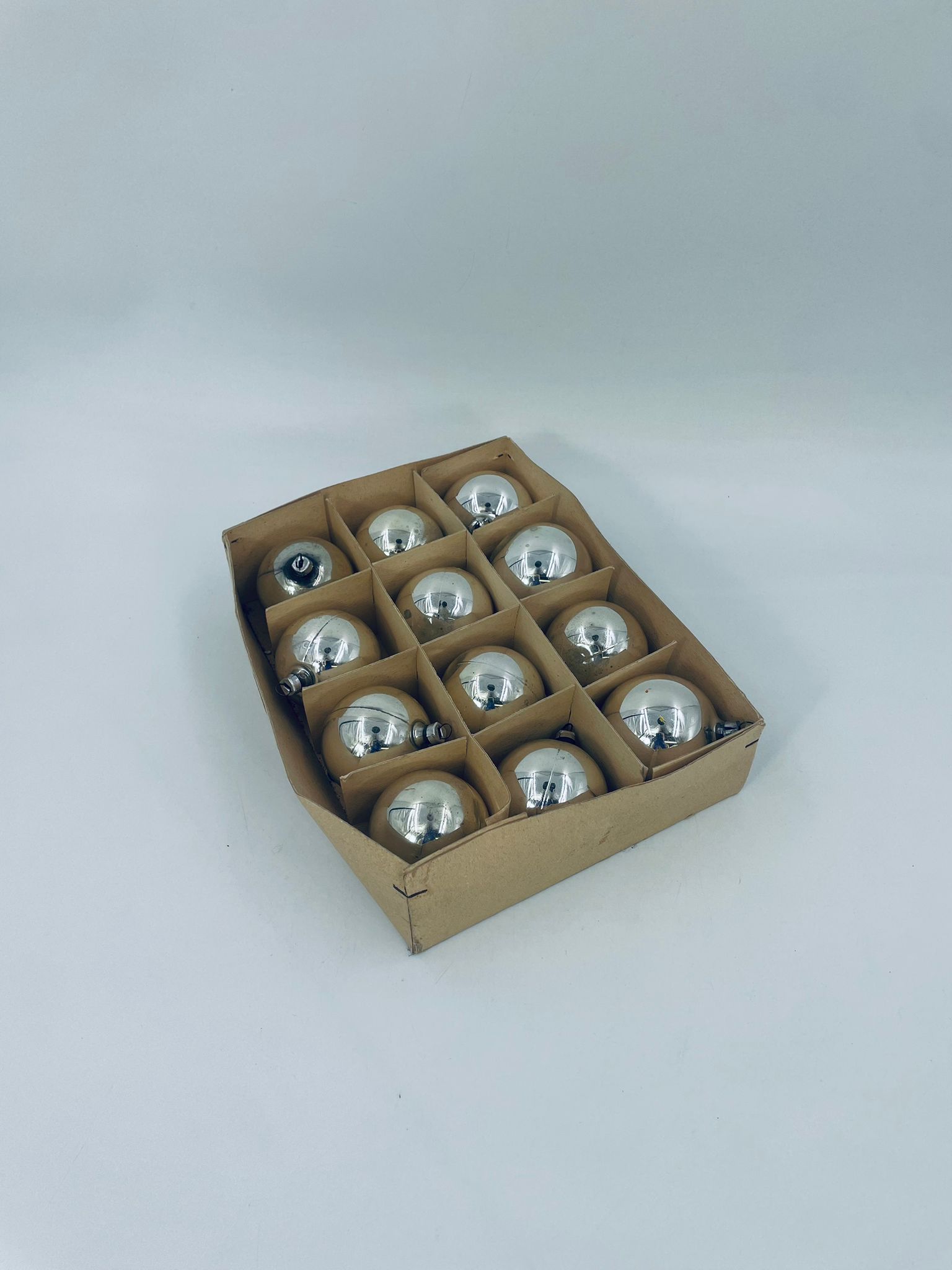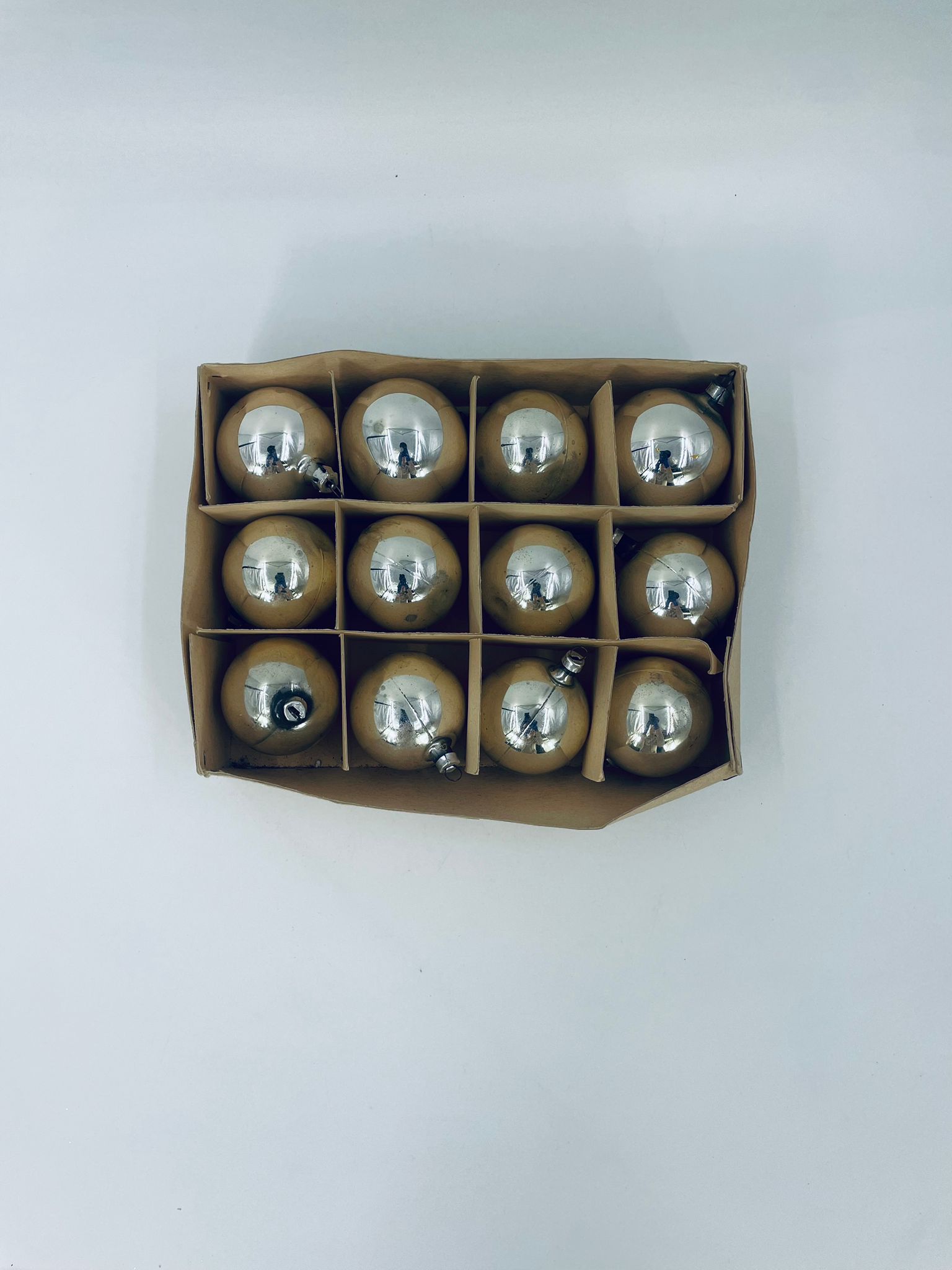 Zestaw zabytkowych bombek na choinkę w stylu Vintage, wykonanych z ręcznie dmuchanego szkła. Bombki barwione na kolor srebrny. Drobne zarysowania.