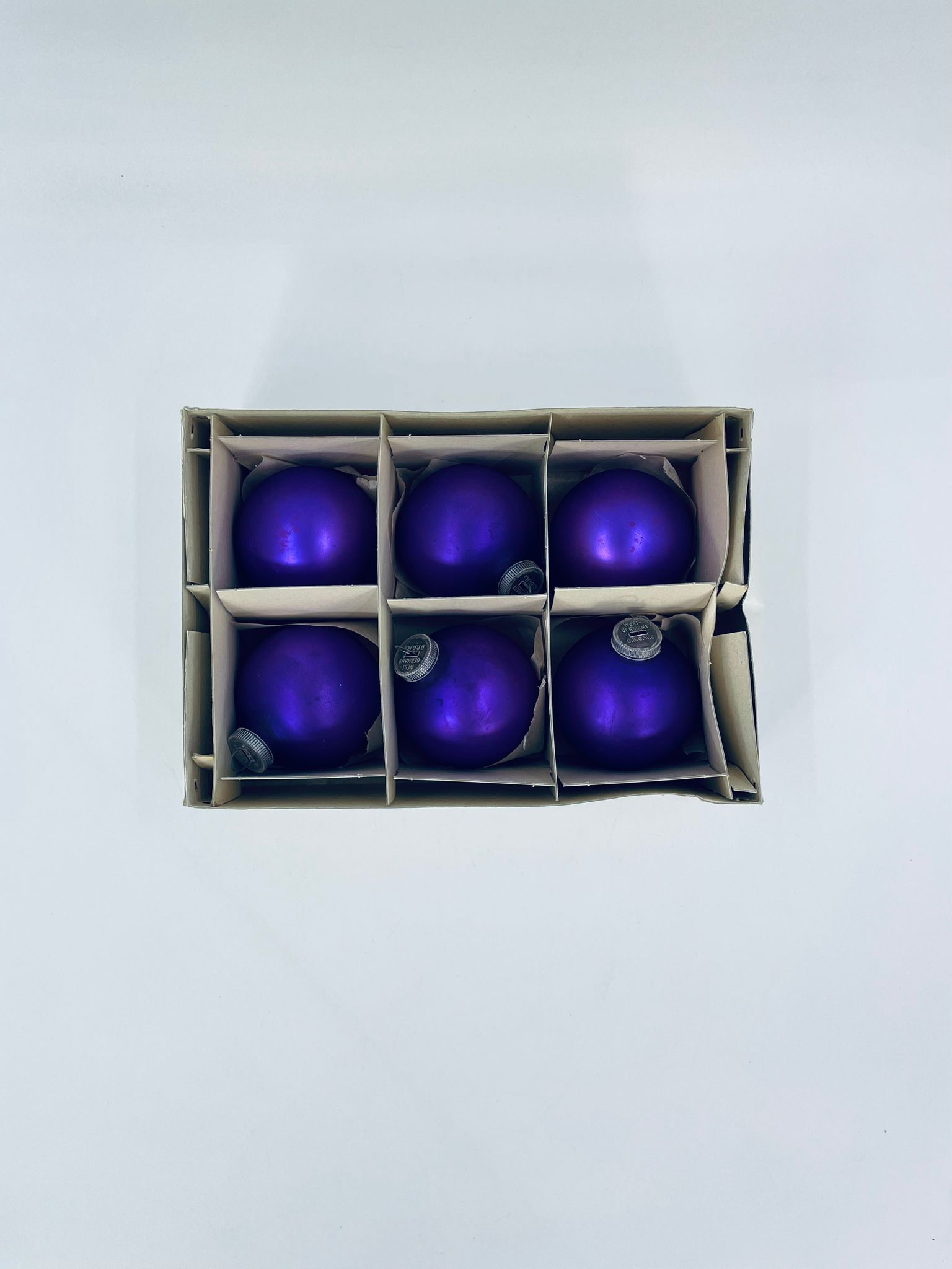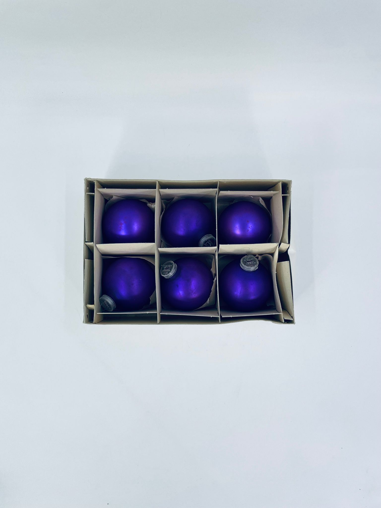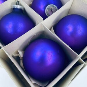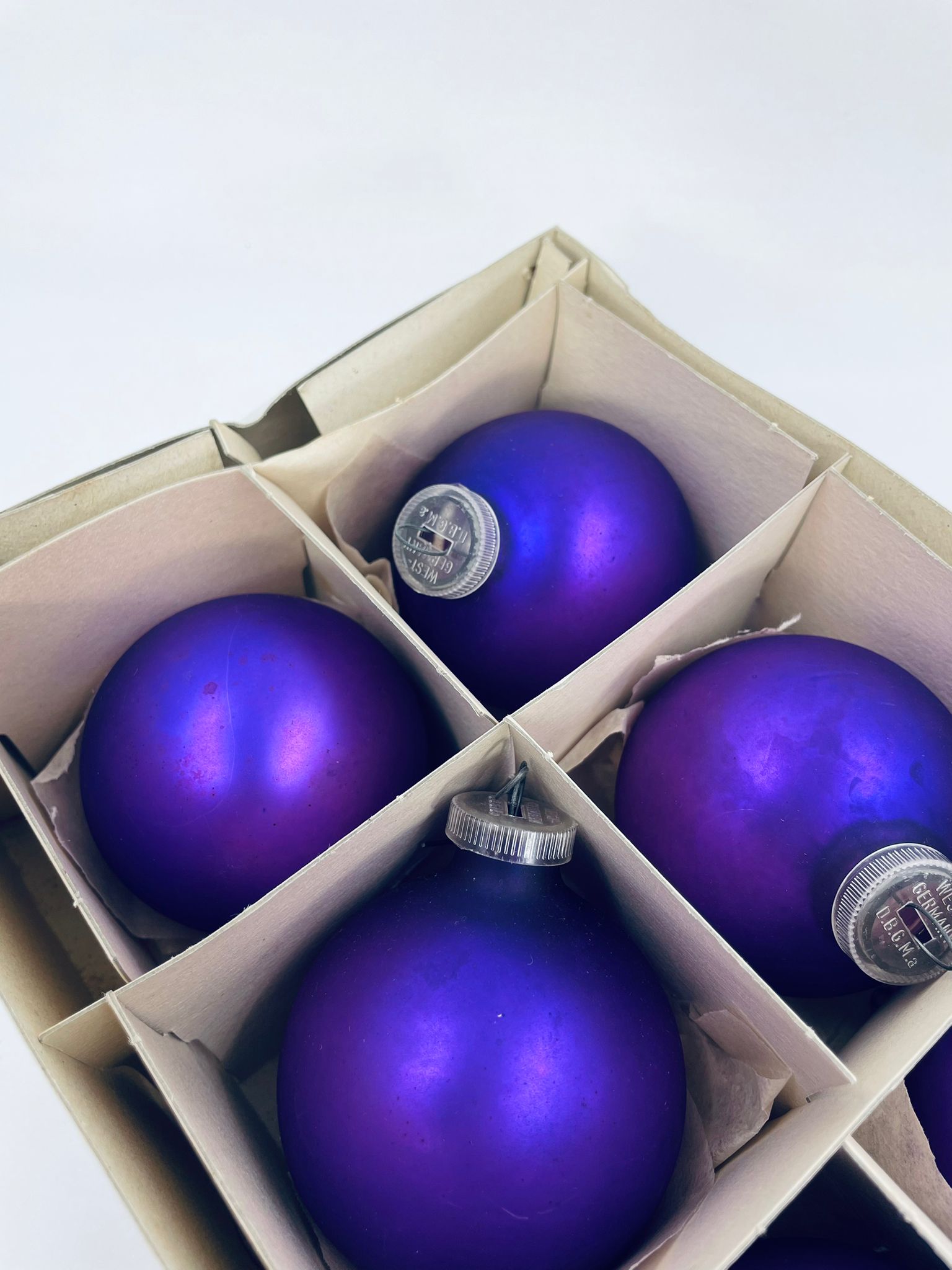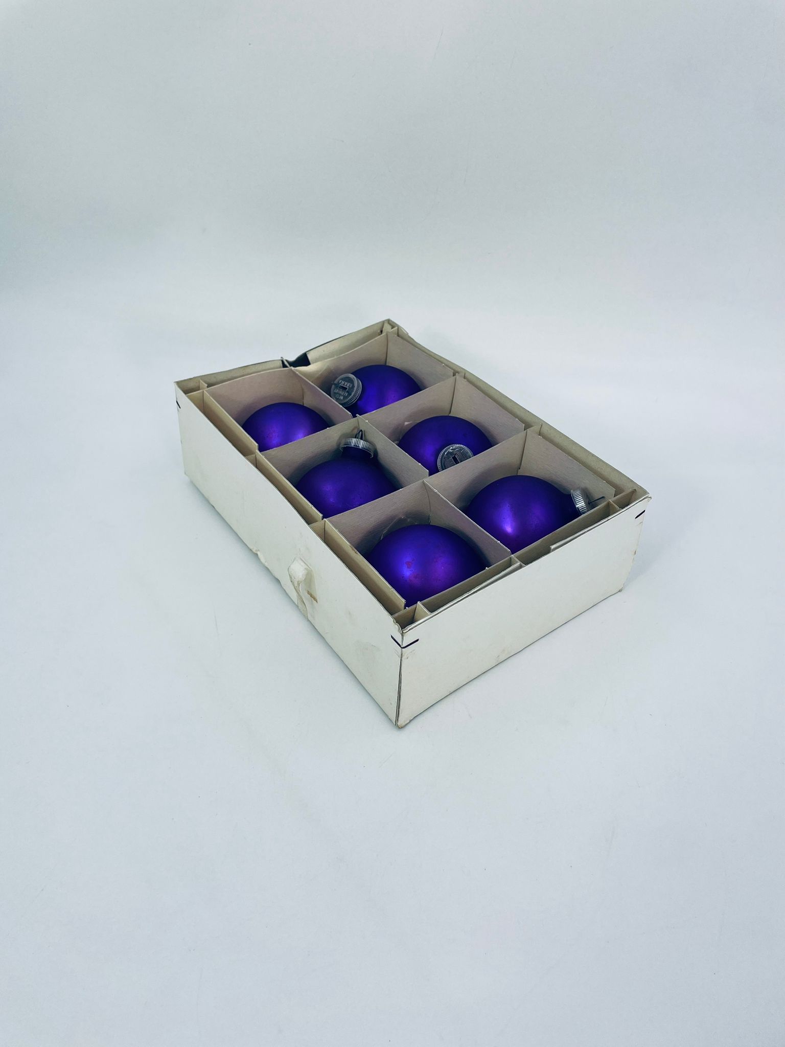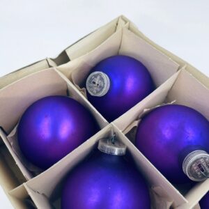 Zestaw zabytkowych bombek na choinkę w stylu Vintage, wykonanych z ręcznie dmuchanego szkła. Bombki barwione na kolor fioletowy.