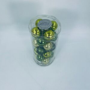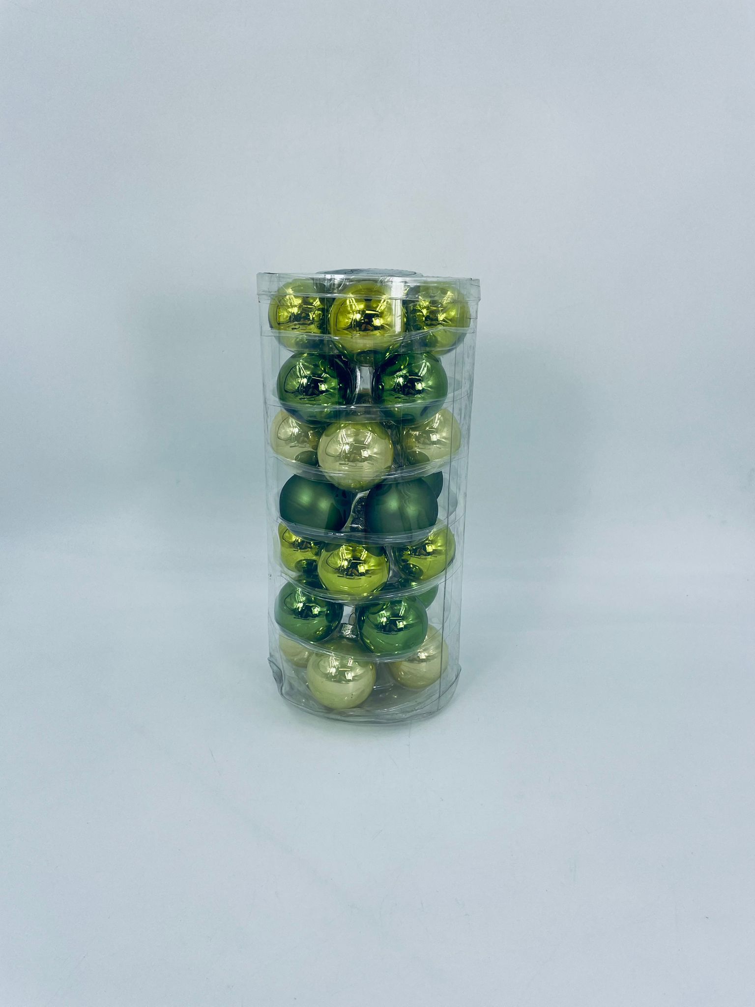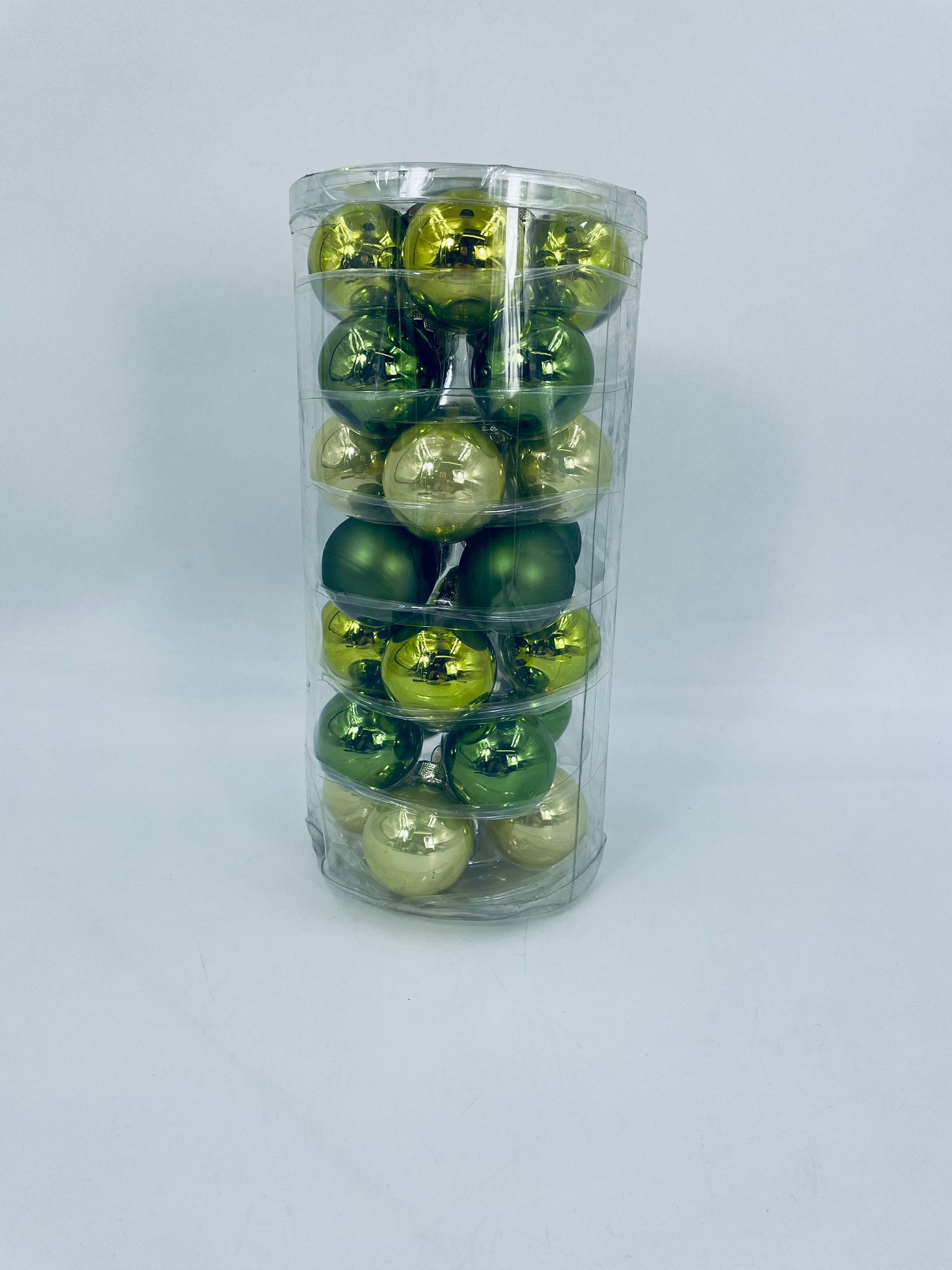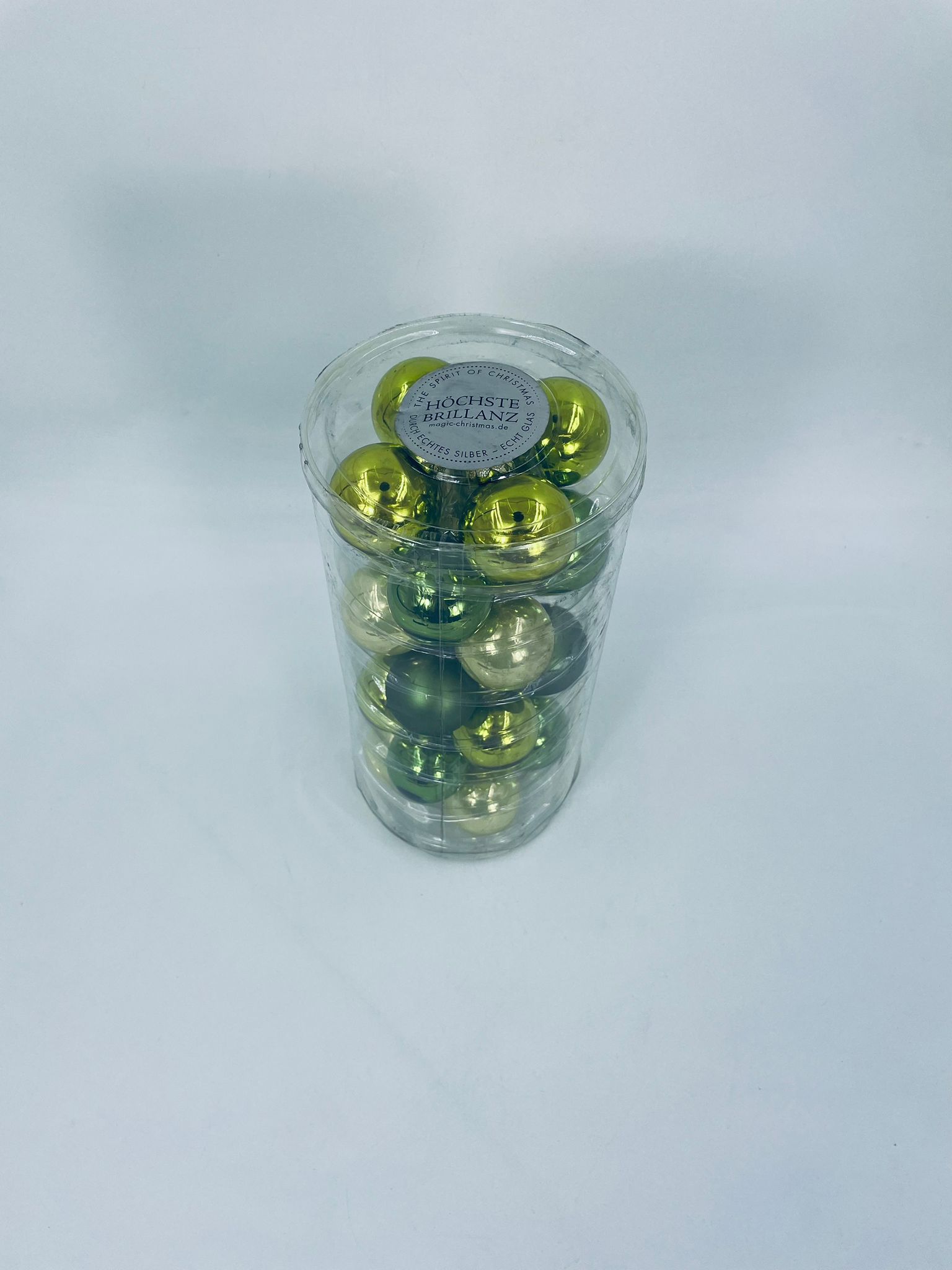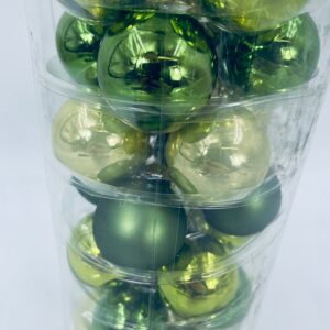 Zestaw zabytkowych bombek na choinkę w stylu Vintage, wykonanych z ręcznie dmuchanego szkła. Bombki okrągłe w różnych odcieniach zielonego koloru.