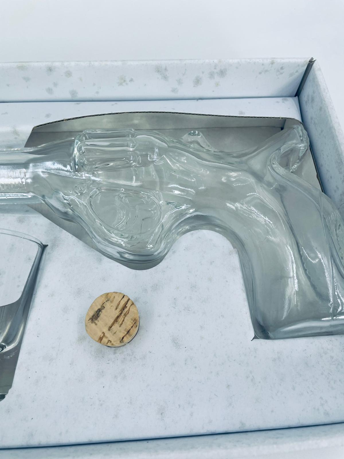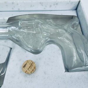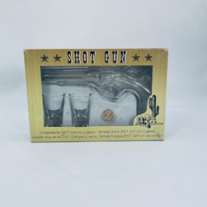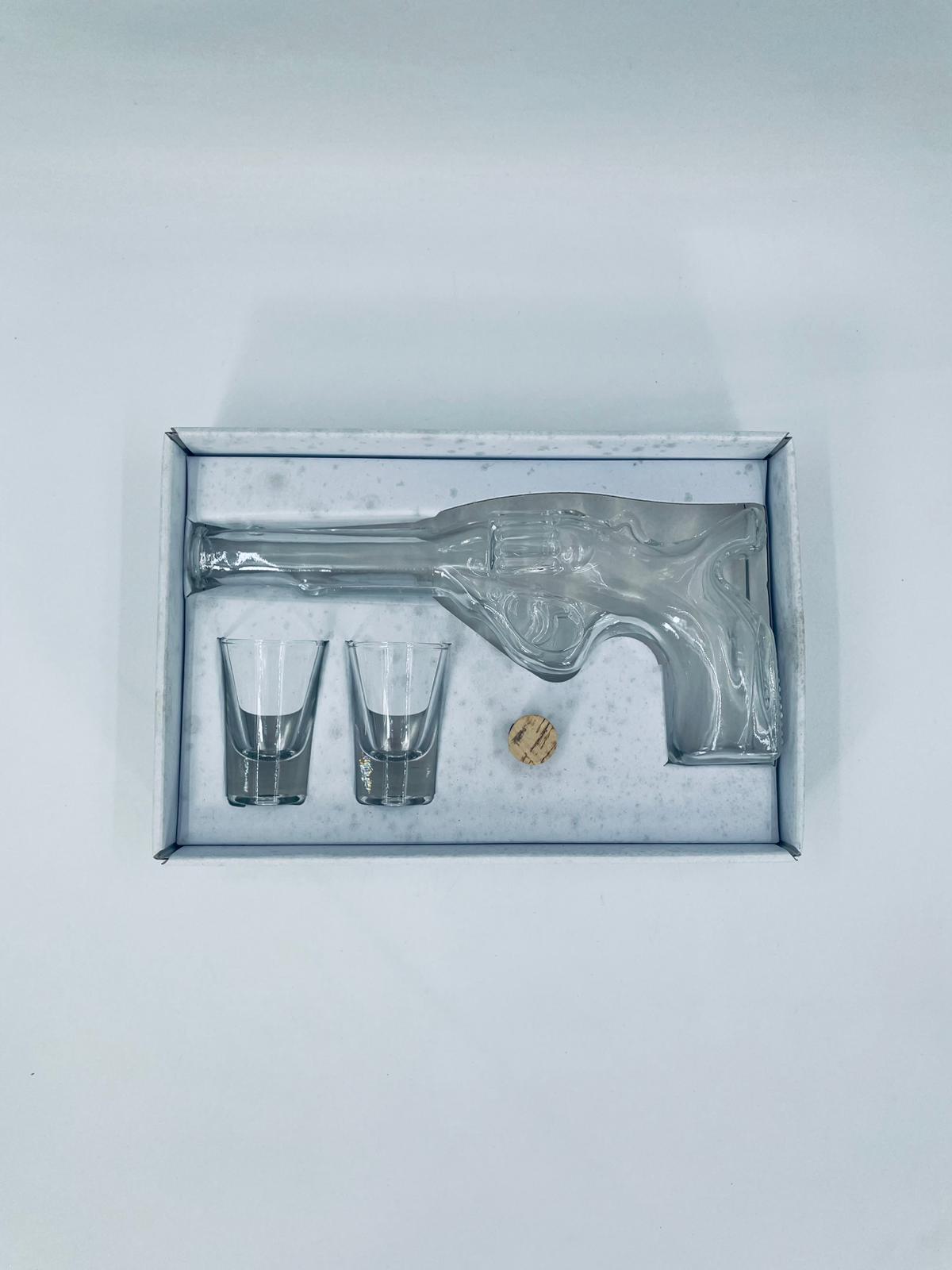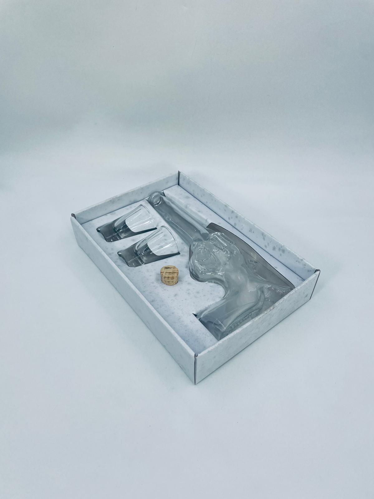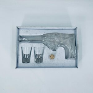 Zestaw „Schot Gun” w stylu Vintage, wykonany z wysokiej jakości przezroczystego szkła. Zestaw zawiera karafkę w kształcie leworweru, korek oraz dwa kieliszki. Idealny zestaw prezentowy.